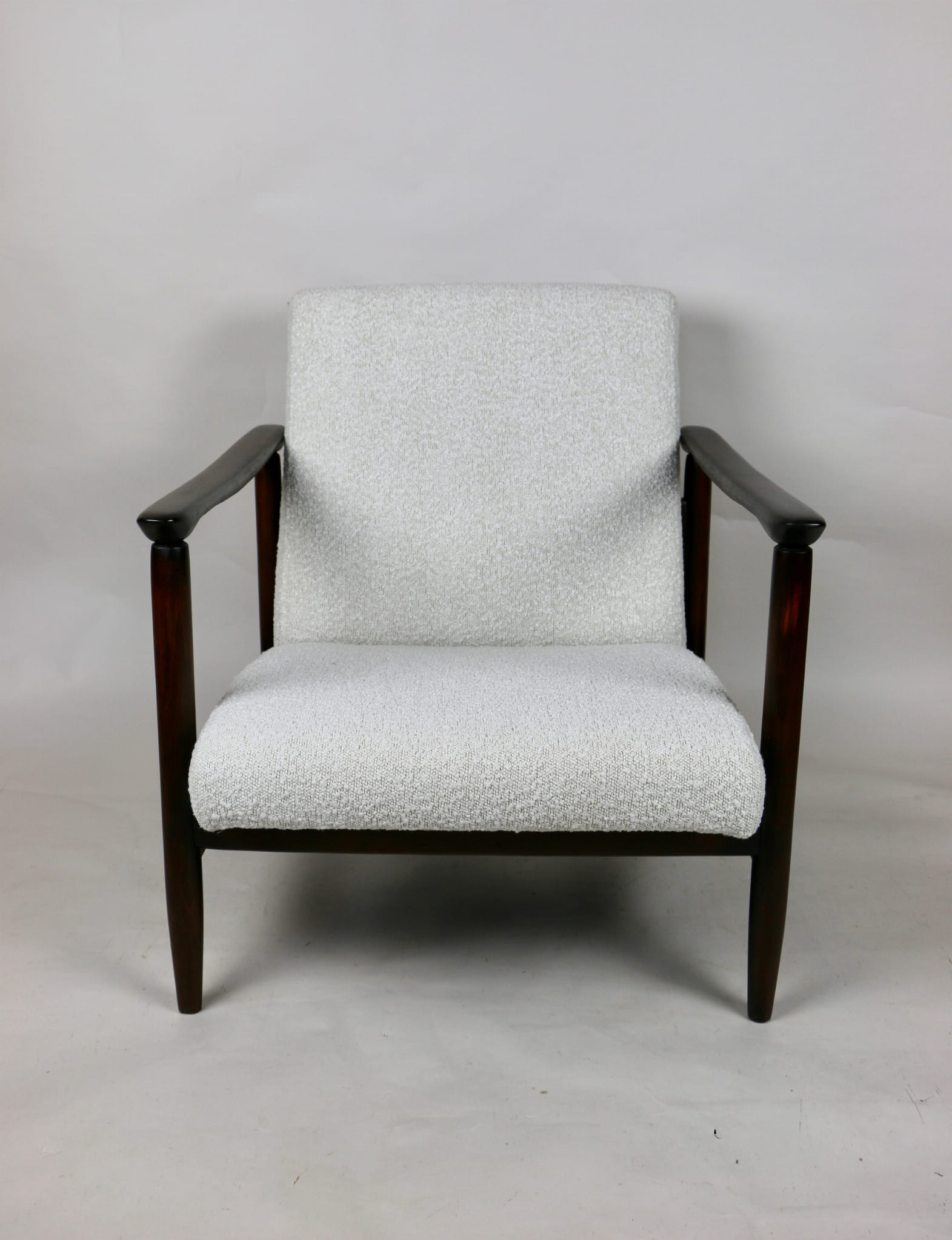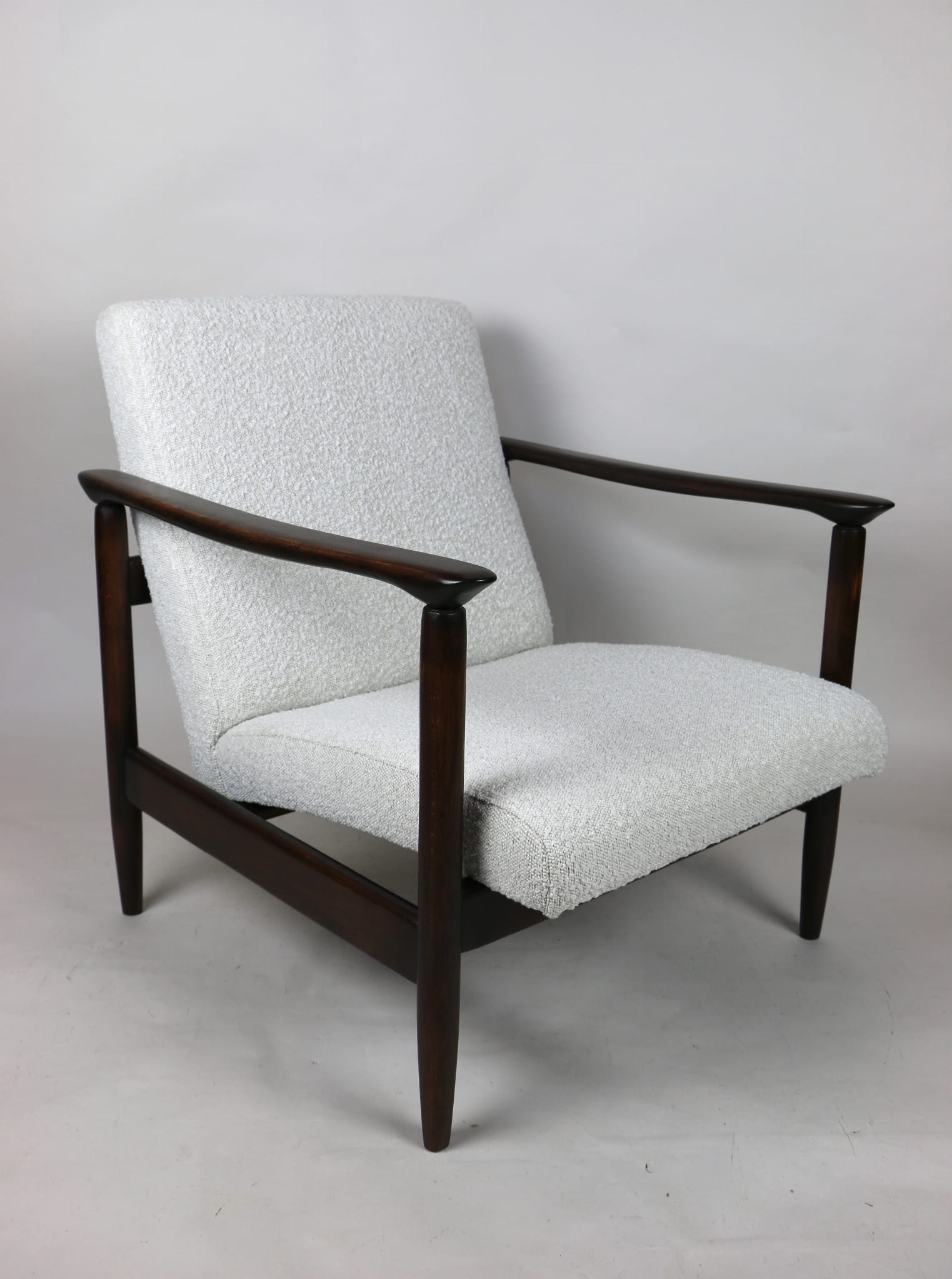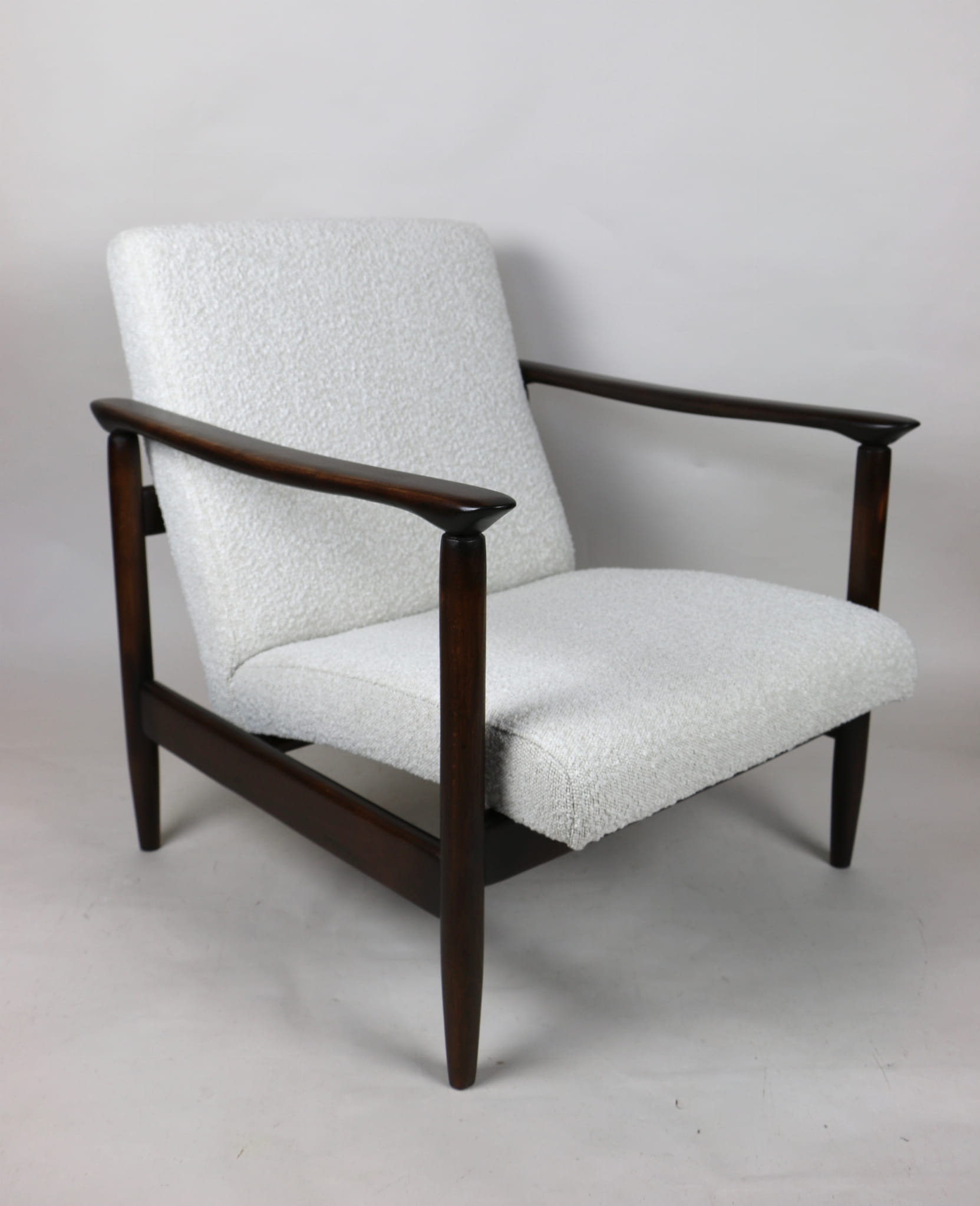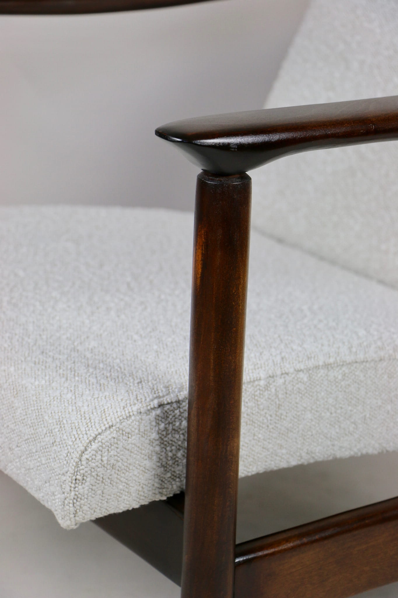 Fotel GFM - 142 zaprojektowany przez Edmunda Homa. Kompletnie odrestaurowany - nowa tapicerka wraz z wypełnieniem została pokryta materiałem tapicerskim strukturalnym w kolorze białym z serii boucle. Podparcia i nóżki drewniane, pokryte lakierem w kolorze ciemnego drewna.