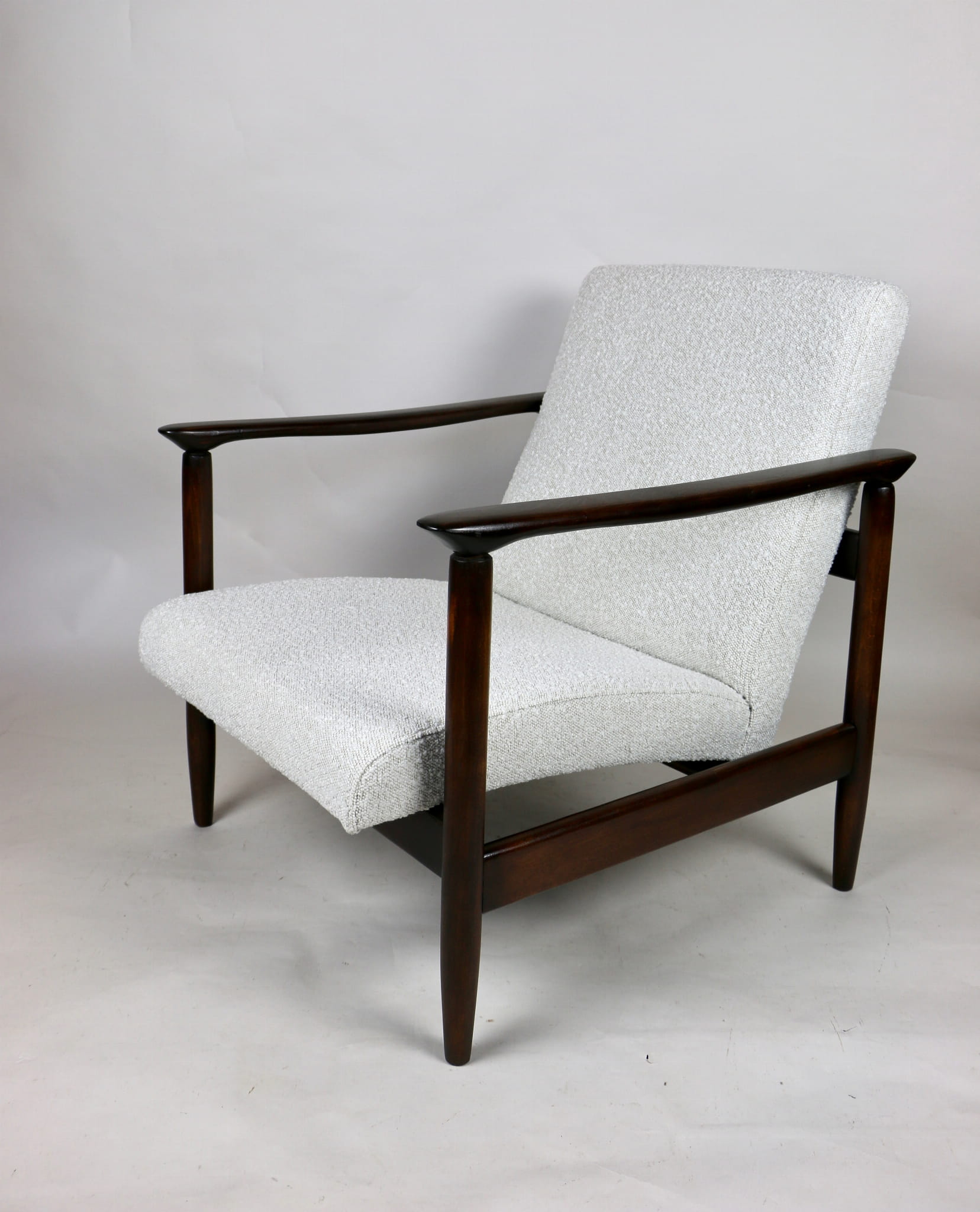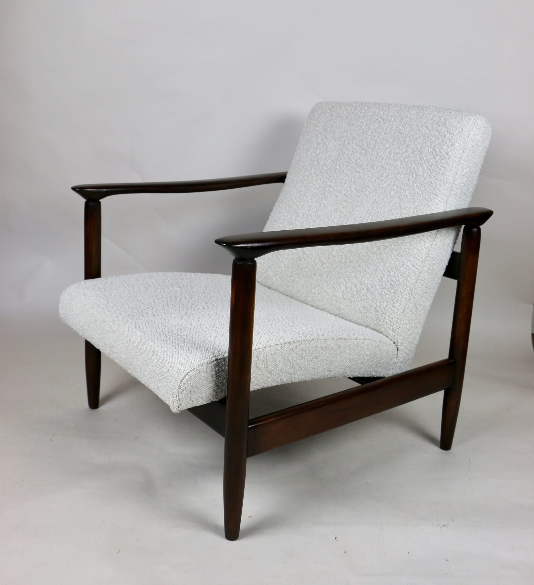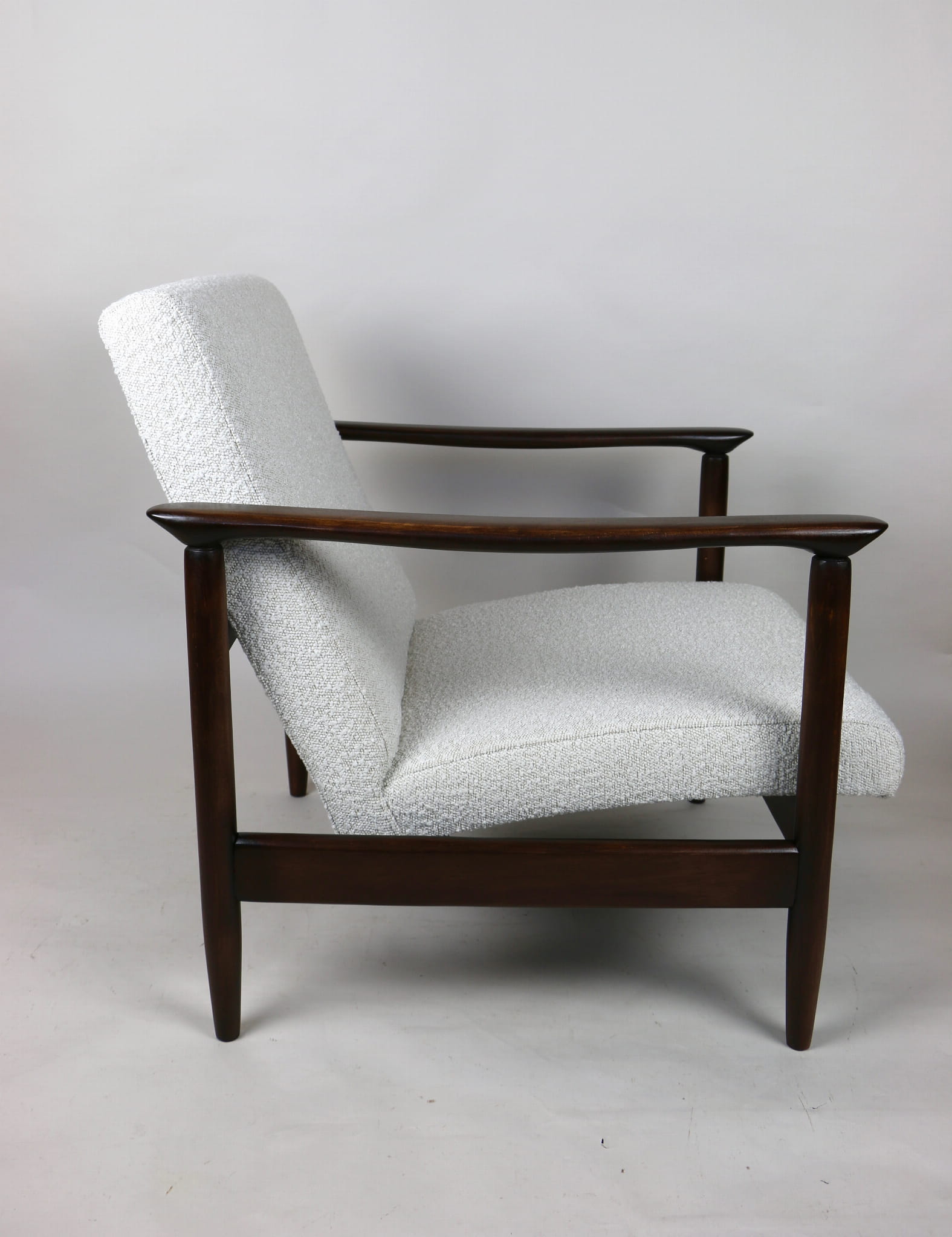 Fotel GFM - 142 zaprojektowany przez Edmunda Homa. Kompletnie odrestaurowany - nowa tapicerka wraz z wypełnieniem została pokryta materiałem tapicerskim strukturalnym w kolorze białym z serii boucle. Podparcia i nóżki drewniane, pokryte lakierem w kolorze ciemnego drewna.
