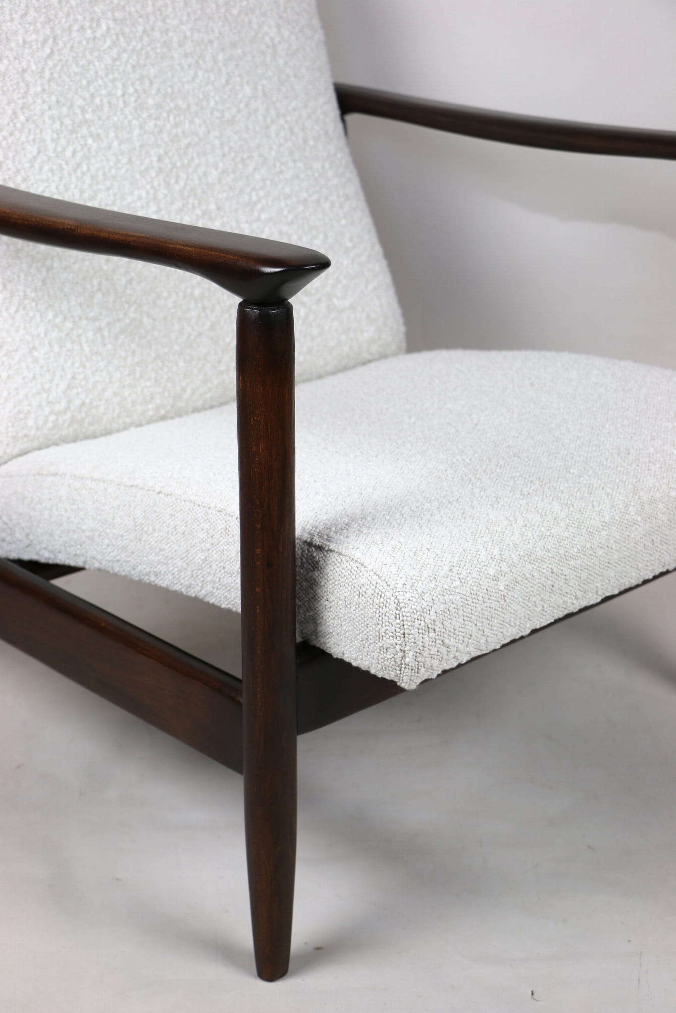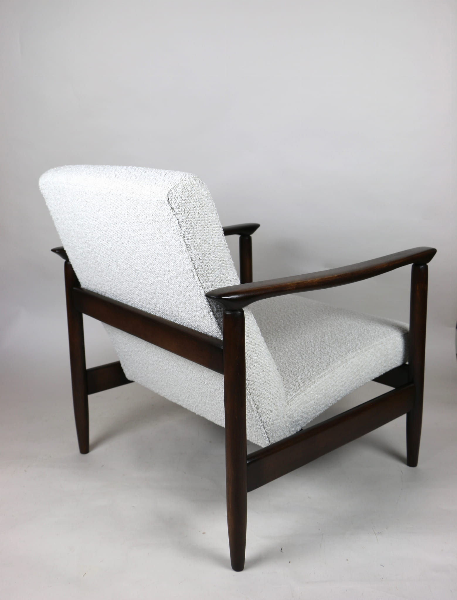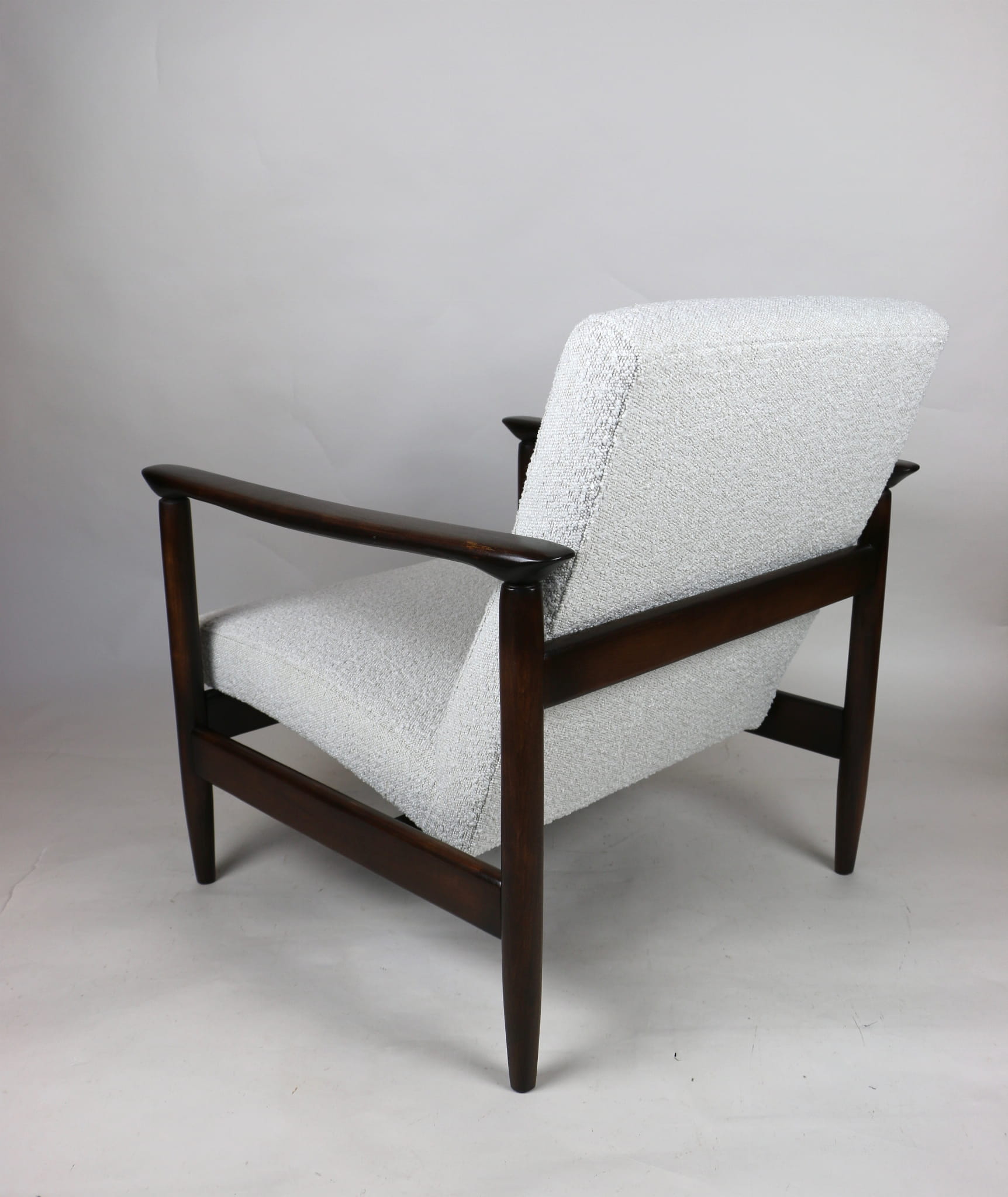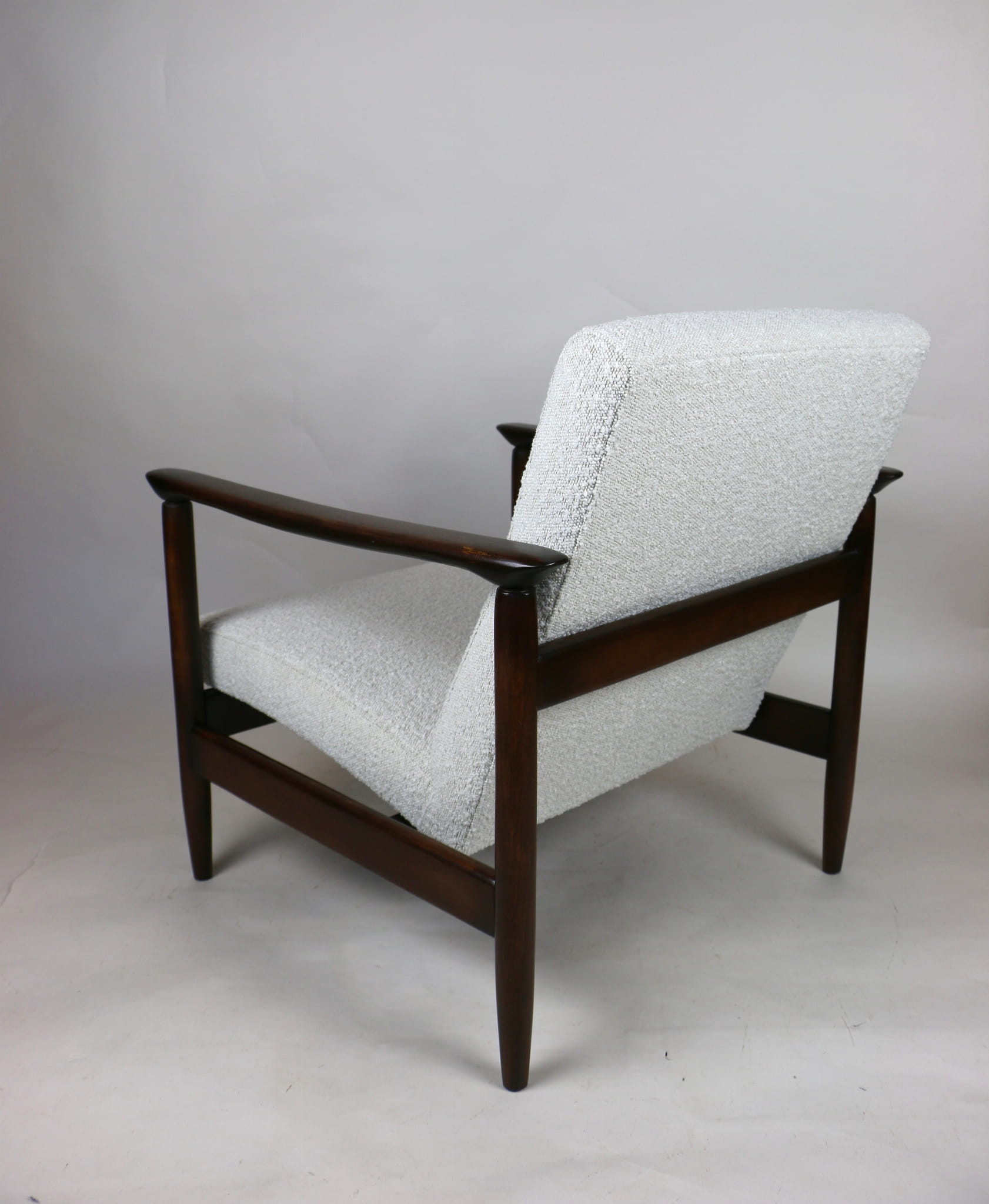 Fotel GFM - 142 zaprojektowany przez Edmunda Homa. Kompletnie odrestaurowany - nowa tapicerka wraz z wypełnieniem została pokryta materiałem tapicerskim strukturalnym w kolorze białym z serii boucle. Podparcia i nóżki drewniane, pokryte lakierem w kolorze ciemnego drewna.