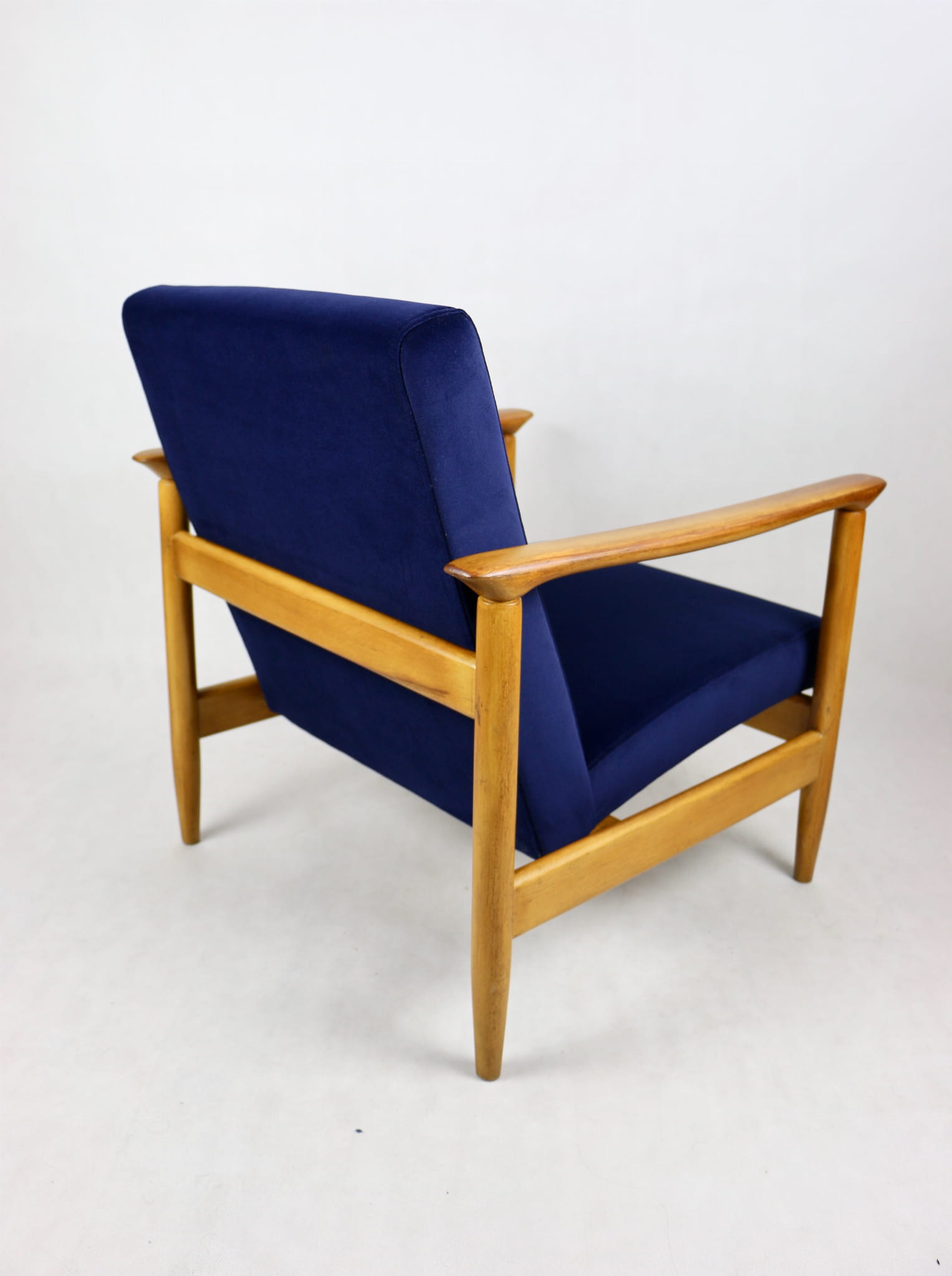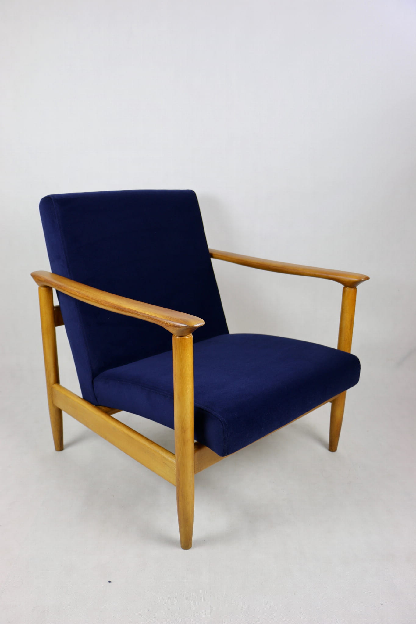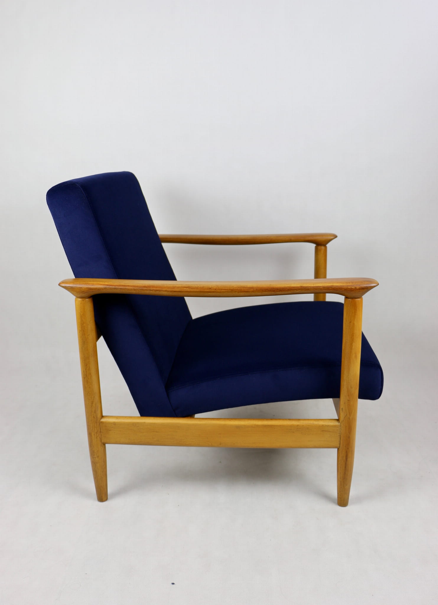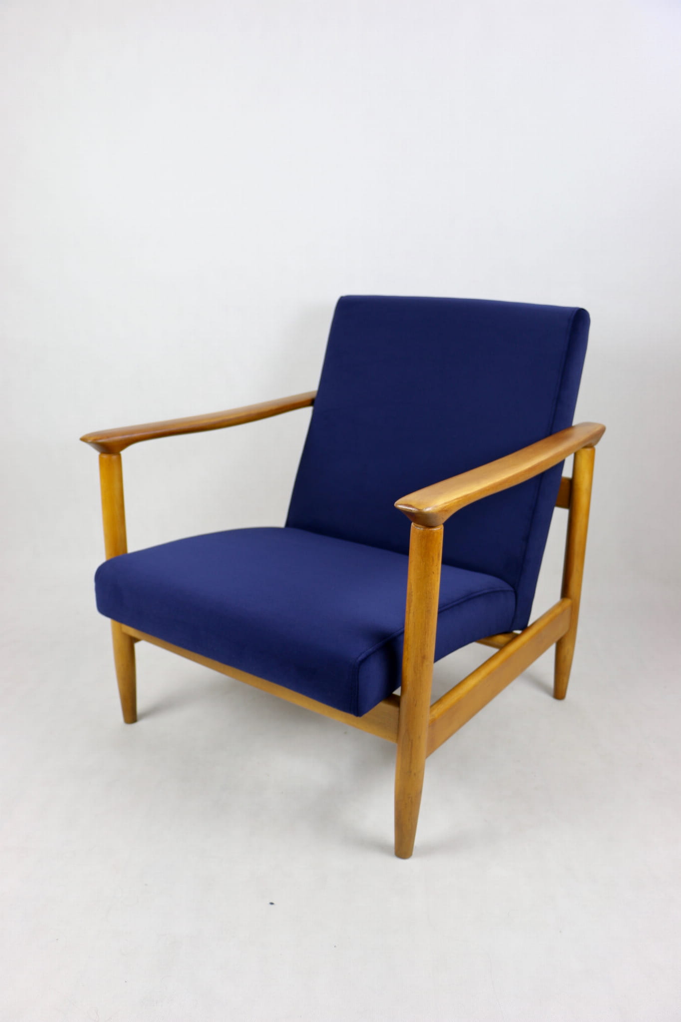 Fotel GFM - 142 zaprojektowany przez Edmunda Homę. Kompletnie odrestaurowany - nowa tapicerka wraz z wypełnieniem została pokryta materiałem tapicerskim typu welwet w kolorze granatowym z serii Jade w kolorze 610. Podparcia i nóżki drewniane, naturalne pokryte lakierem w kolorze naturalnego drewna.