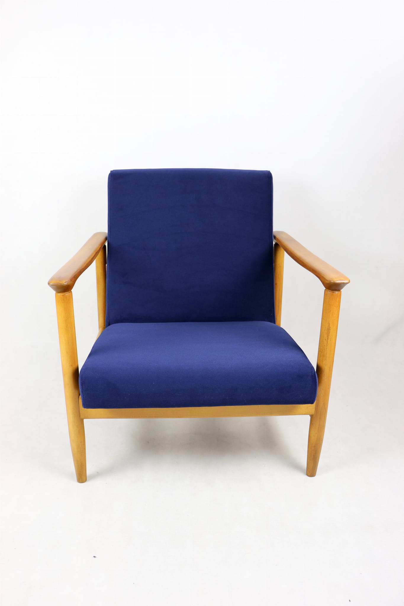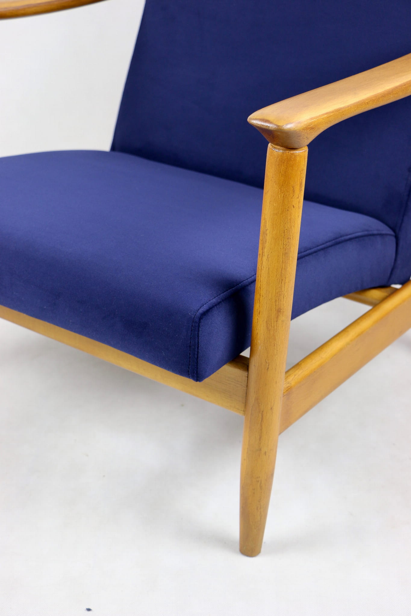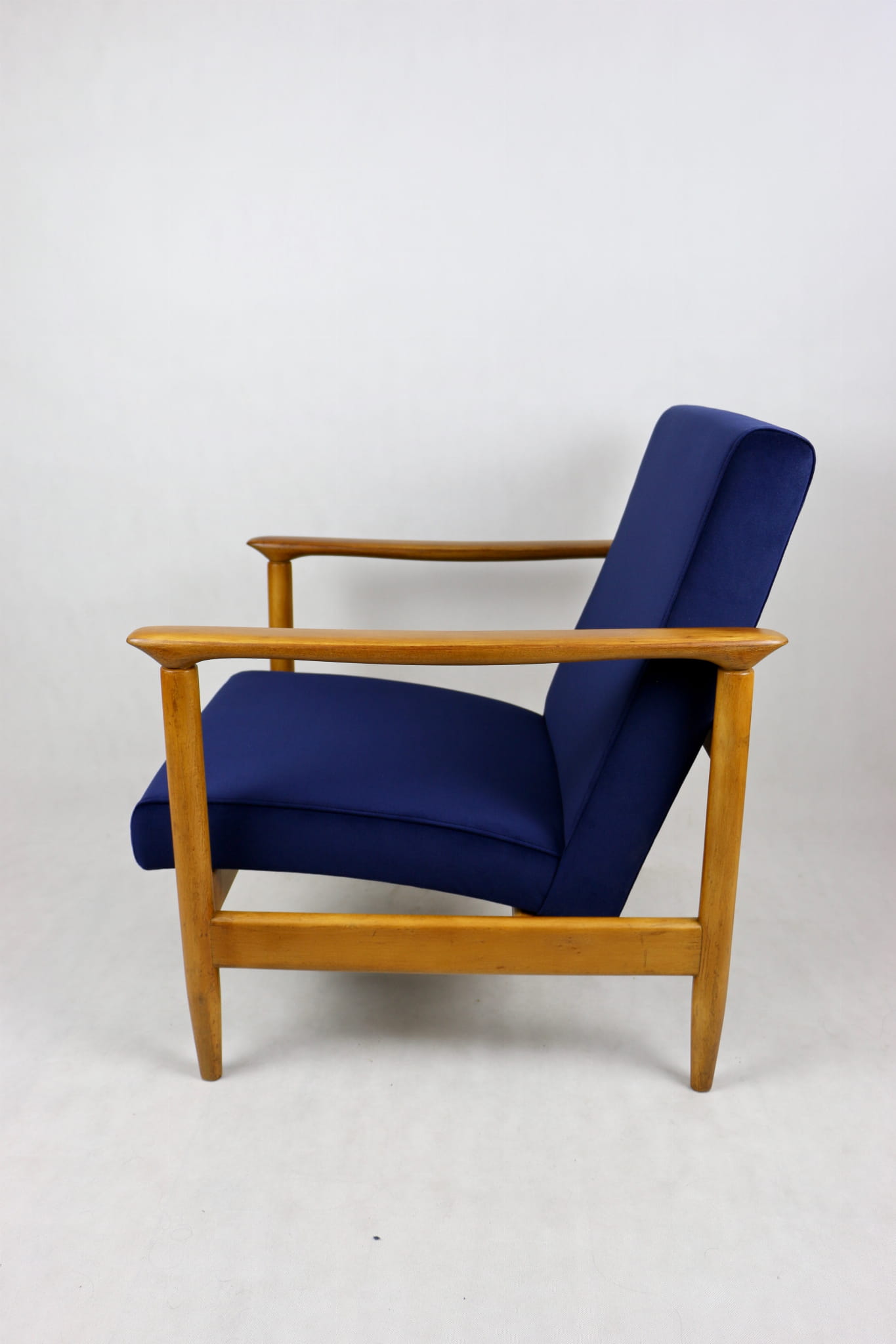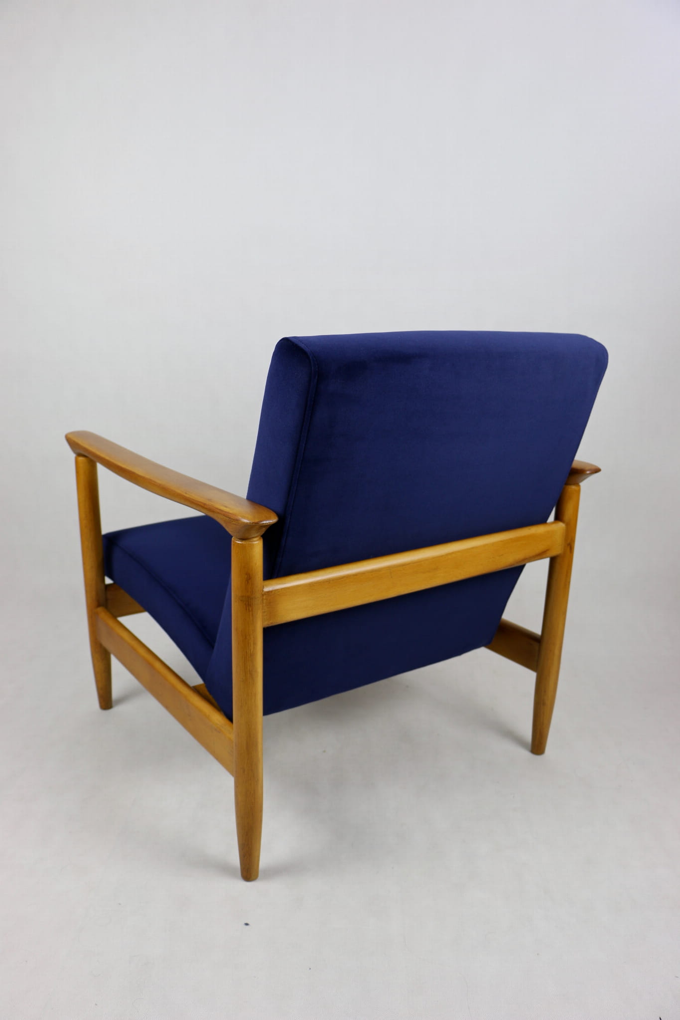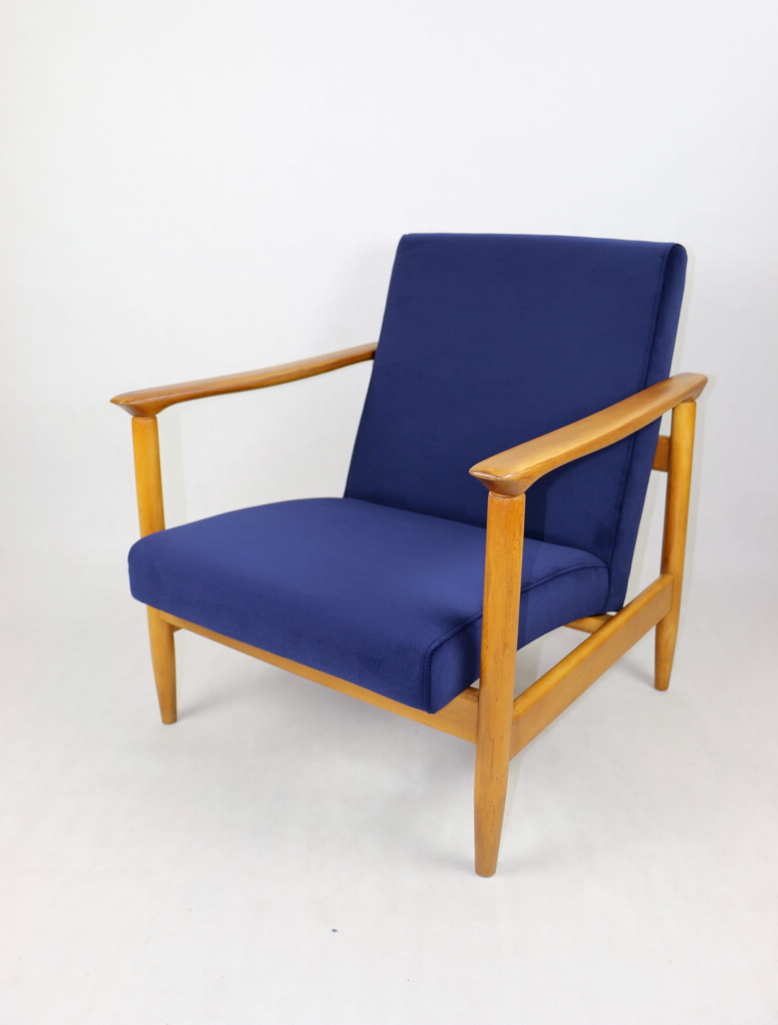 Fotel GFM - 142 zaprojektowany przez Edmunda Homę. Kompletnie odrestaurowany - nowa tapicerka wraz z wypełnieniem została pokryta materiałem tapicerskim typu welwet w kolorze granatowym z serii Jade w kolorze 610. Podparcia i nóżki drewniane, naturalne pokryte lakierem w kolorze naturalnego drewna.
