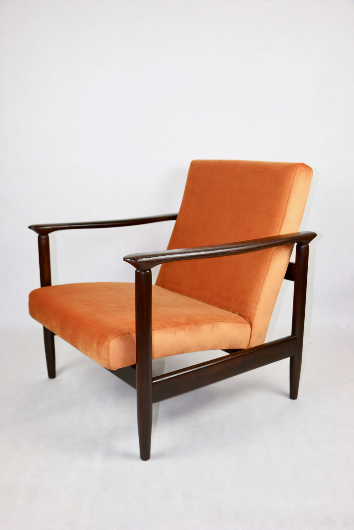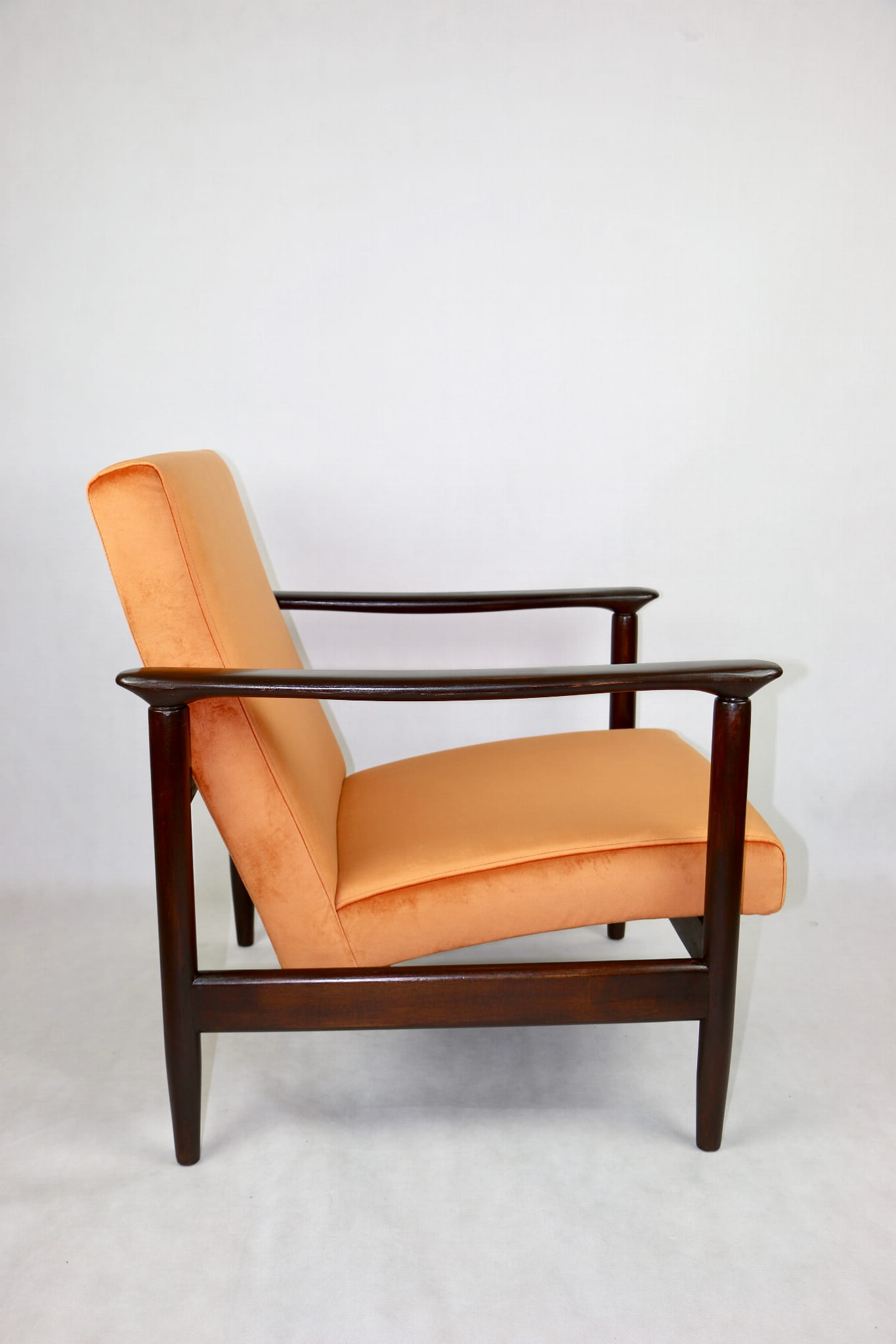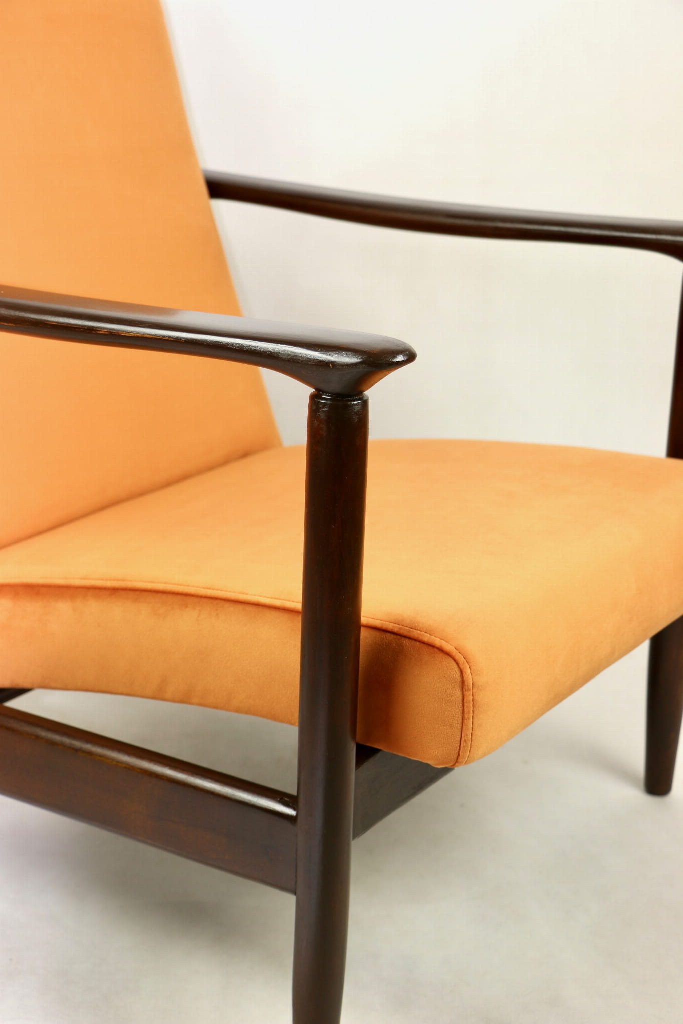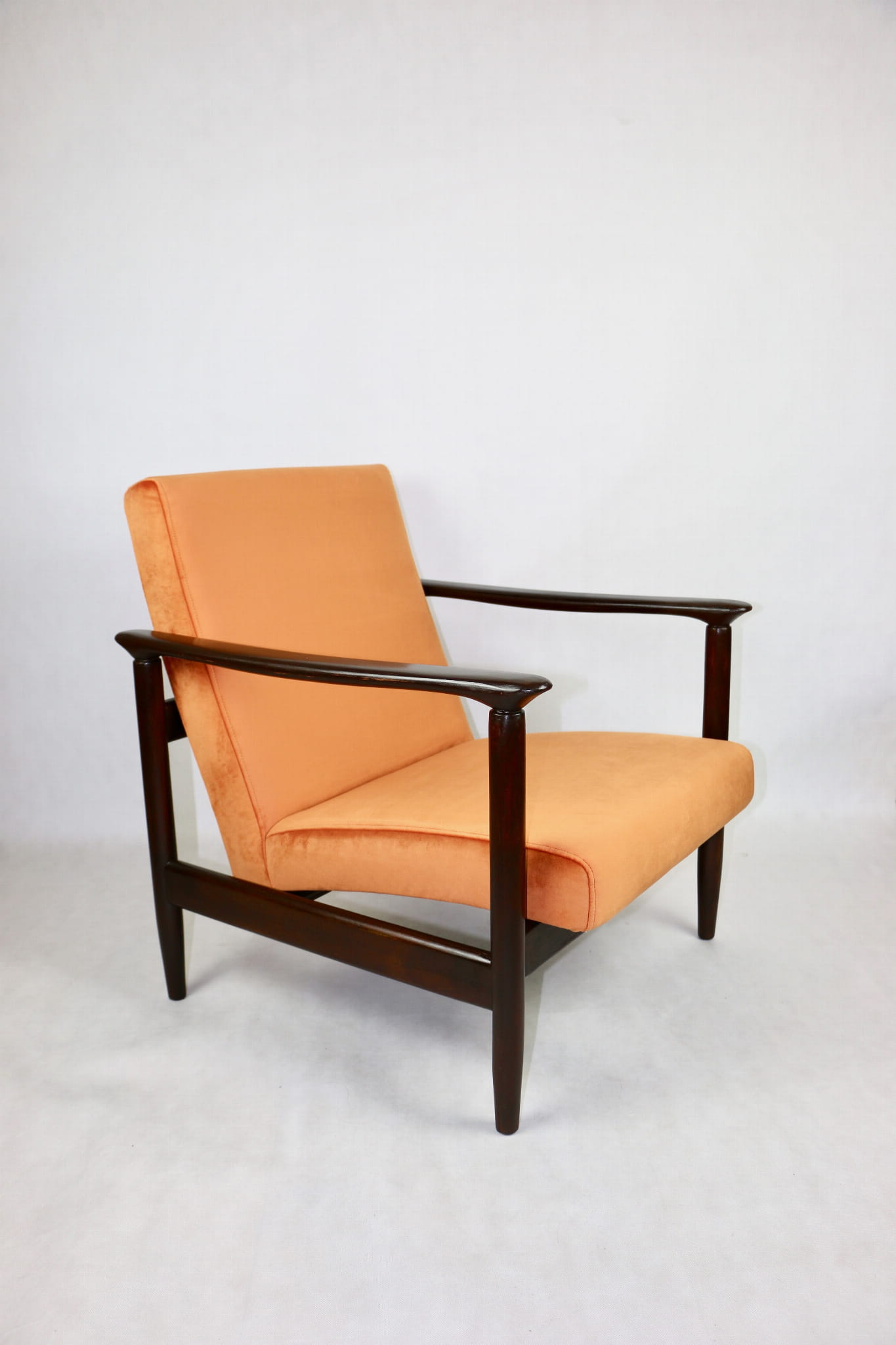 Fotel GFM - 142 zaprojektowany przez Edmunda Homę. Kompletnie odrestaurowany - nowa tapicerka wraz z wypełnieniem została pokryta materiałem tapicerskim typu welwet w kolorze pomarańczowym z serii Paris. Podparcia i nóżki drewniane, naturalne pokryte lakierem w kolorze ciemnego drewna.