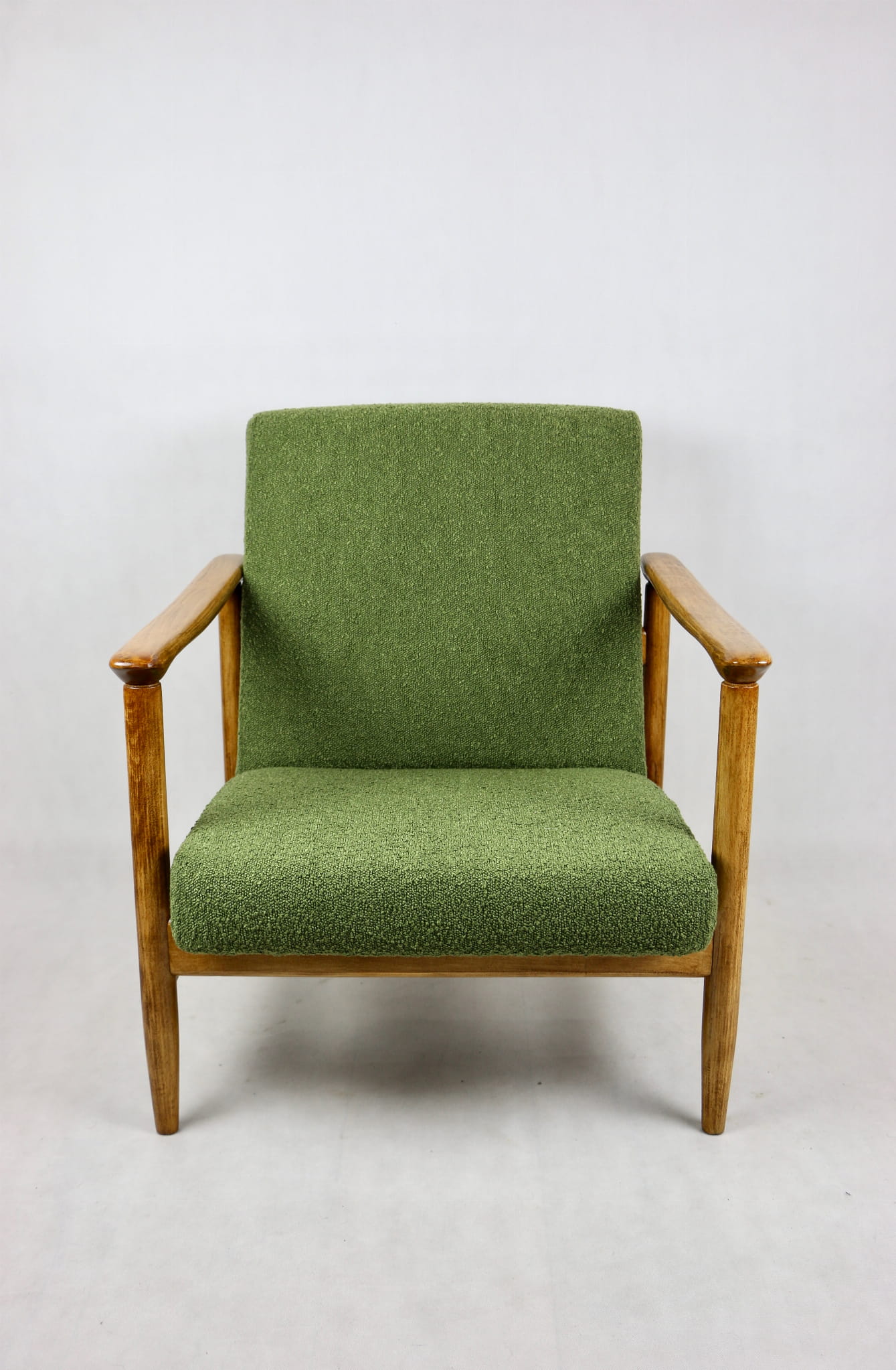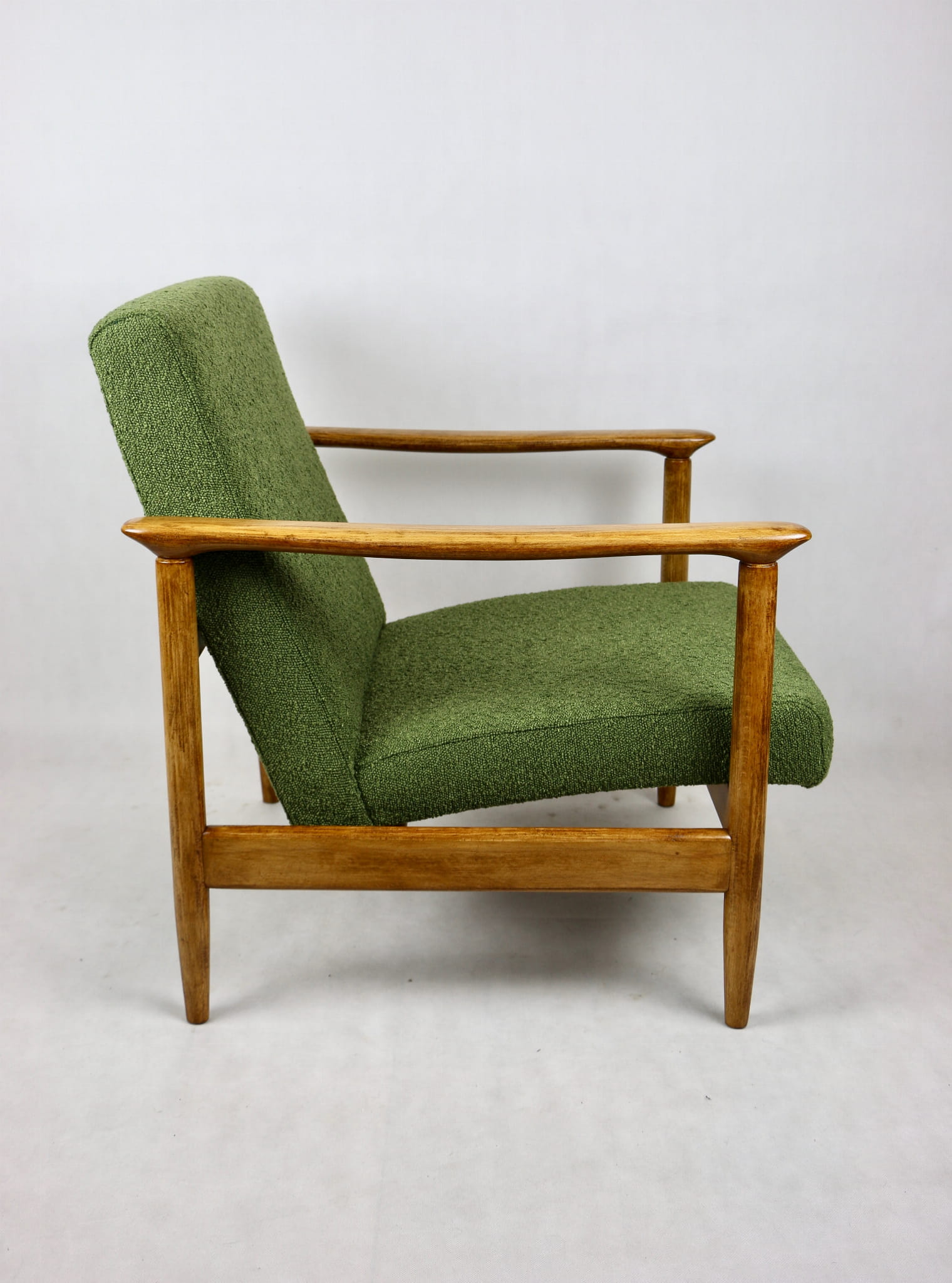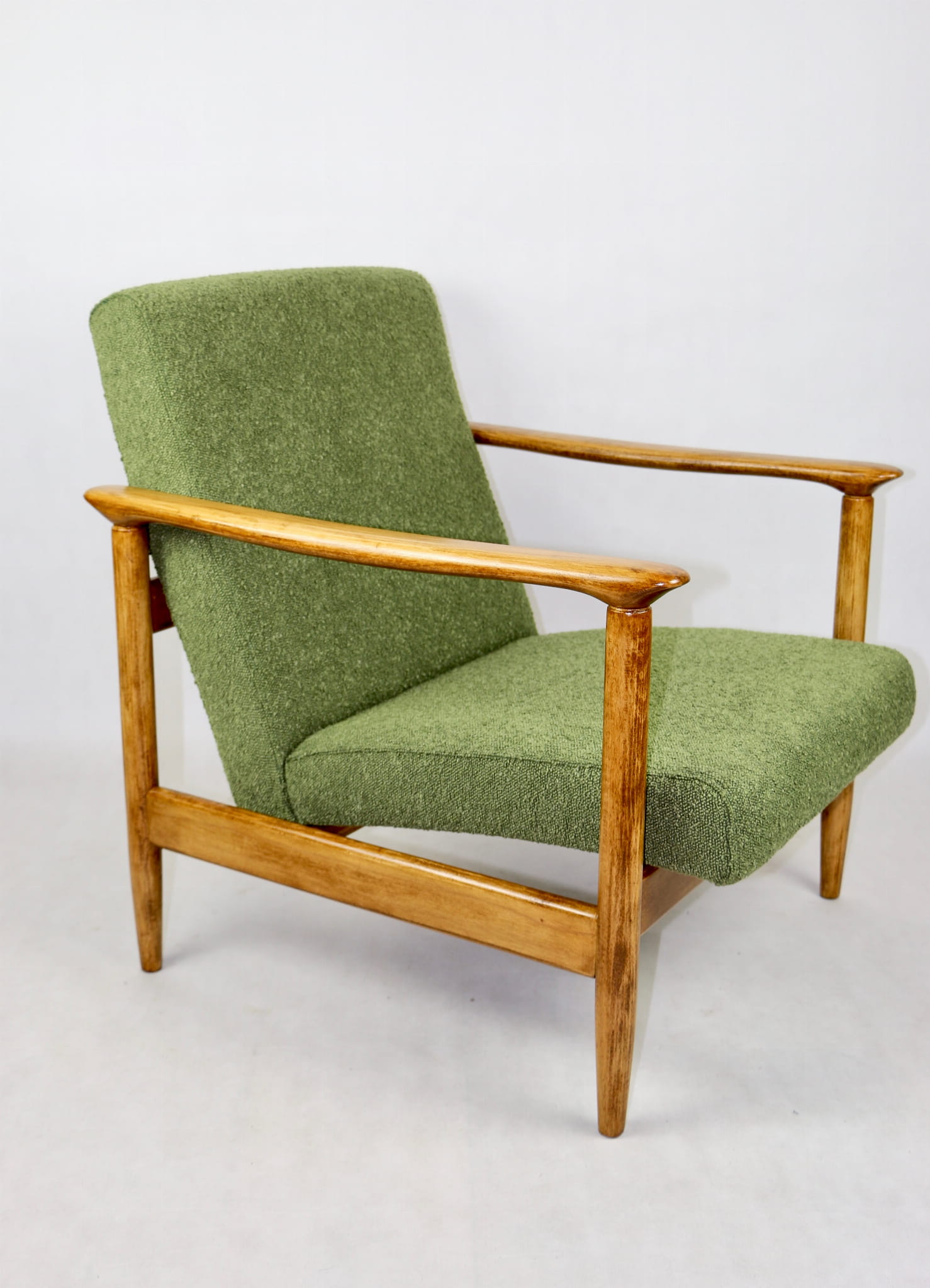 Fotel GFM-142, proj. Edmund Homa z lat 70 jasny zielony boucle - dostępne 2 sztuki