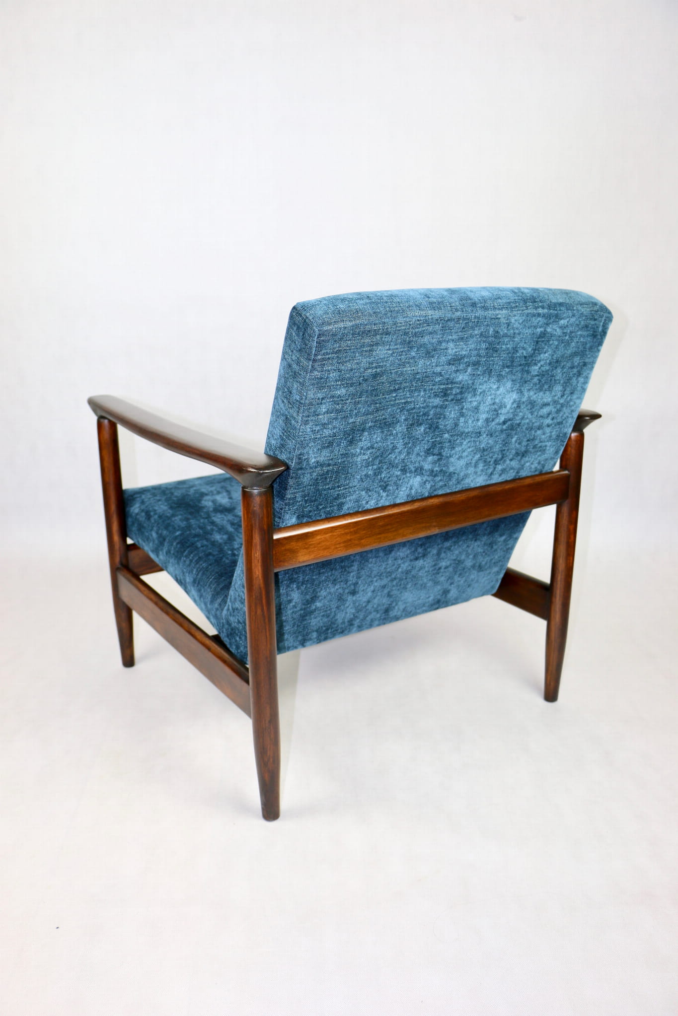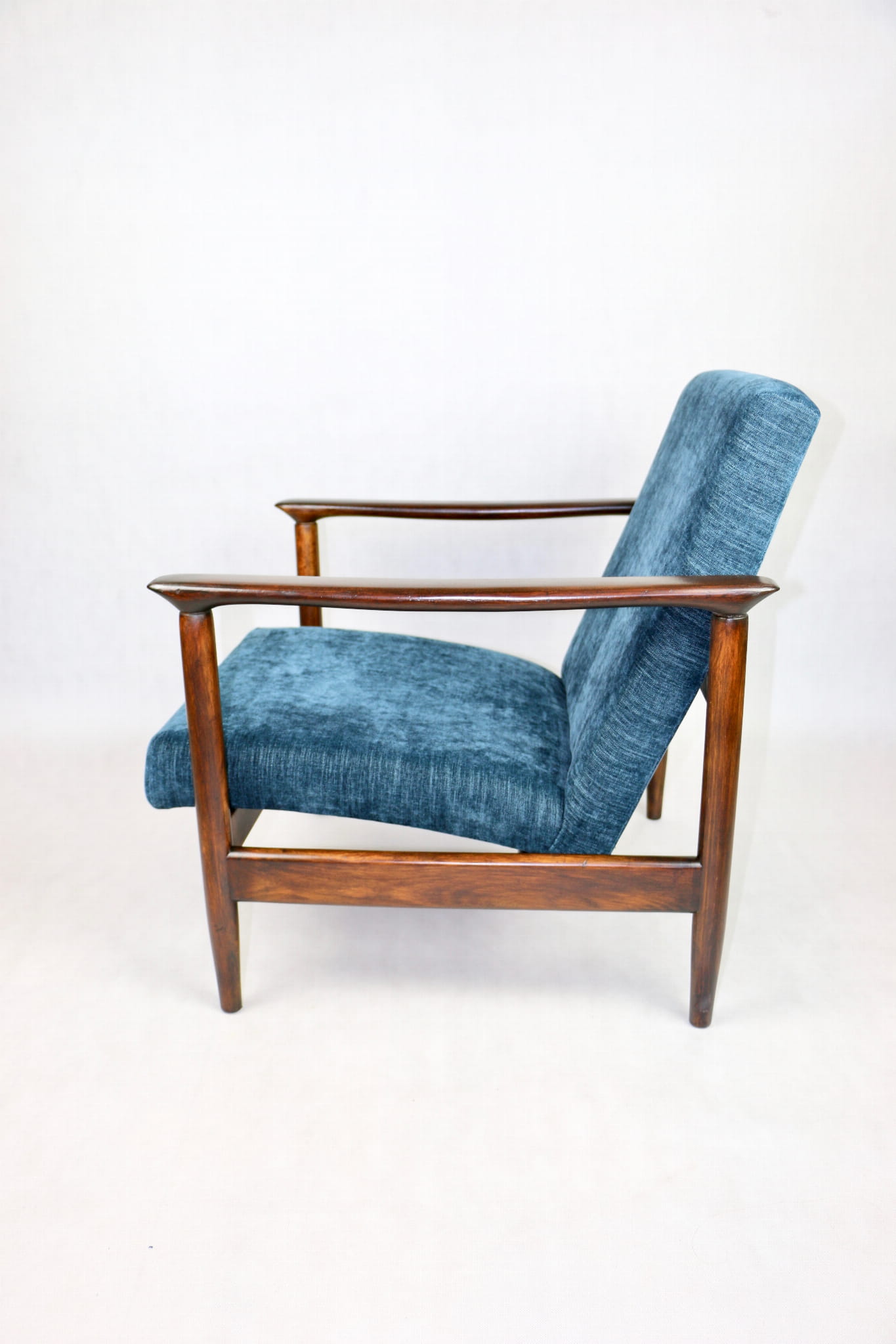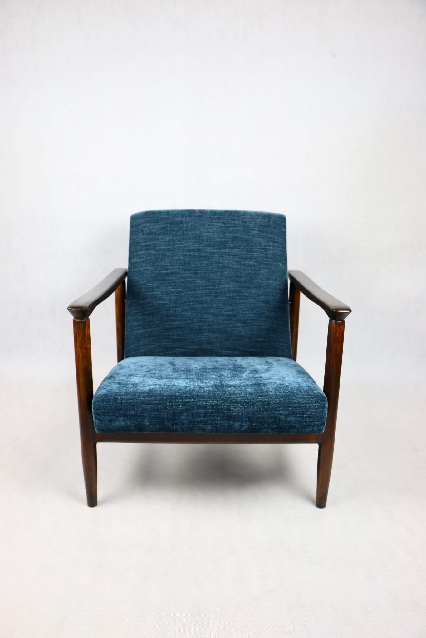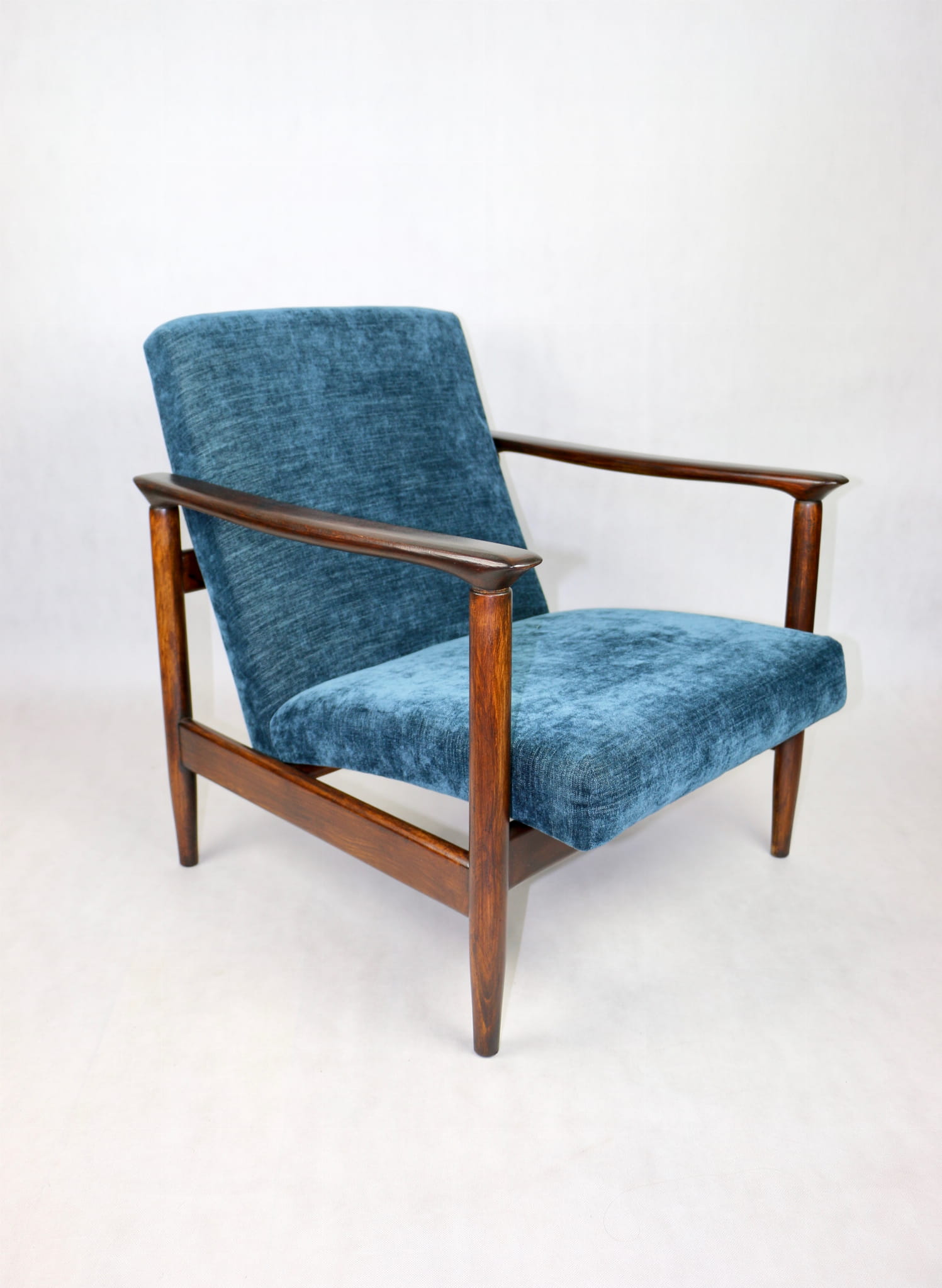 Fotel GFM - 142 zaprojektowany przez Edmunda Homę. Kompletnie odrestaurowany - nowa tapicerka wraz z wypełnieniem została pokryta materiałem tapicerskim strukturalnym w kolorze niebieskim/ granatowym z serii Boston. Podparcia i nóżki drewniane, pokryte lakierem w kolorze ciemnego drewna.