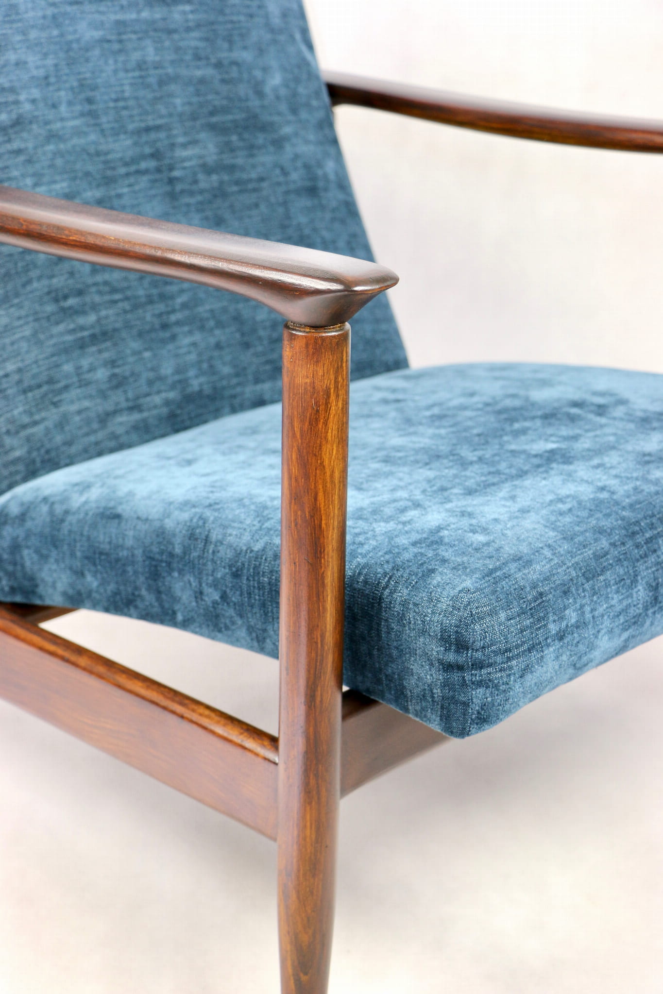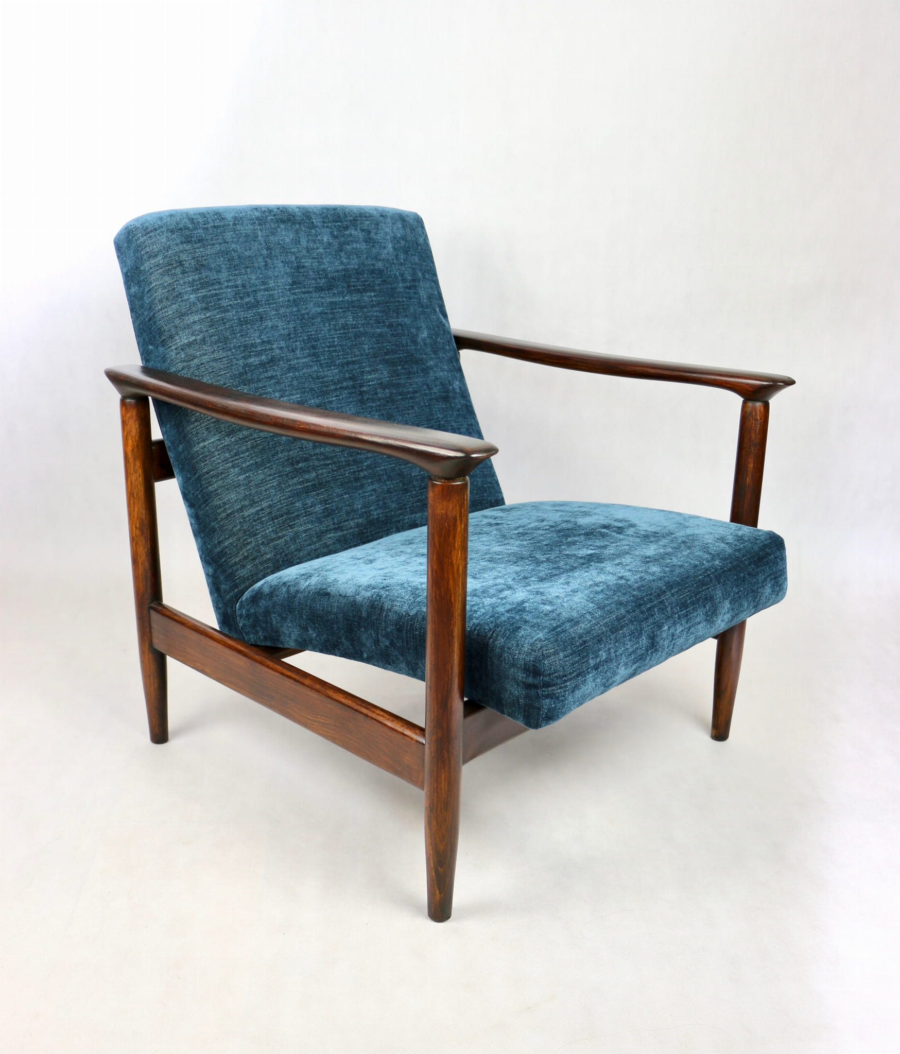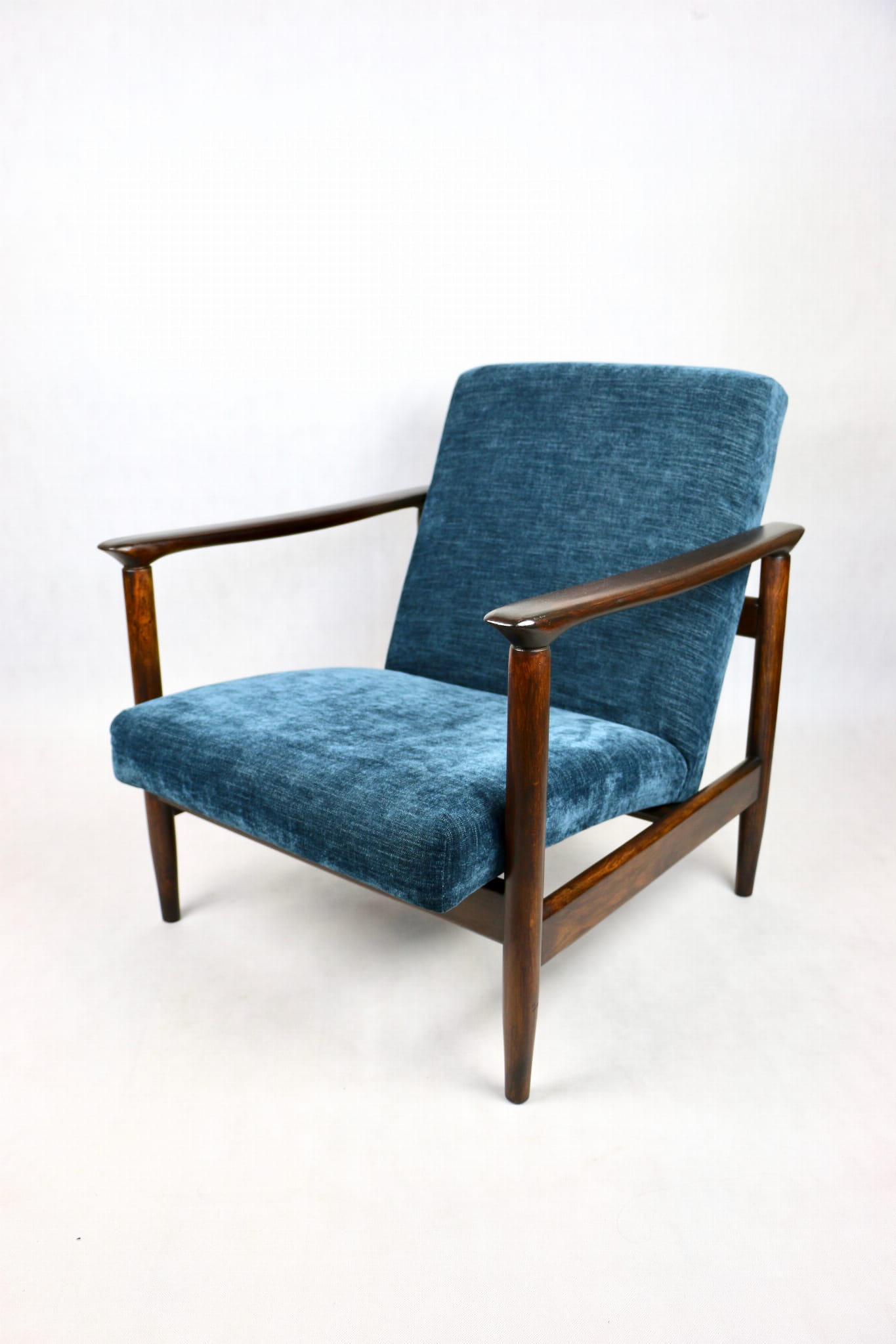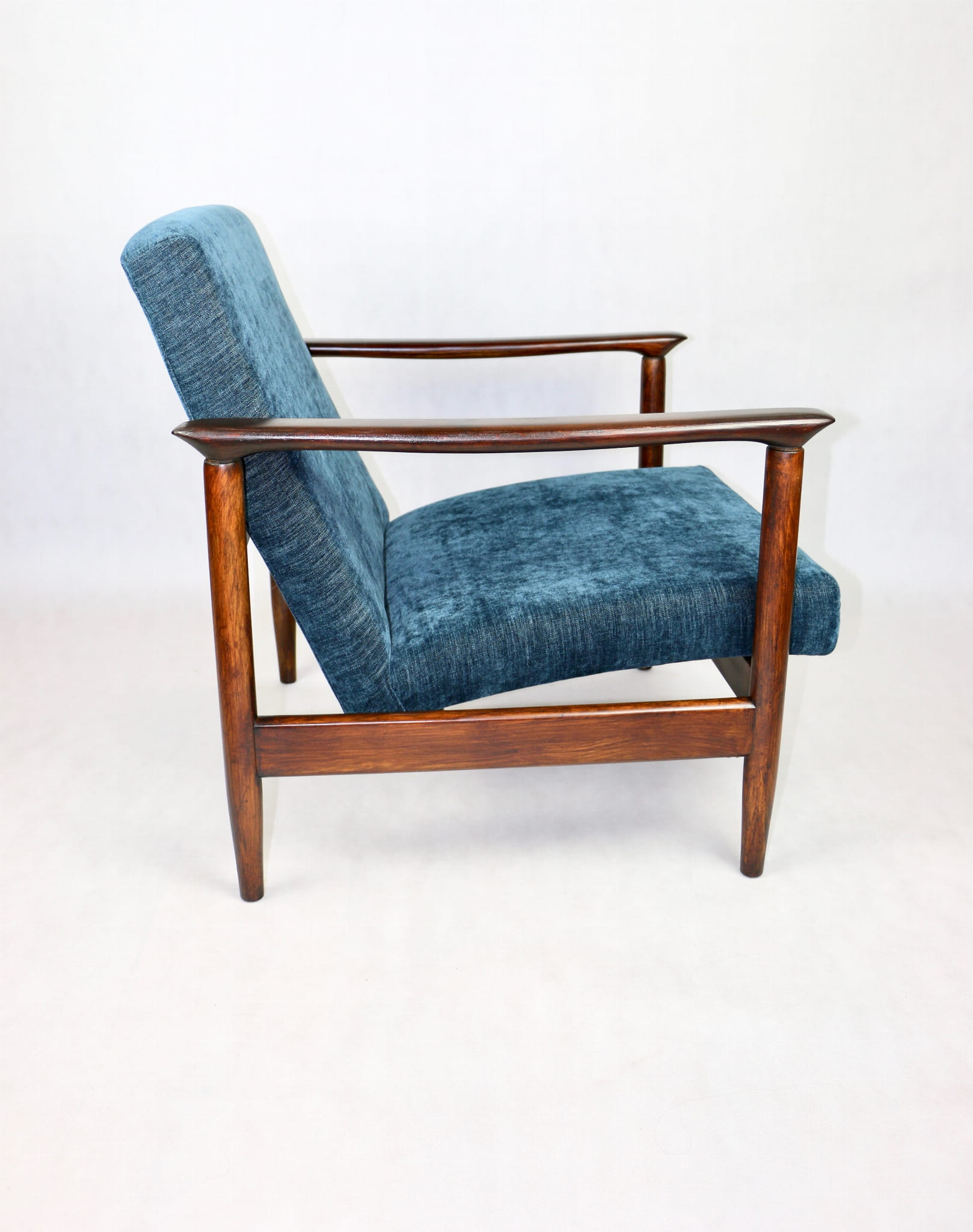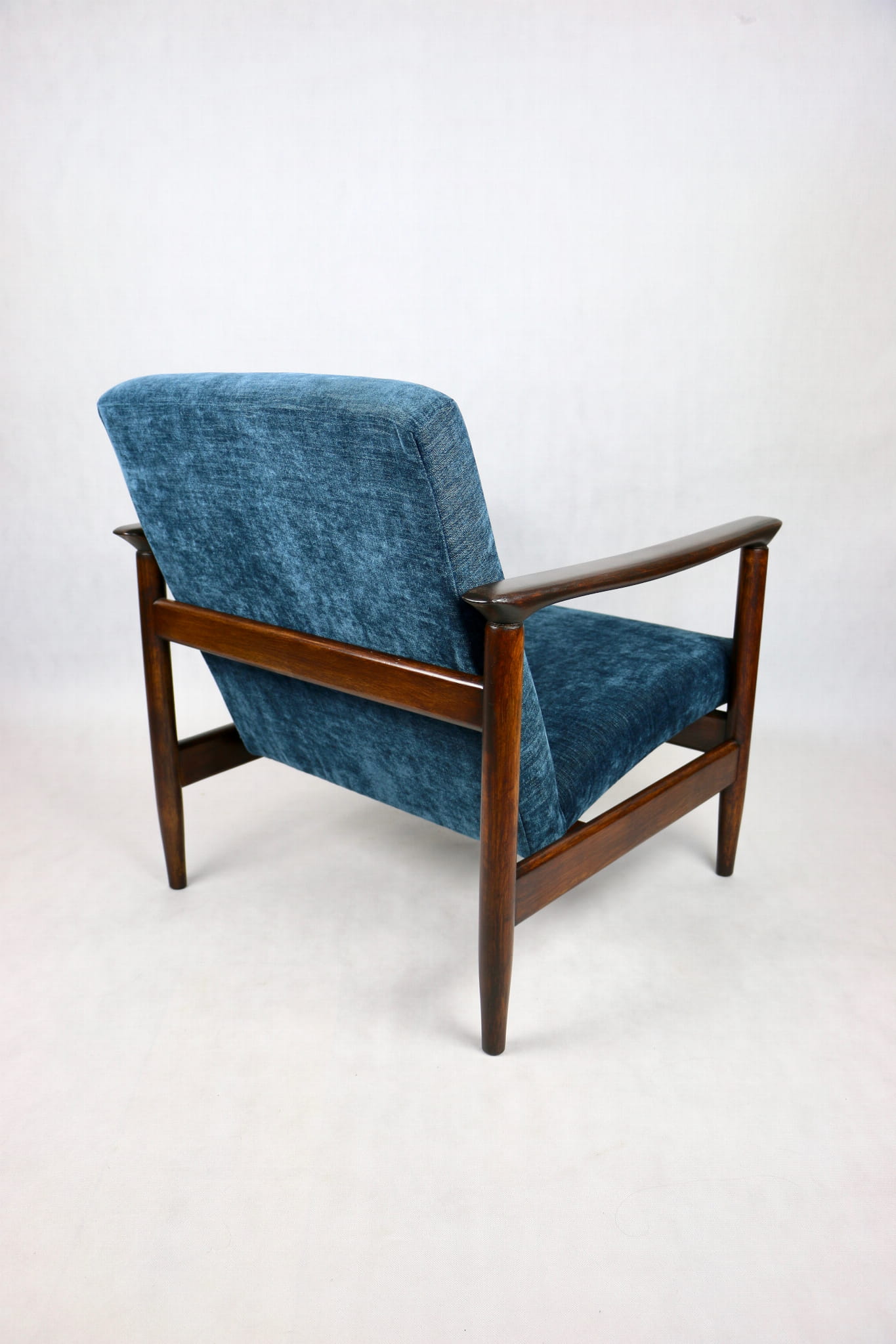 Fotel GFM - 142 zaprojektowany przez Edmunda Homę. Kompletnie odrestaurowany - nowa tapicerka wraz z wypełnieniem została pokryta materiałem tapicerskim strukturalnym w kolorze niebieskim/ granatowym z serii Boston. Podparcia i nóżki drewniane, pokryte lakierem w kolorze ciemnego drewna.