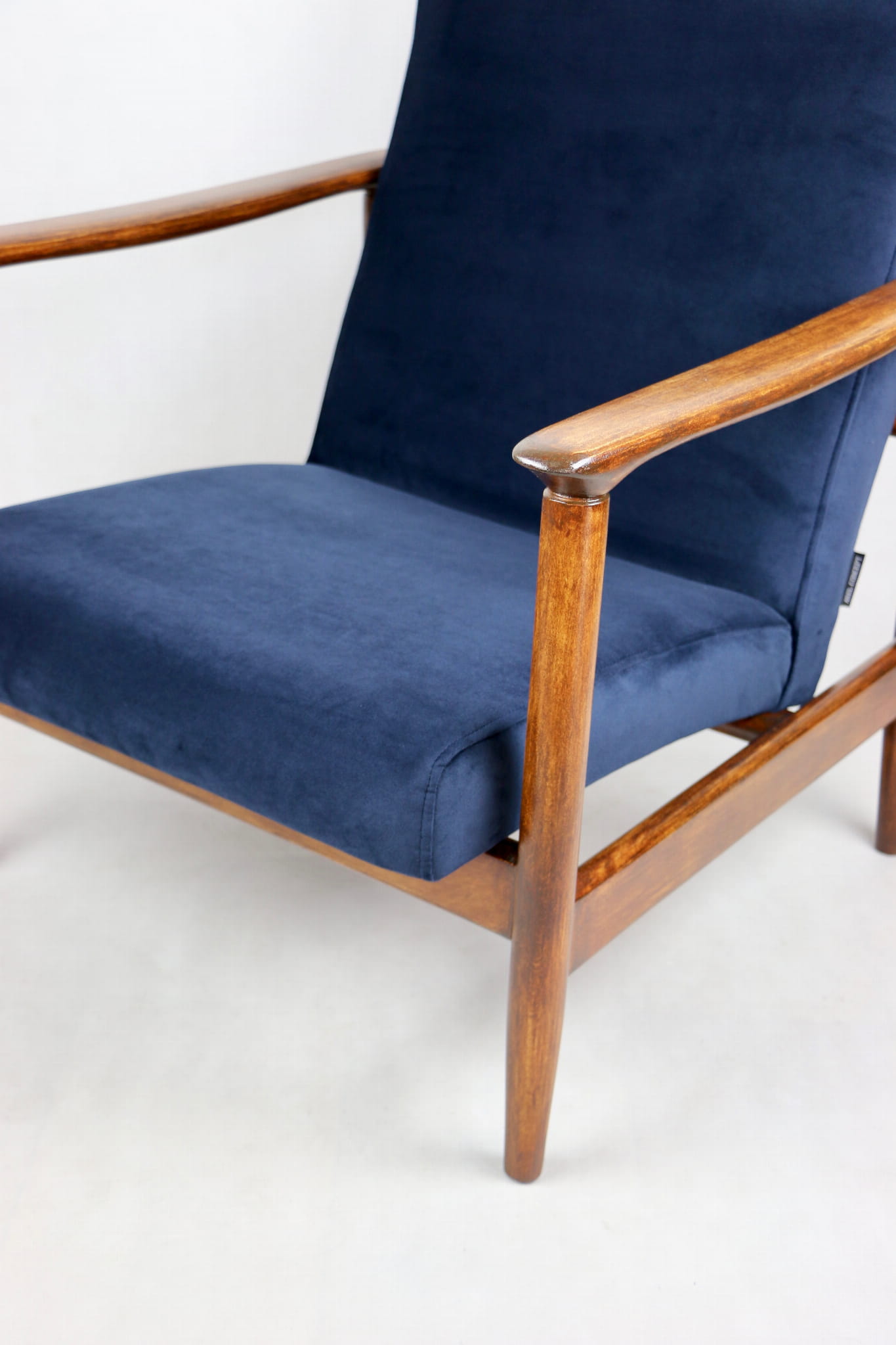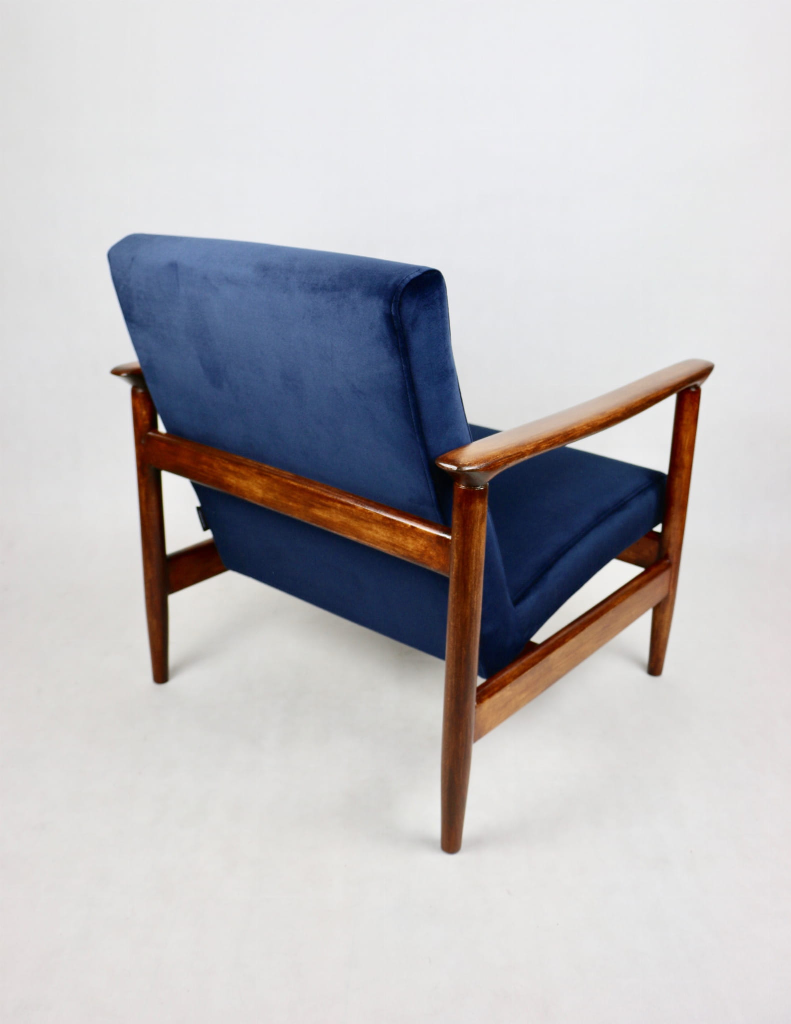 Fotel GFM - 142 zaprojektowany przez Edmunda Homę. Kompletnie odrestaurowany - nowa tapicerka wraz z wypełnieniem została pokryta materiałem tapicerskim typu Velwet w kolorze granatowym z serii Paris. Podparcia i nóżki drewniane, pokryte lakierem w kolorze brązowego drewna.