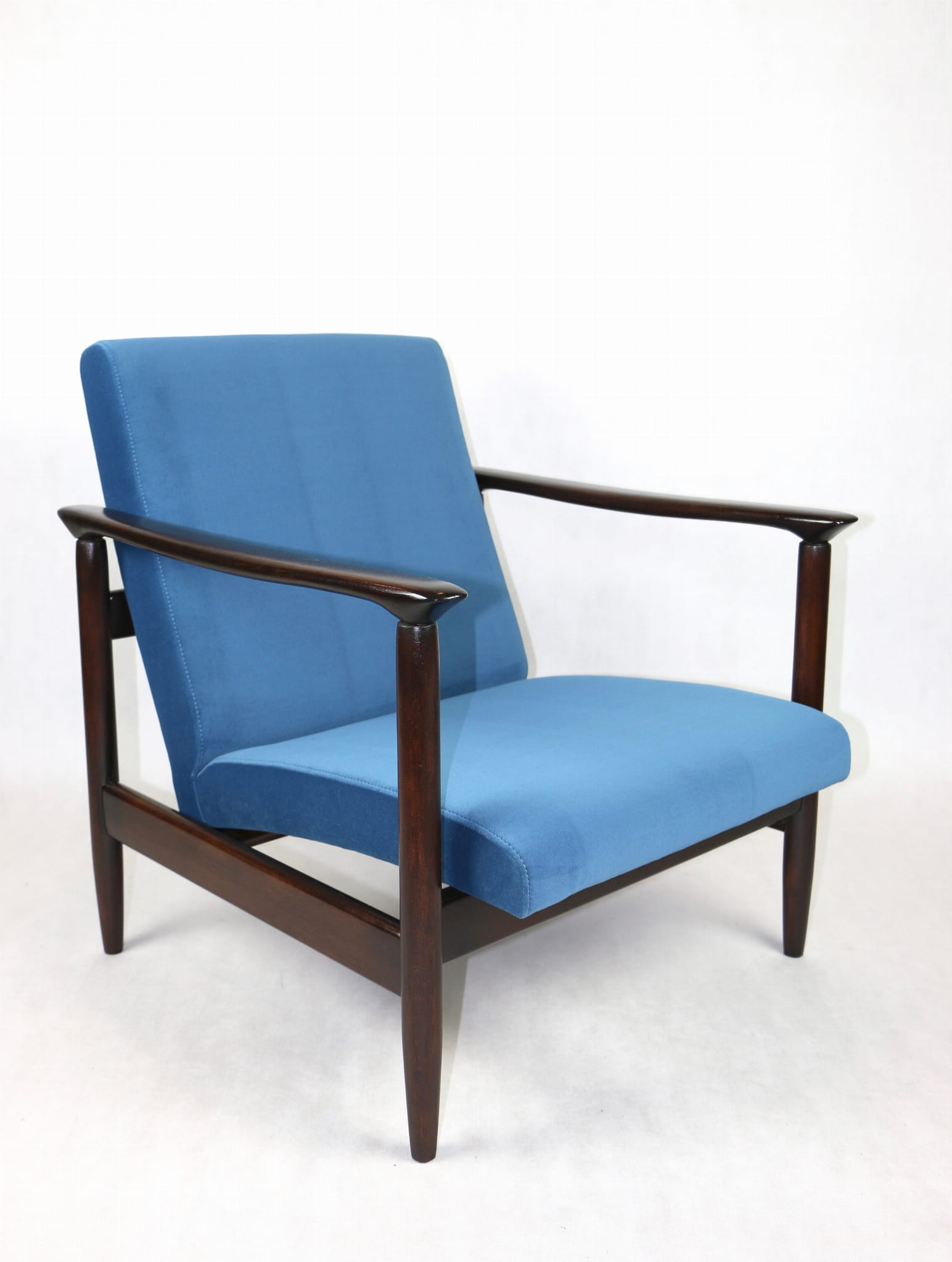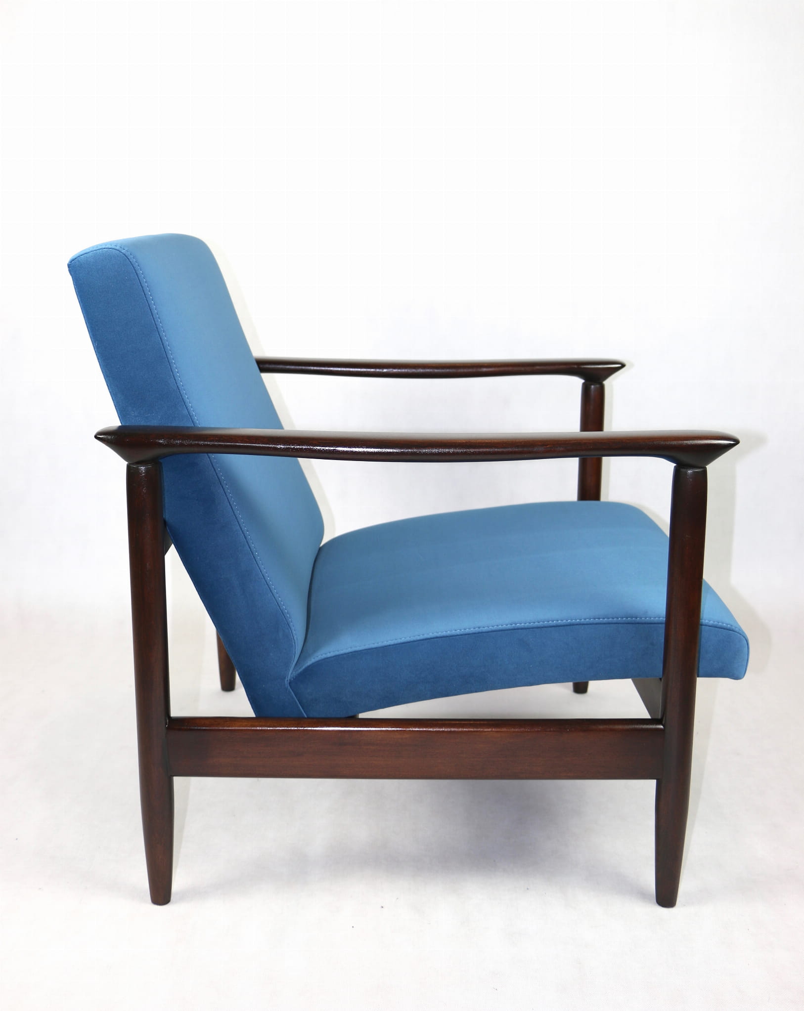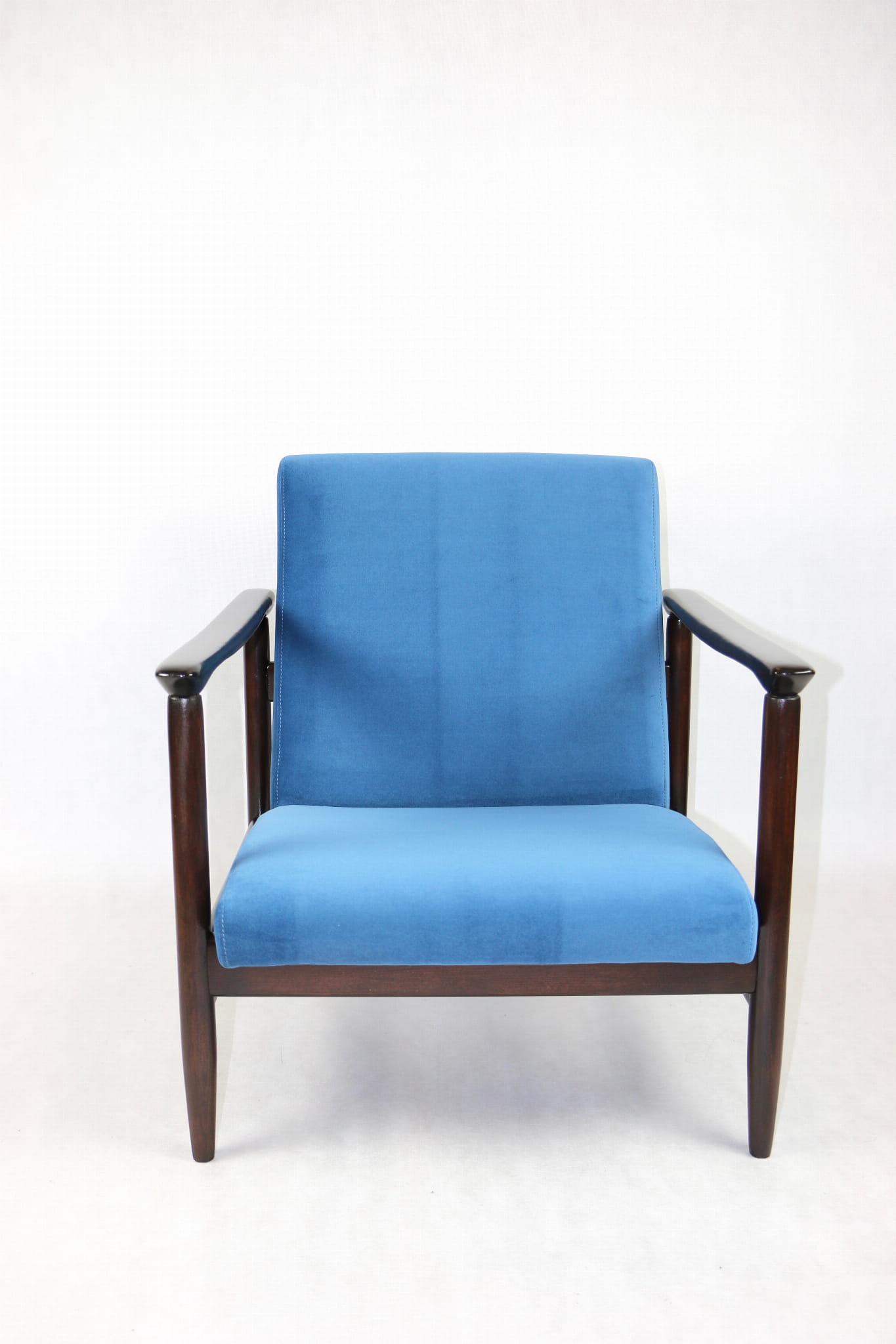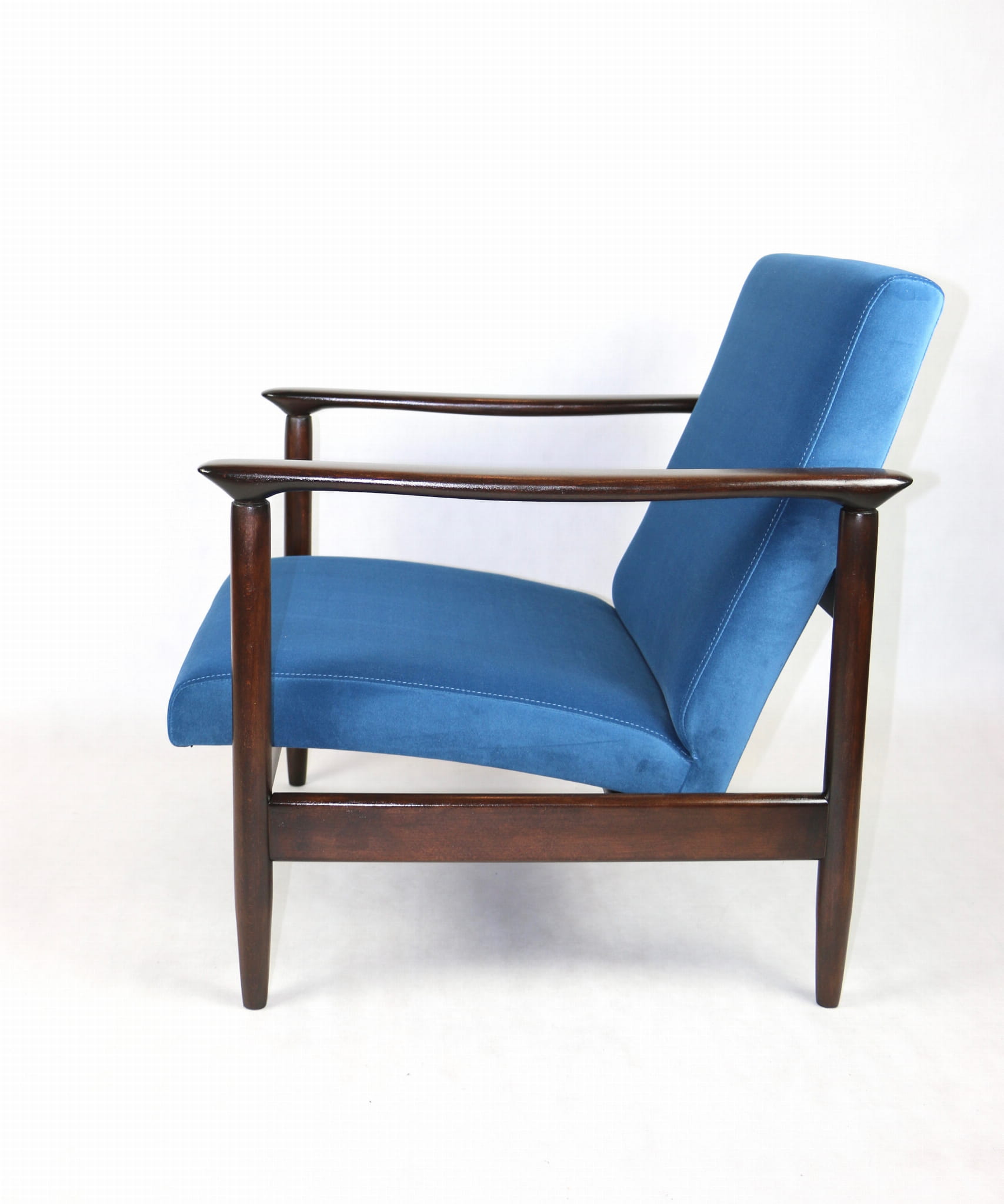 Fotel GFM - 142 zaprojektowany przez Edmunda Homę. Kompletnie odrestaurowany - nowa tapicerka wraz z wypełnieniem została pokryta materiałem tapicerskim welwetem w kolorze niebieskim - morskim z serii Jade easy to clean - kolor 601. Podparcia i nóżki drewniane, pokryte lakierem w kolorze ciemnego drewna.