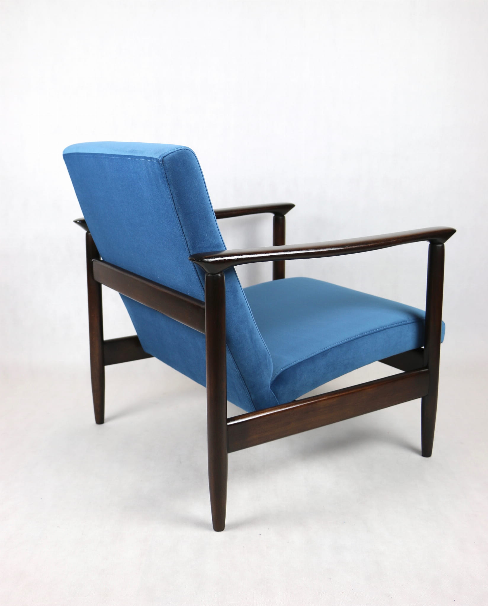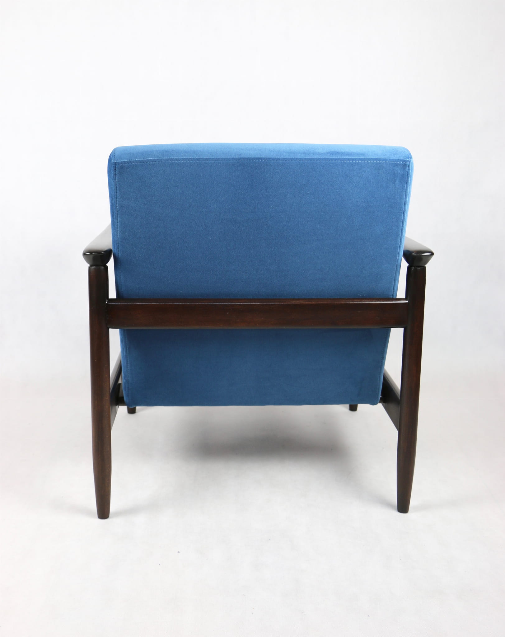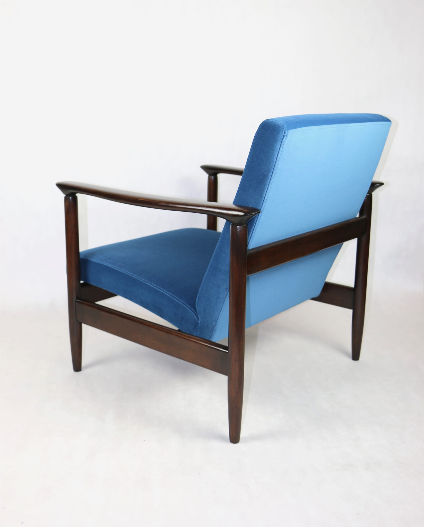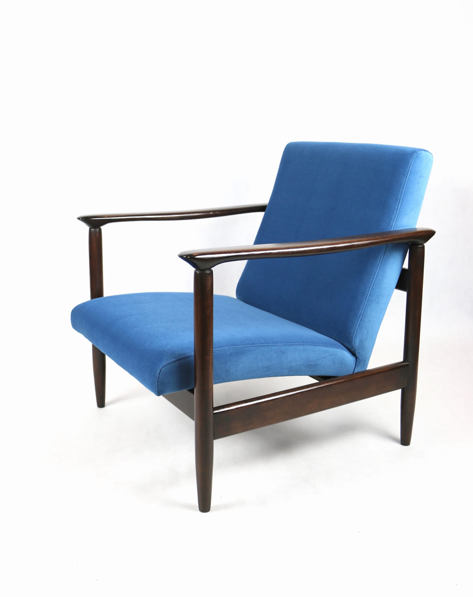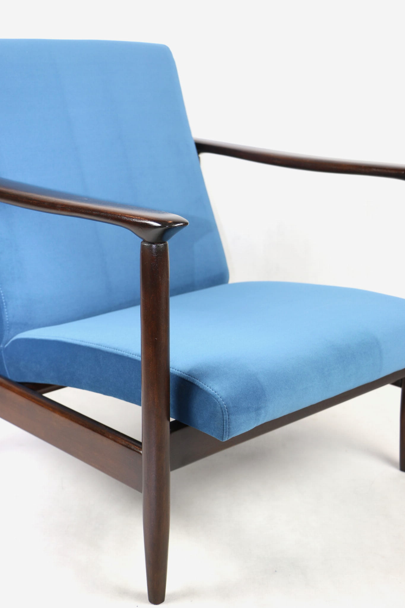 Fotel GFM - 142 zaprojektowany przez Edmunda Homę. Kompletnie odrestaurowany - nowa tapicerka wraz z wypełnieniem została pokryta materiałem tapicerskim welwetem w kolorze niebieskim - morskim z serii Jade easy to clean - kolor 601. Podparcia i nóżki drewniane, pokryte lakierem w kolorze ciemnego drewna.