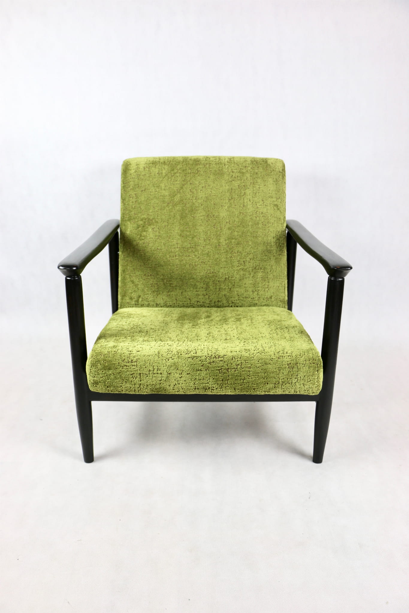 Fotel GFM - 142 zaprojektowany przez Edmunda Homę. Kompletnie odrestaurowany - nowa tapicerka wraz z wypełnieniem została pokryta materiałem tapicerskim strukturalnym w kolorze oliwkowym. Podparcia i nóżki drewniane, pokryte lakierem w kolorze ciemnego drewna.