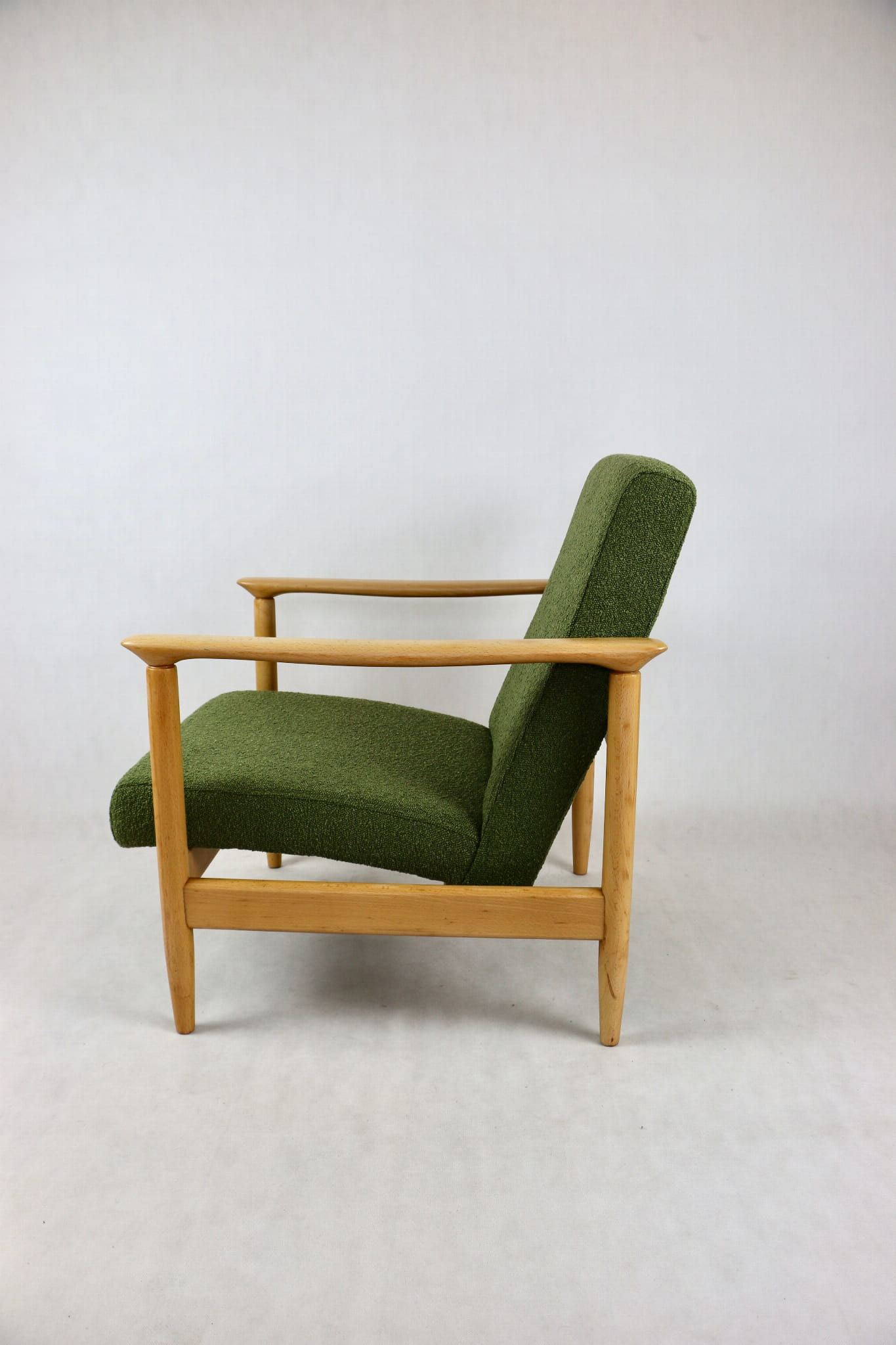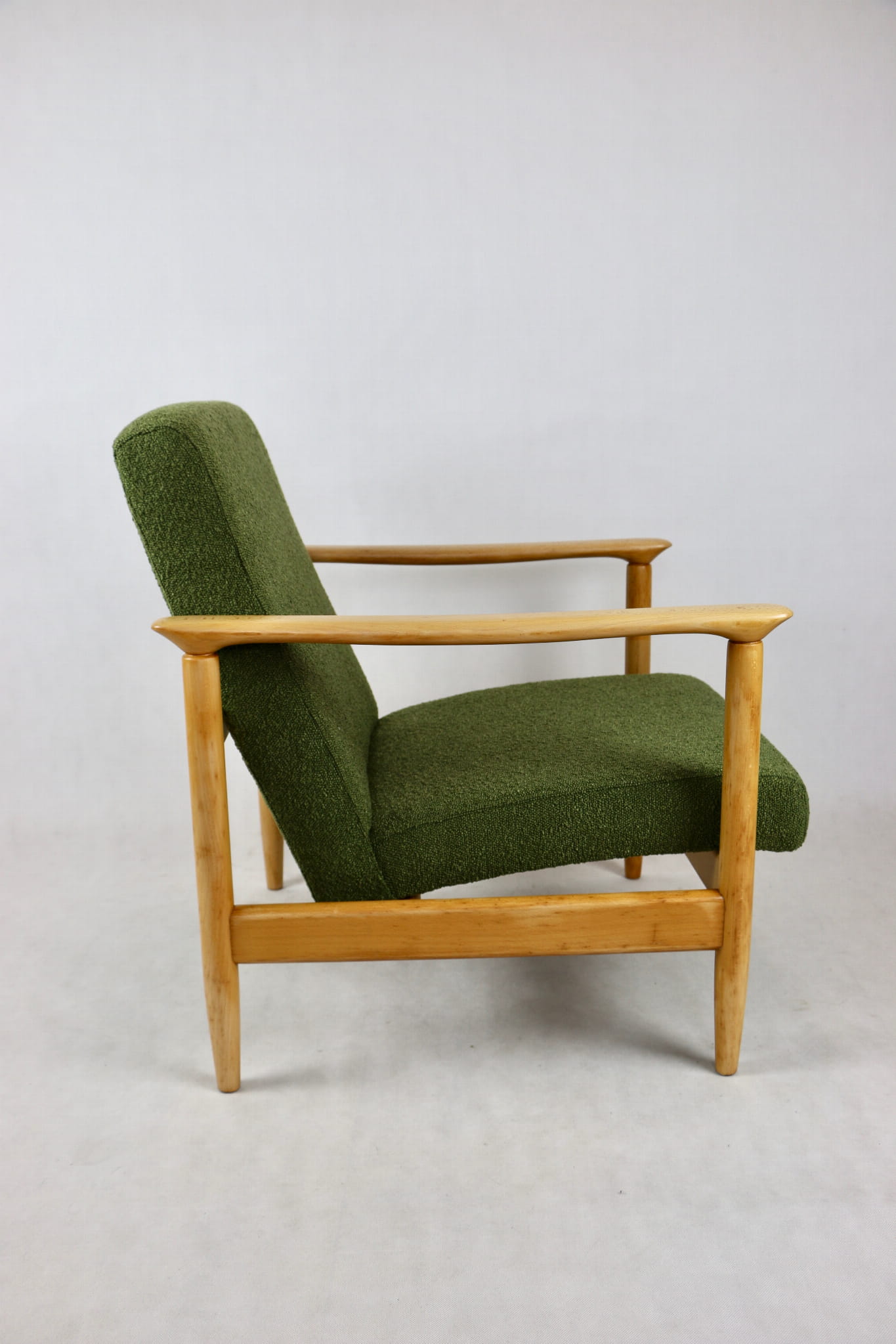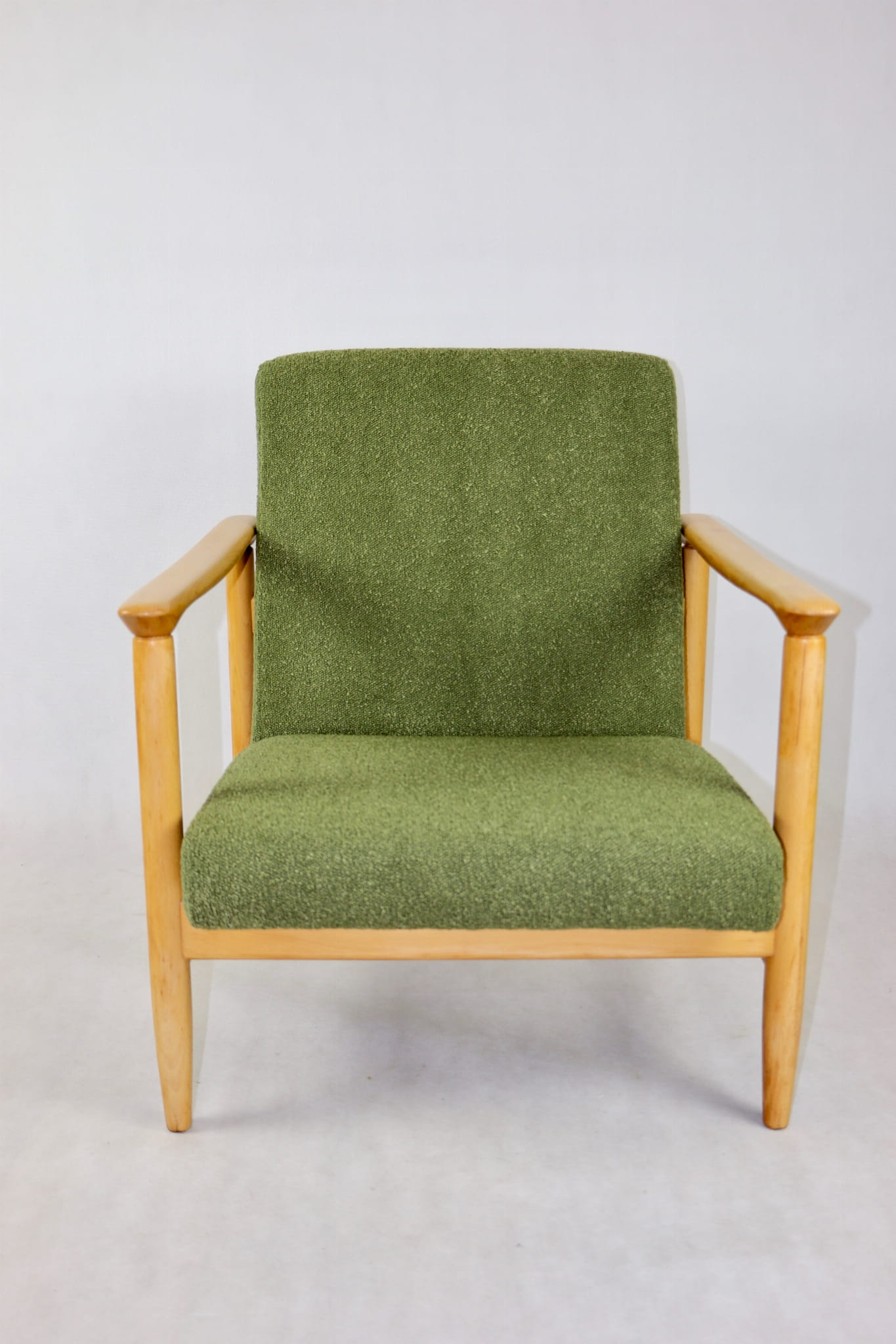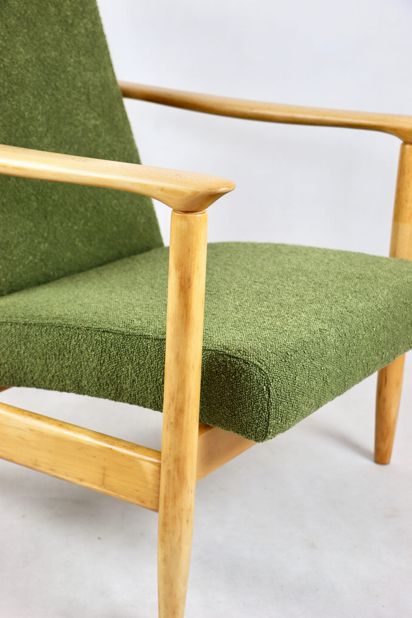 Fotel GFM-142, proj. Edmund Homa z lat 70 oliwkowy-zielony boucle - jasne drewno