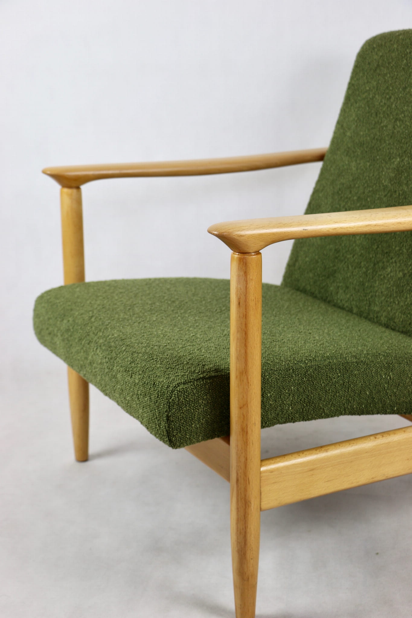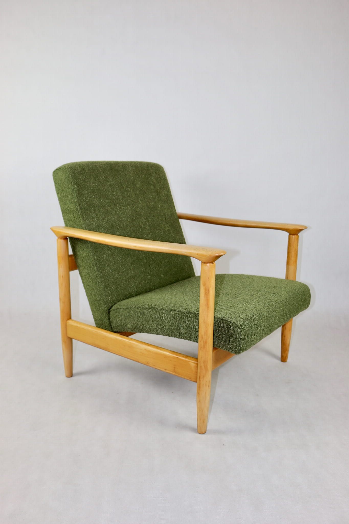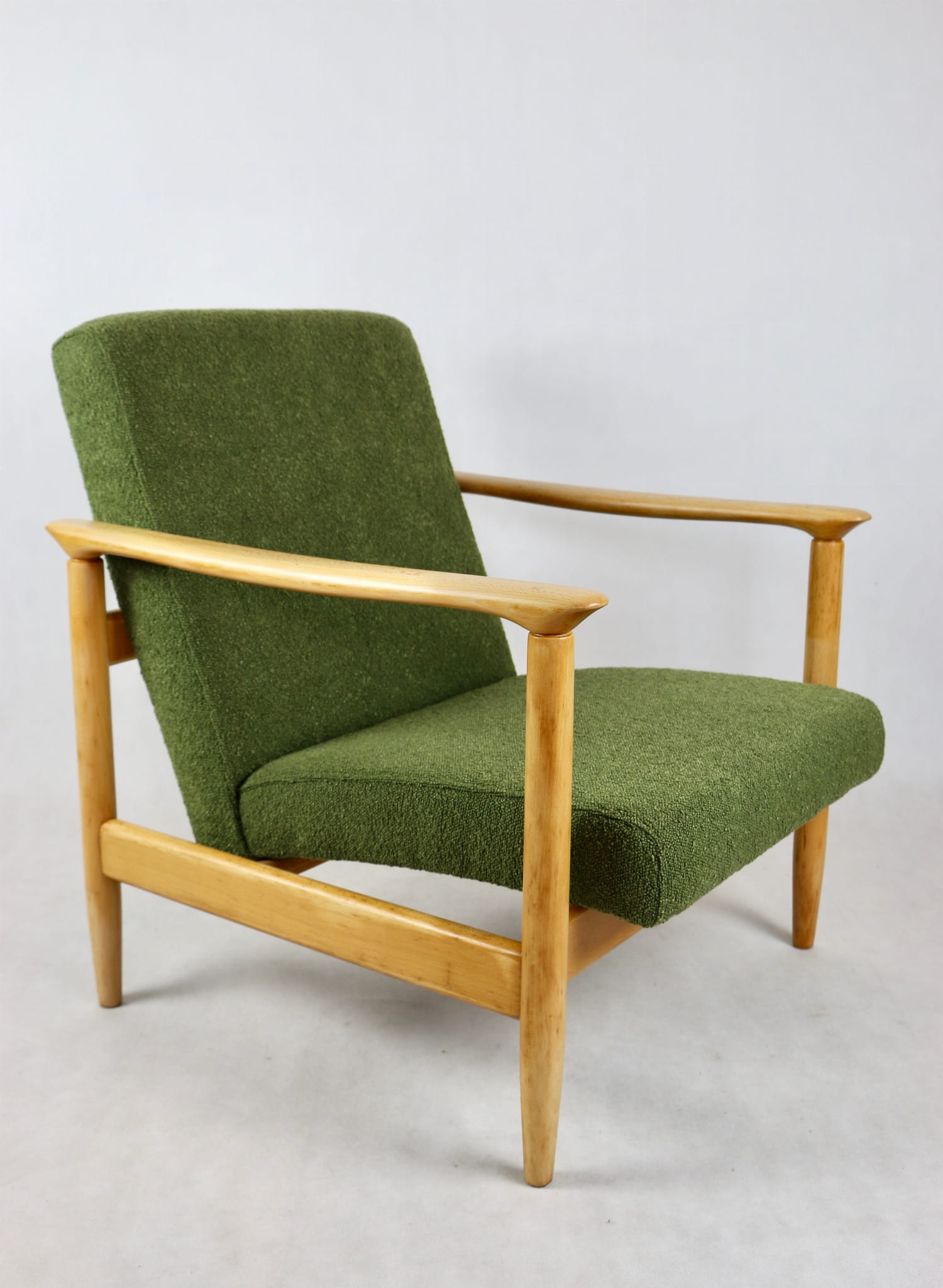 Fotel GFM-142, proj. Edmund Homa z lat 70 oliwkowy-zielony boucle - jasne drewno