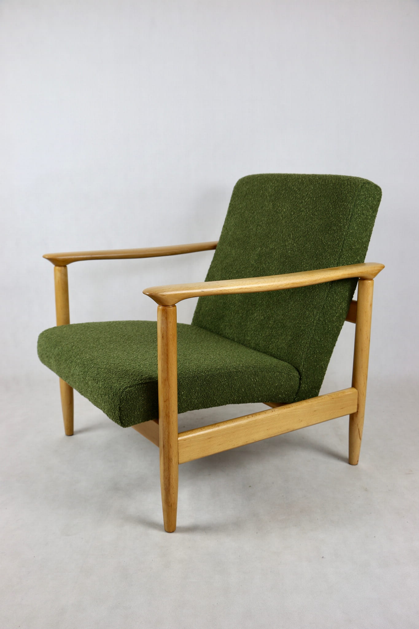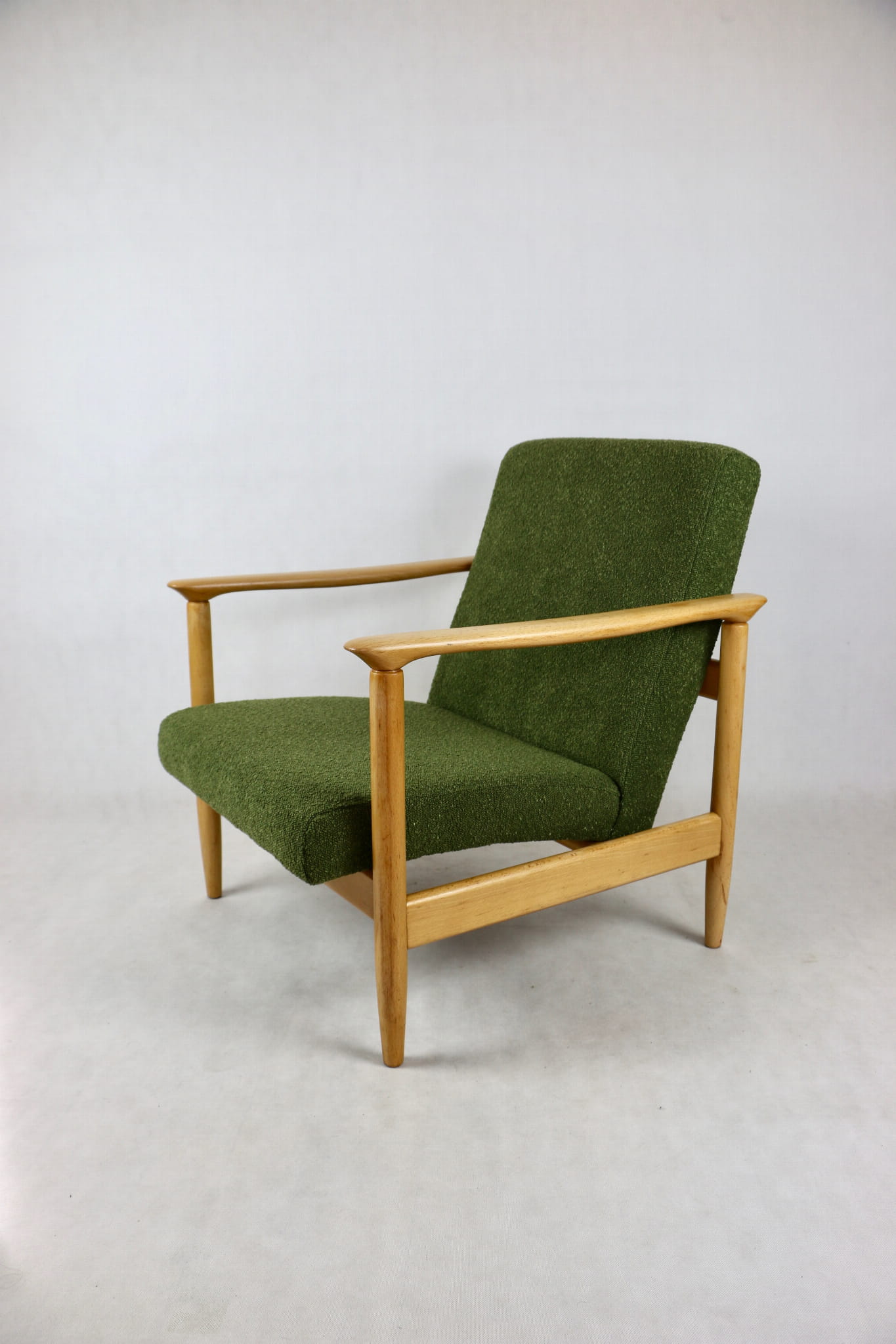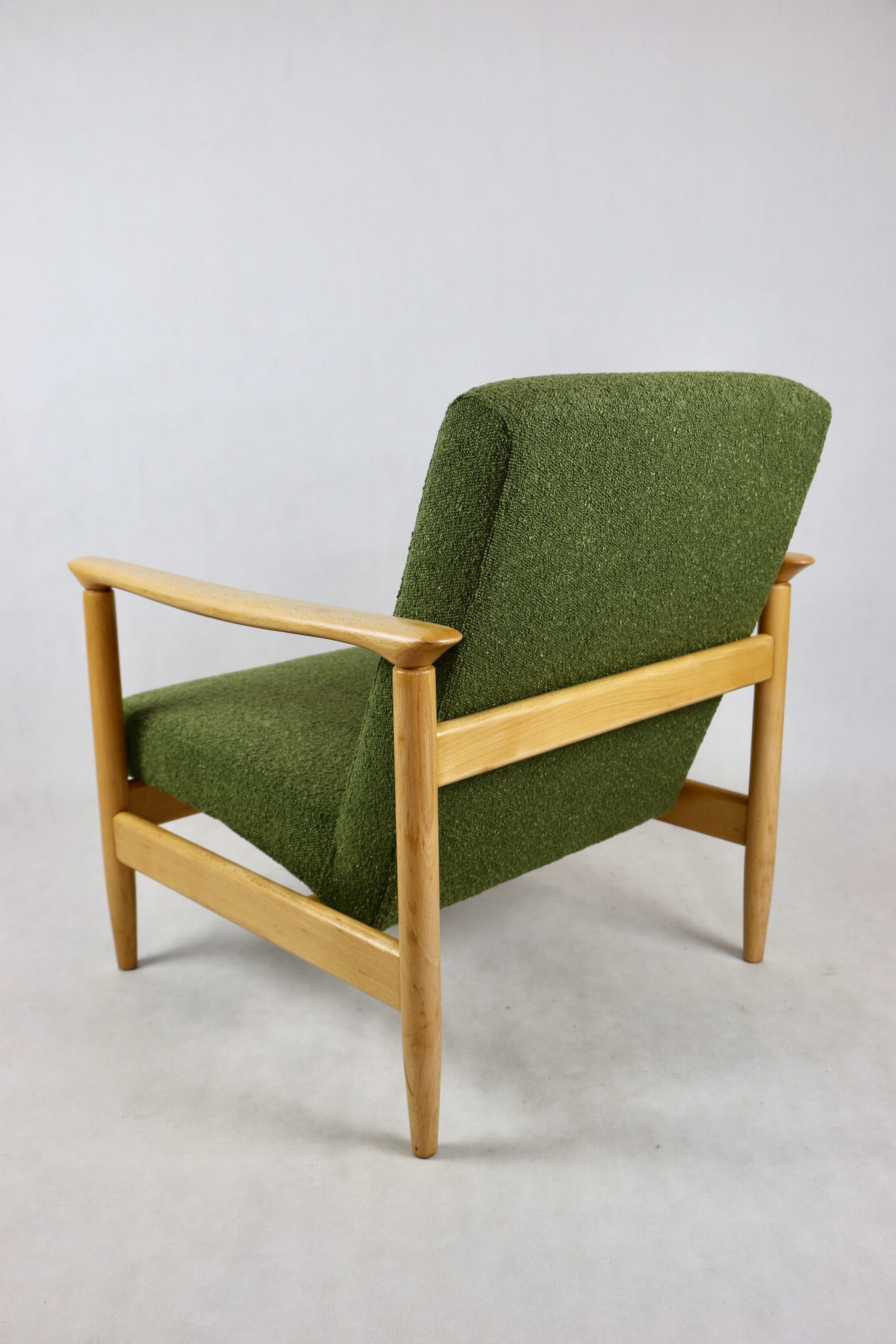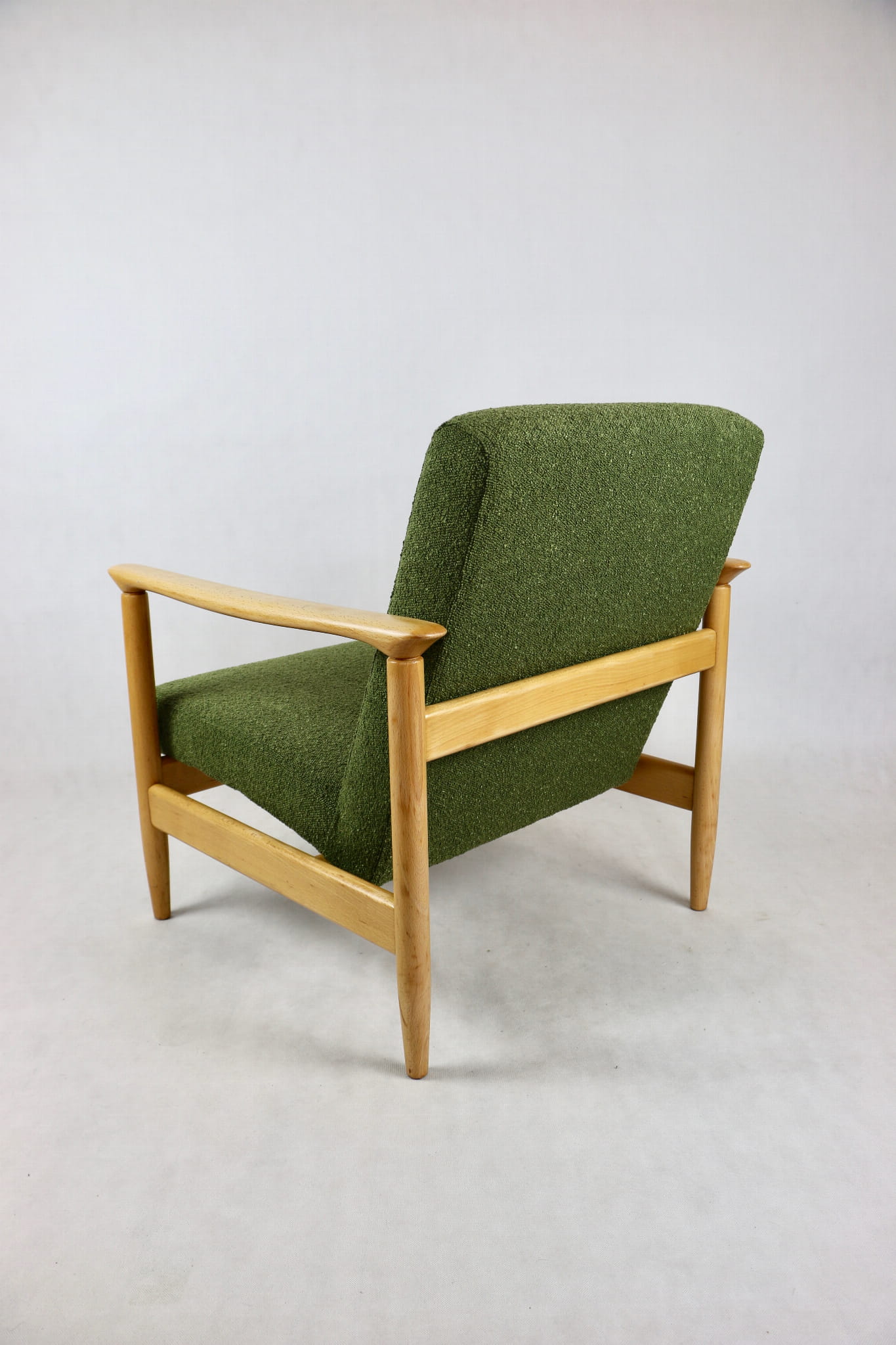 Fotel GFM-142, proj. Edmund Homa z lat 70 oliwkowy-zielony boucle - jasne drewno