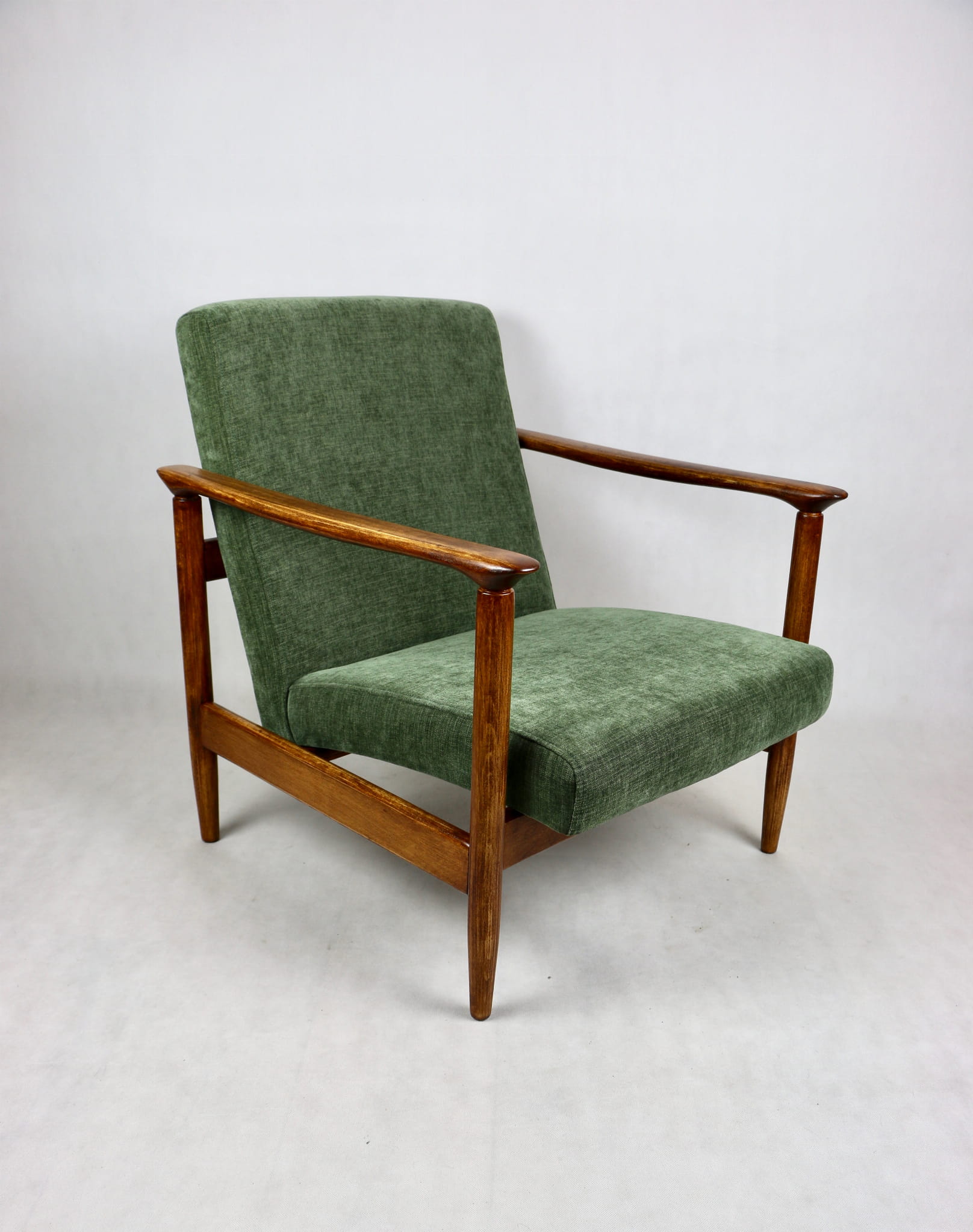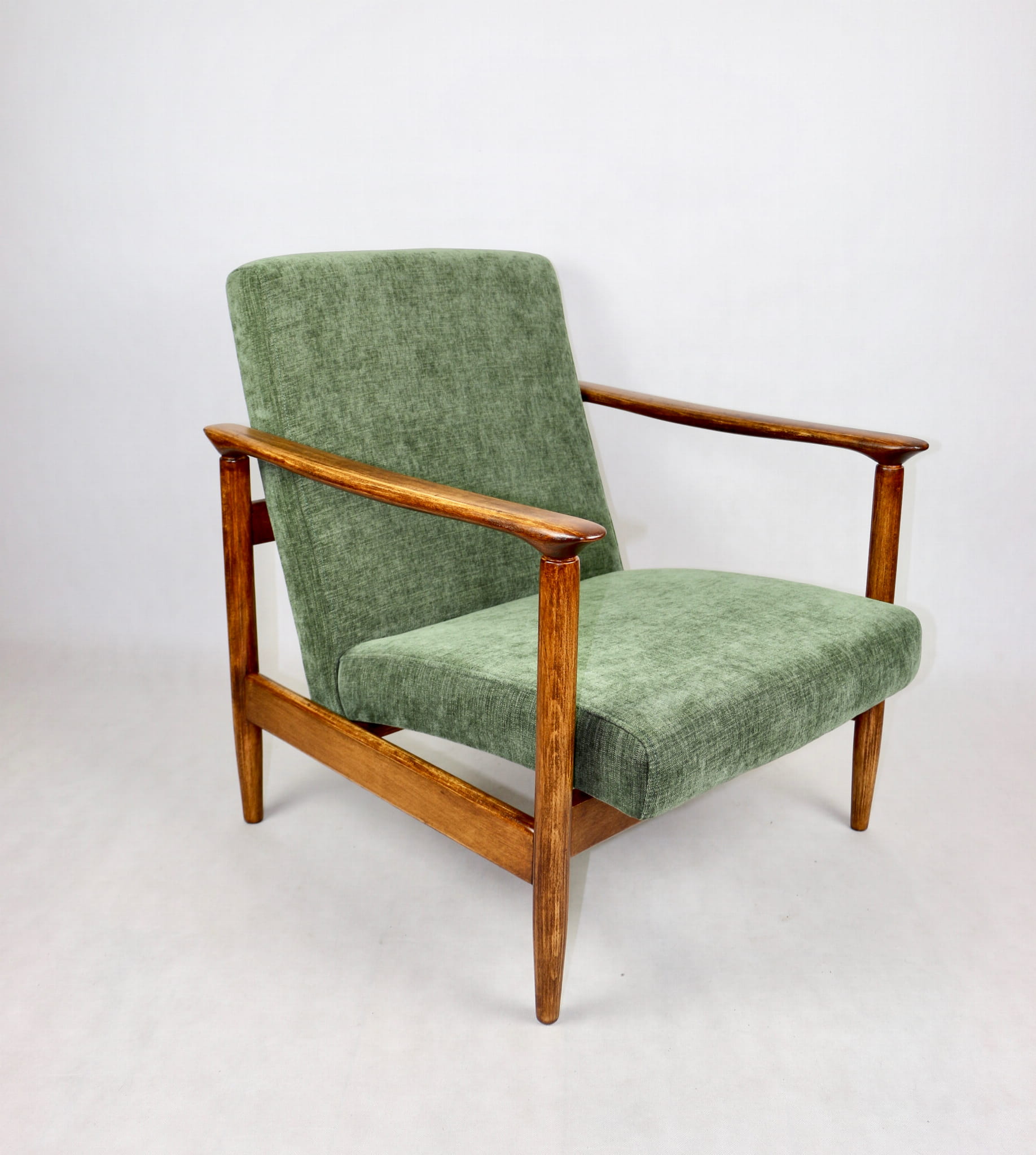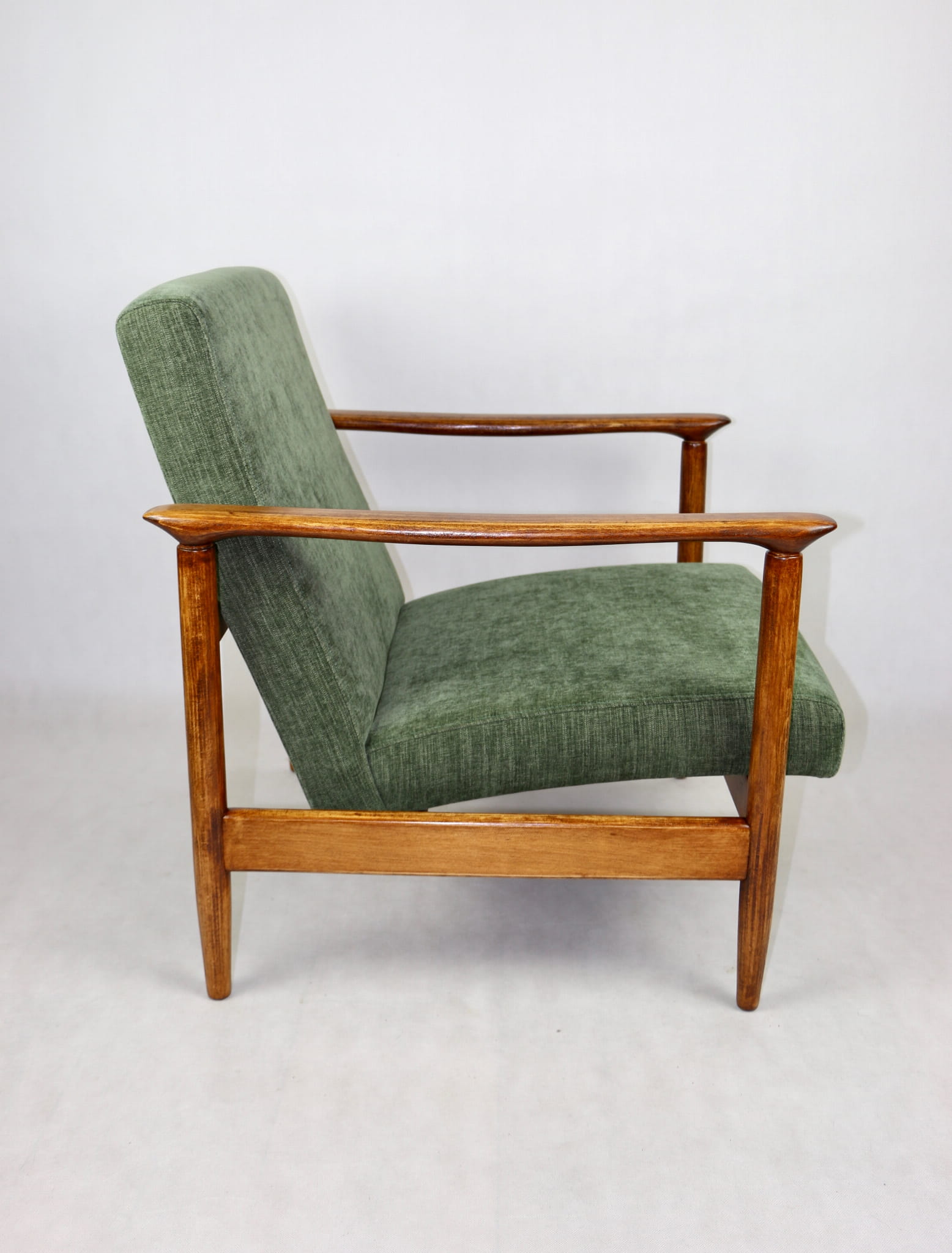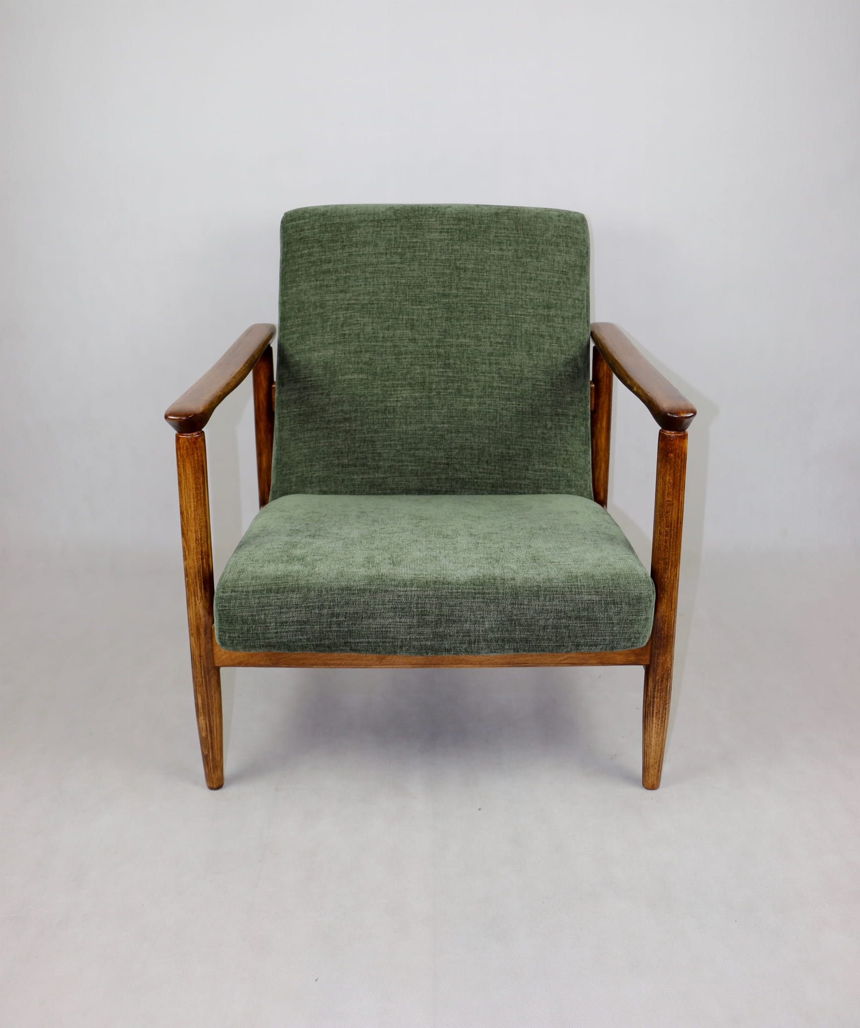 Fotel GFM-142, proj. Edmund Homa z lat 70 oliwkowy zielony - brązowe drewno - dostępne 2 sztuki