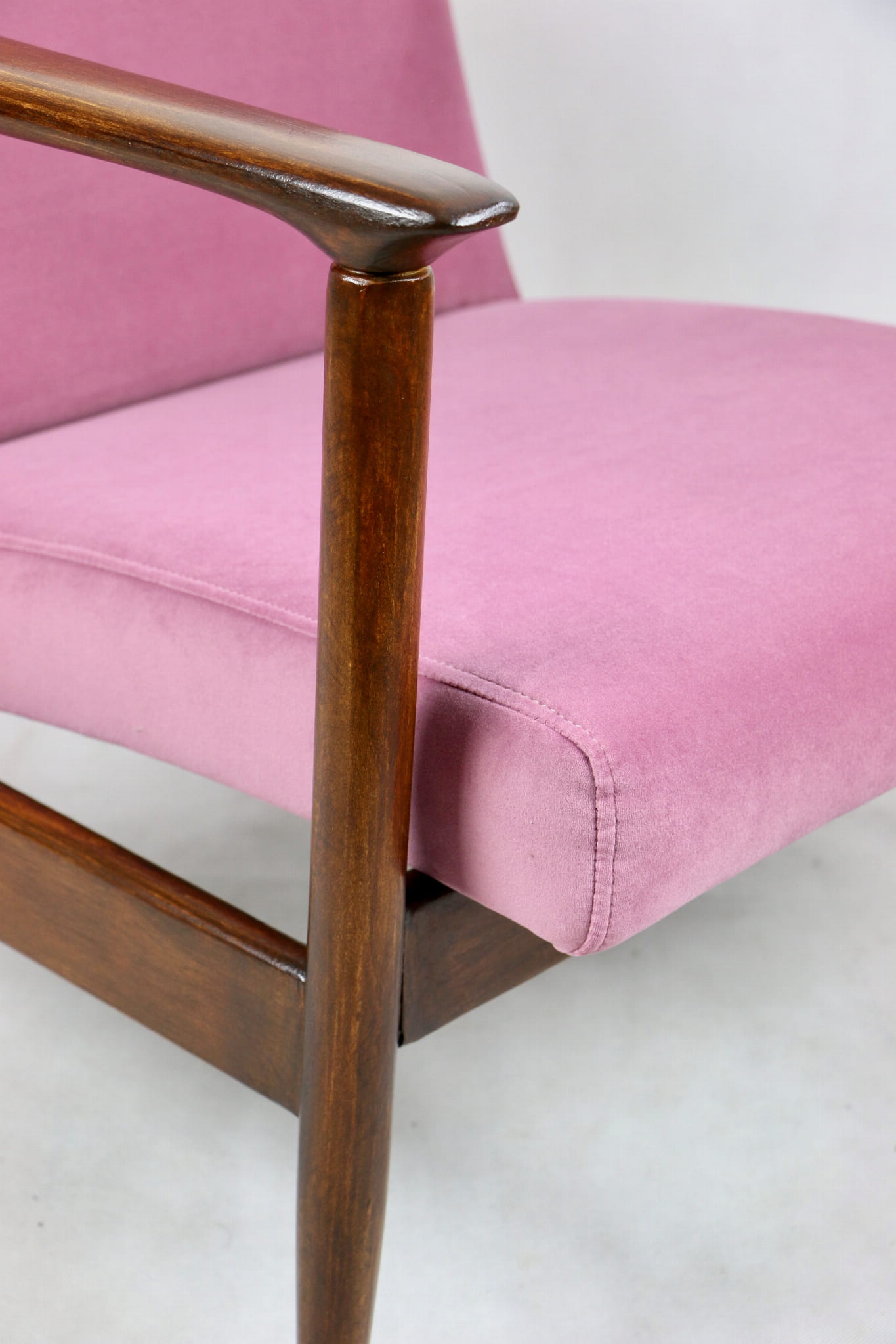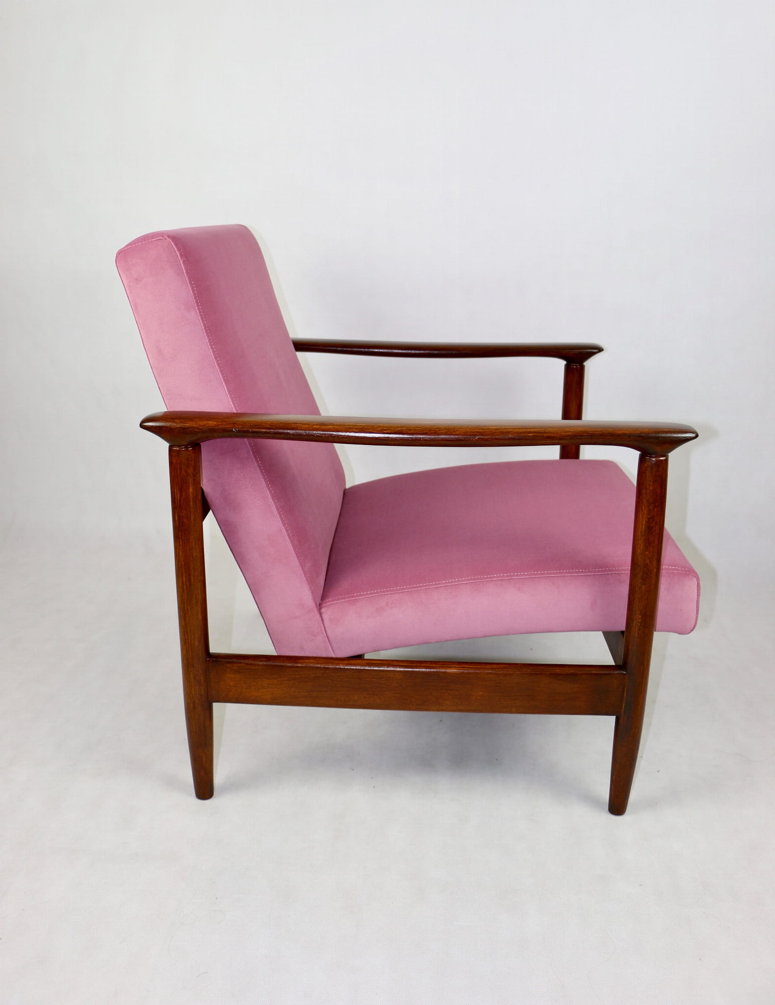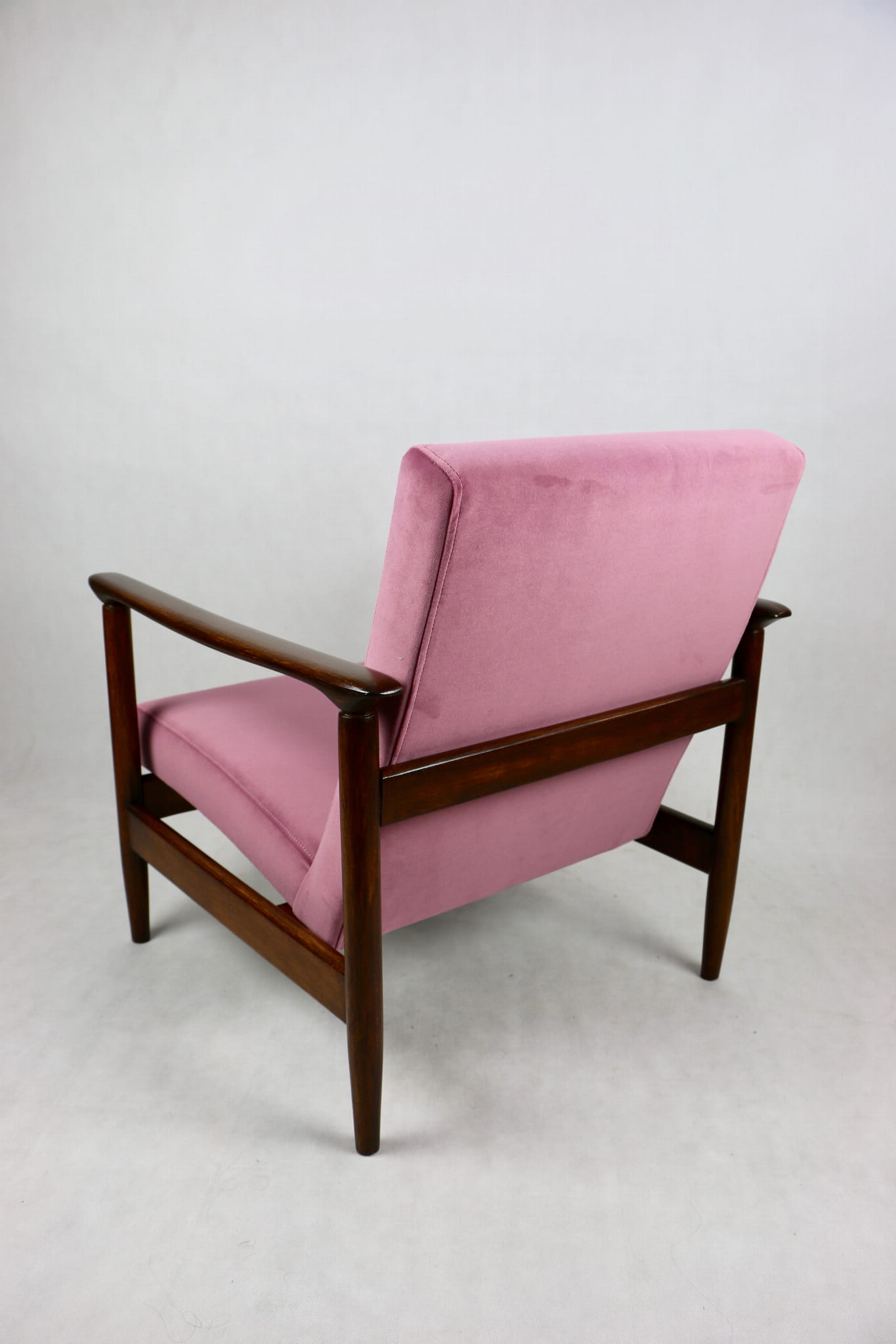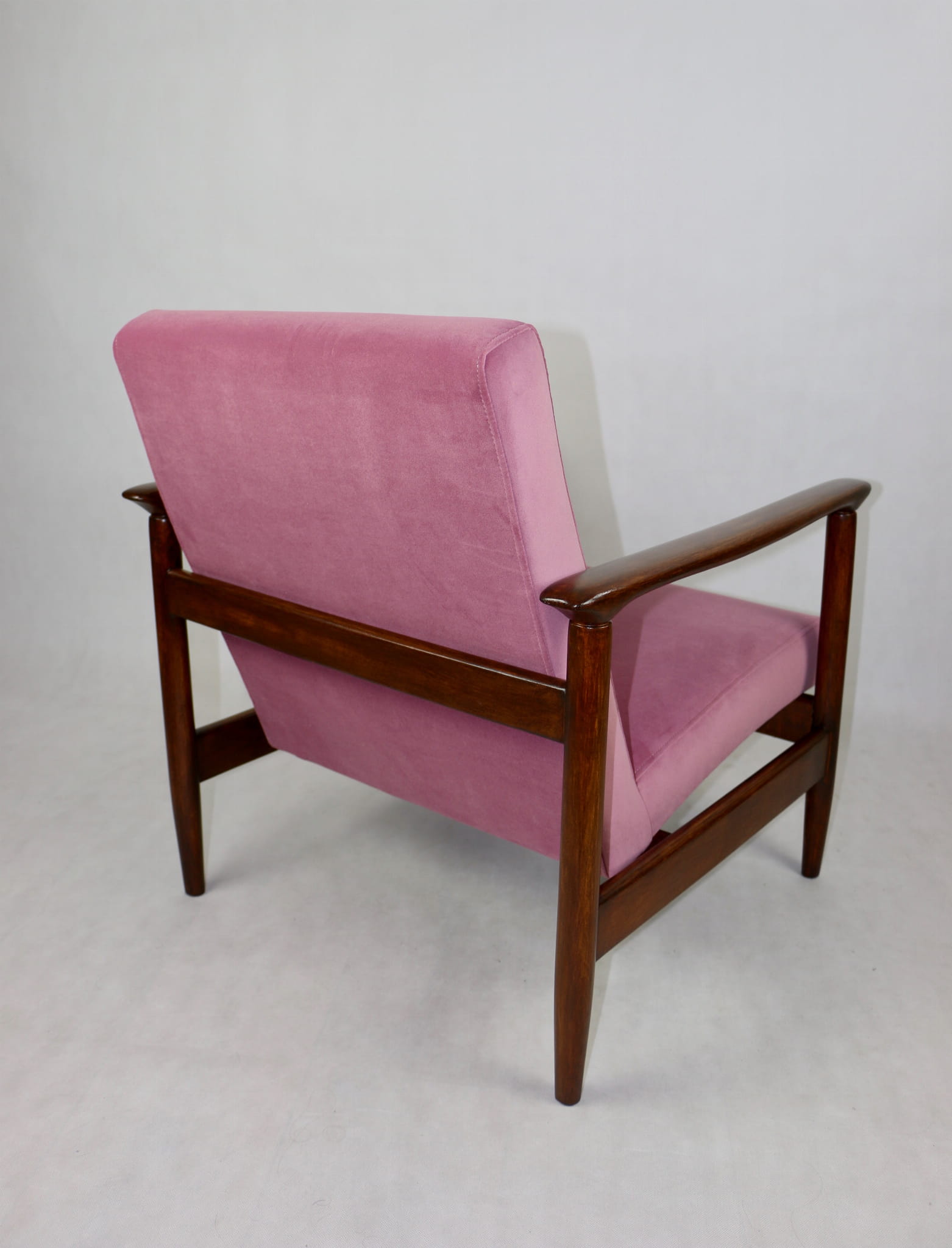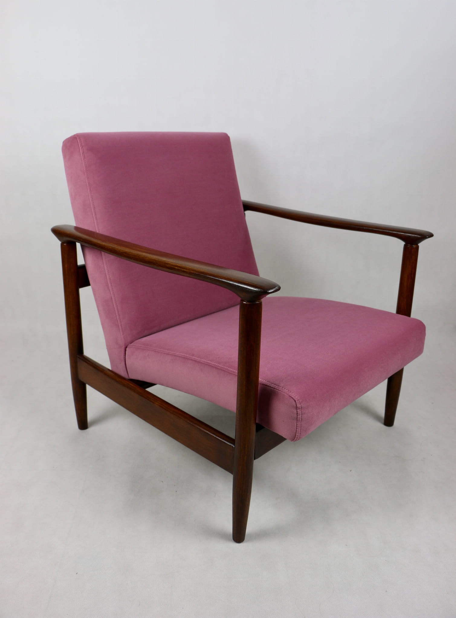 Fotel GFM - 142 zaprojektowany przez Edmunda Homę. Kompletnie odrestaurowany - nowa tapicerka wraz z wypełnieniem została pokryta materiałem tapicerskim typu welwet w kolorze różowym z serii Jade w kolorze 701. Podparcia i nóżki drewniane, naturalne pokryte lakierem w kolorze ciemnego drewna.