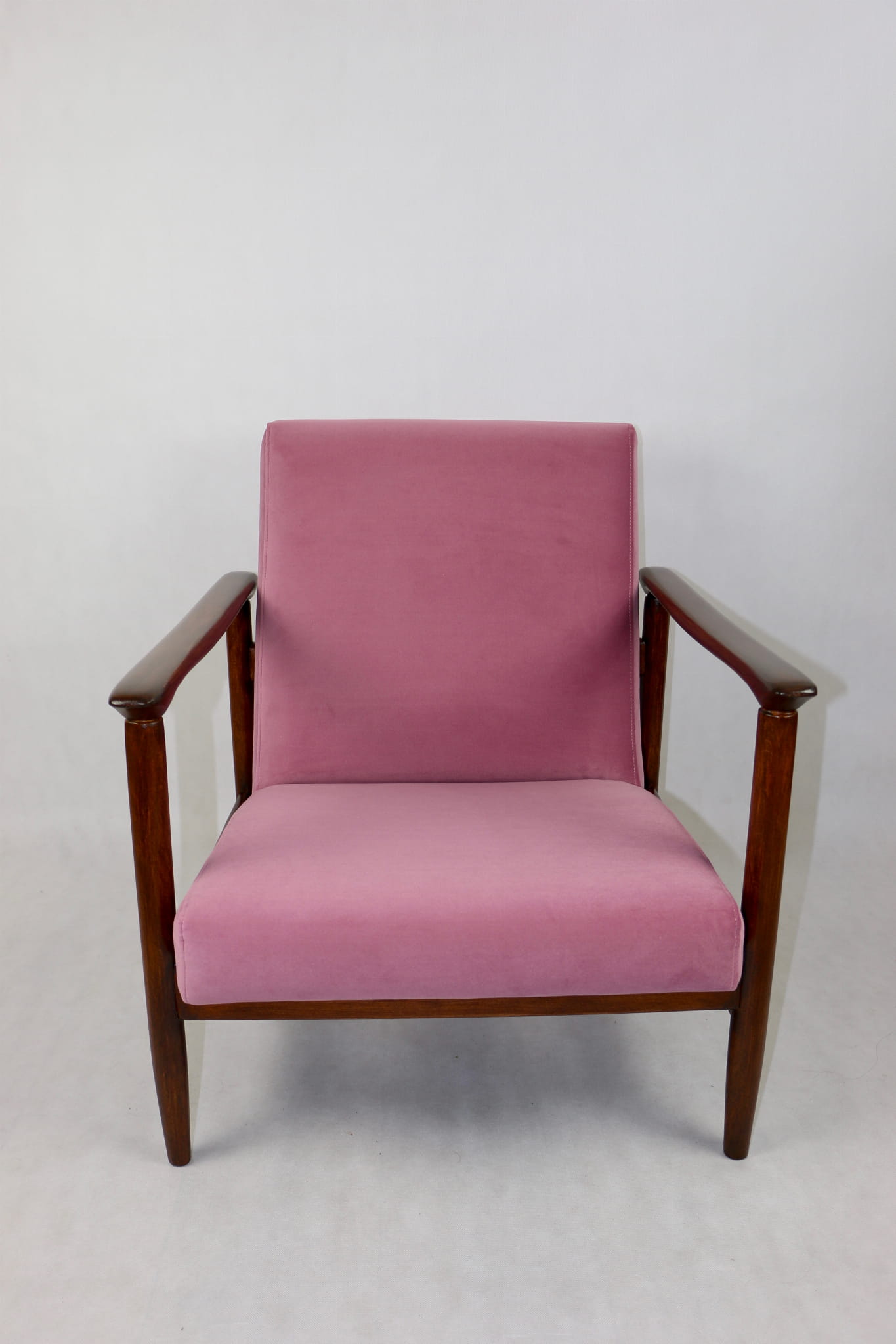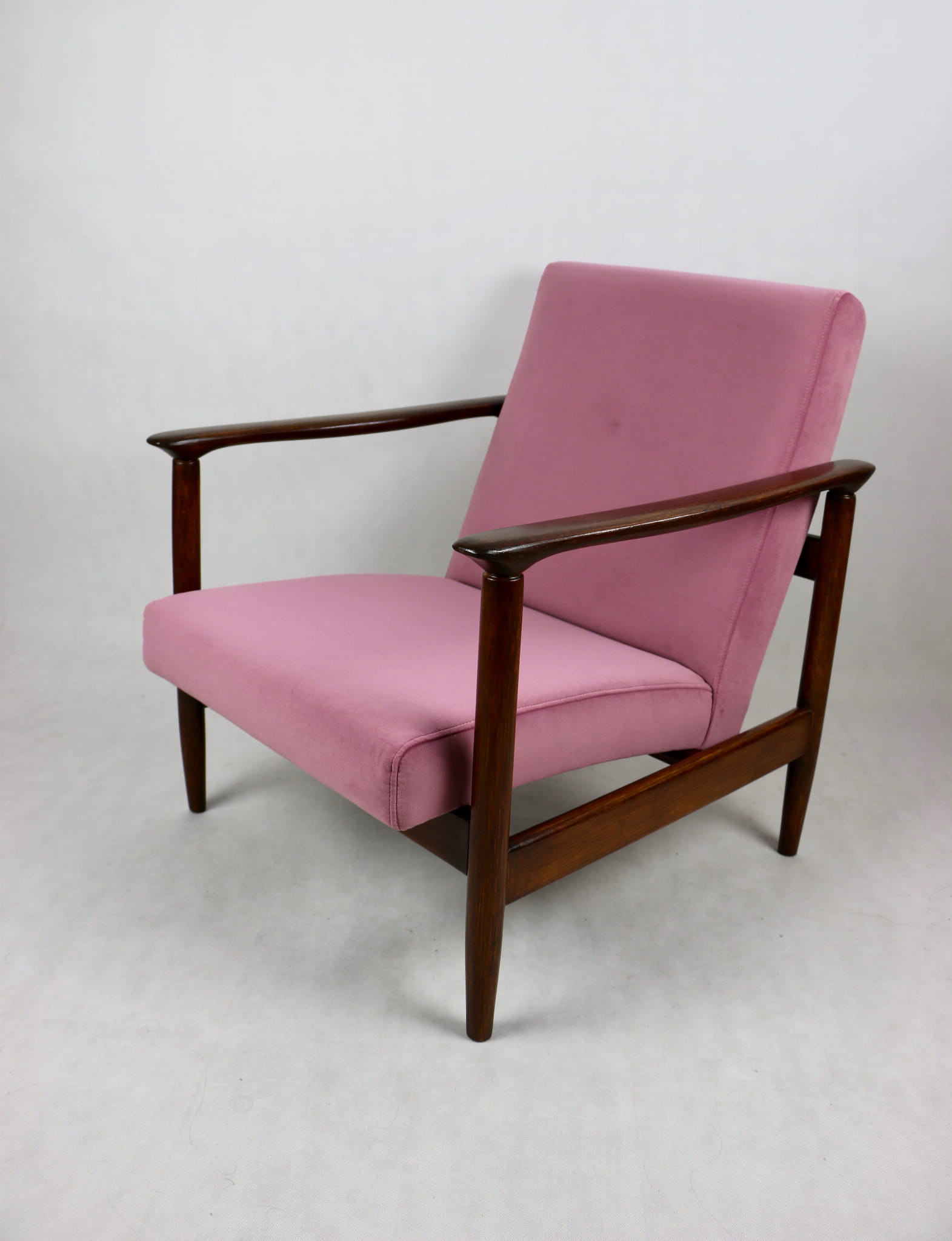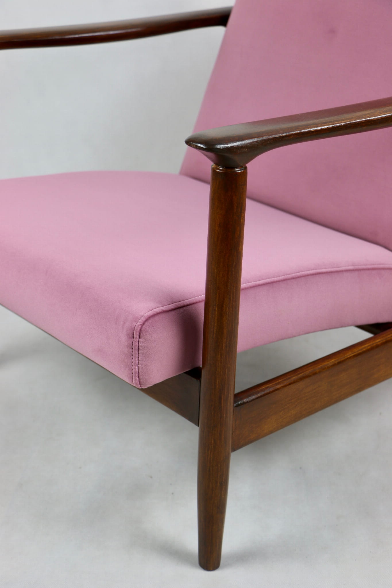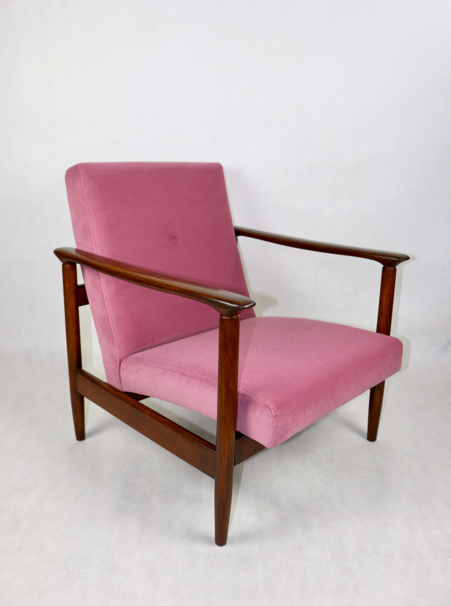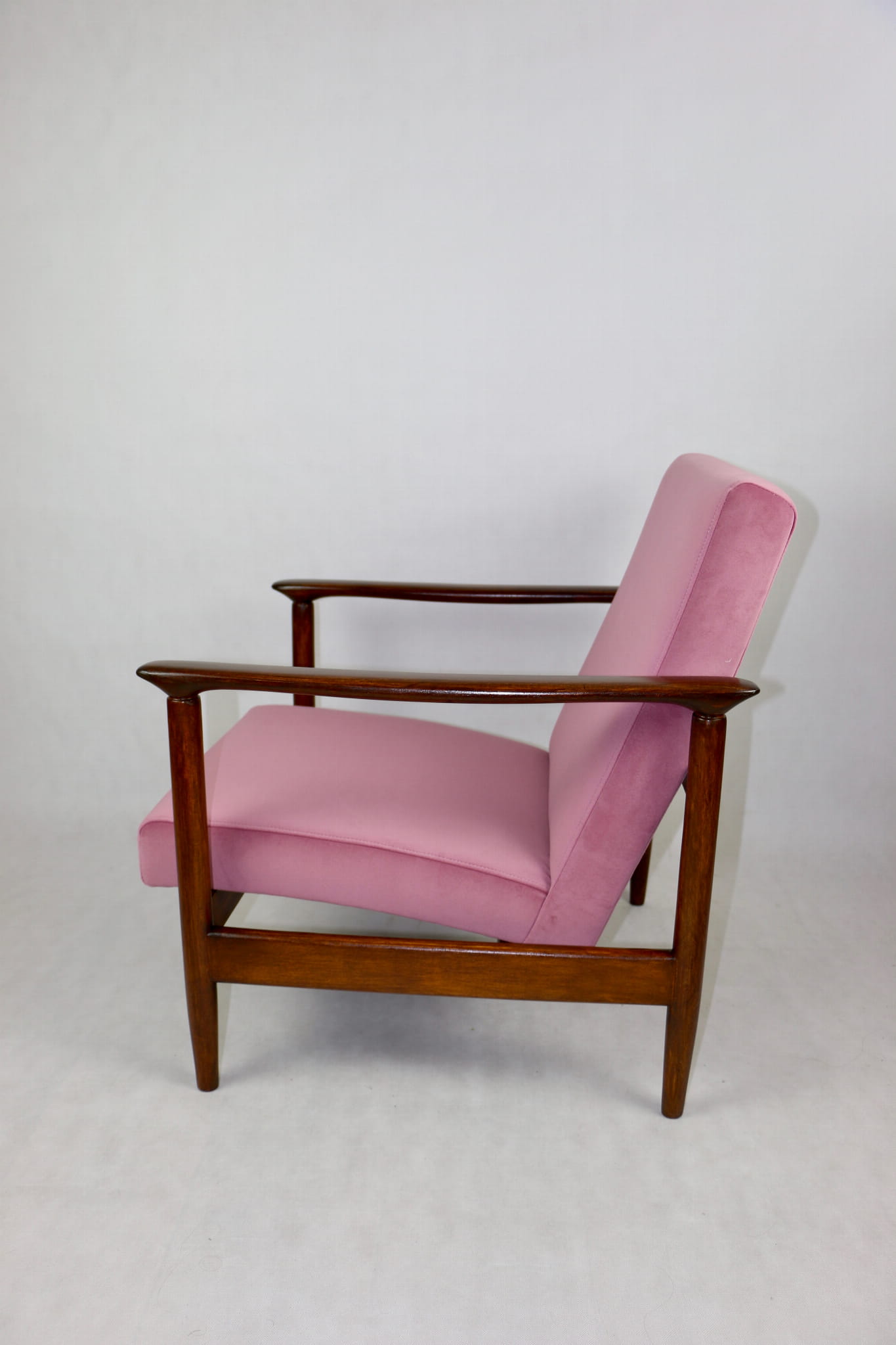 Fotel GFM - 142 zaprojektowany przez Edmunda Homę. Kompletnie odrestaurowany - nowa tapicerka wraz z wypełnieniem została pokryta materiałem tapicerskim typu welwet w kolorze różowym z serii Jade w kolorze 701. Podparcia i nóżki drewniane, naturalne pokryte lakierem w kolorze ciemnego drewna.