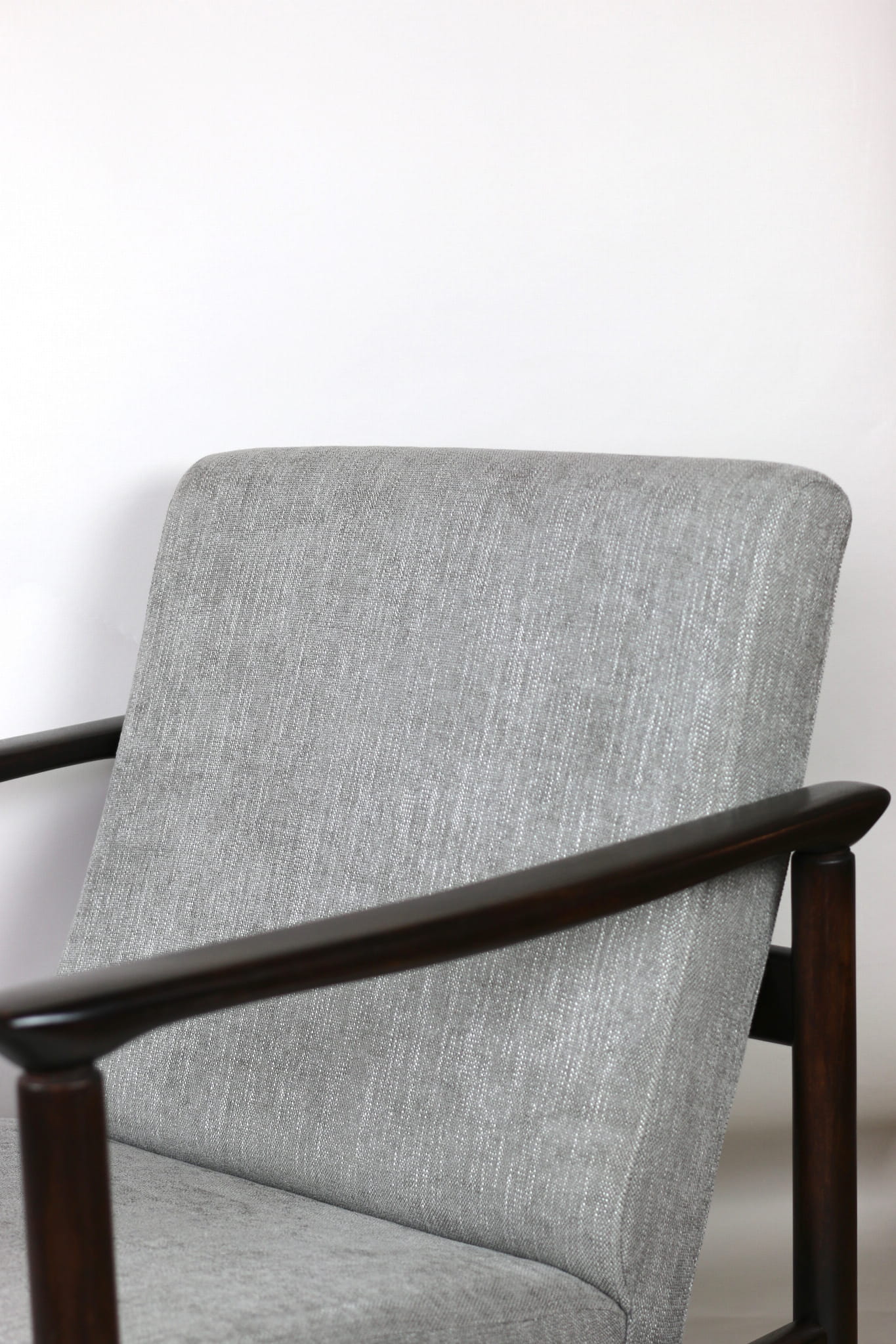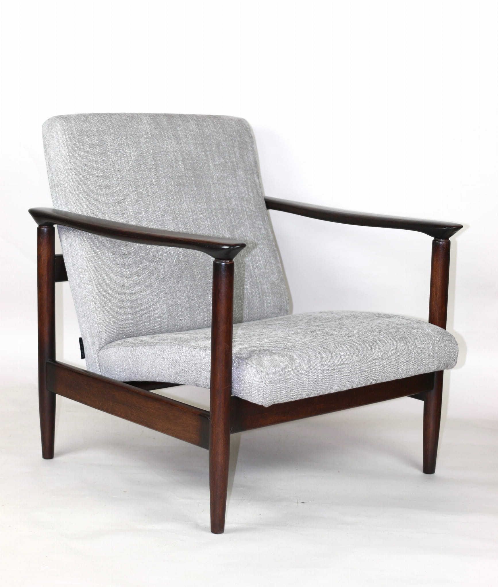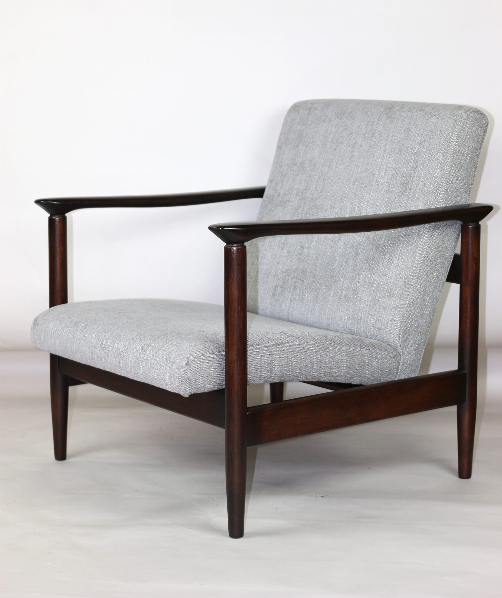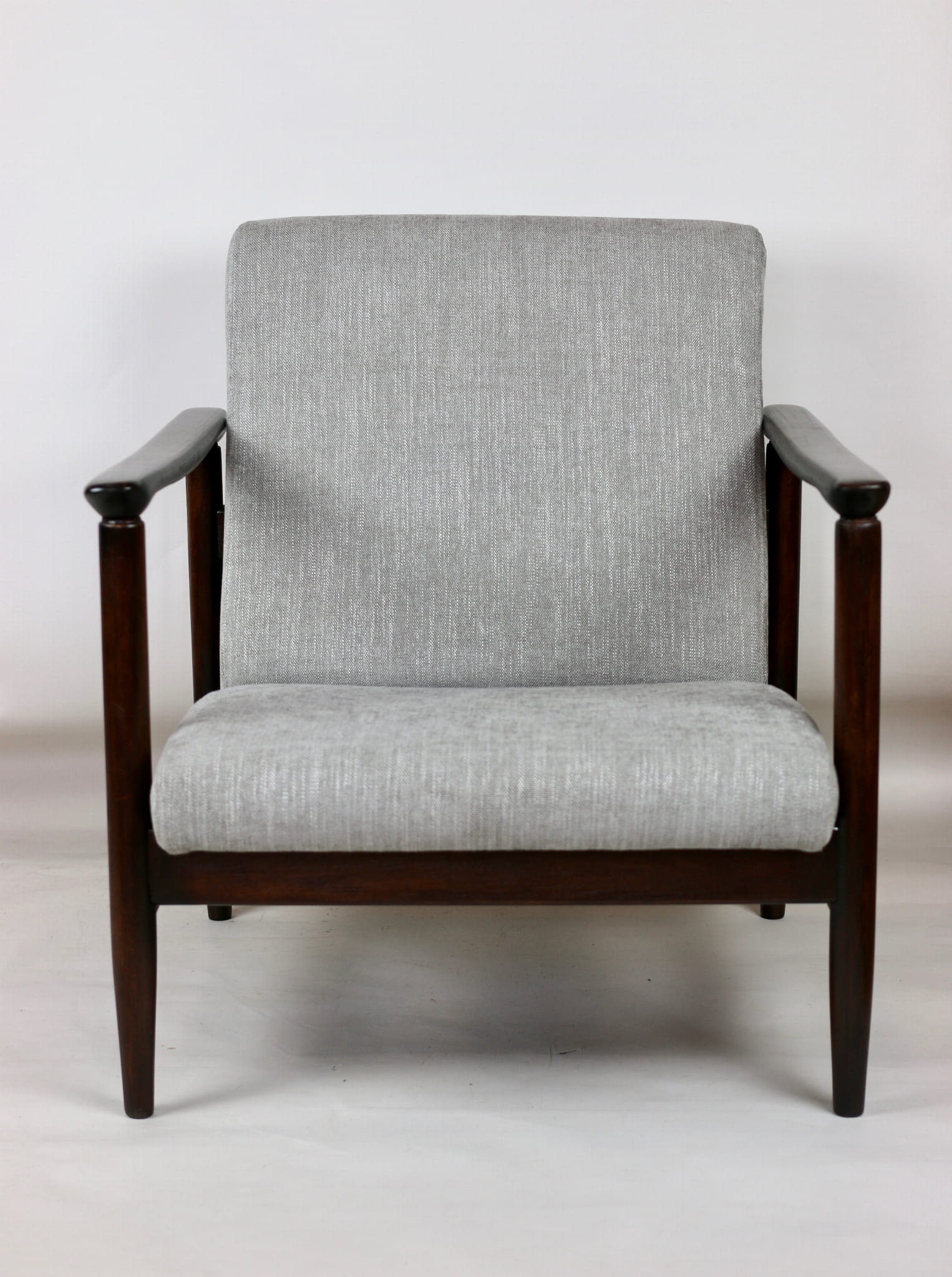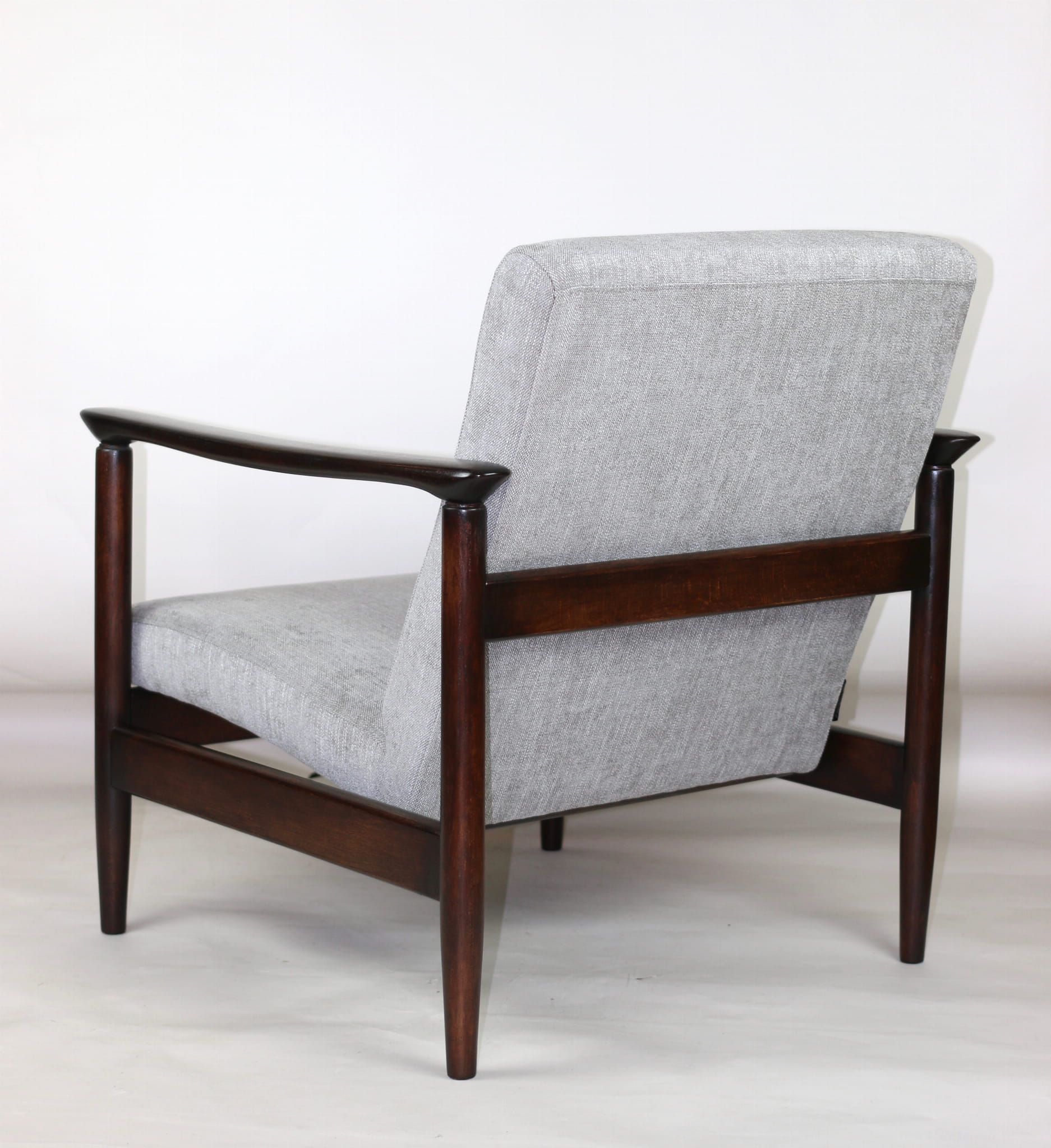Fotel GFM - 142 zaprojektowany przez Edmunda Homę. Kompletnie odrestaurowany - nowa tapicerka wraz z wypełnieniem została pokryta materiałem tapicerskim strukturalnym plecionym w kolorze szaro-srebrnym z serii Boston. Podparcia i nóżki drewniane, pokryte lakierem w kolorze ciemnego drewna.
