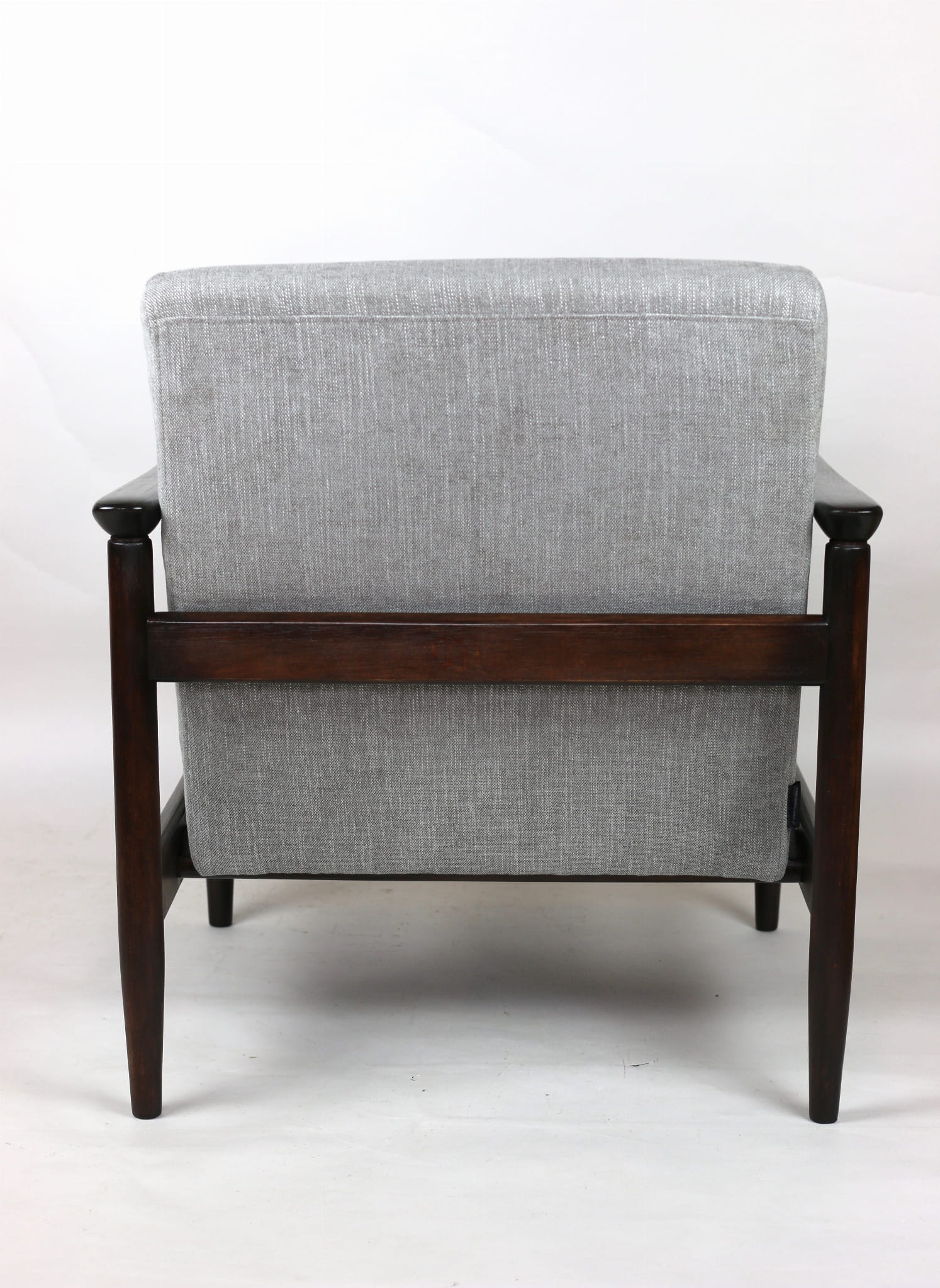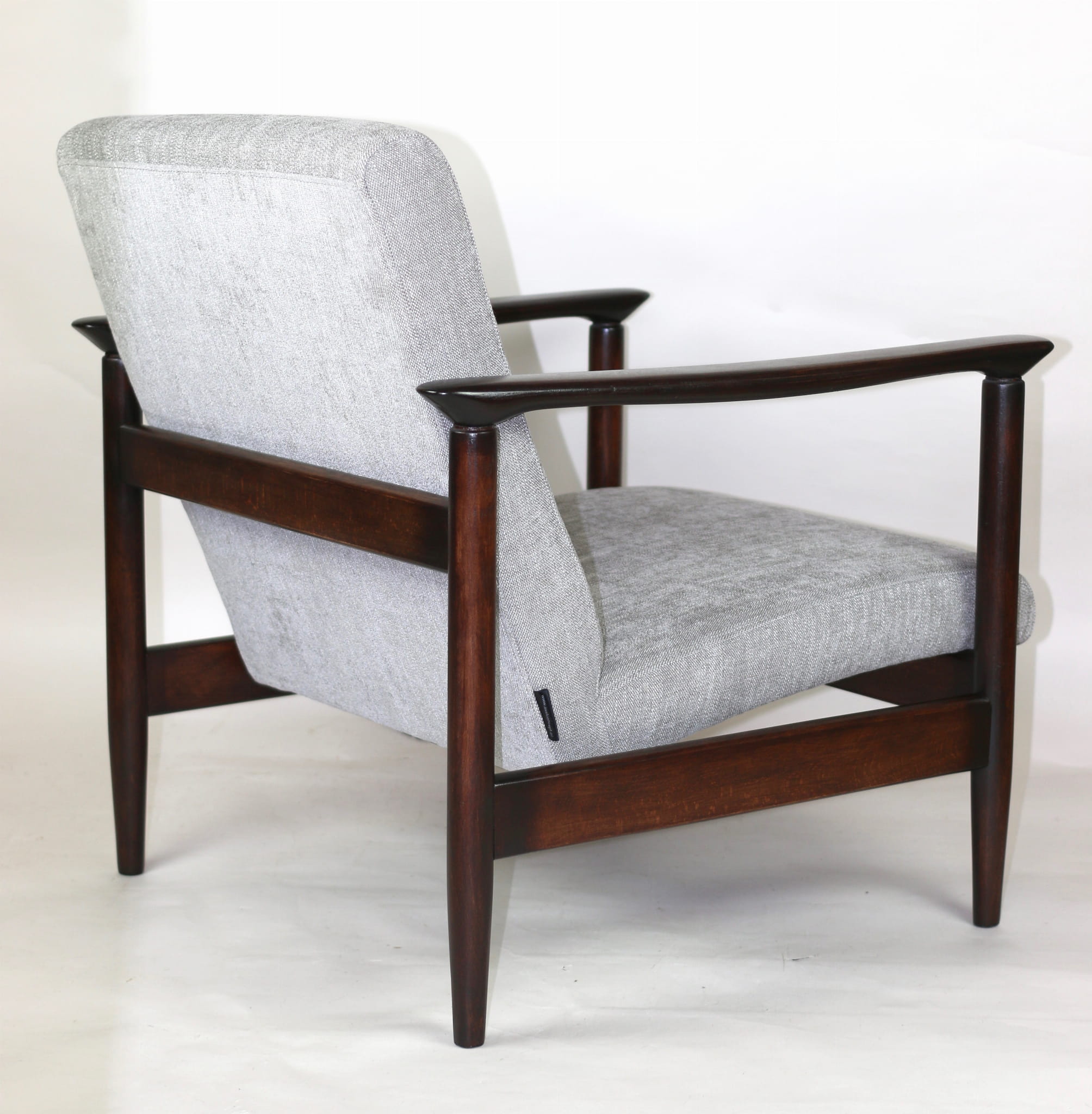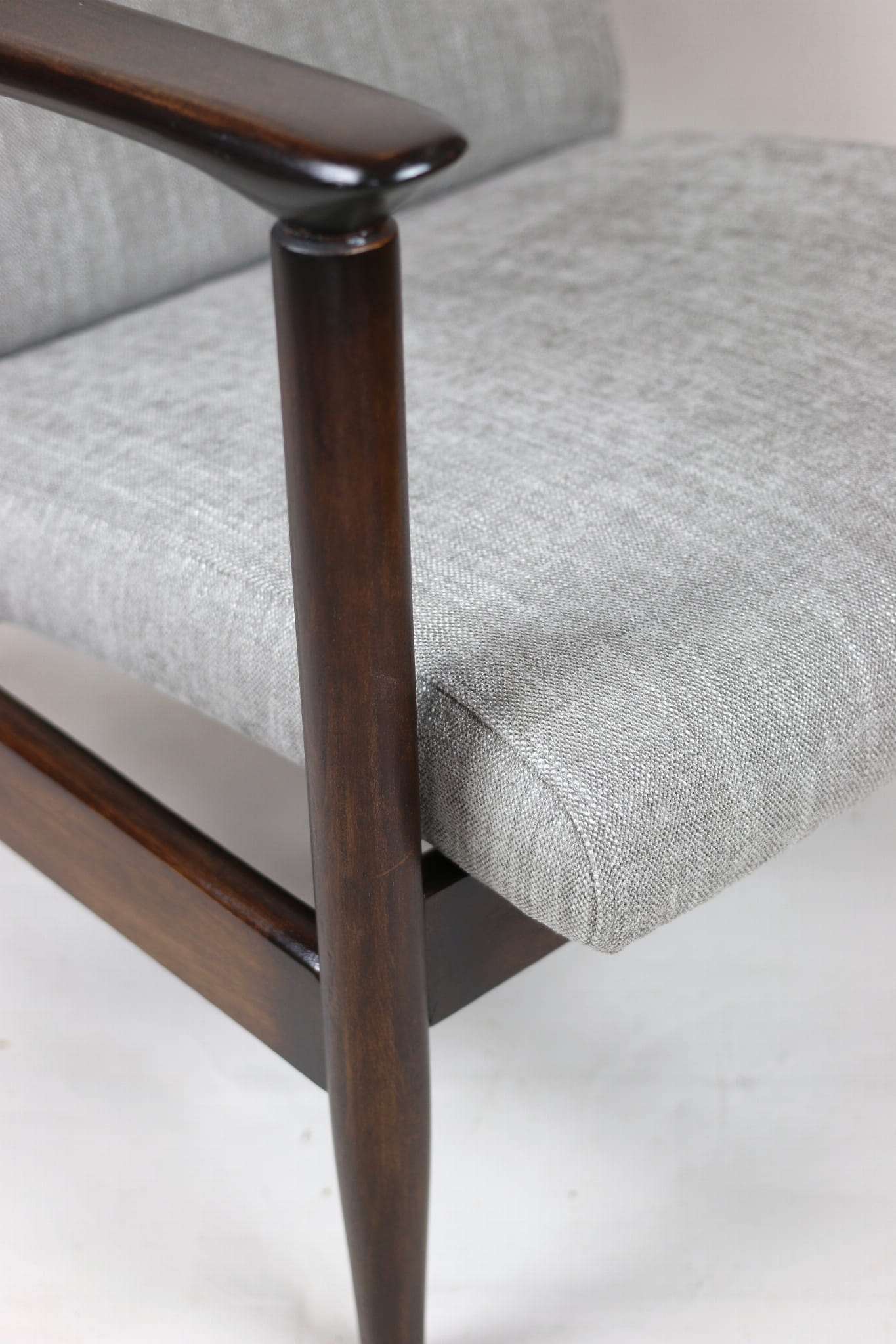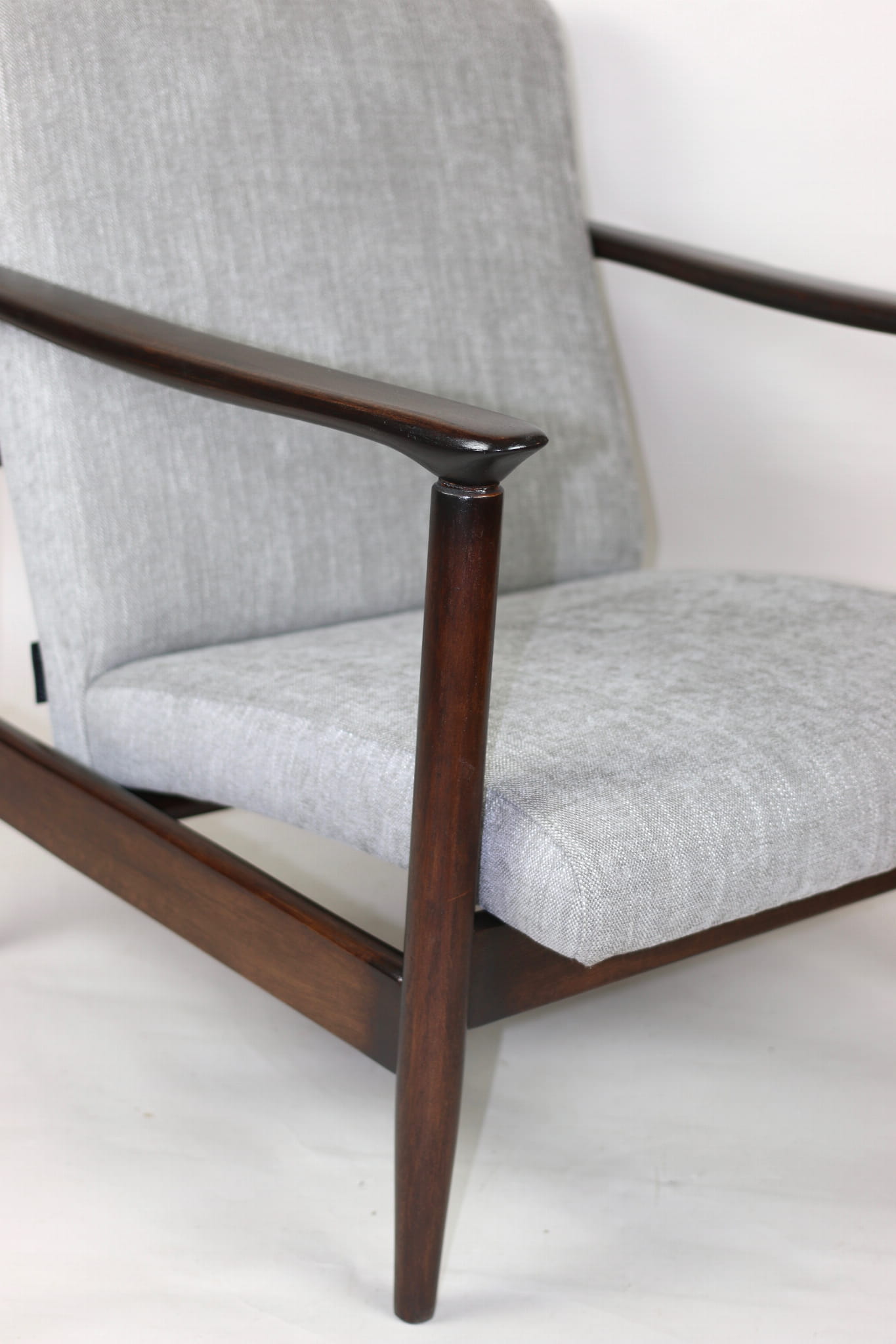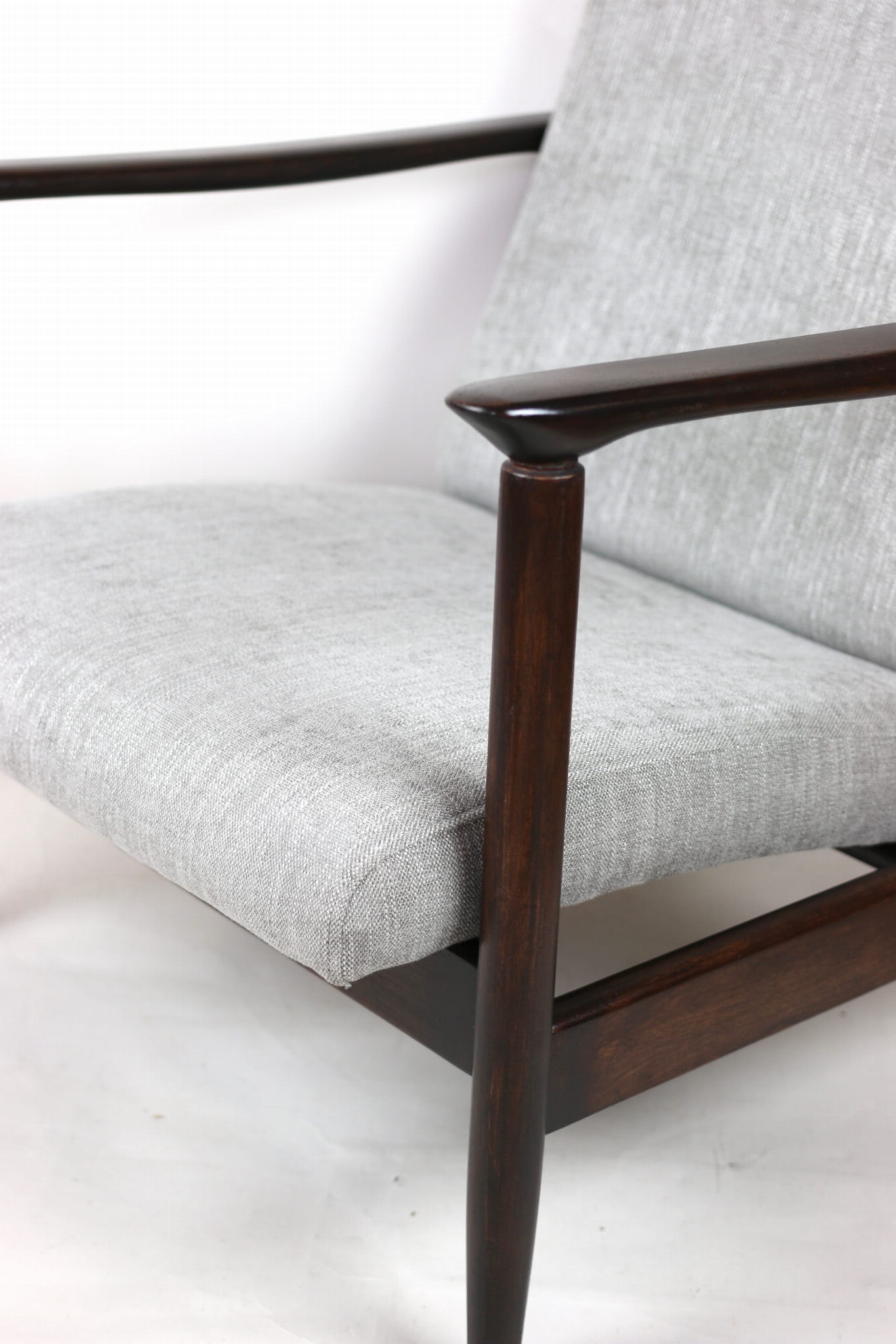 Fotel GFM - 142 zaprojektowany przez Edmunda Homę. Kompletnie odrestaurowany - nowa tapicerka wraz z wypełnieniem została pokryta materiałem tapicerskim strukturalnym plecionym w kolorze szaro-srebrnym z serii Boston. Podparcia i nóżki drewniane, pokryte lakierem w kolorze ciemnego drewna.