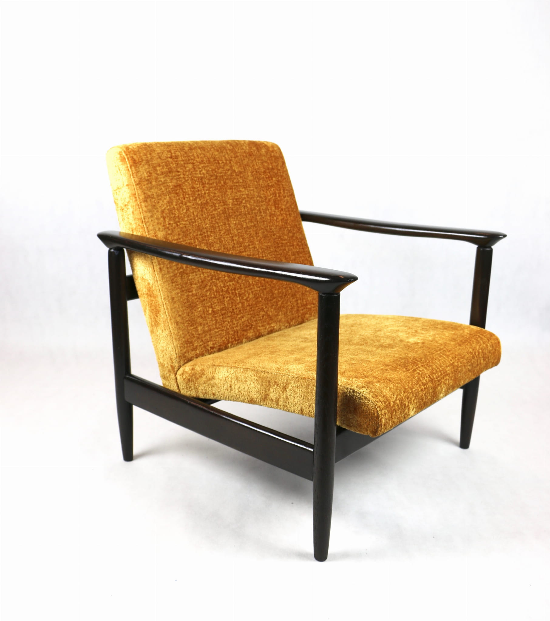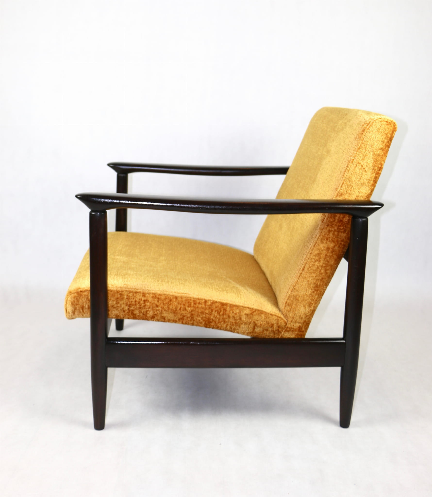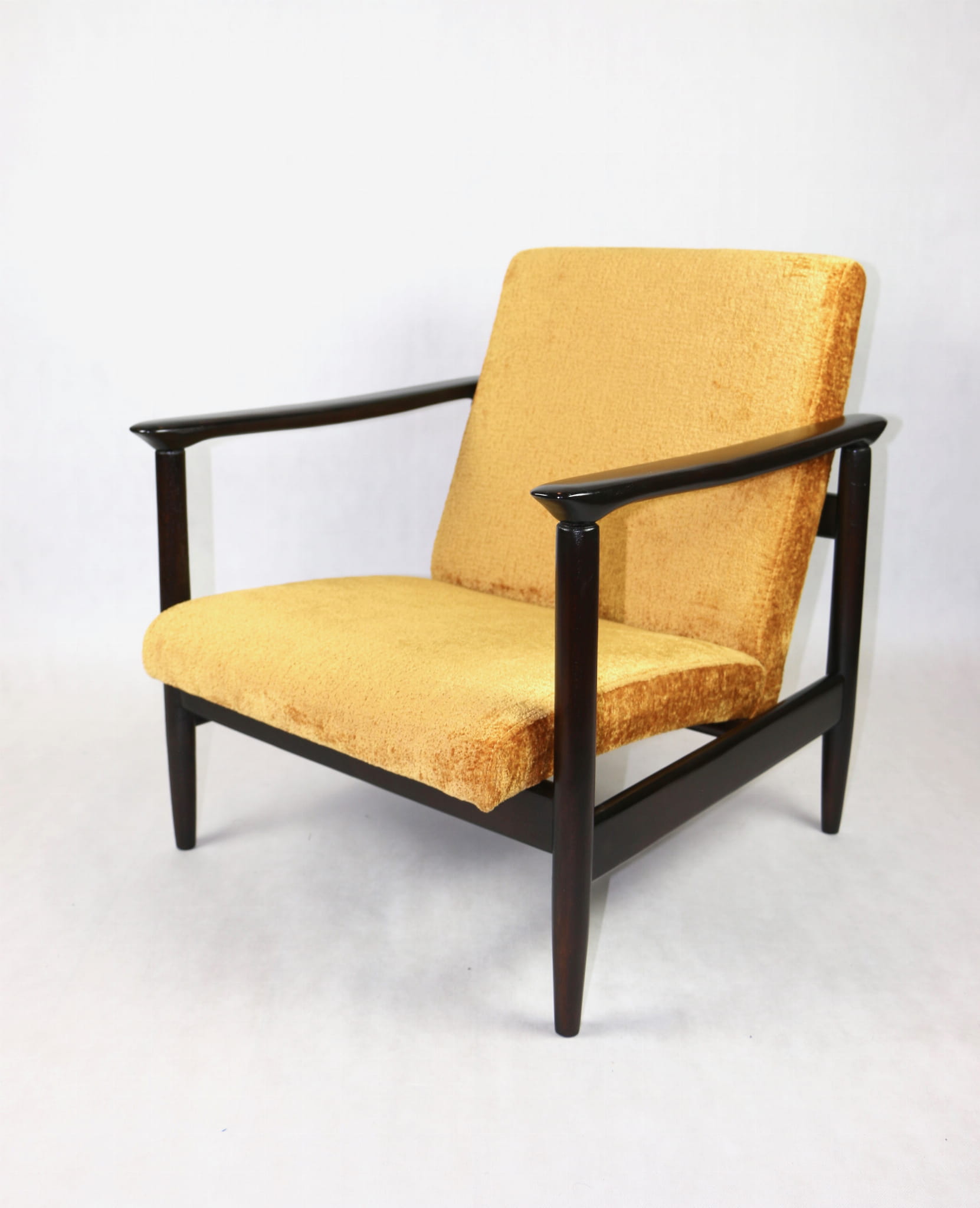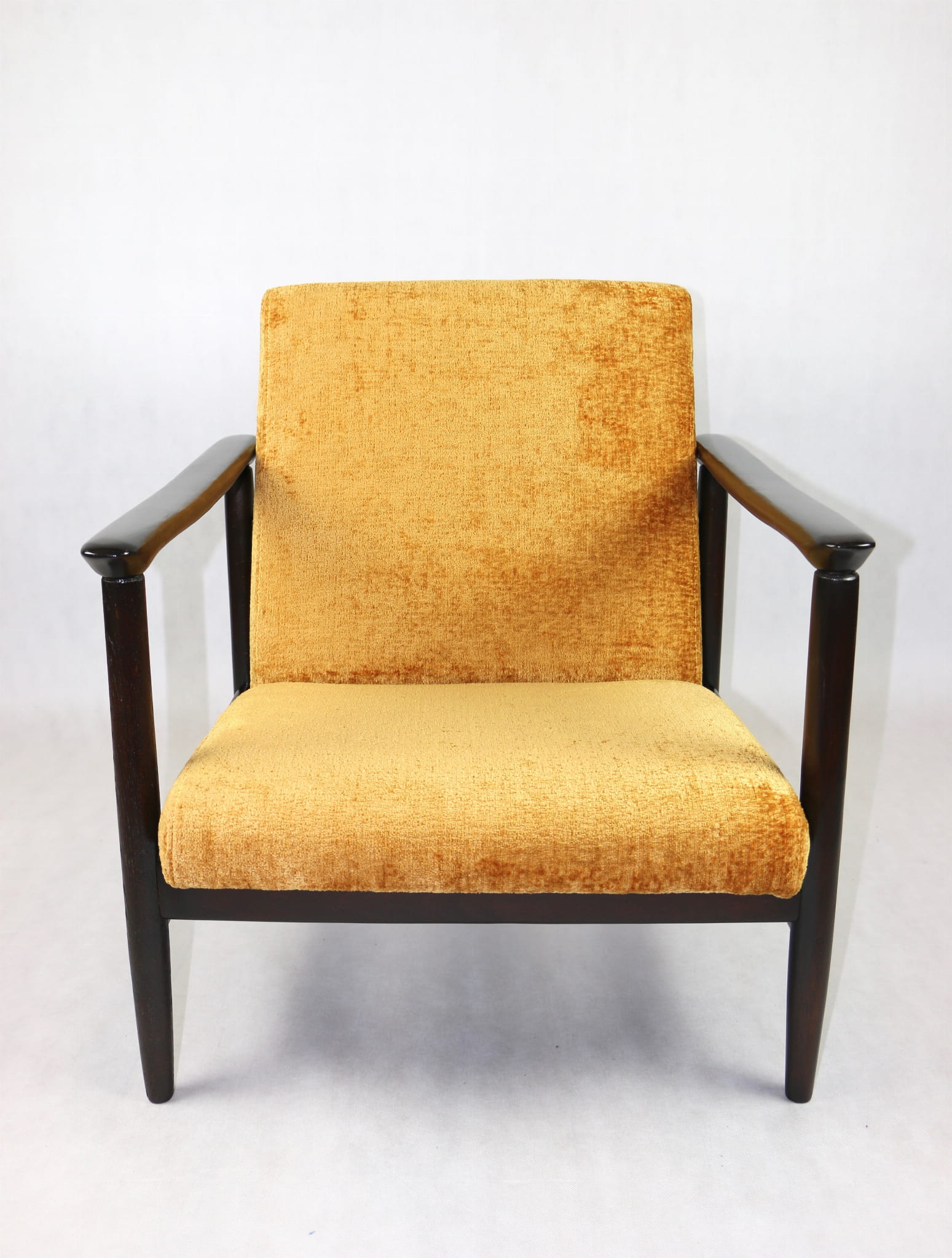 Fotel GFM - 142 zaprojektowany przez Edmunda Homę. Kompletnie odrestaurowany - nowa tapicerka wraz z wypełnieniem została pokryta materiałem tapicerskim strukturalnym welwetem w kolorze żółto - pomarańczowym z serii Bergen. Podparcia i nóżki drewniane, pokryte lakierem w kolorze ciemnego drewna.