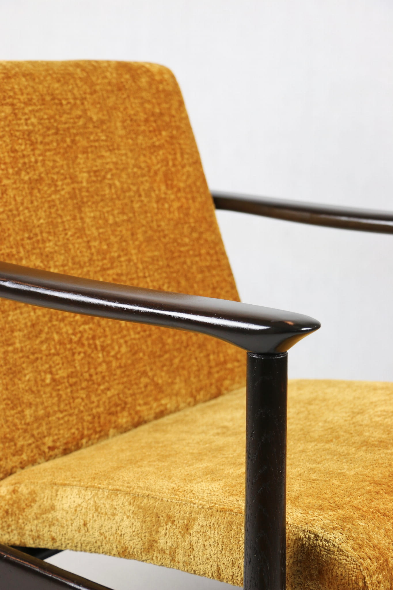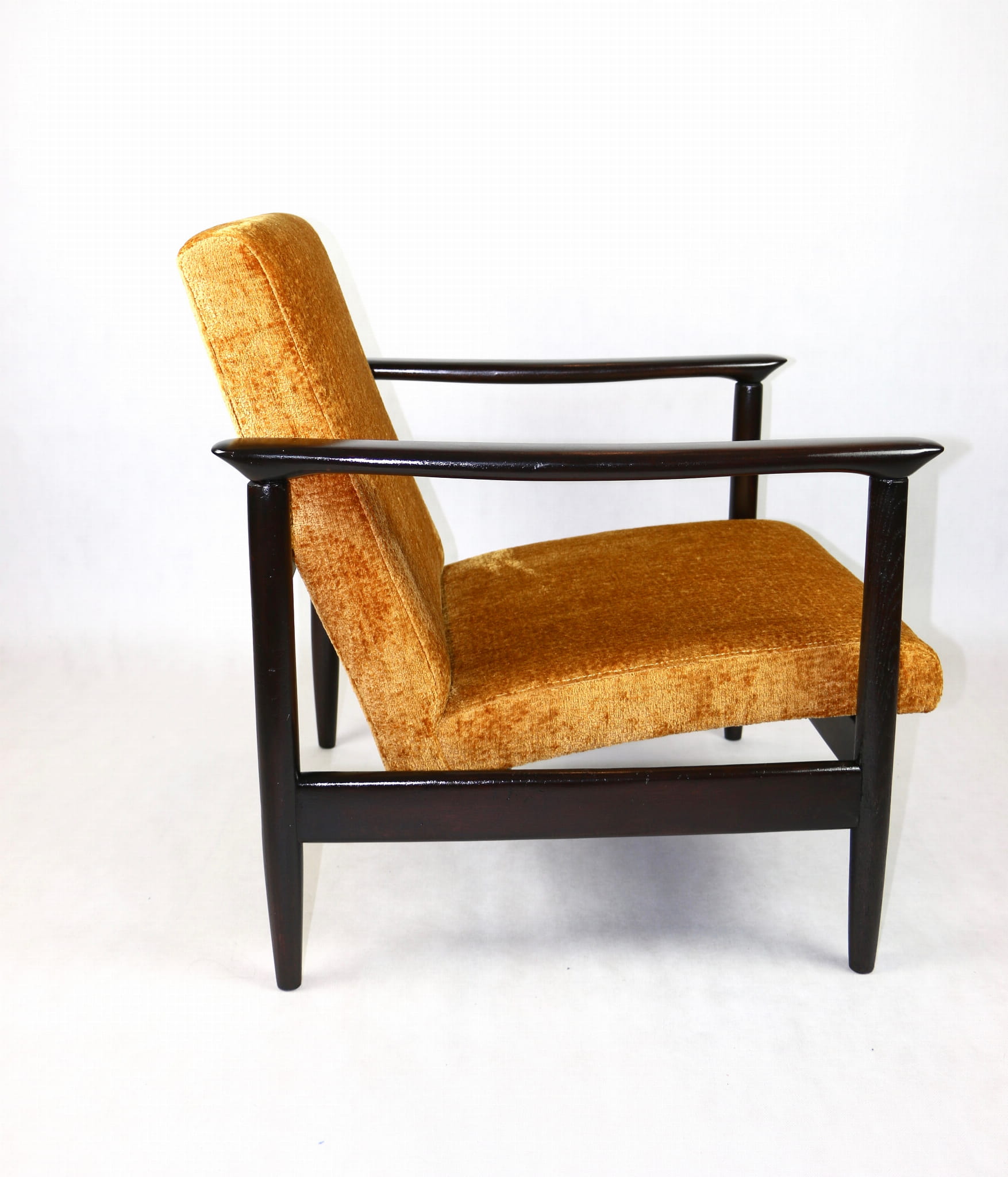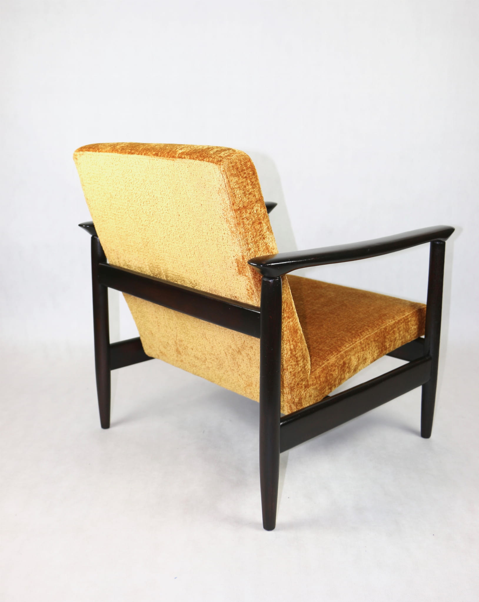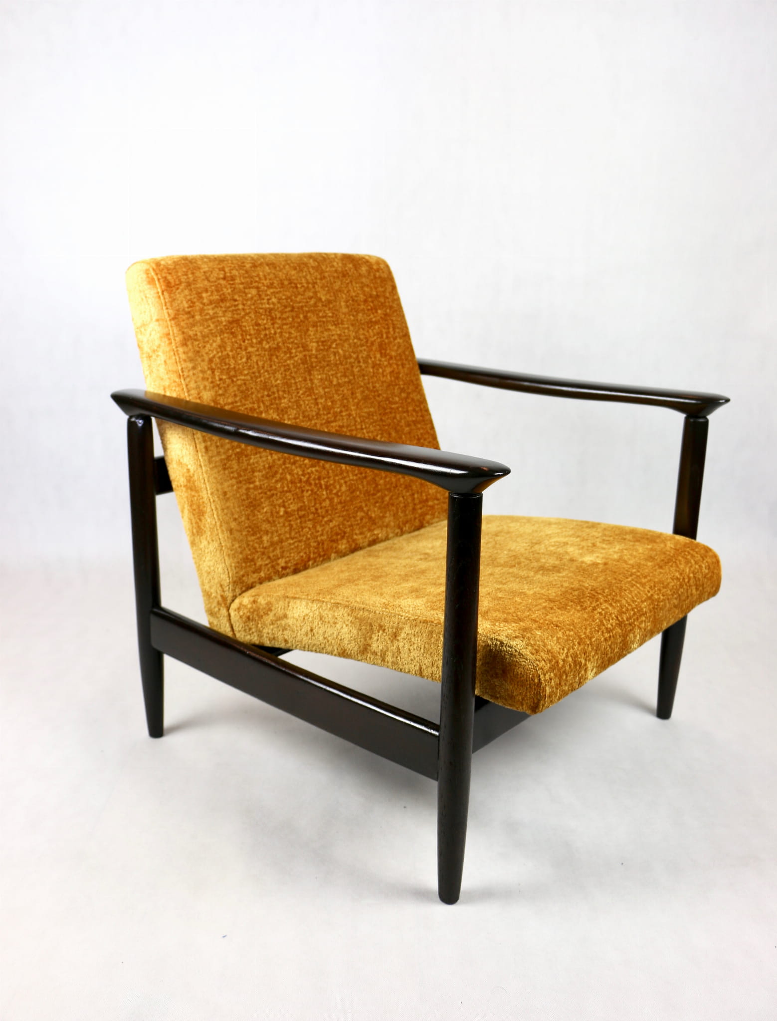 Fotel GFM - 142 zaprojektowany przez Edmunda Homę. Kompletnie odrestaurowany - nowa tapicerka wraz z wypełnieniem została pokryta materiałem tapicerskim strukturalnym welwetem w kolorze żółto - pomarańczowym z serii Bergen. Podparcia i nóżki drewniane, pokryte lakierem w kolorze ciemnego drewna.