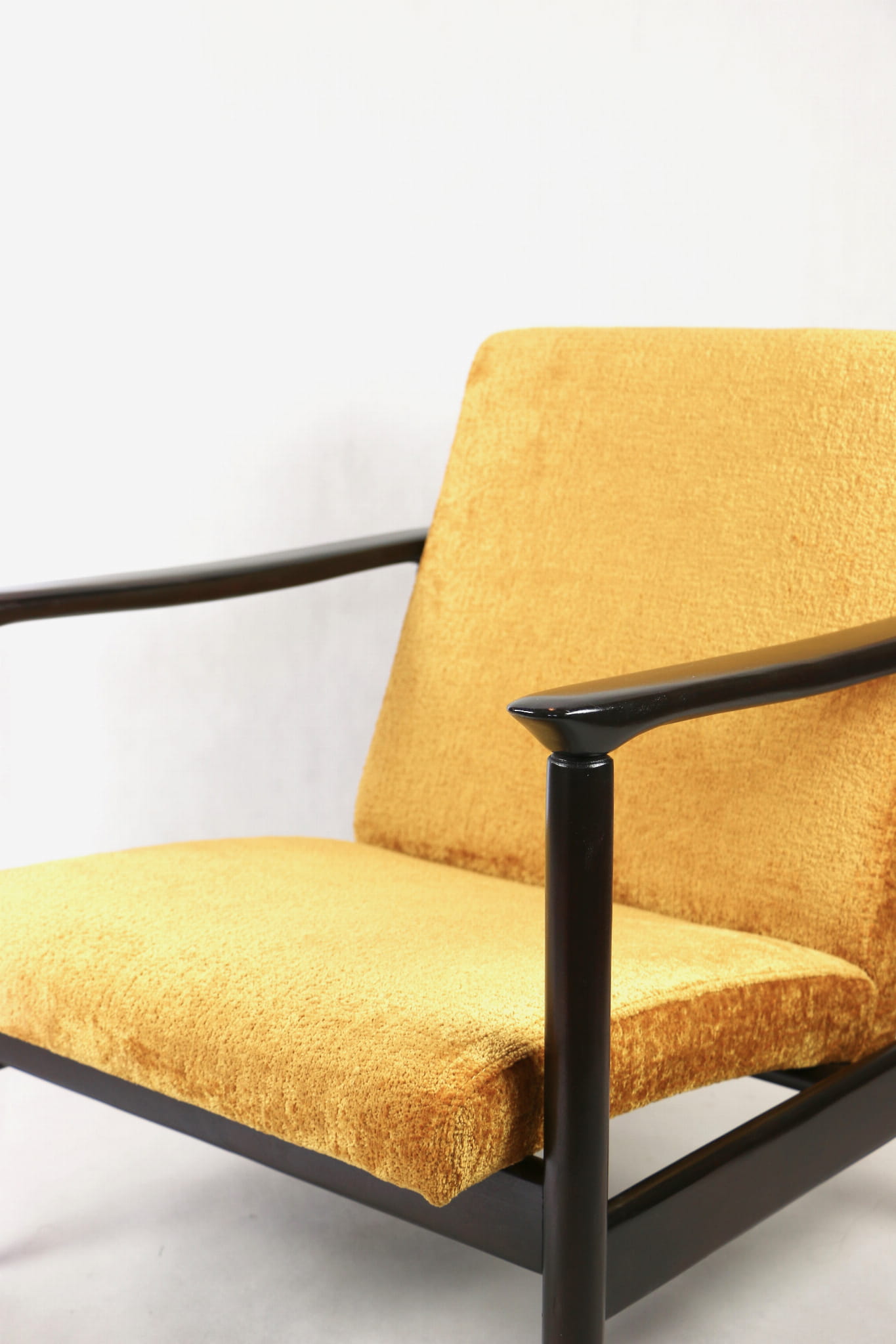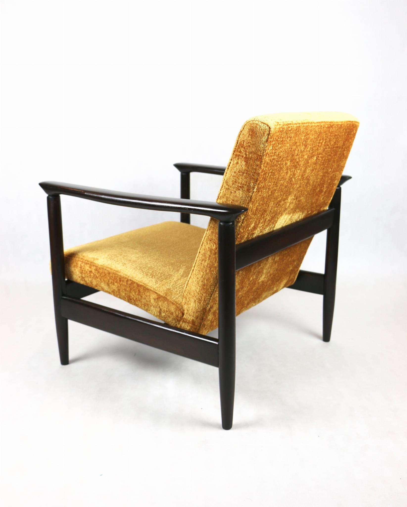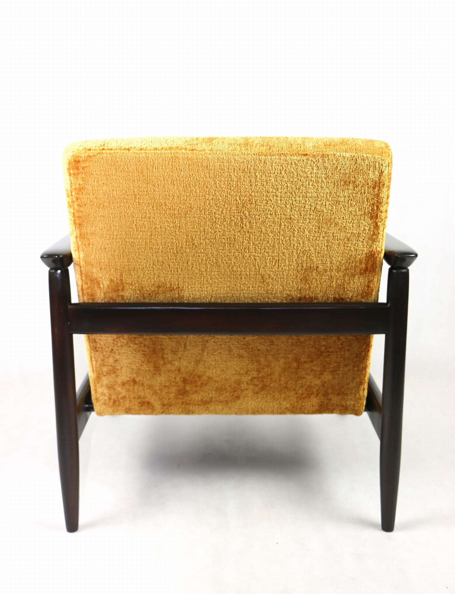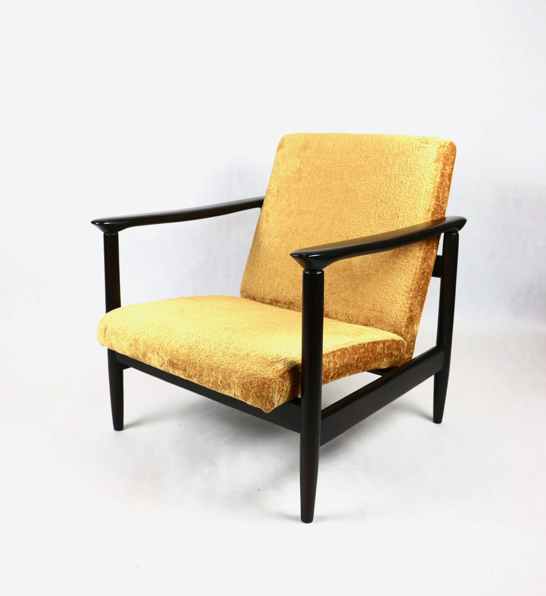 Fotel GFM - 142 zaprojektowany przez Edmunda Homę. Kompletnie odrestaurowany - nowa tapicerka wraz z wypełnieniem została pokryta materiałem tapicerskim strukturalnym welwetem w kolorze żółto - pomarańczowym z serii Bergen. Podparcia i nóżki drewniane, pokryte lakierem w kolorze ciemnego drewna.