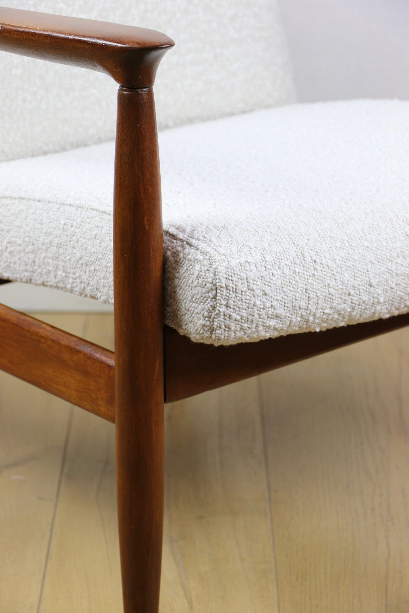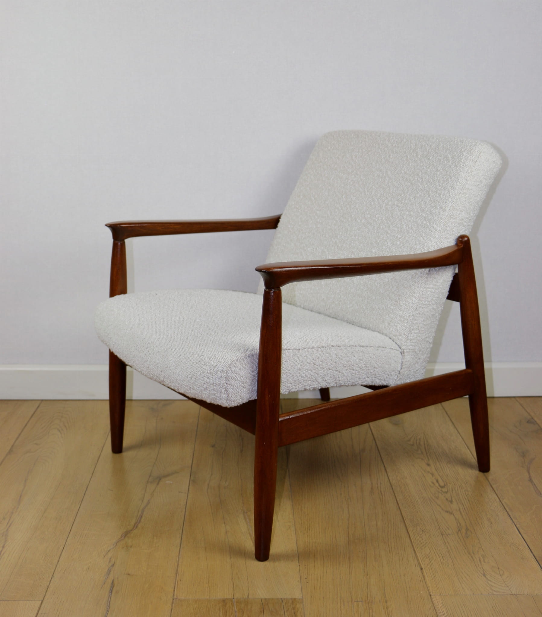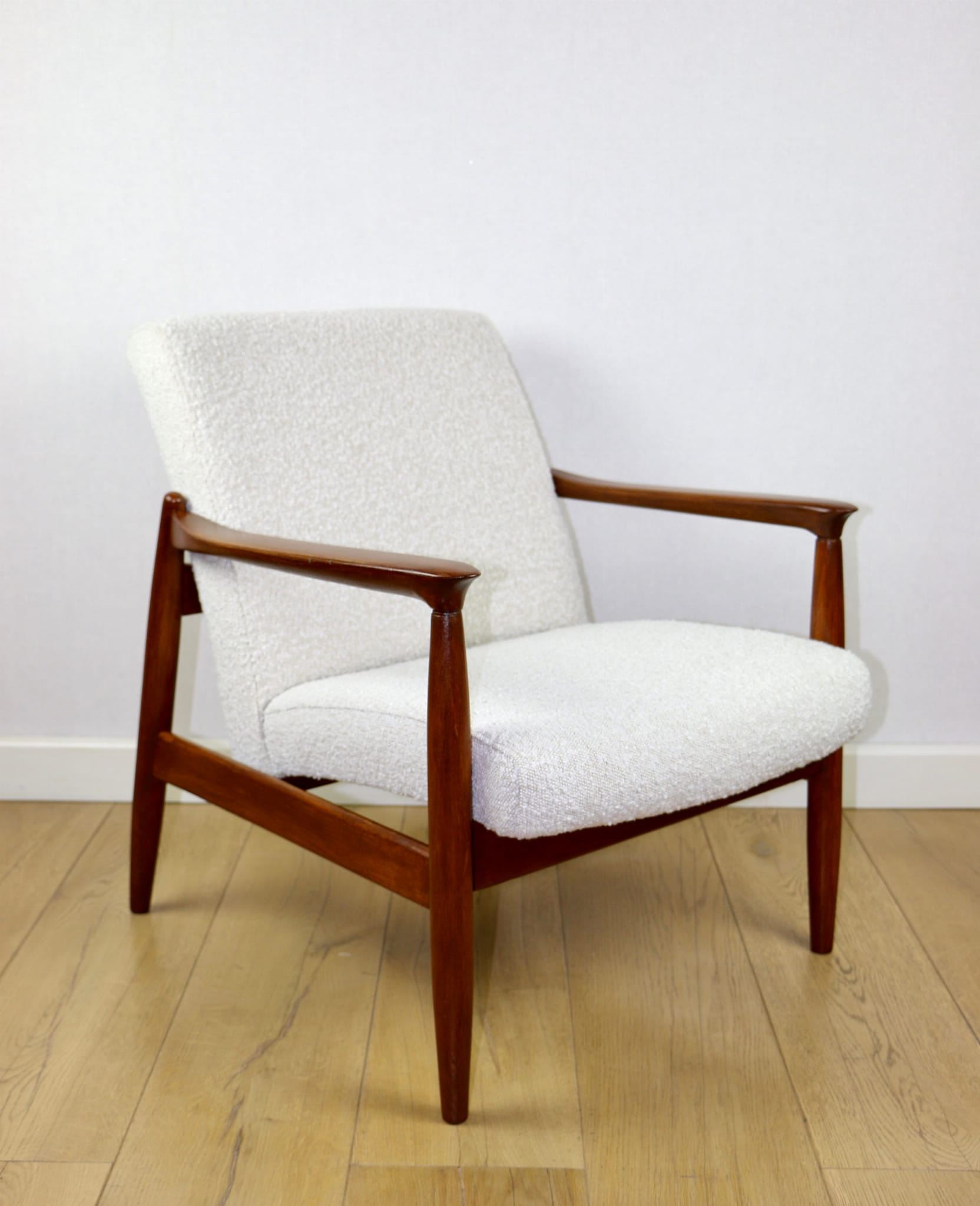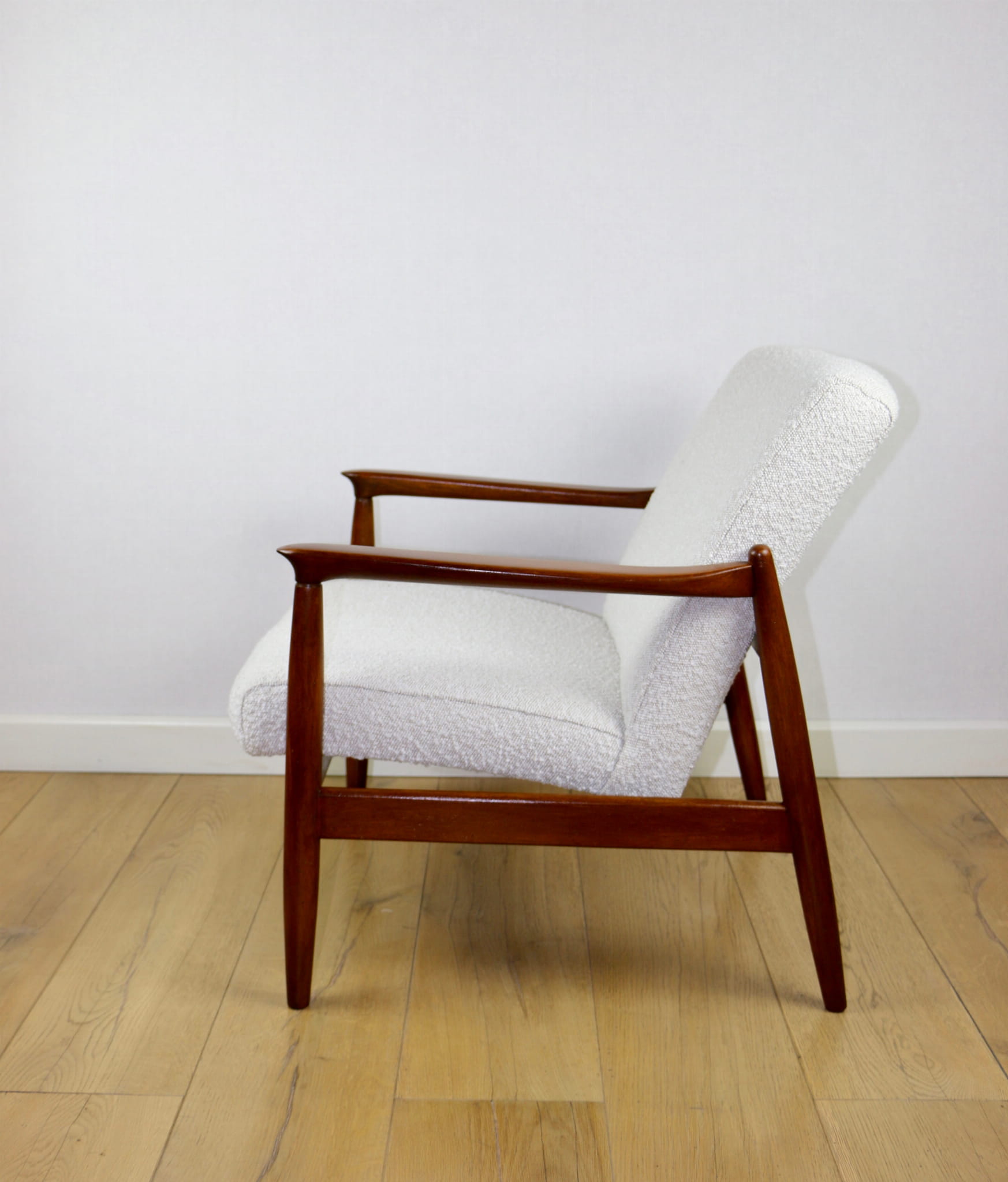 Fotel GFM - 64 zaprojektowany przez Edmunda Homę. Kompletnie odrestaurowany - nowa tapicerka wraz z wypełnieniem została pokryta materiałem tapicerskim strukturalnym typu boucle w kolorze białym. Podparcia i nóżki drewniane, naturalne pokryte lakierem w kolorze brązowego drewna.