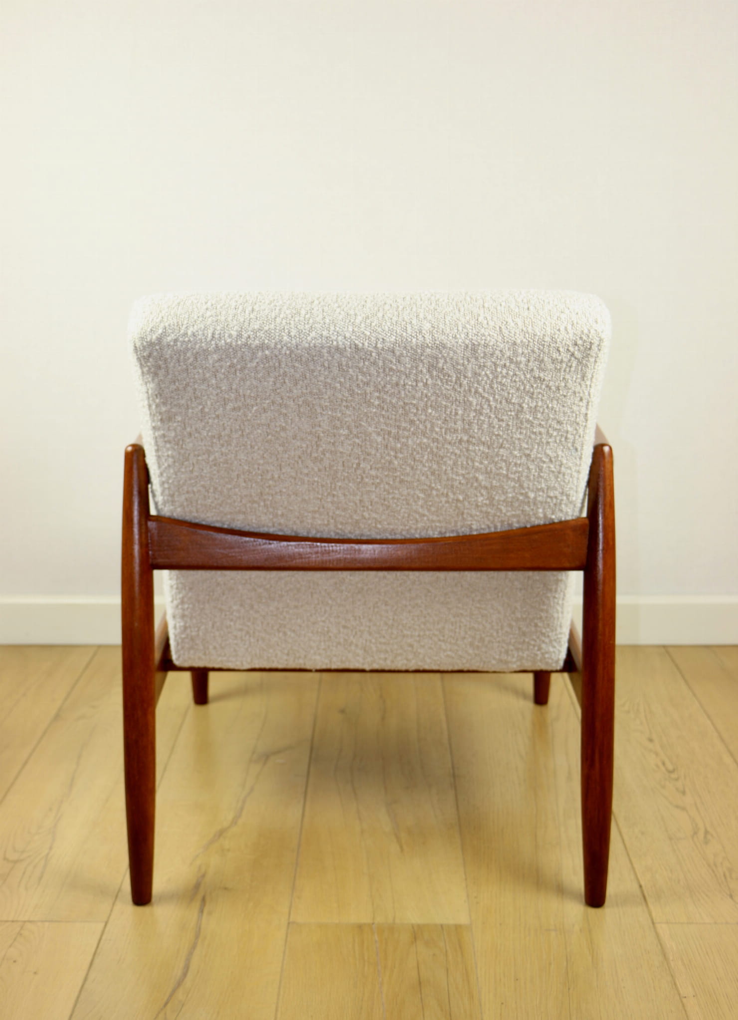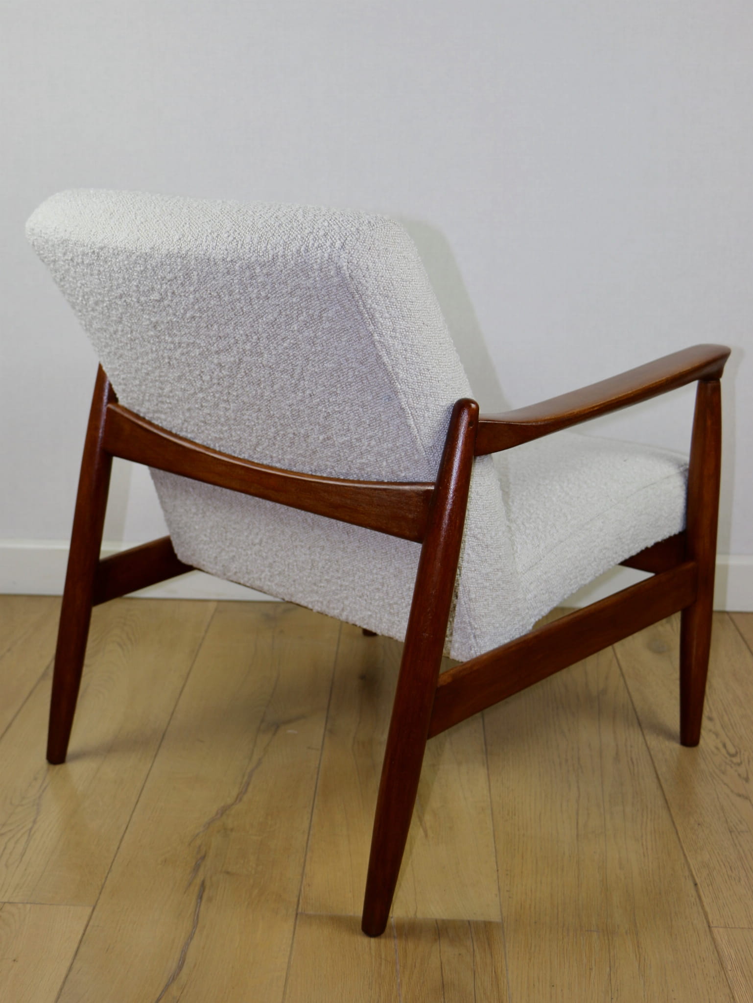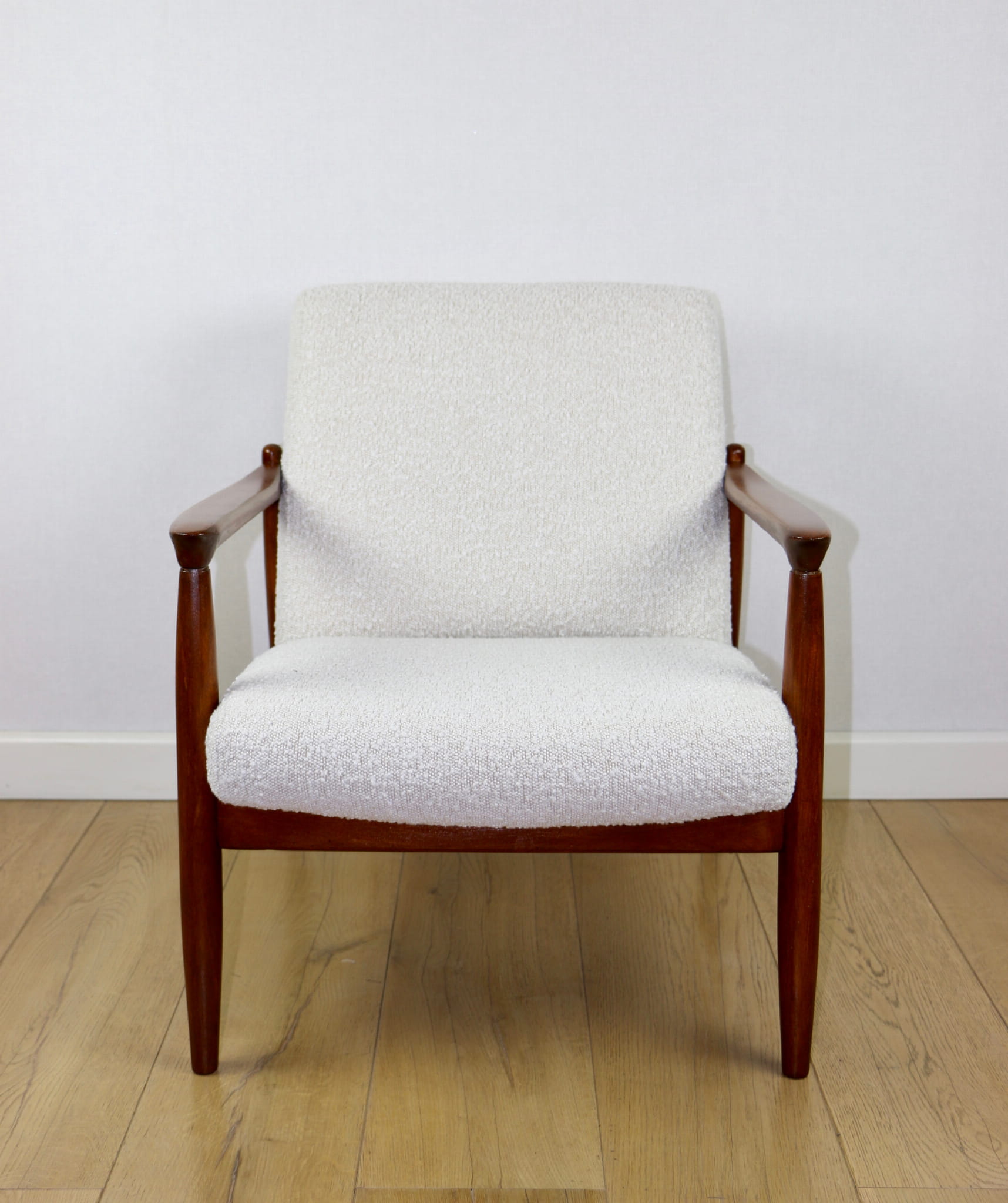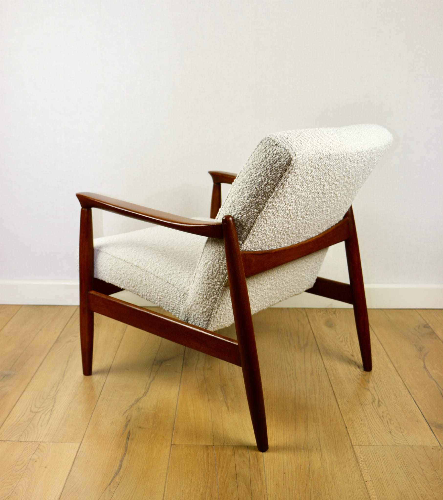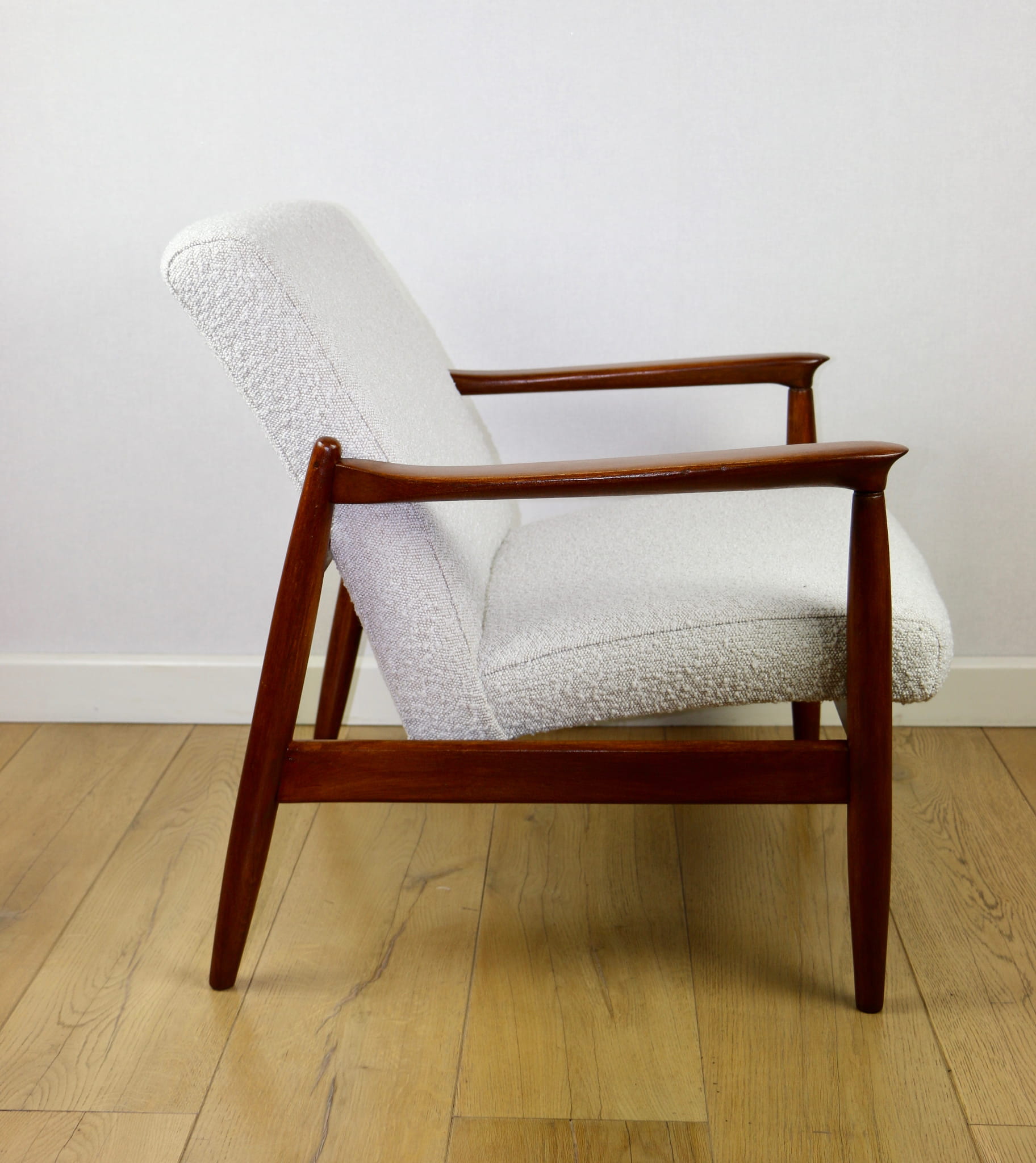 Fotel GFM - 64 zaprojektowany przez Edmunda Homę. Kompletnie odrestaurowany - nowa tapicerka wraz z wypełnieniem została pokryta materiałem tapicerskim strukturalnym typu boucle w kolorze białym. Podparcia i nóżki drewniane, naturalne pokryte lakierem w kolorze brązowego drewna.