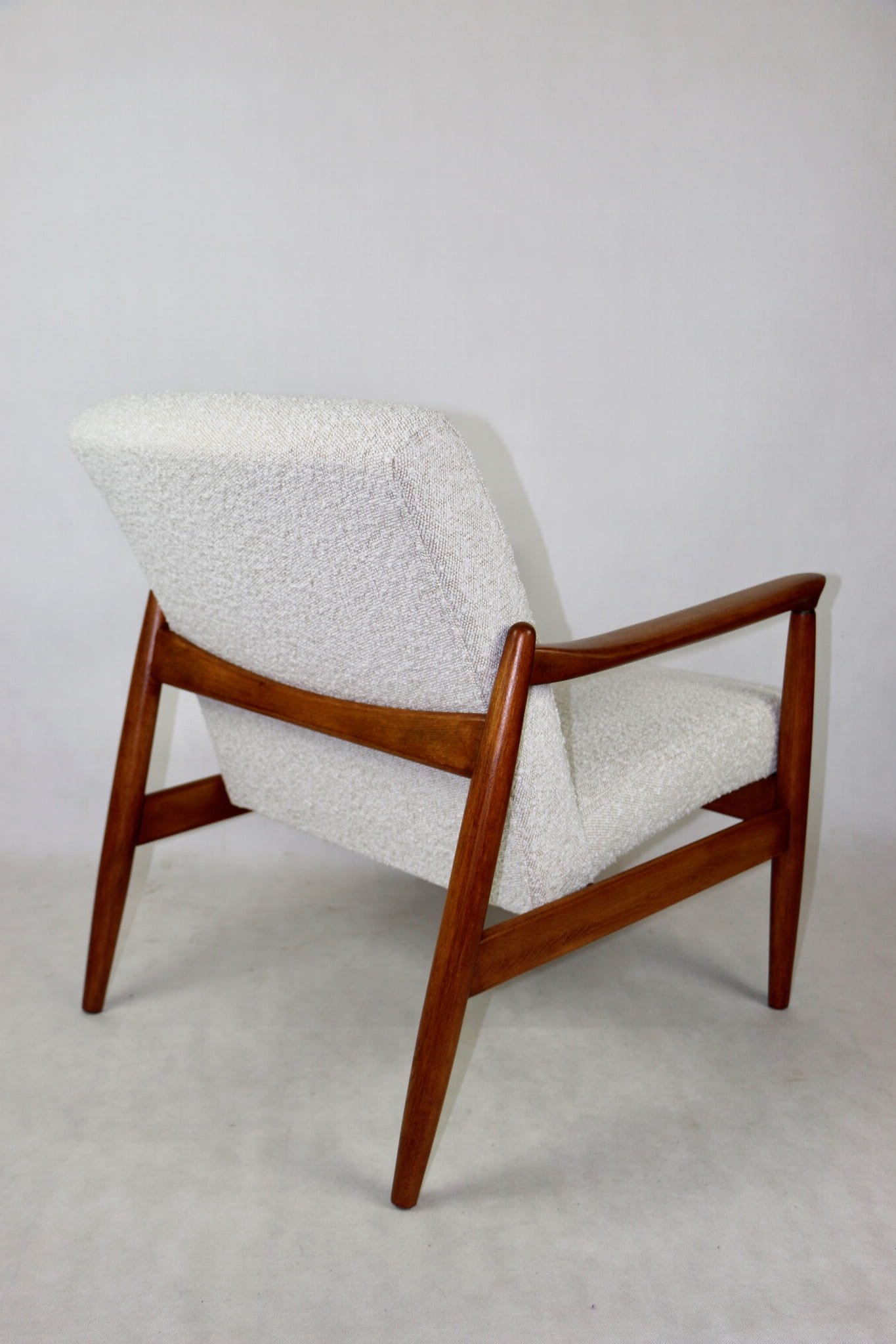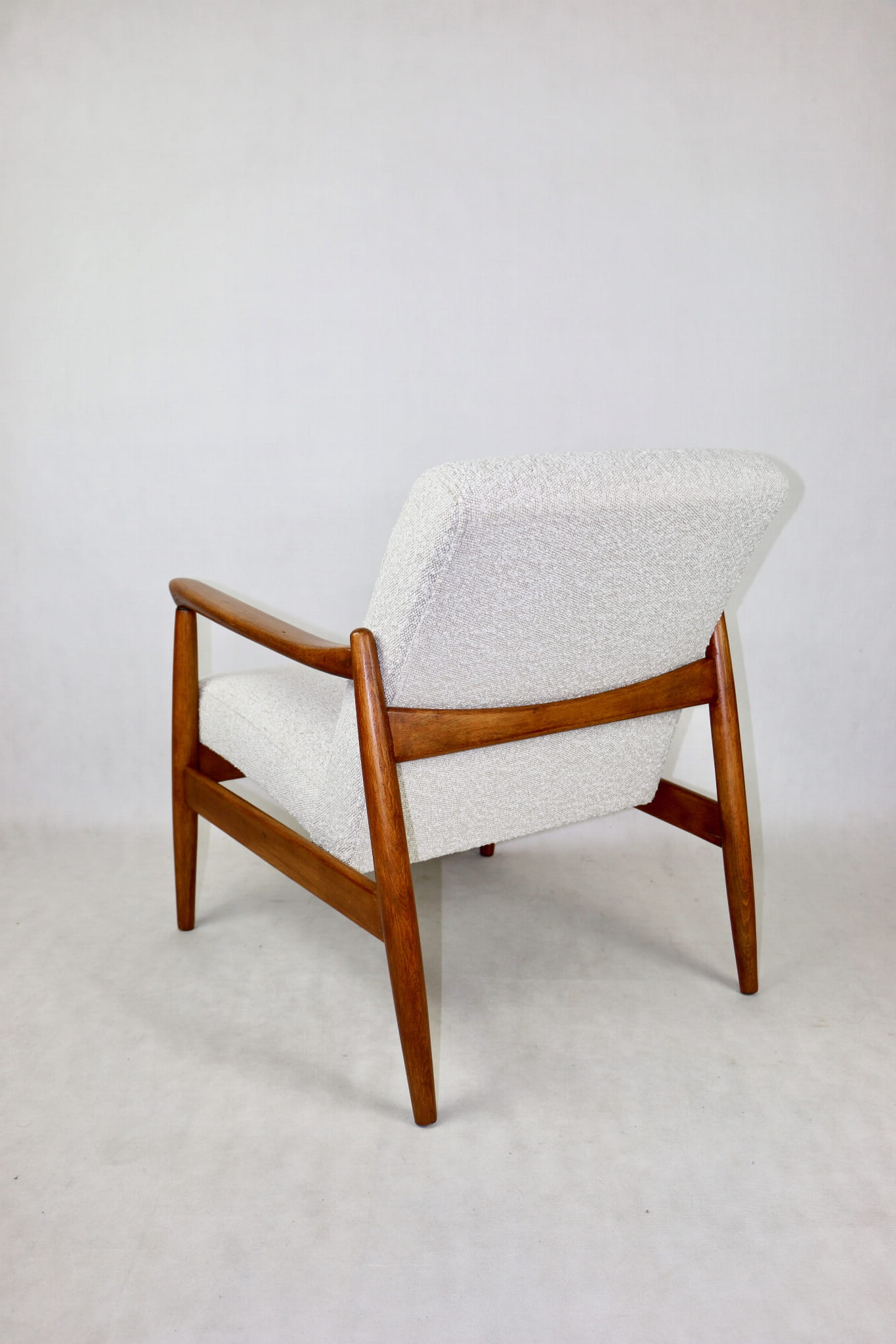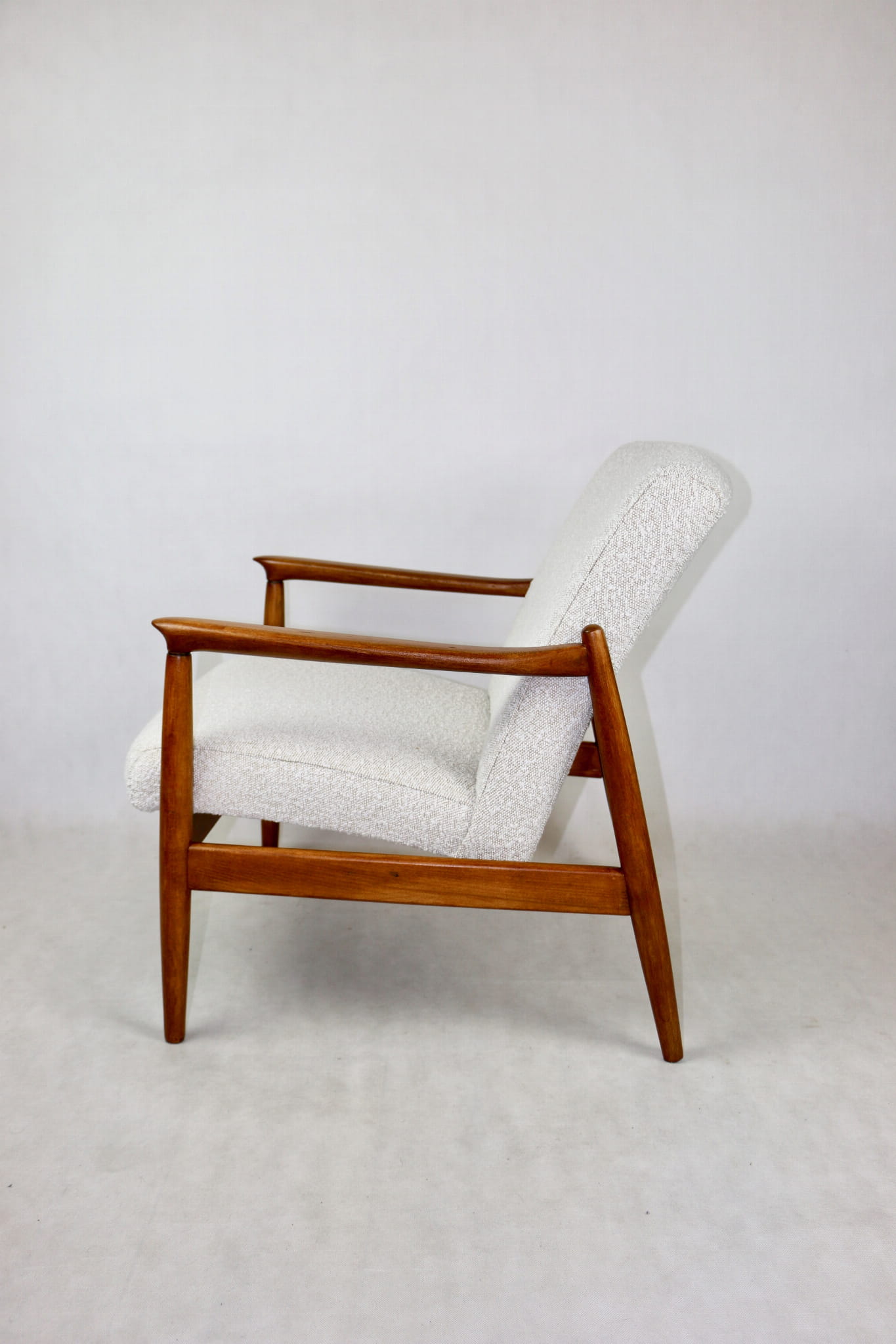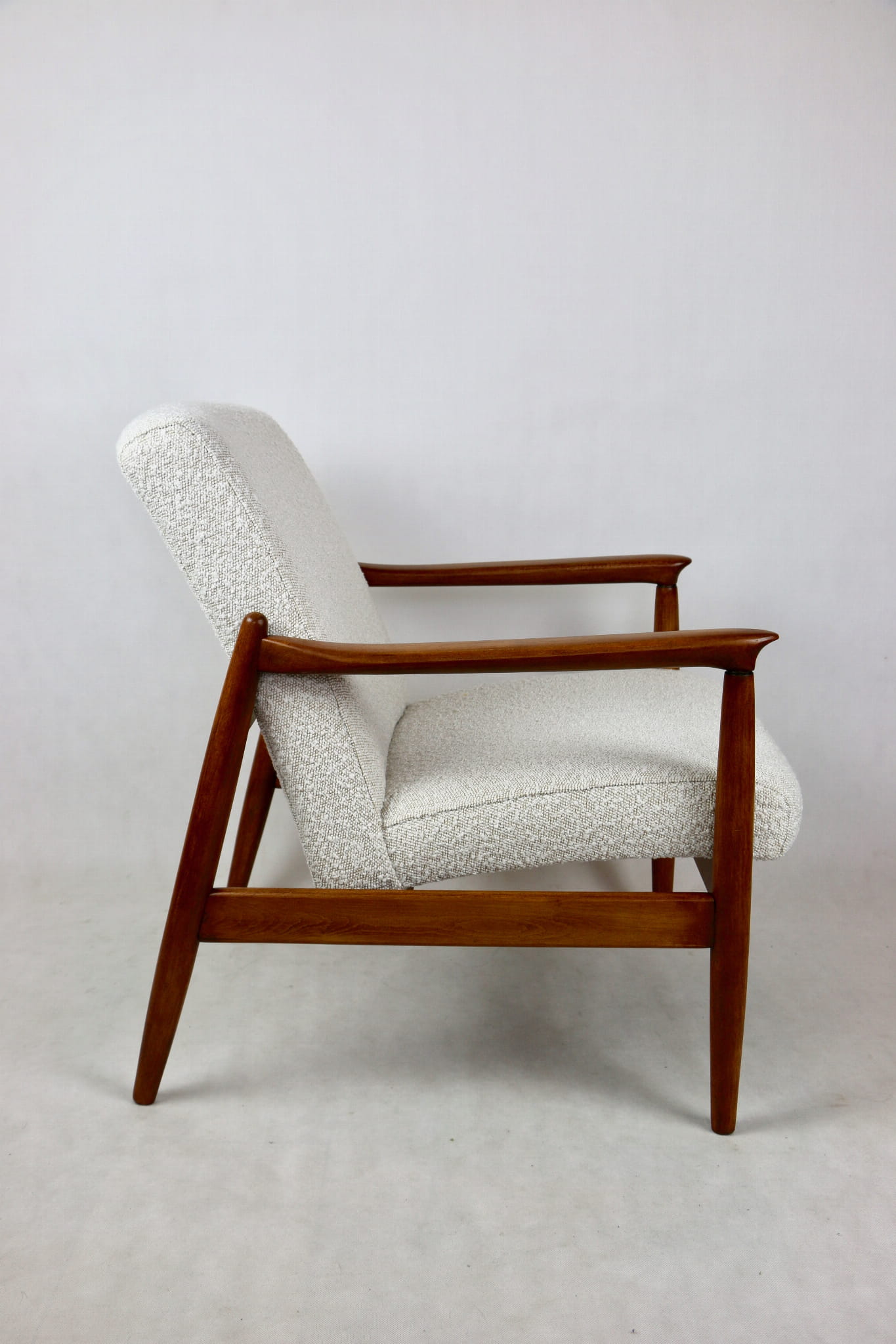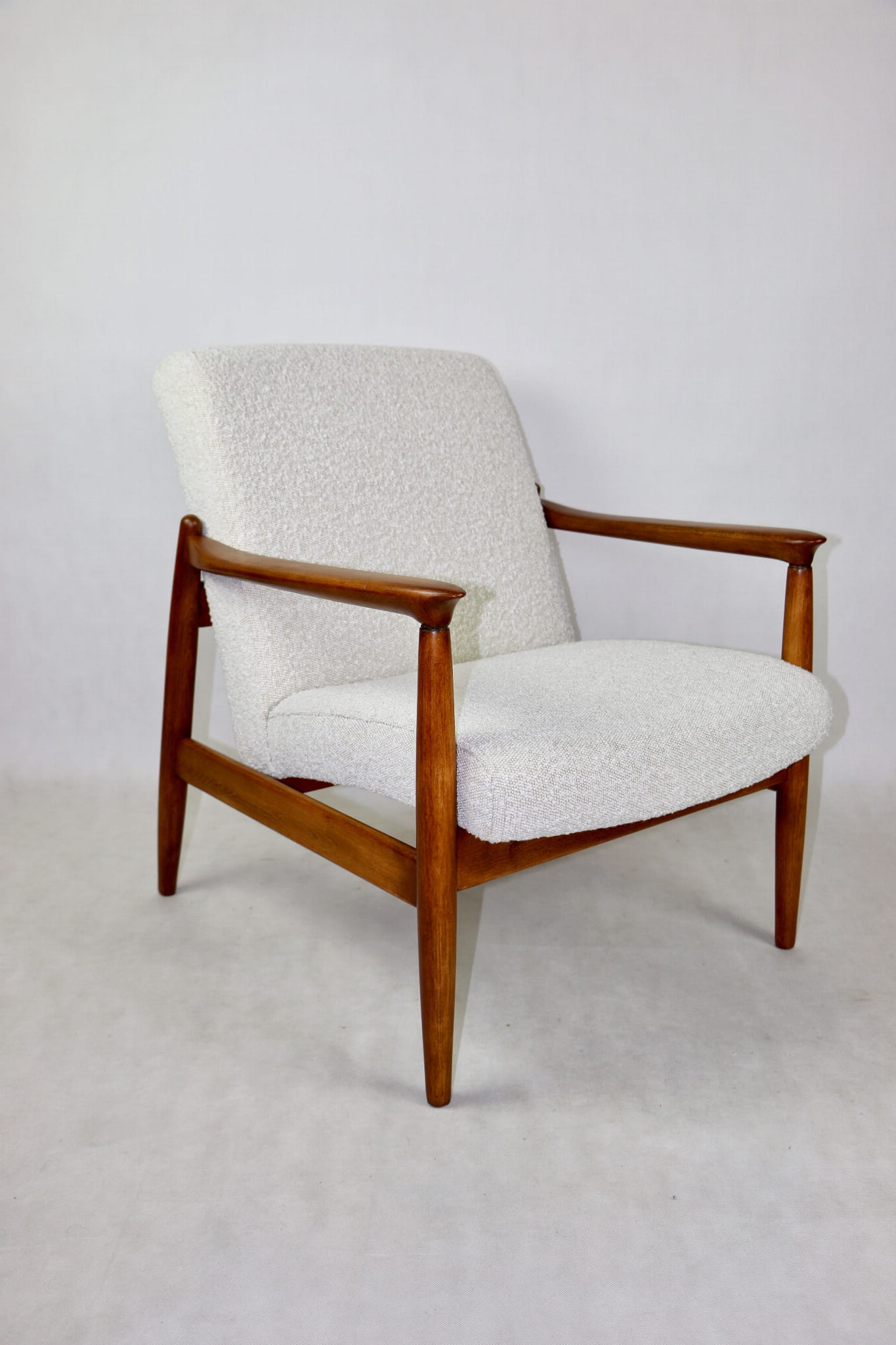 Fotel GFM - 64 zaprojektowany przez Edmunda Homę. Kompletnie odrestaurowany - nowa tapicerka wraz z wypełnieniem została pokryta materiałem tapicerskim strukturalnym typu boucle w kolorze białym. Podparcia i nóżki drewniane, naturalne pokryte lakierem w kolorze brązowego drewna.