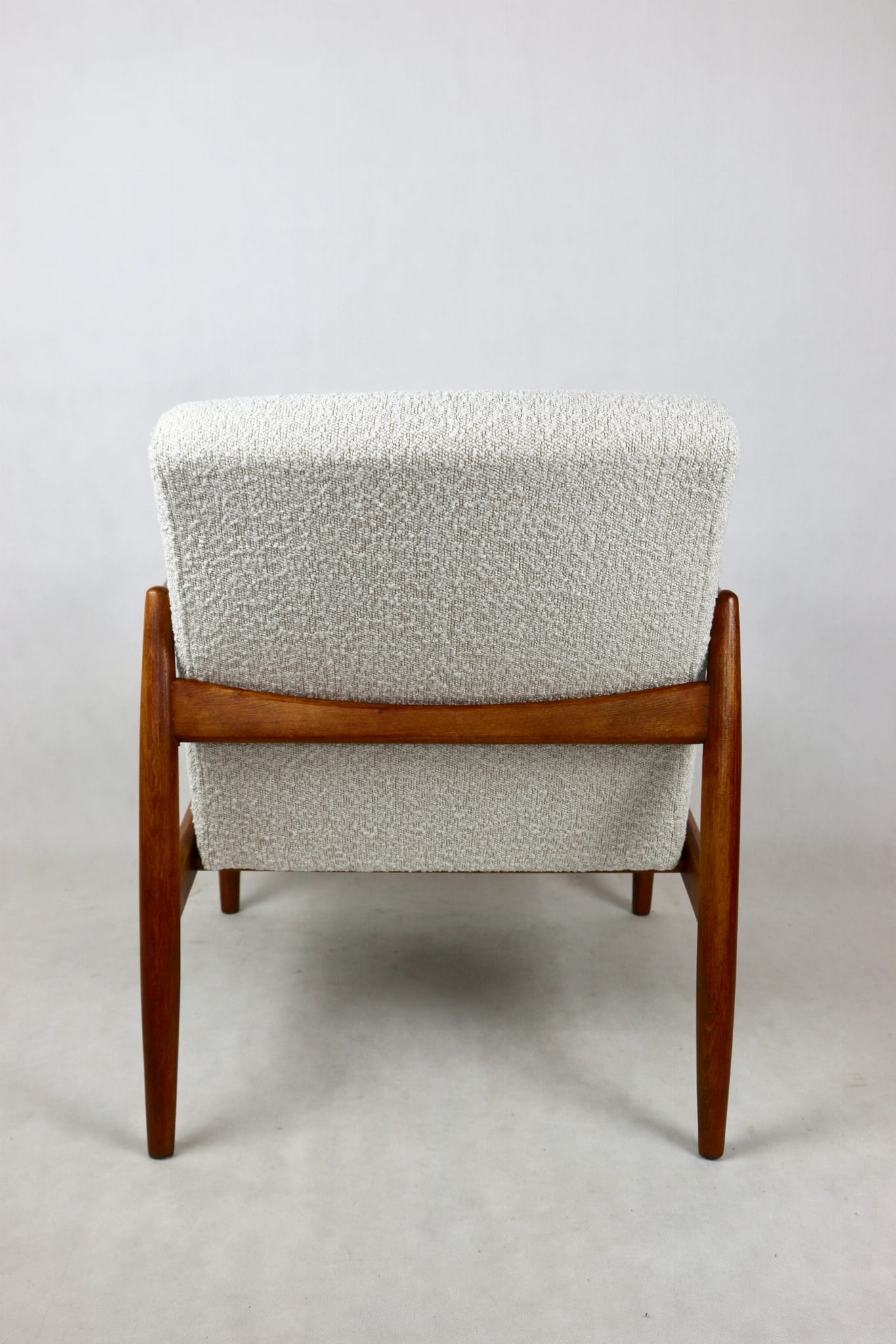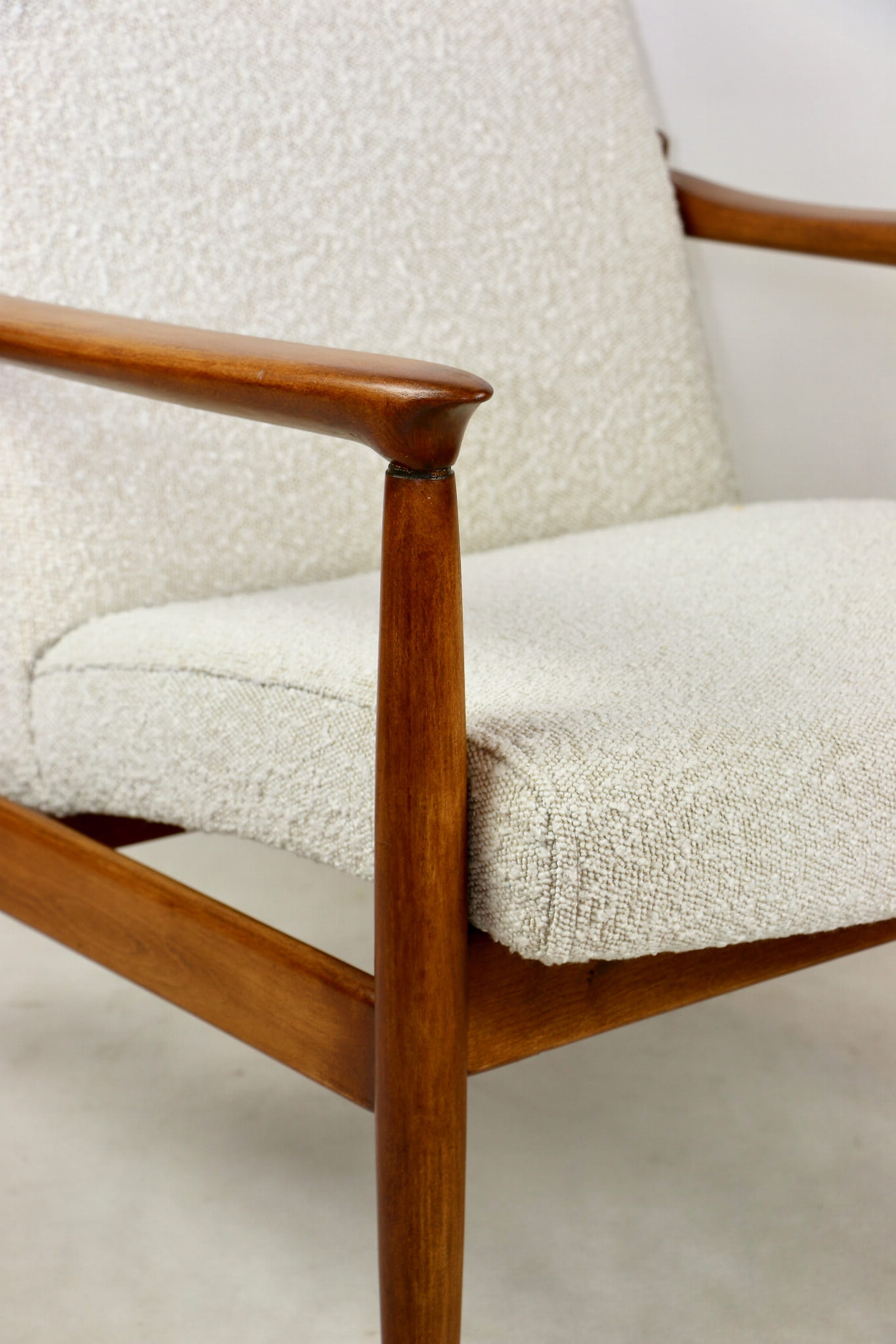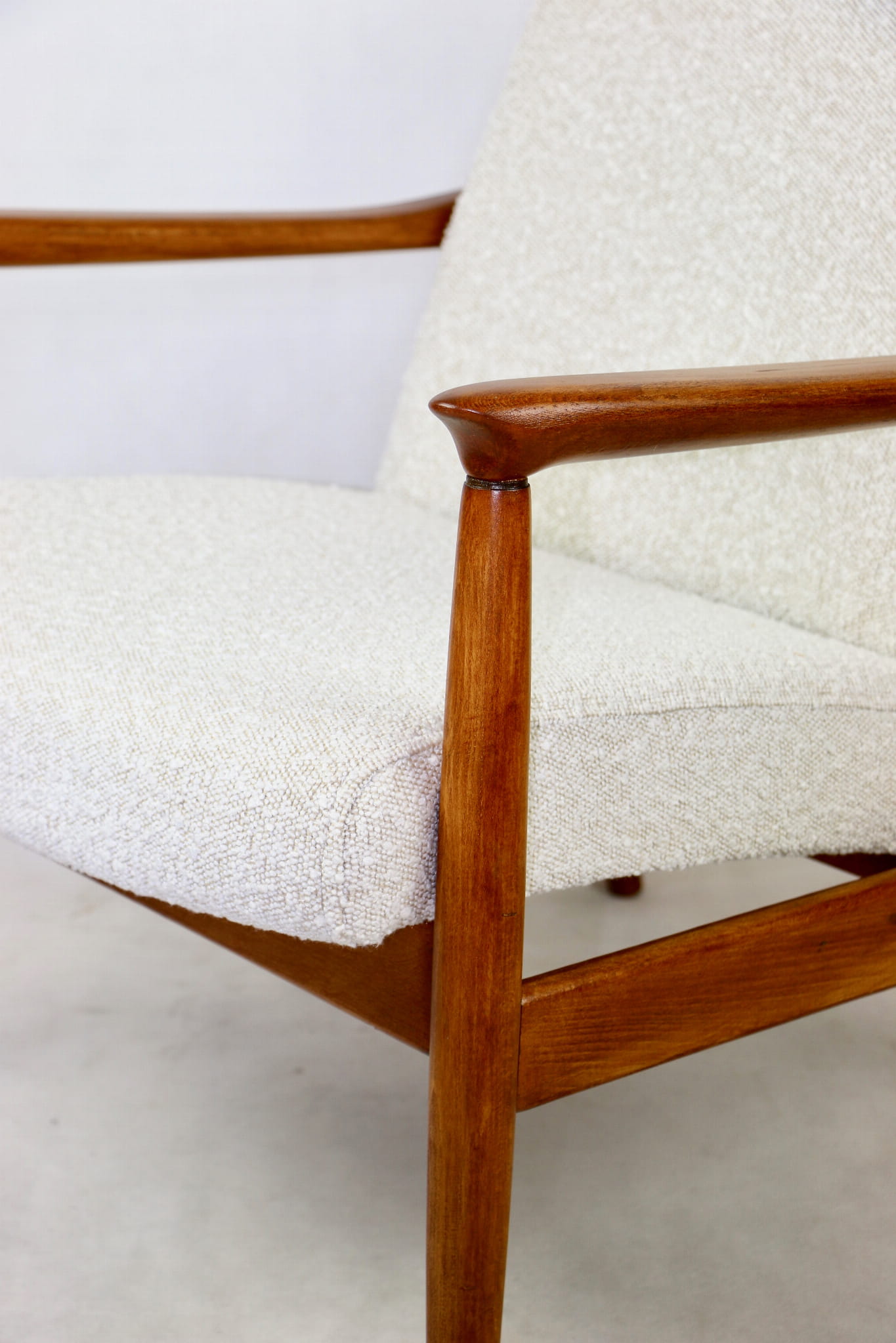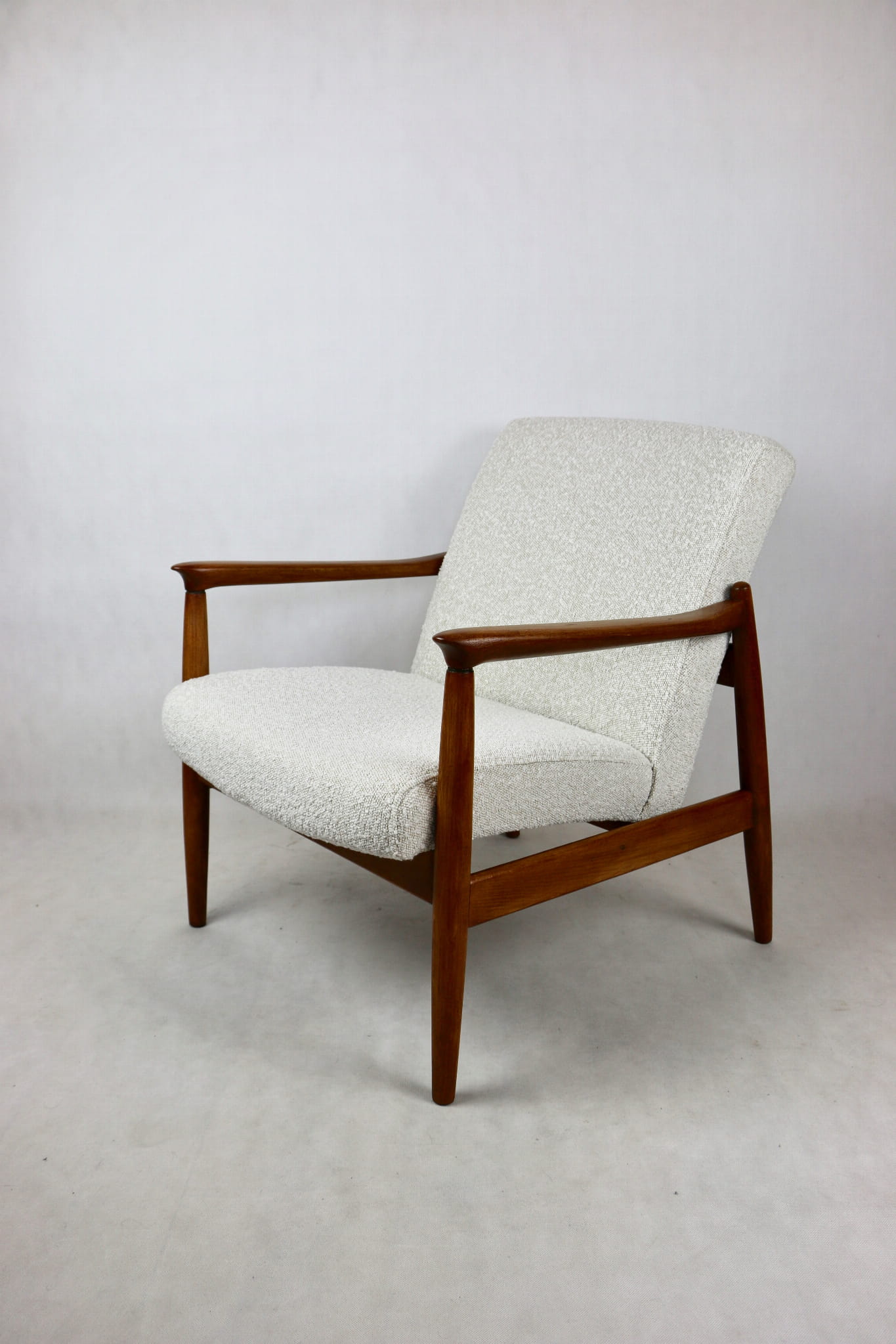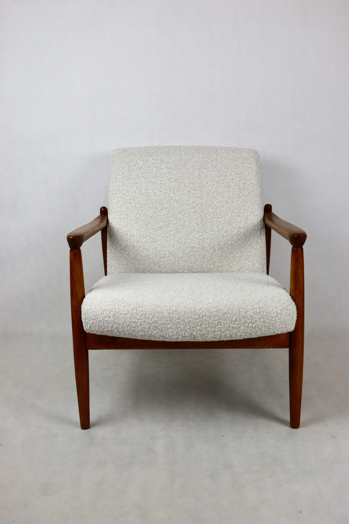 Fotel GFM - 64 zaprojektowany przez Edmunda Homę. Kompletnie odrestaurowany - nowa tapicerka wraz z wypełnieniem została pokryta materiałem tapicerskim strukturalnym typu boucle w kolorze białym. Podparcia i nóżki drewniane, naturalne pokryte lakierem w kolorze brązowego drewna.