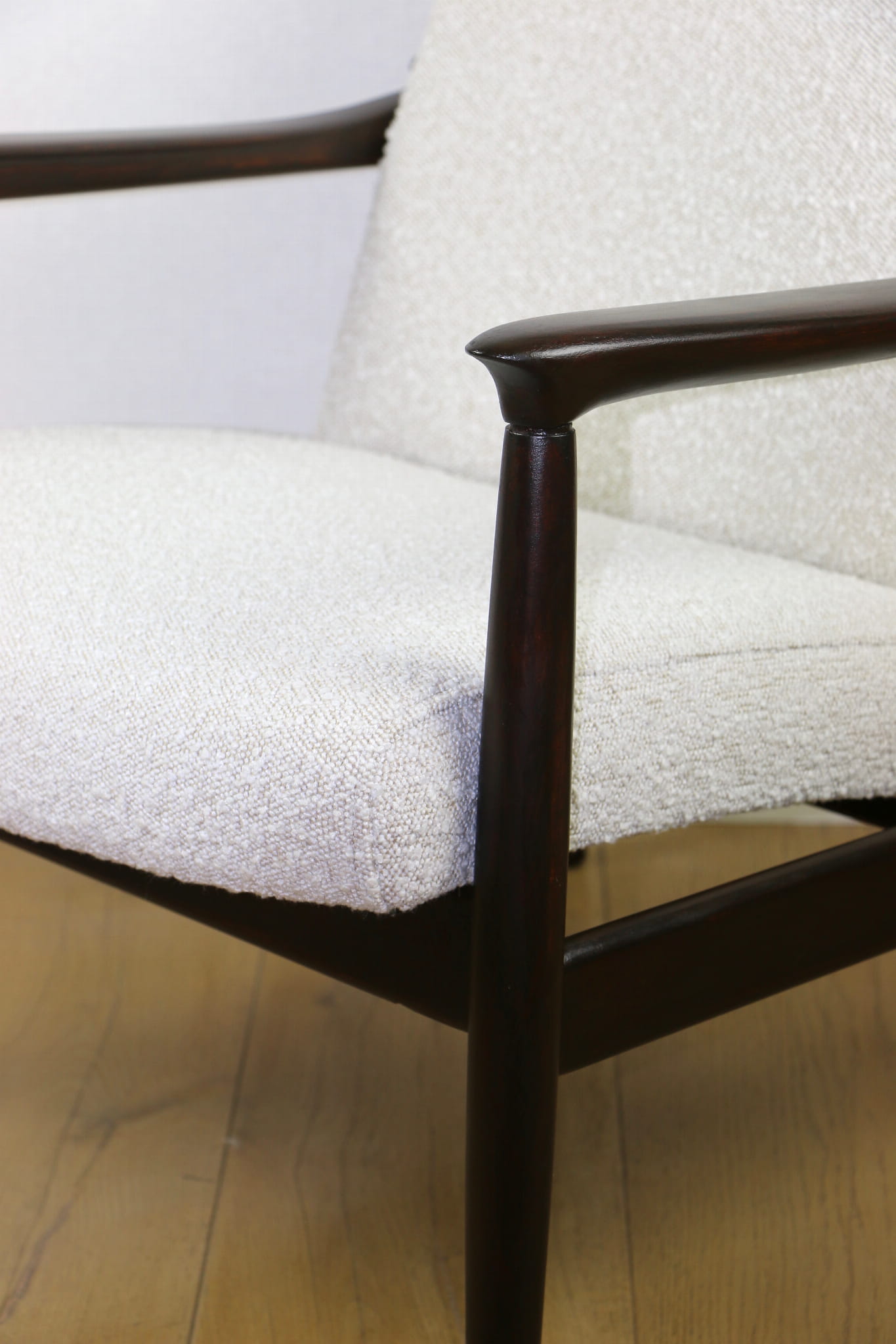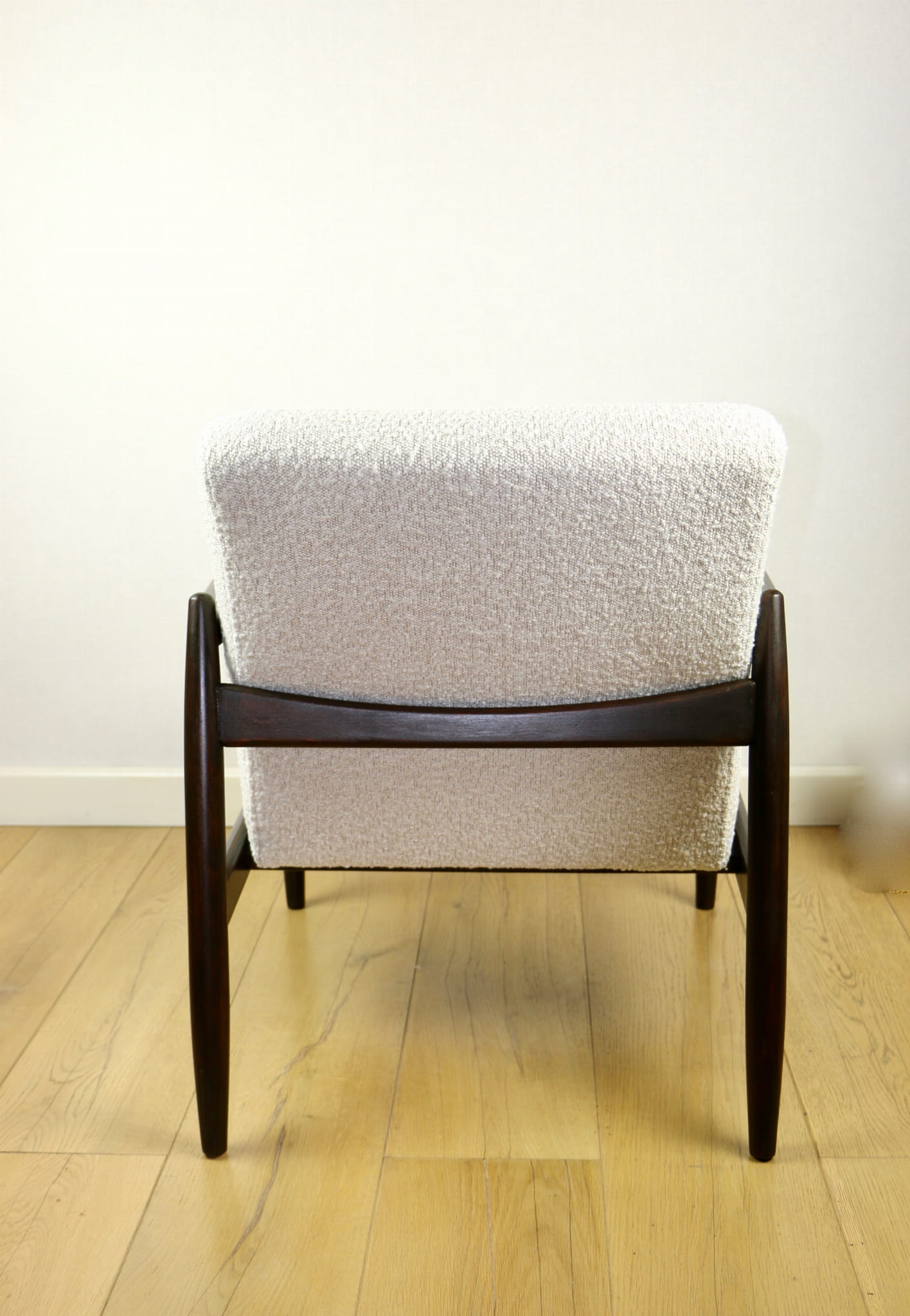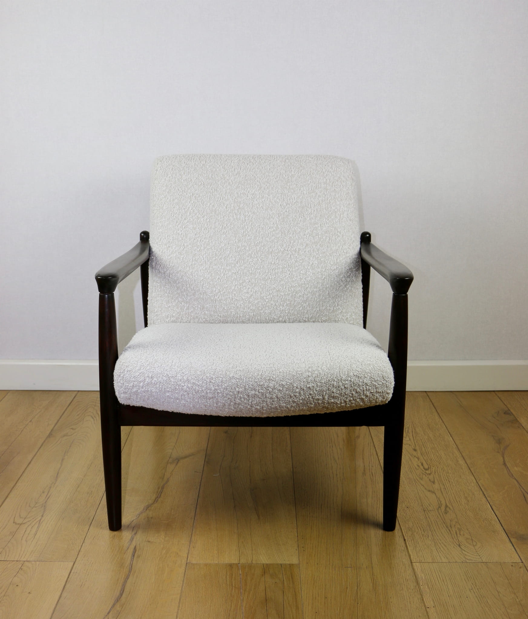 Fotel GFM-64, proj. Edmund Homa z lat 60 biały boucle - ciemne drewno