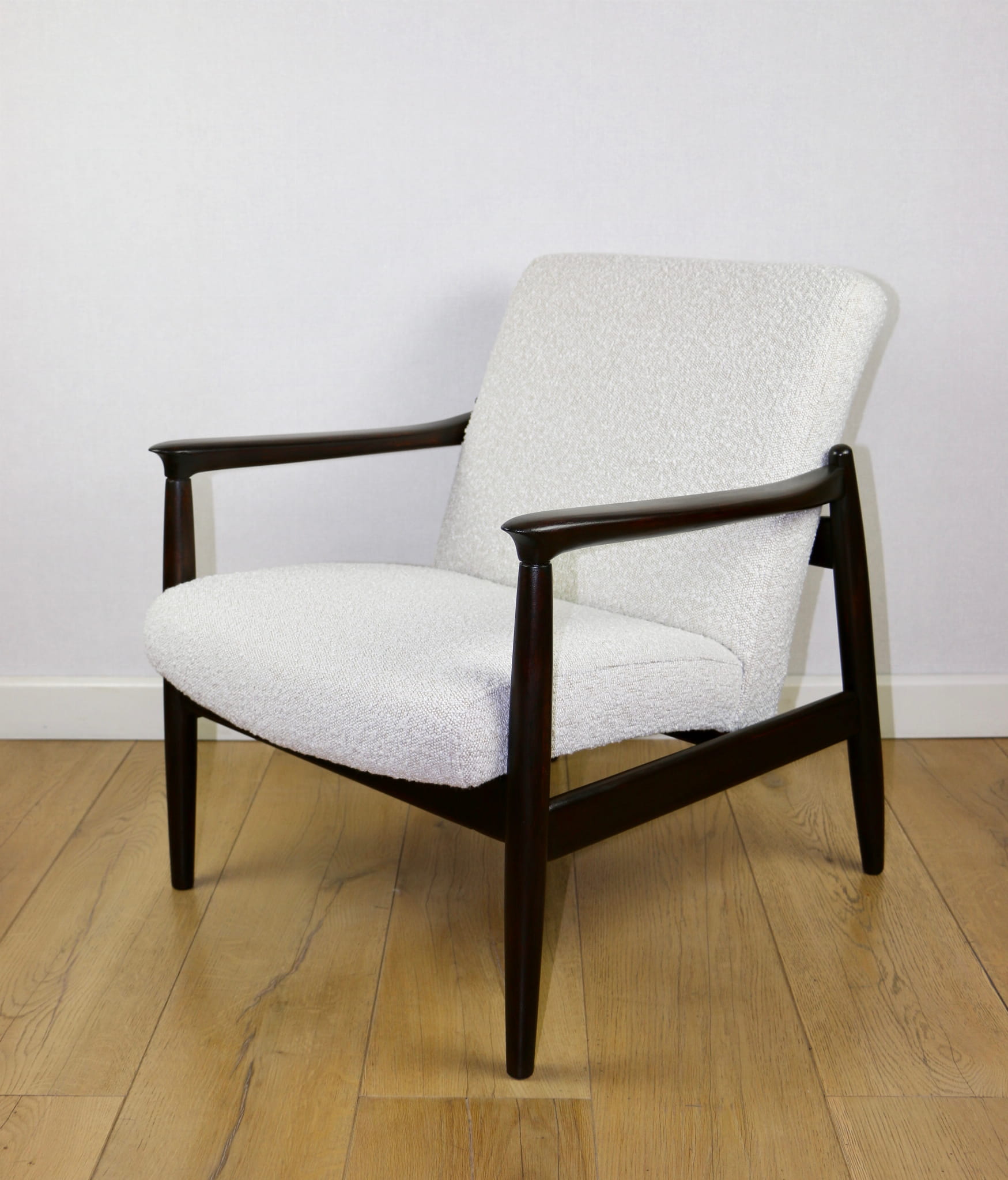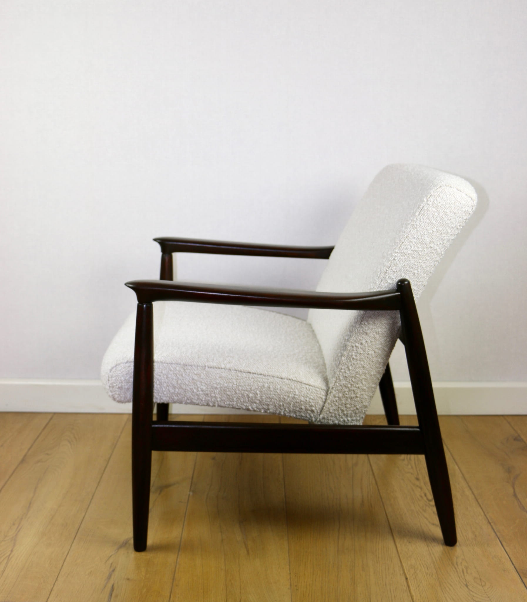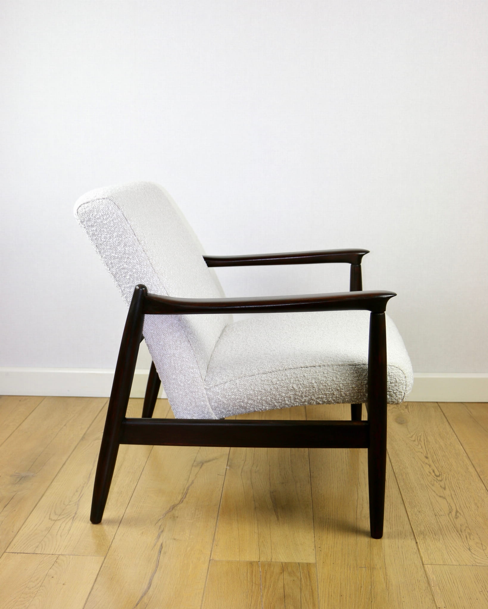 Fotel GFM - 64 zaprojektowany przez Edmunda Homę. Kompletnie odrestaurowany - nowa tapicerka wraz z wypełnieniem została pokryta materiałem tapicerskim strukturalnym typu boucle w kolorze białym. Podparcia i nóżki drewniane, naturalne pokryte lakierem w kolorze ciemnego drewna.