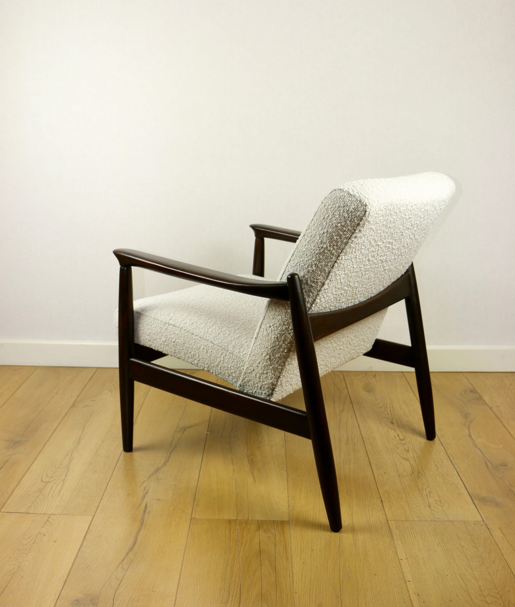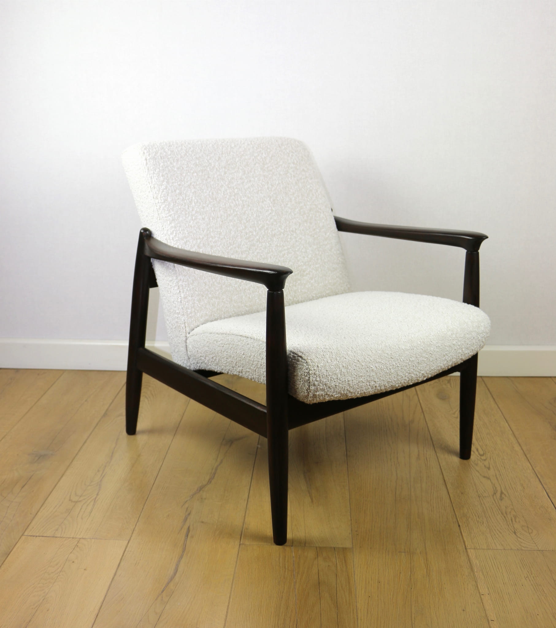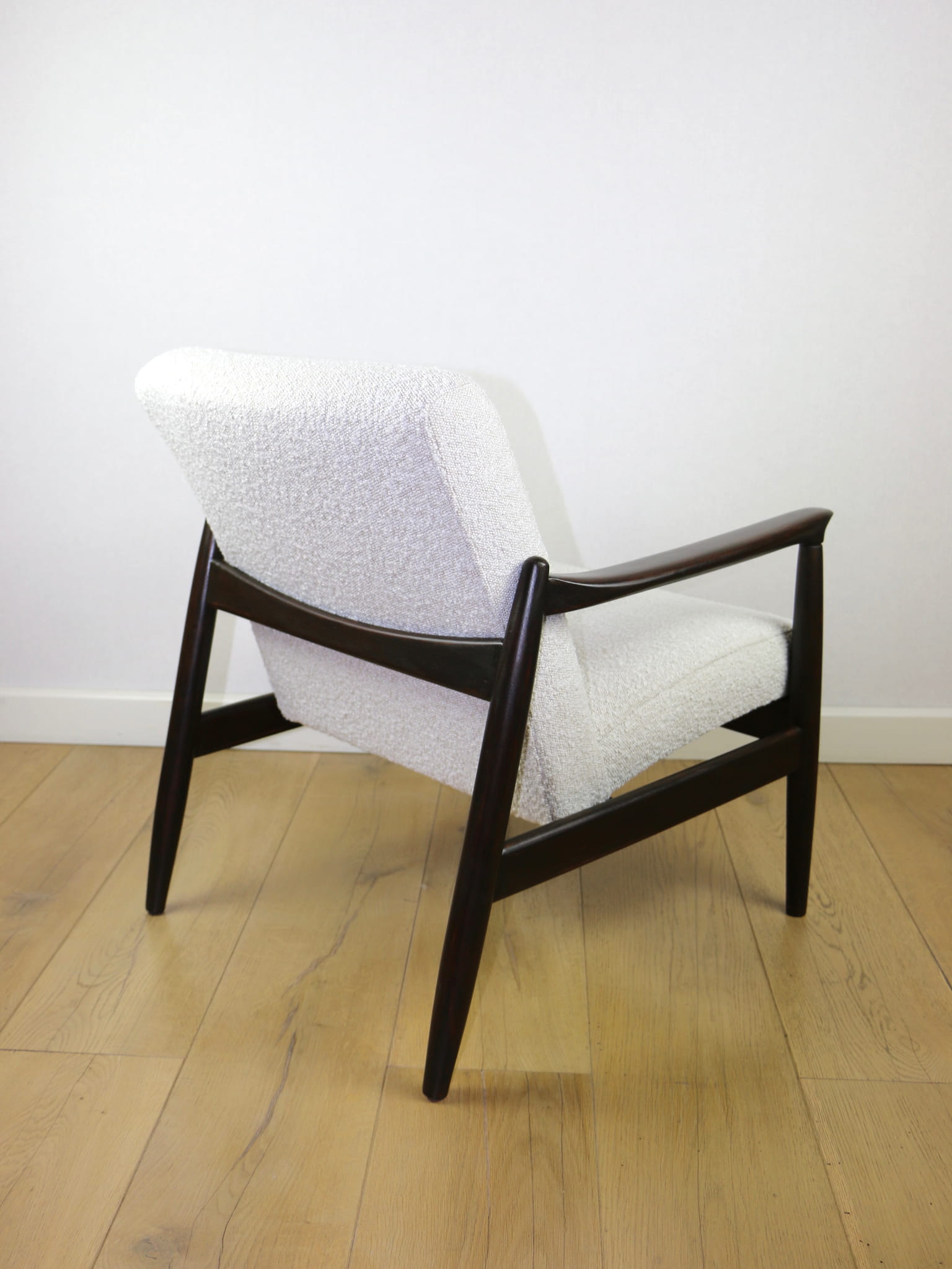 Fotel GFM - 64 zaprojektowany przez Edmunda Homę. Kompletnie odrestaurowany - nowa tapicerka wraz z wypełnieniem została pokryta materiałem tapicerskim strukturalnym typu boucle w kolorze białym. Podparcia i nóżki drewniane, naturalne pokryte lakierem w kolorze ciemnego drewna.