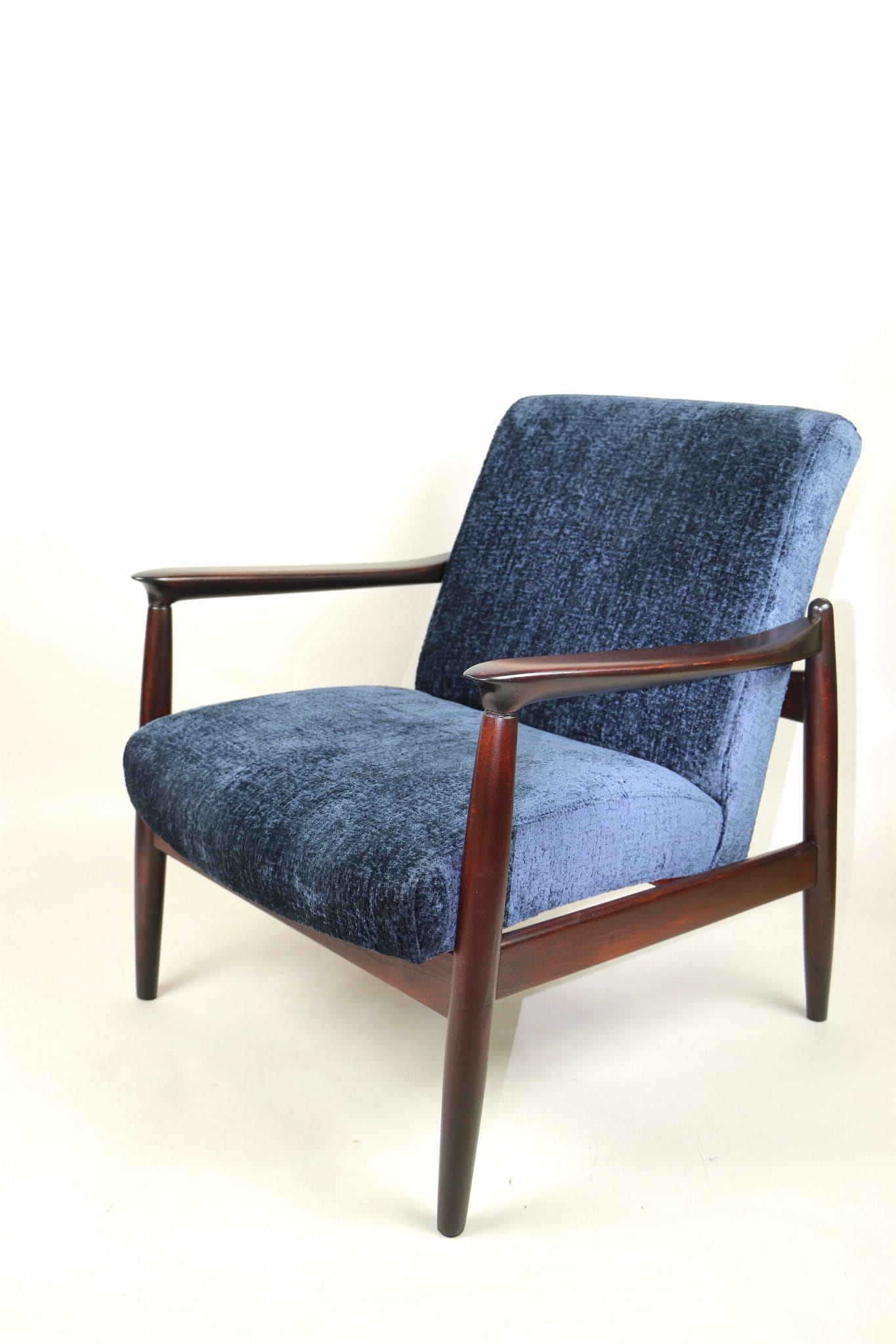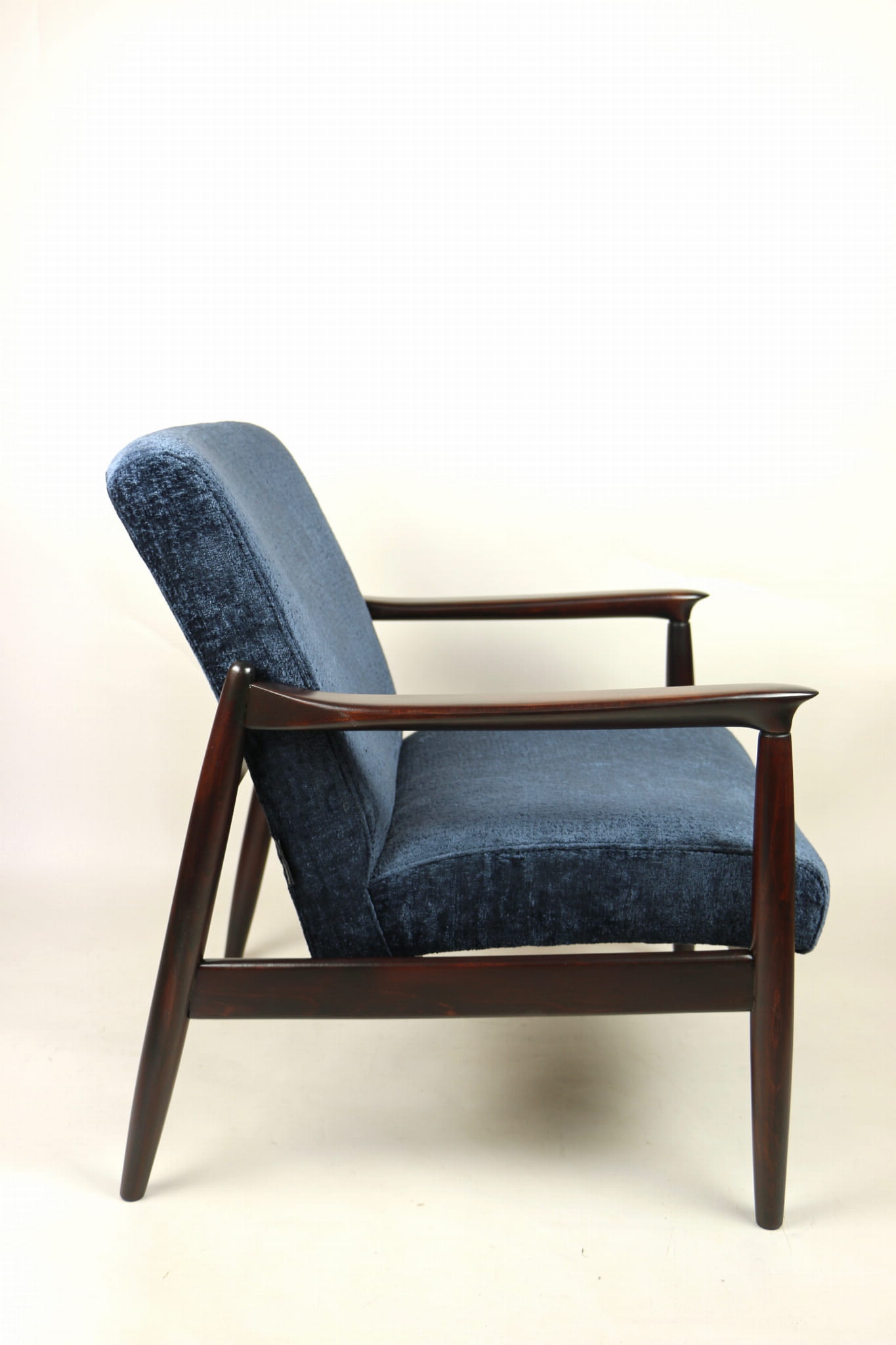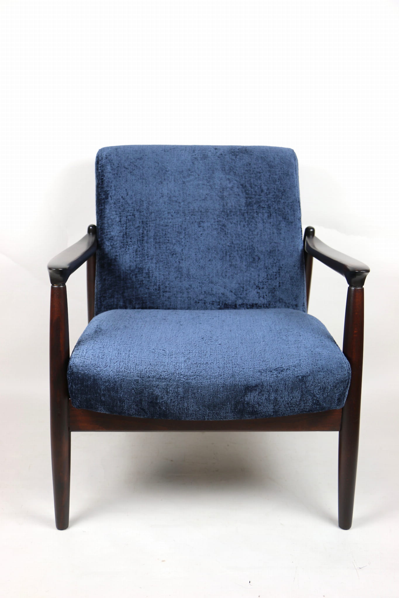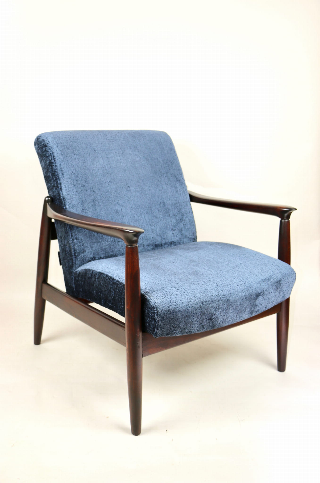 Fotel GFM - 64 zaprojektowany przez Edmunda Homę. Kompletnie odrestaurowany. Nowa tapicerka wraz z wypełnieniem pokryta aksamitnym materiałem tapicerskim strukturalnym w kolorze granatowym typu welwet z serii Bergen. Podparcia i nóżki drewniane, naturalne pokryte lakiero-bejcą w kolorze orzecha.