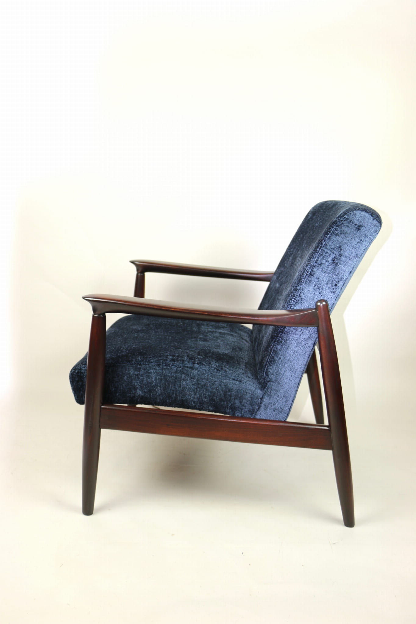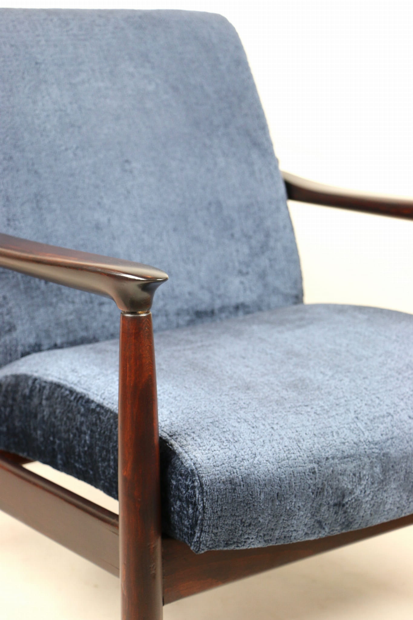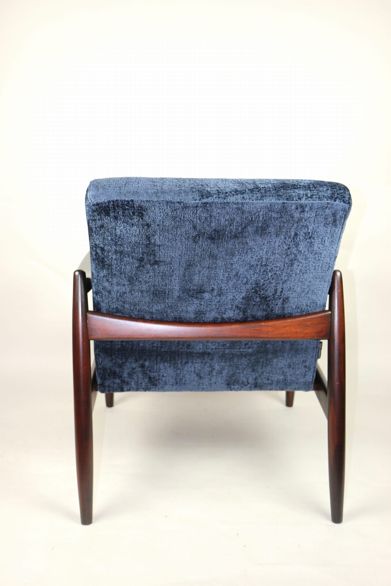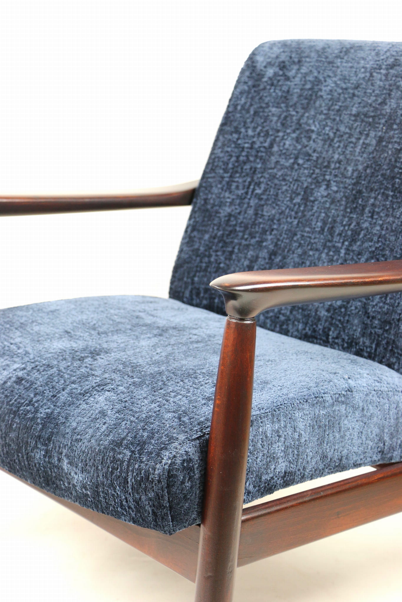 Fotel GFM - 64 zaprojektowany przez Edmunda Homę. Kompletnie odrestaurowany. Nowa tapicerka wraz z wypełnieniem pokryta aksamitnym materiałem tapicerskim strukturalnym w kolorze granatowym typu welwet z serii Bergen. Podparcia i nóżki drewniane, naturalne pokryte lakiero-bejcą w kolorze orzecha.