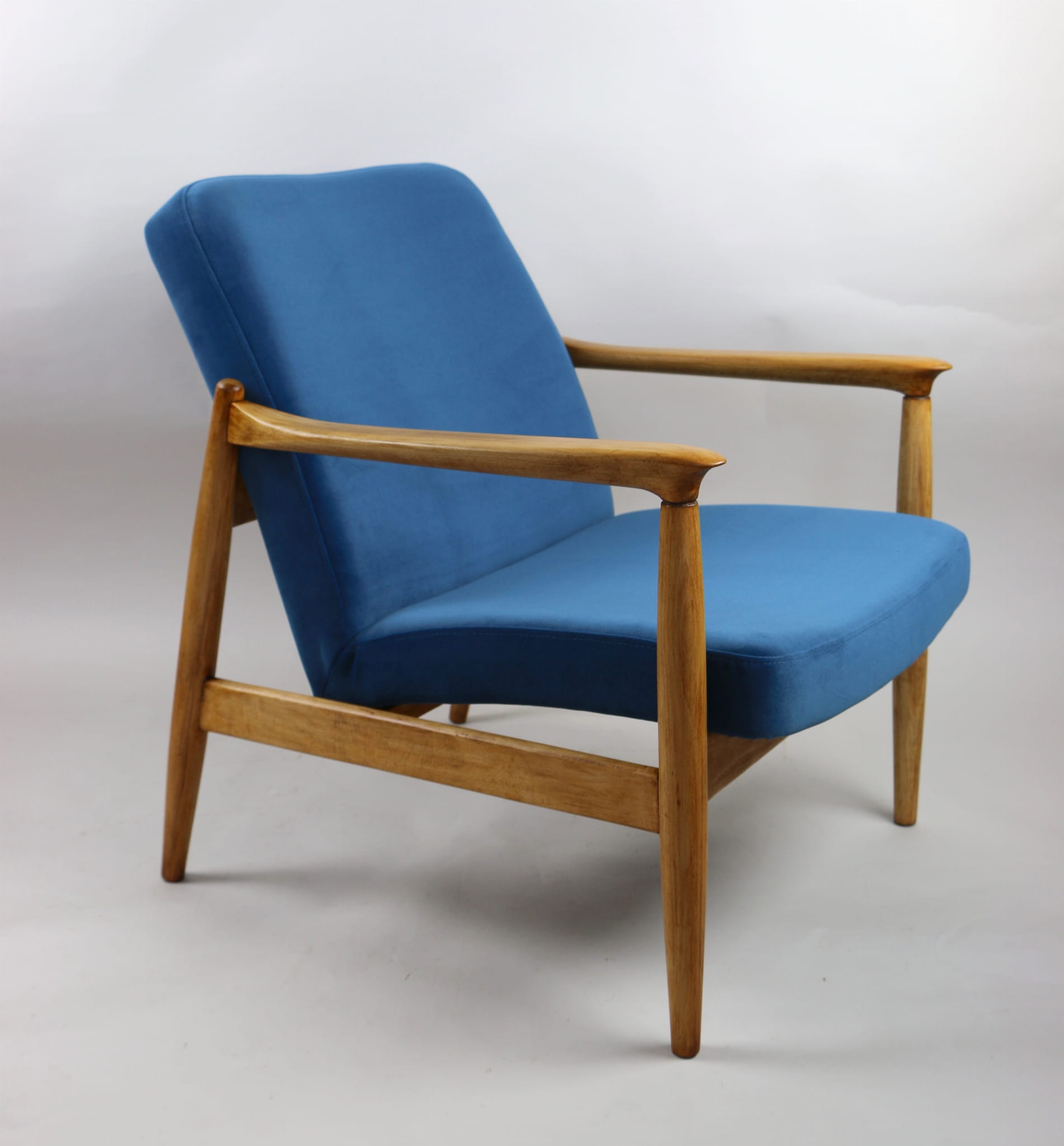 Fotel GFM - 64 zaprojektowany przez Edmunda Homę. Kompletnie odrestaurowane. Nowa tapicerka wraz z wypełnieniem pokryta aksamitnym materiałem tapicerskim VELVET w kolorze niebieskim - kolekcja Jade . Podparcia i nóżki drewniane, naturalne pokryte olejo-woskiem w kolorze naturalnego drewna.