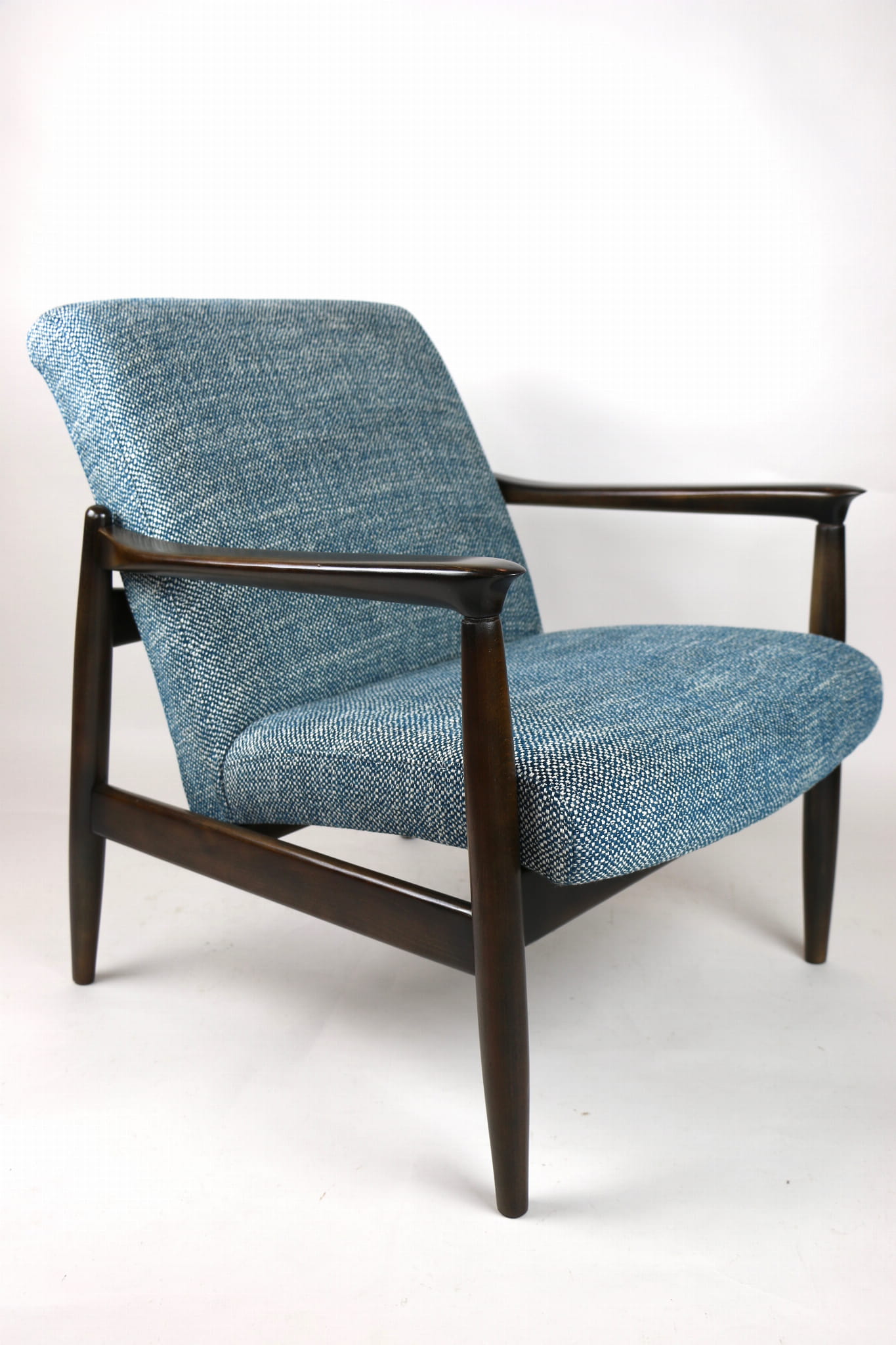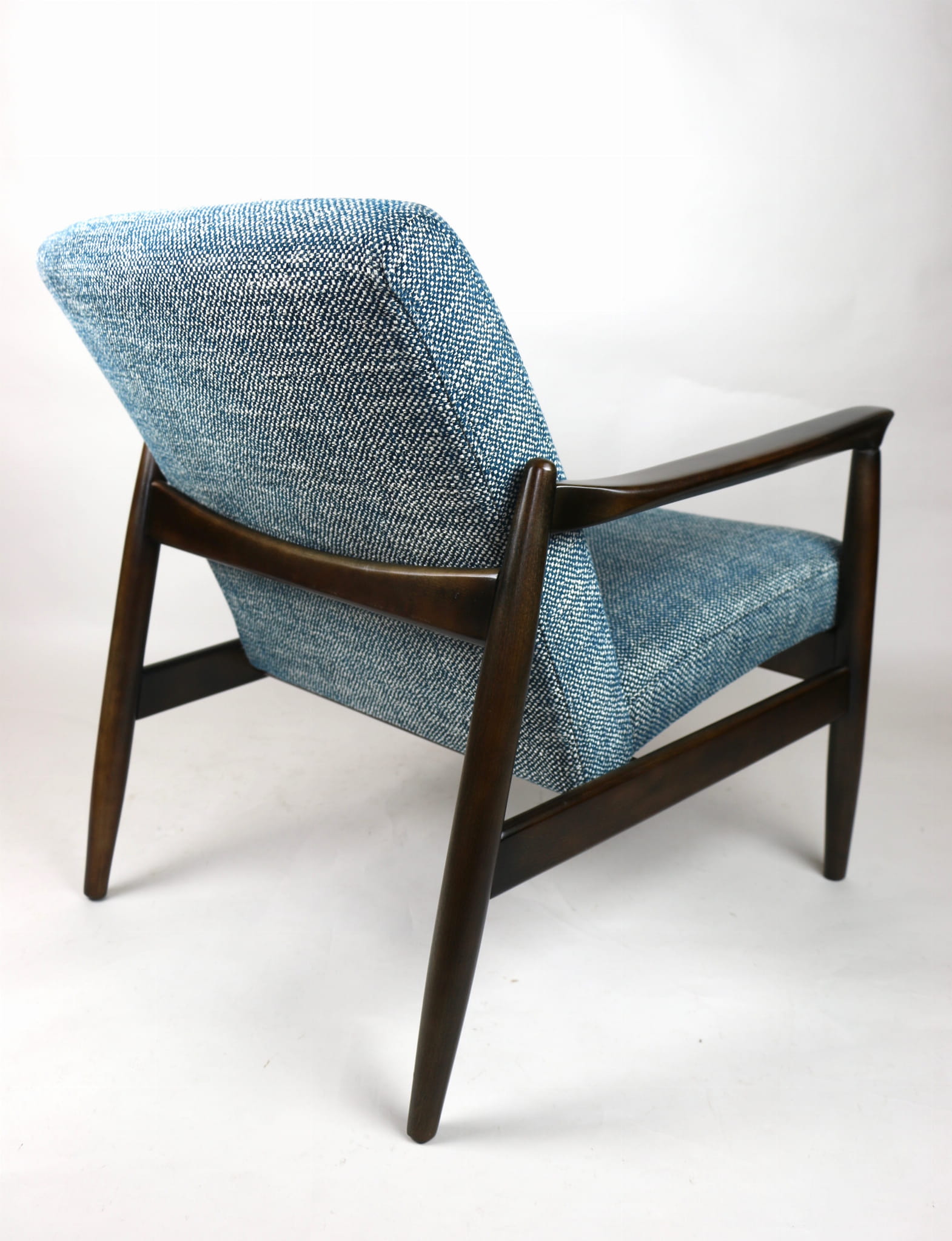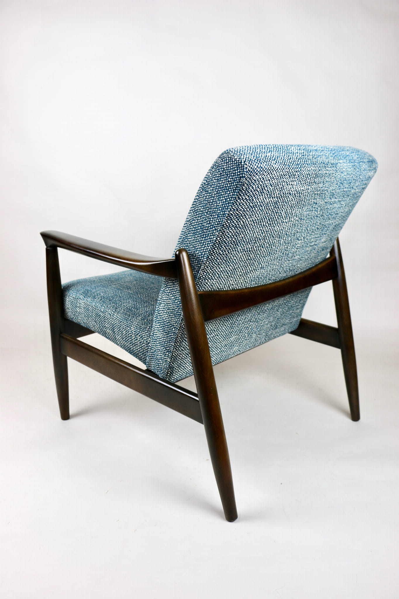 Fotel Vintage GFM - 64 zaprojektowany przez Edmund Homa. Kompletnie odrestaurowany - nowa tapicerka wraz z wypełnieniem została pokryta naturalnym materiałem tapicerskim strukturalnym w kolorze niebiesko morskim. Podparcia i nóżki drewniane, naturalne pokryte lakierem w kolorze ciemnego drewna.