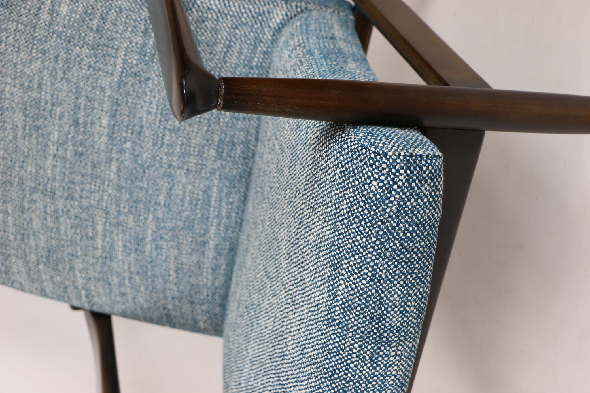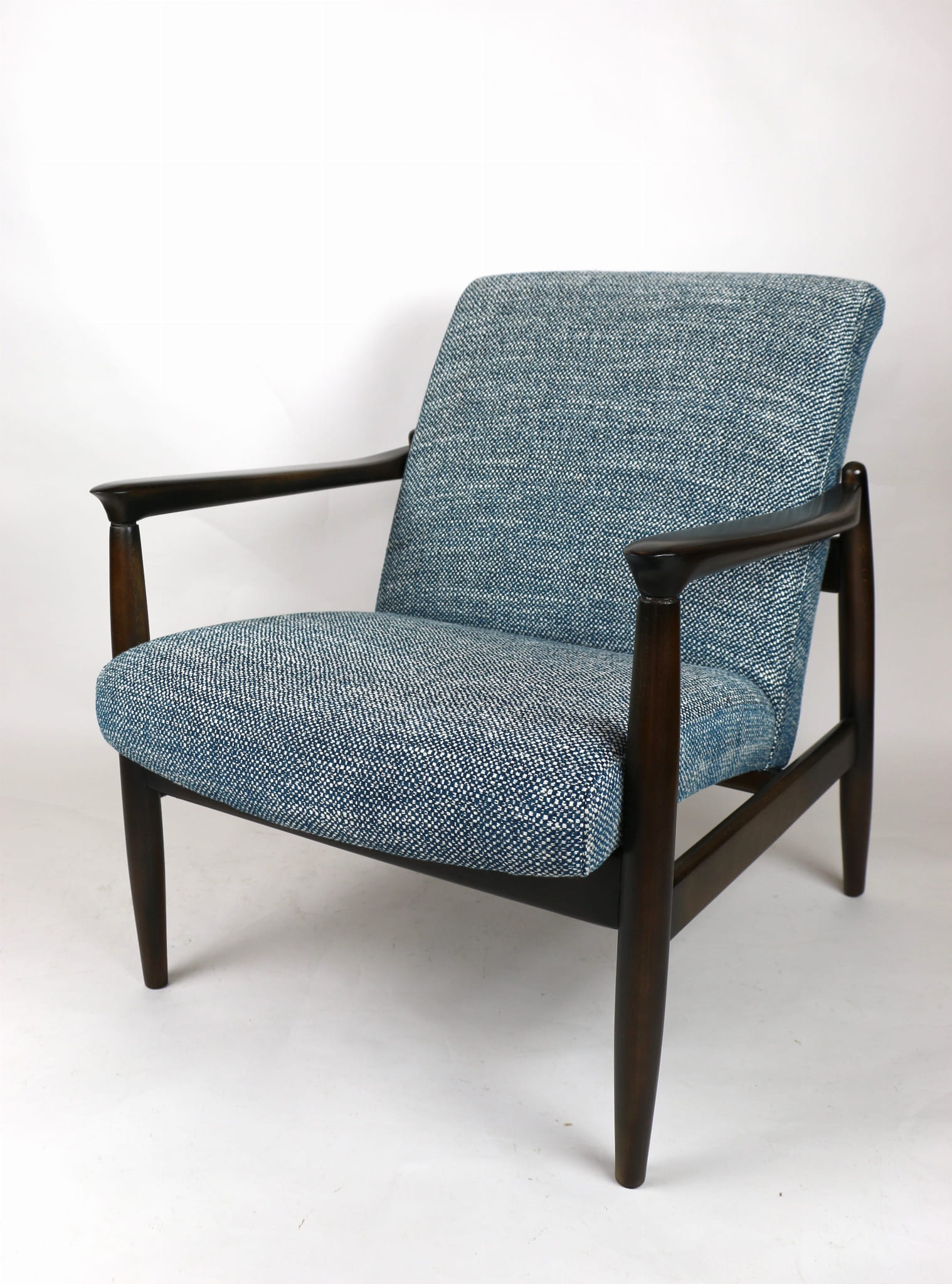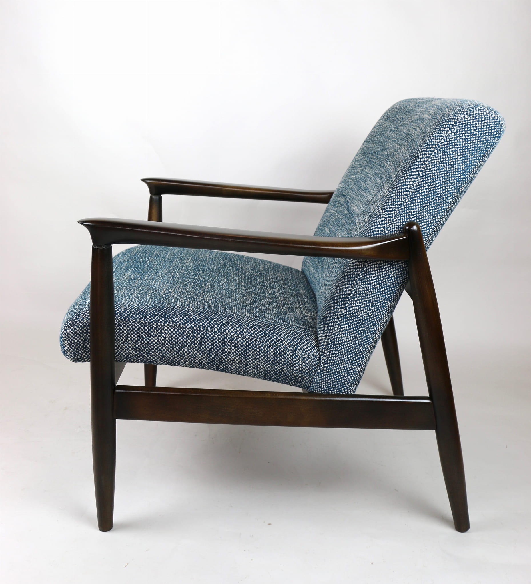 Fotel Vintage GFM - 64 zaprojektowany przez Edmund Homa. Kompletnie odrestaurowany - nowa tapicerka wraz z wypełnieniem została pokryta naturalnym materiałem tapicerskim strukturalnym w kolorze niebiesko morskim. Podparcia i nóżki drewniane, naturalne pokryte lakierem w kolorze ciemnego drewna.