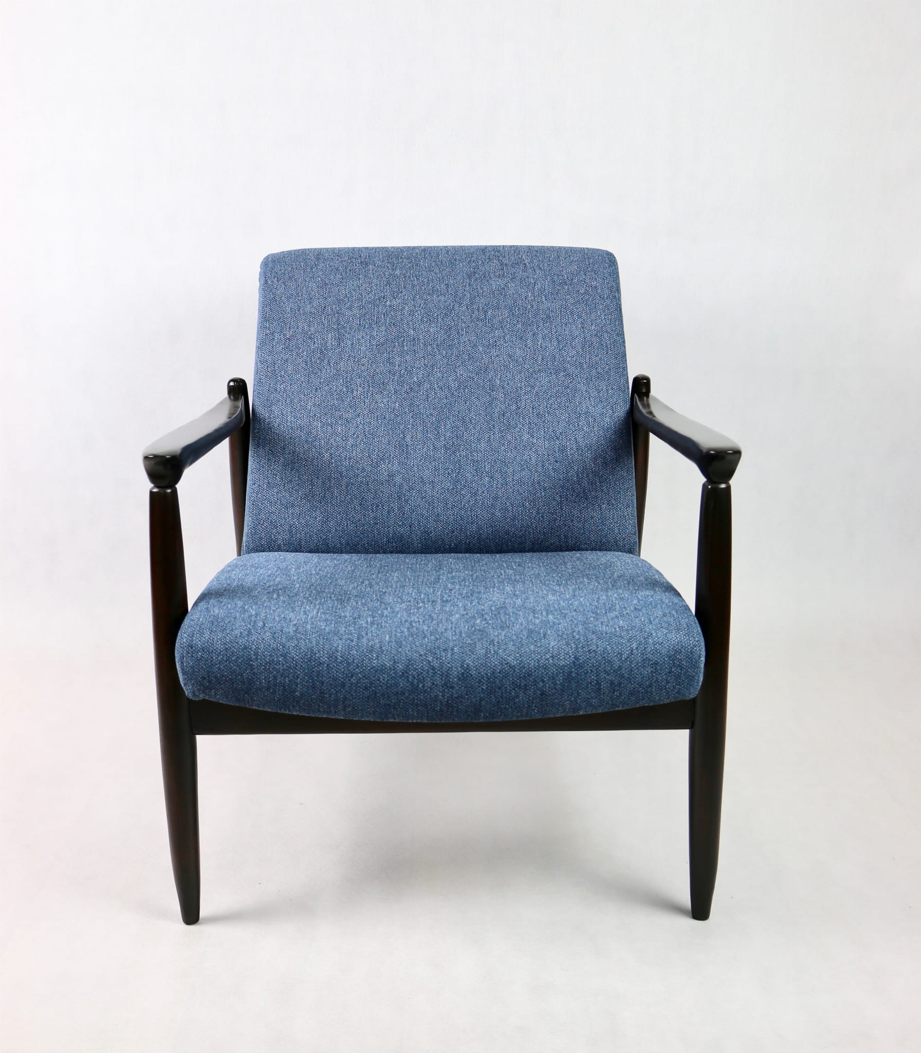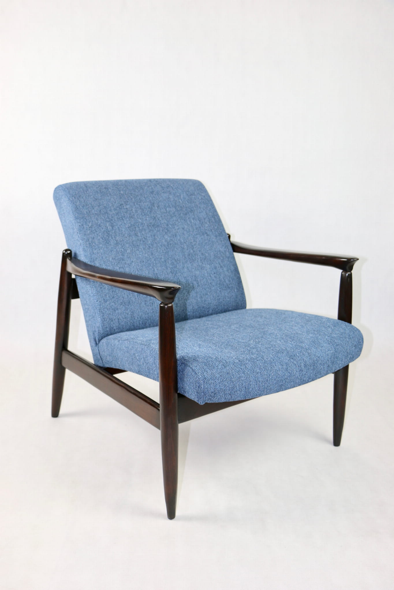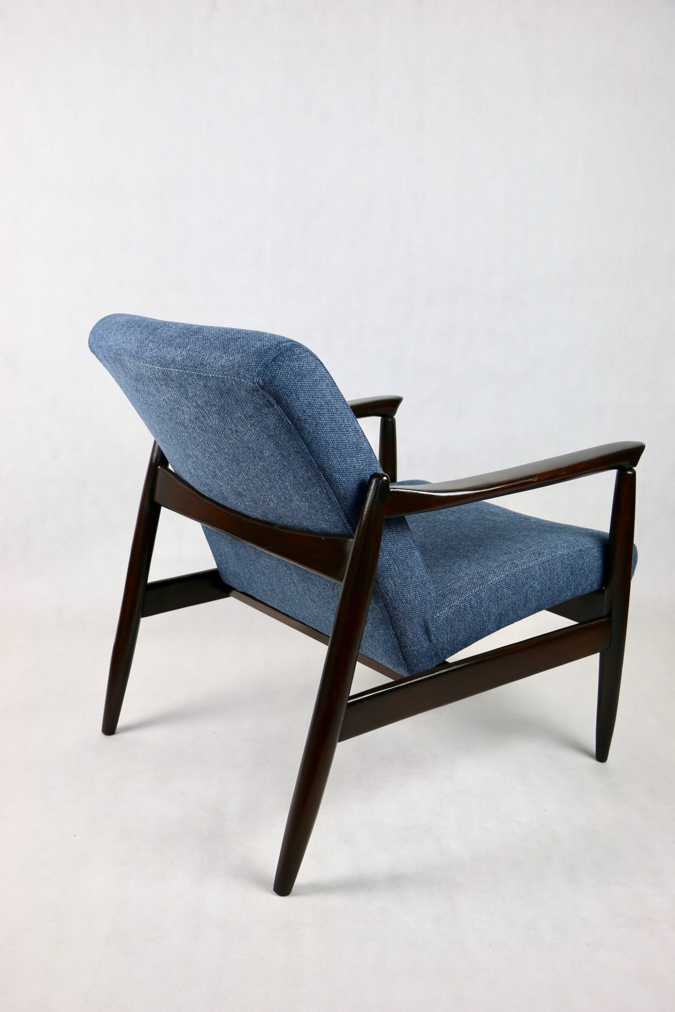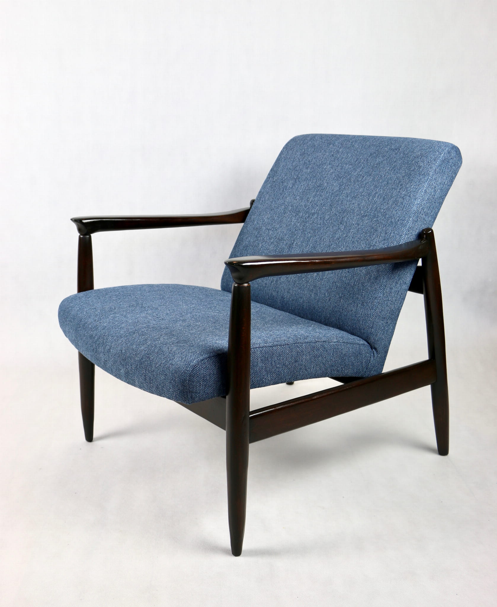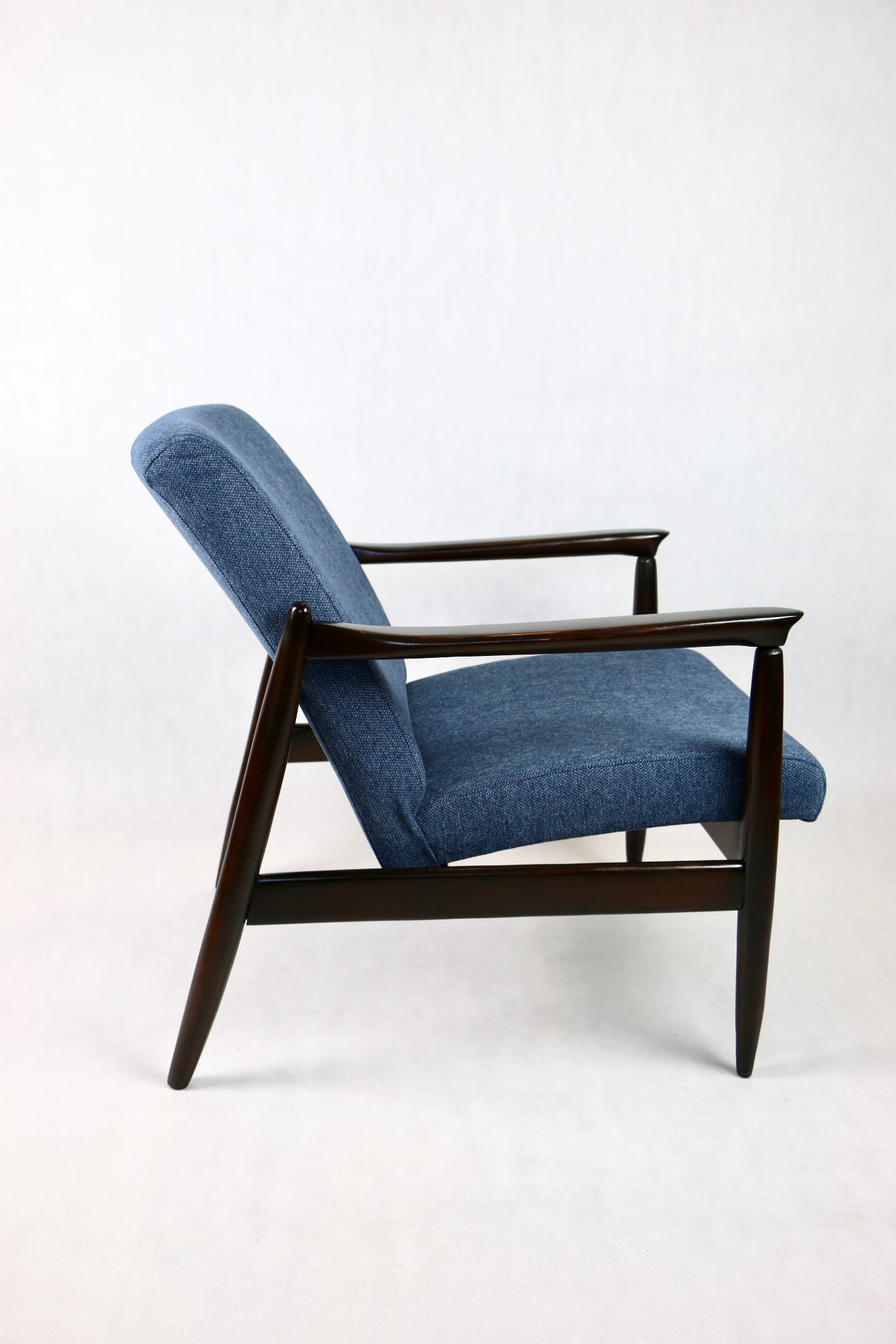 Fotel Vintage GFM - 64 zaprojektowany przez Edmund Homa. Kompletnie odrestaurowany - nowa tapicerka wraz z wypełnieniem została pokryta materiałem tapicerskim strukturalnym w kolorze niebiesko morskim z serii Queens. Podparcia i nóżki drewniane, naturalne pokryte lakierem w kolorze ciemnego drewna.