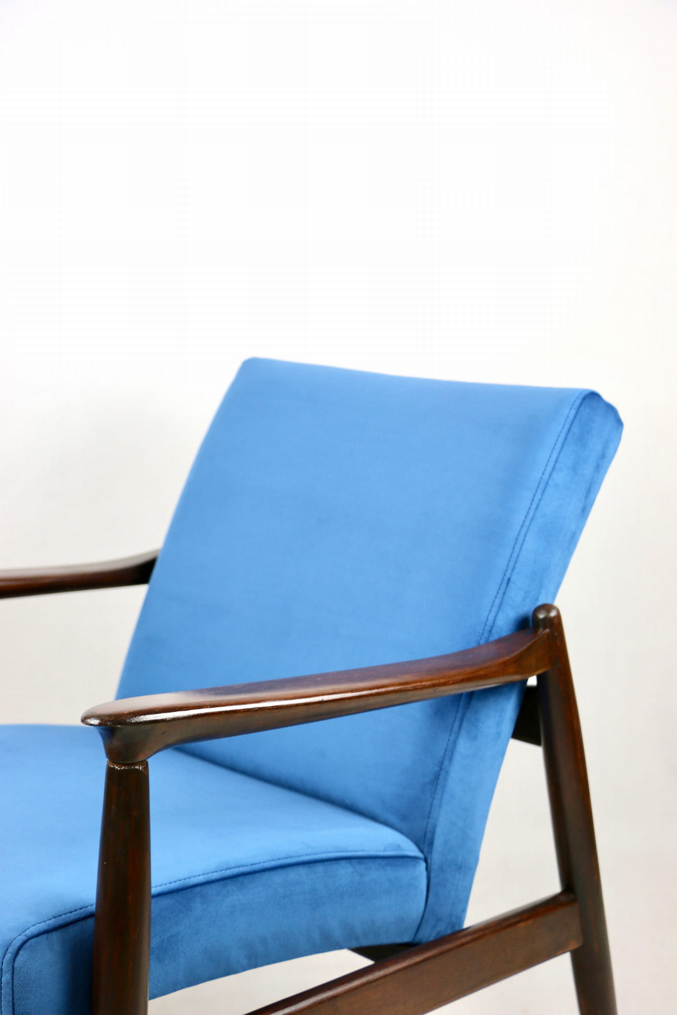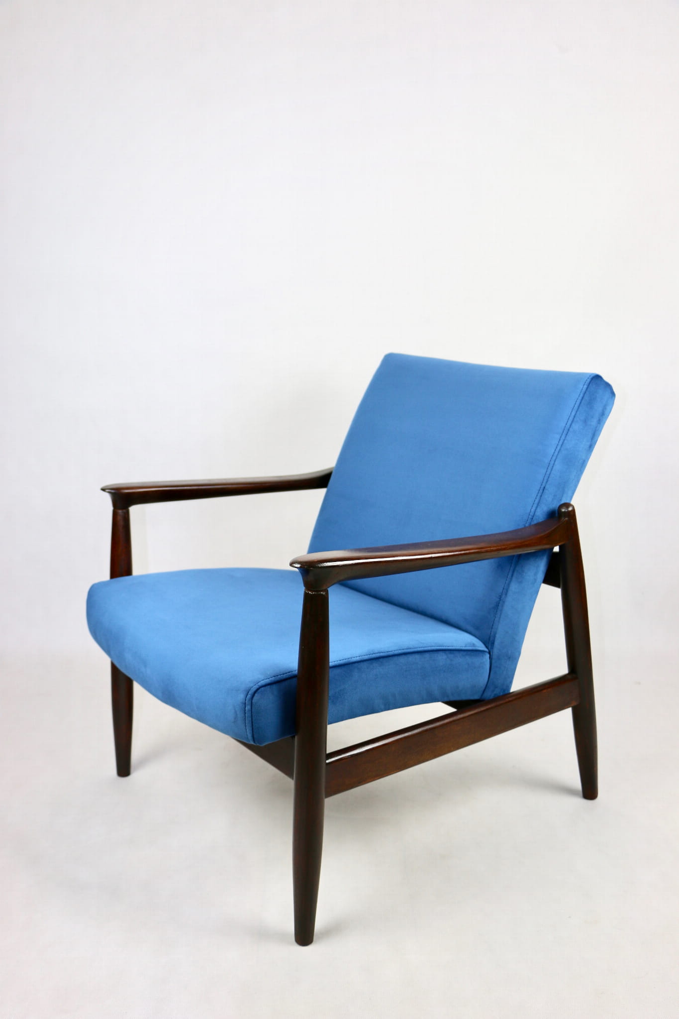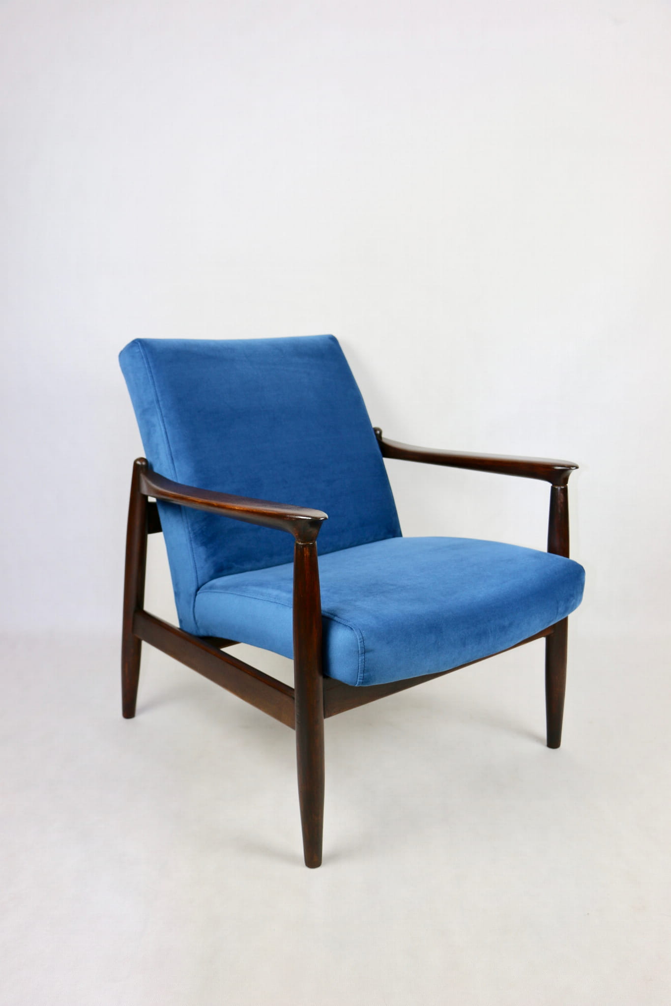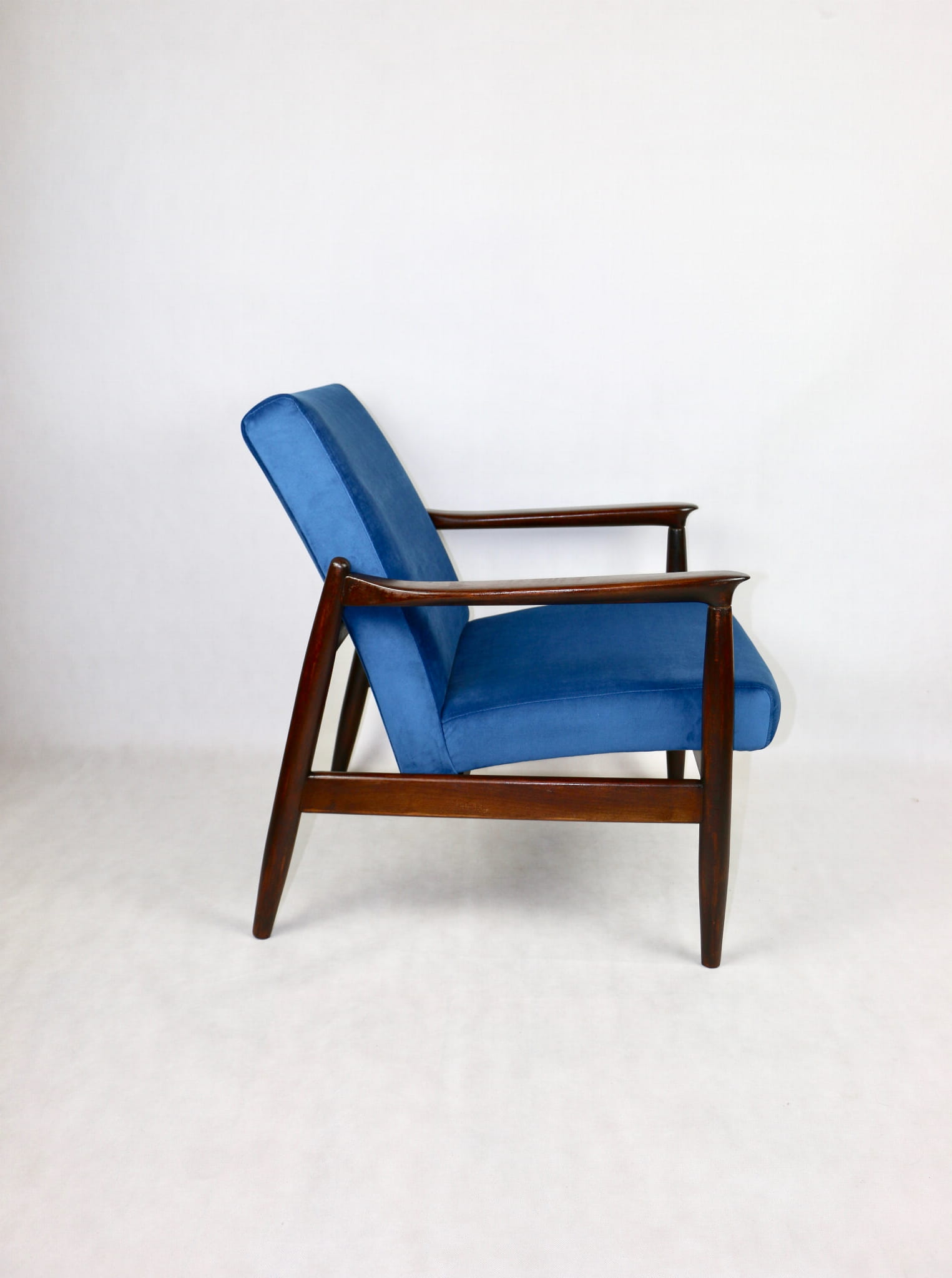 Fotel GFM - 64 zaprojektowany przez Edmunda Homa. Kompletnie odrestaurowane od podstaw. Nowa tapicerka wraz z wypełnieniem pokryta aksamitnym materiałem tapicerskim VELVET w kolorze niebieskim - morskim kolekcja Paris . Podparcia i nóżki drewniane, naturalne pokryte lakiero-woskiem w kolorze ciemnego drewna.