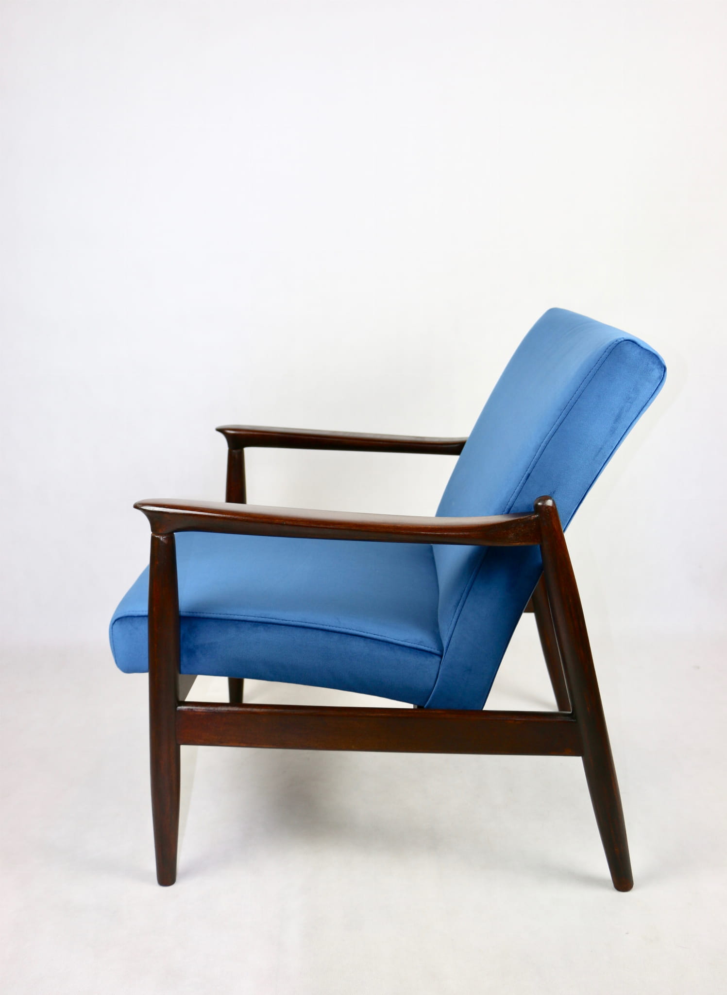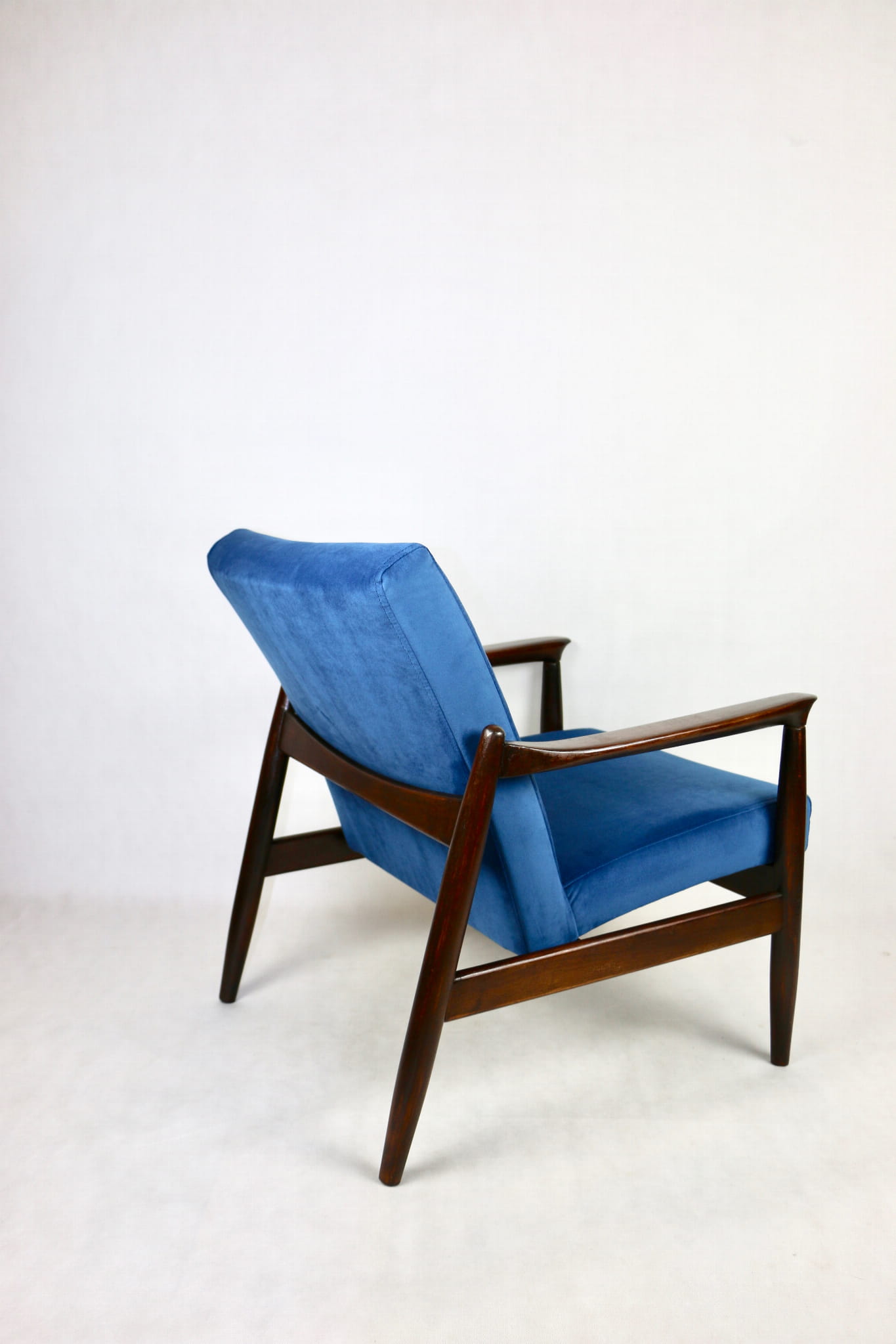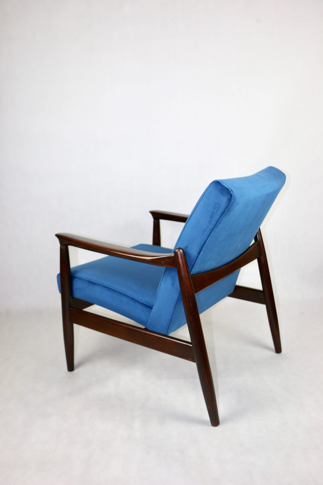 Fotel GFM - 64 zaprojektowany przez Edmunda Homa. Kompletnie odrestaurowane od podstaw. Nowa tapicerka wraz z wypełnieniem pokryta aksamitnym materiałem tapicerskim VELVET w kolorze niebieskim - morskim kolekcja Paris . Podparcia i nóżki drewniane, naturalne pokryte lakiero-woskiem w kolorze ciemnego drewna.