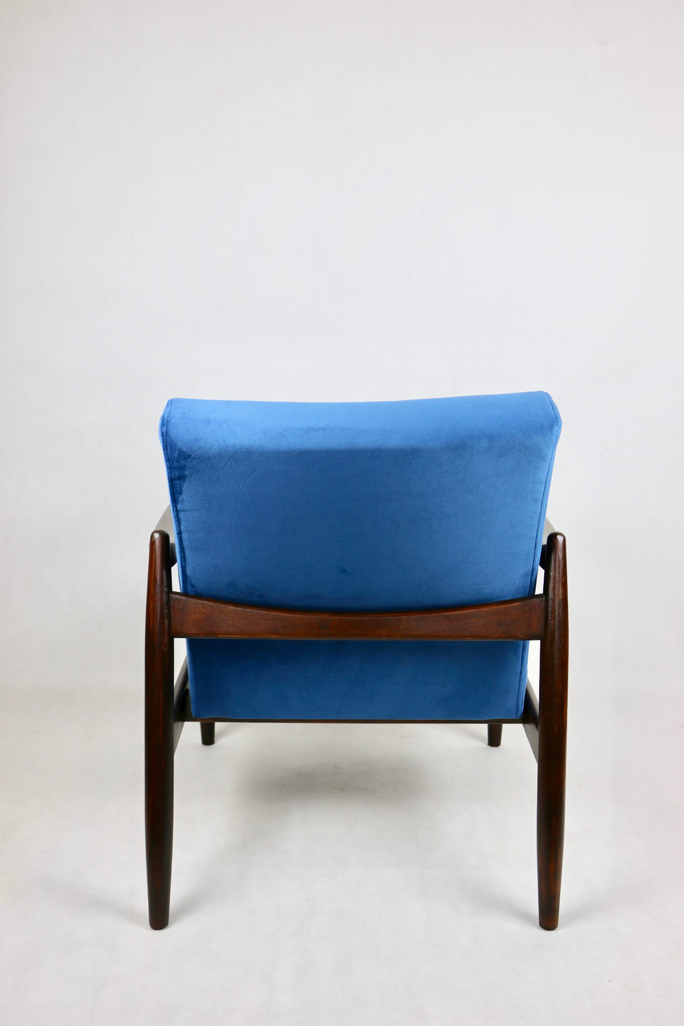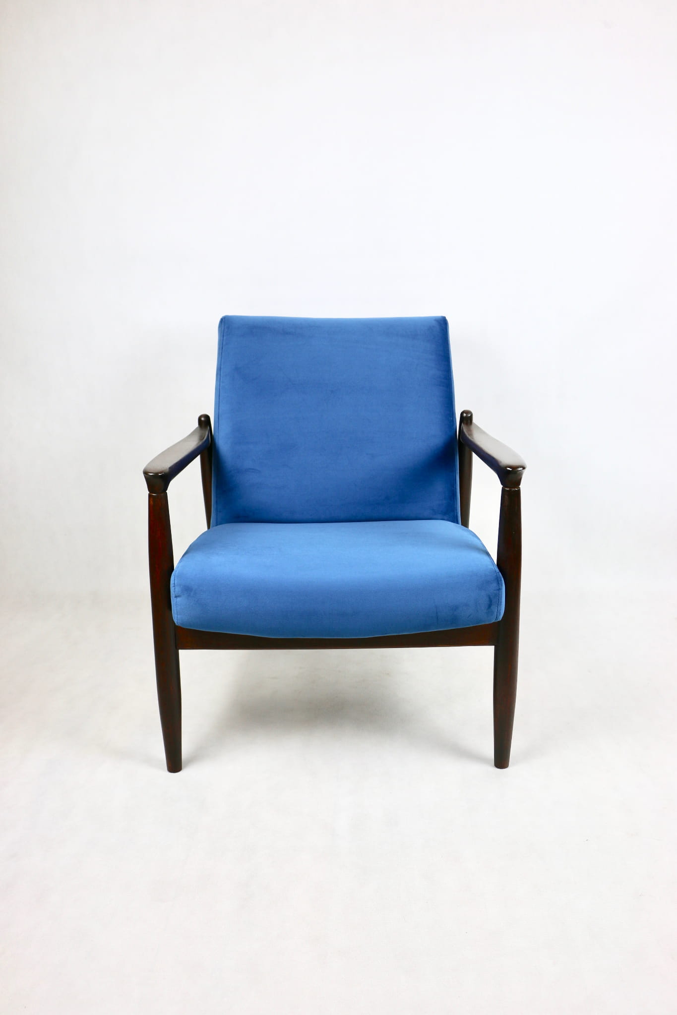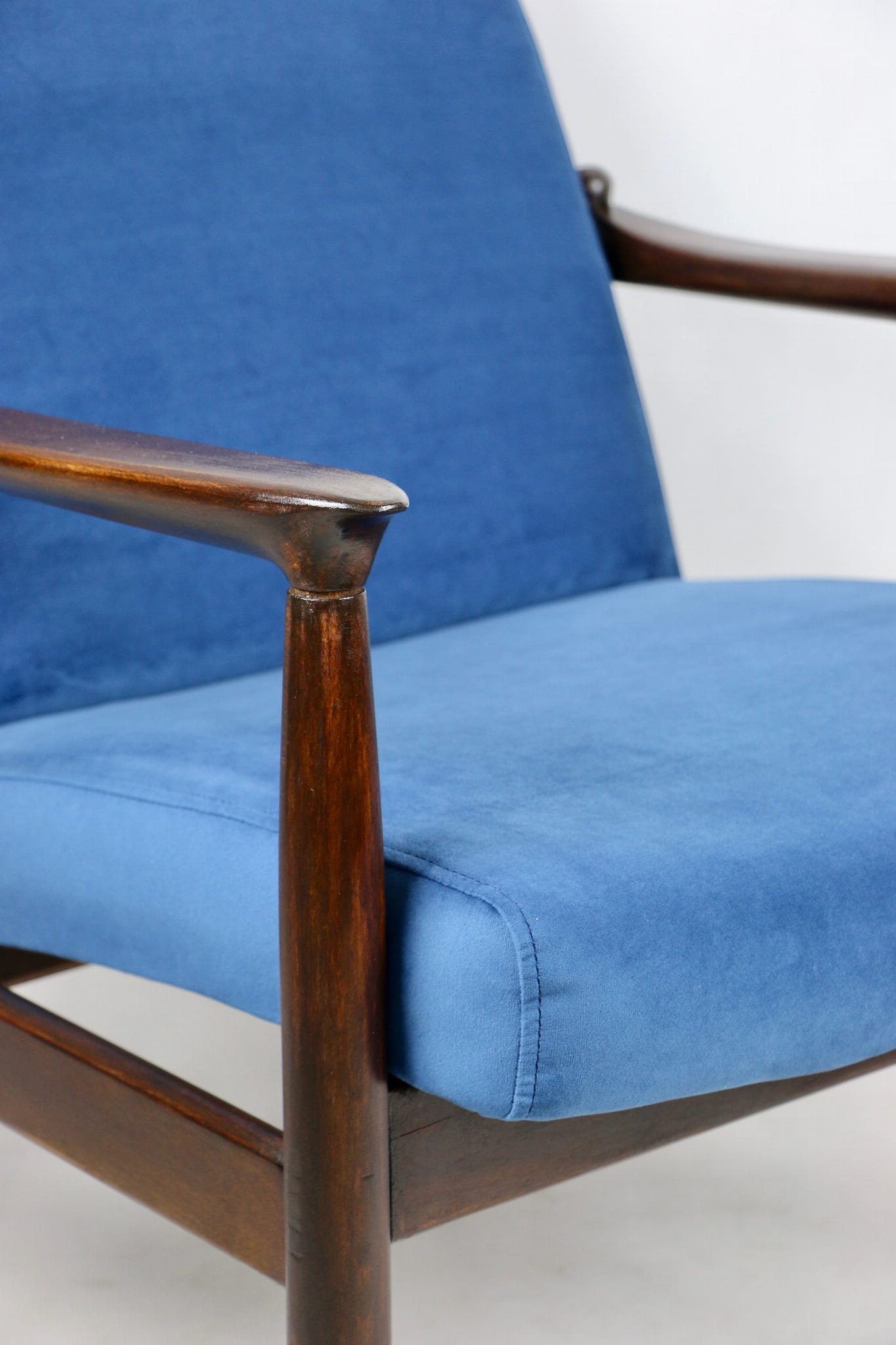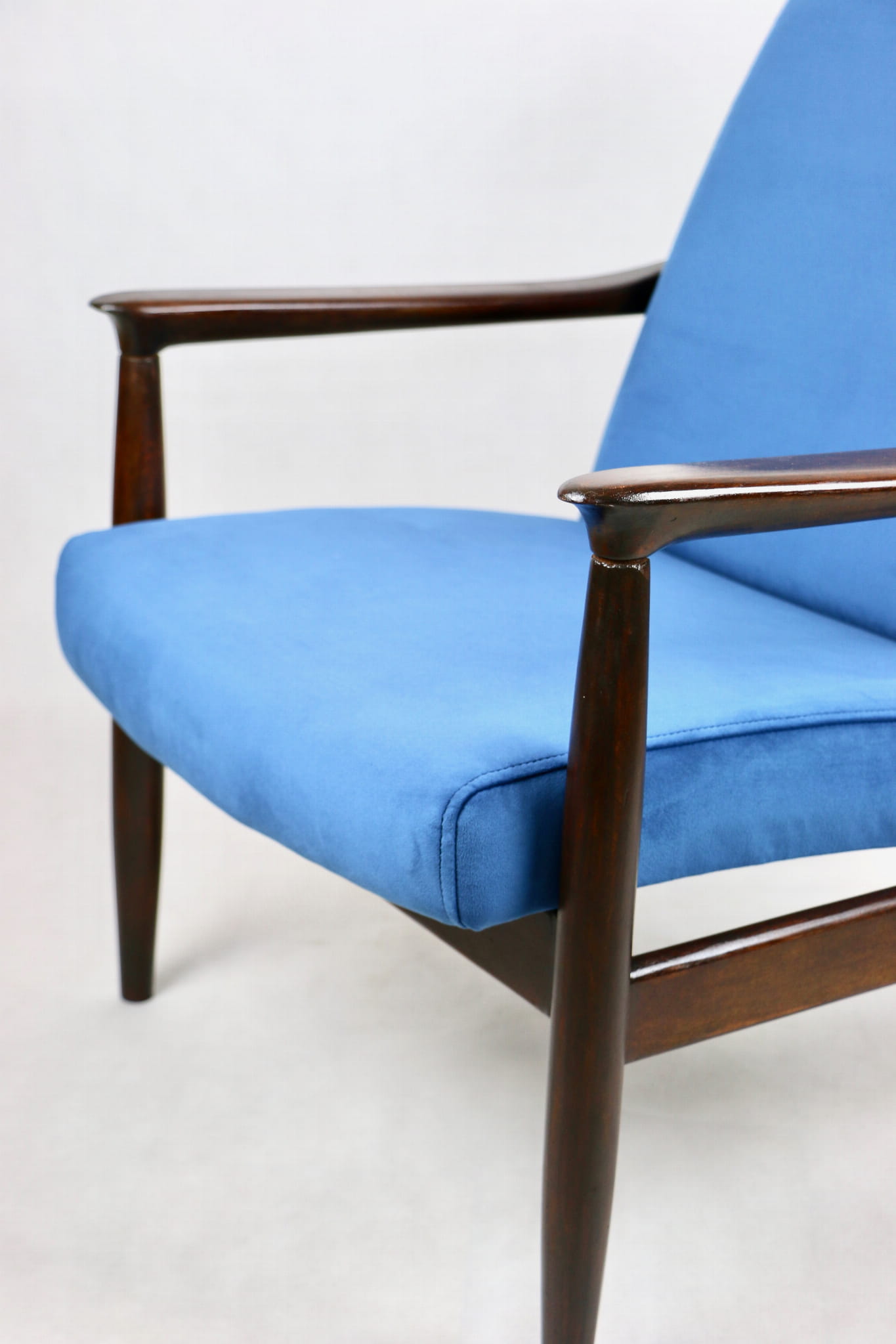 Fotel GFM - 64 zaprojektowany przez Edmunda Homa. Kompletnie odrestaurowane od podstaw. Nowa tapicerka wraz z wypełnieniem pokryta aksamitnym materiałem tapicerskim VELVET w kolorze niebieskim - morskim kolekcja Paris . Podparcia i nóżki drewniane, naturalne pokryte lakiero-woskiem w kolorze ciemnego drewna.