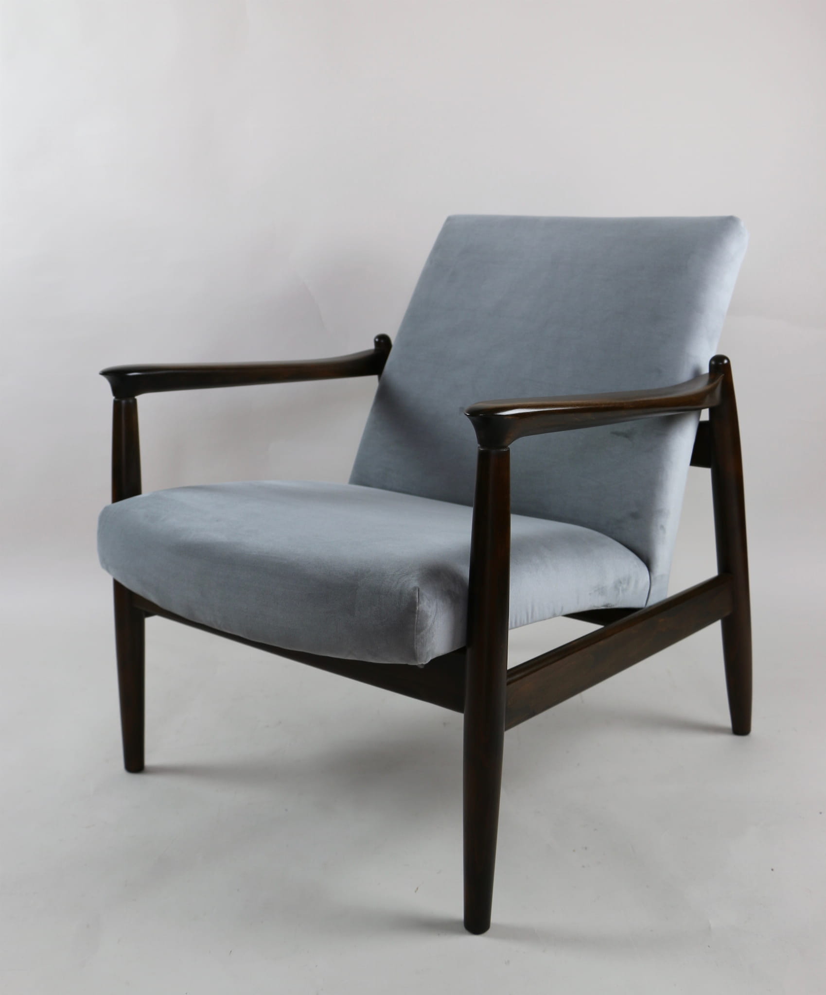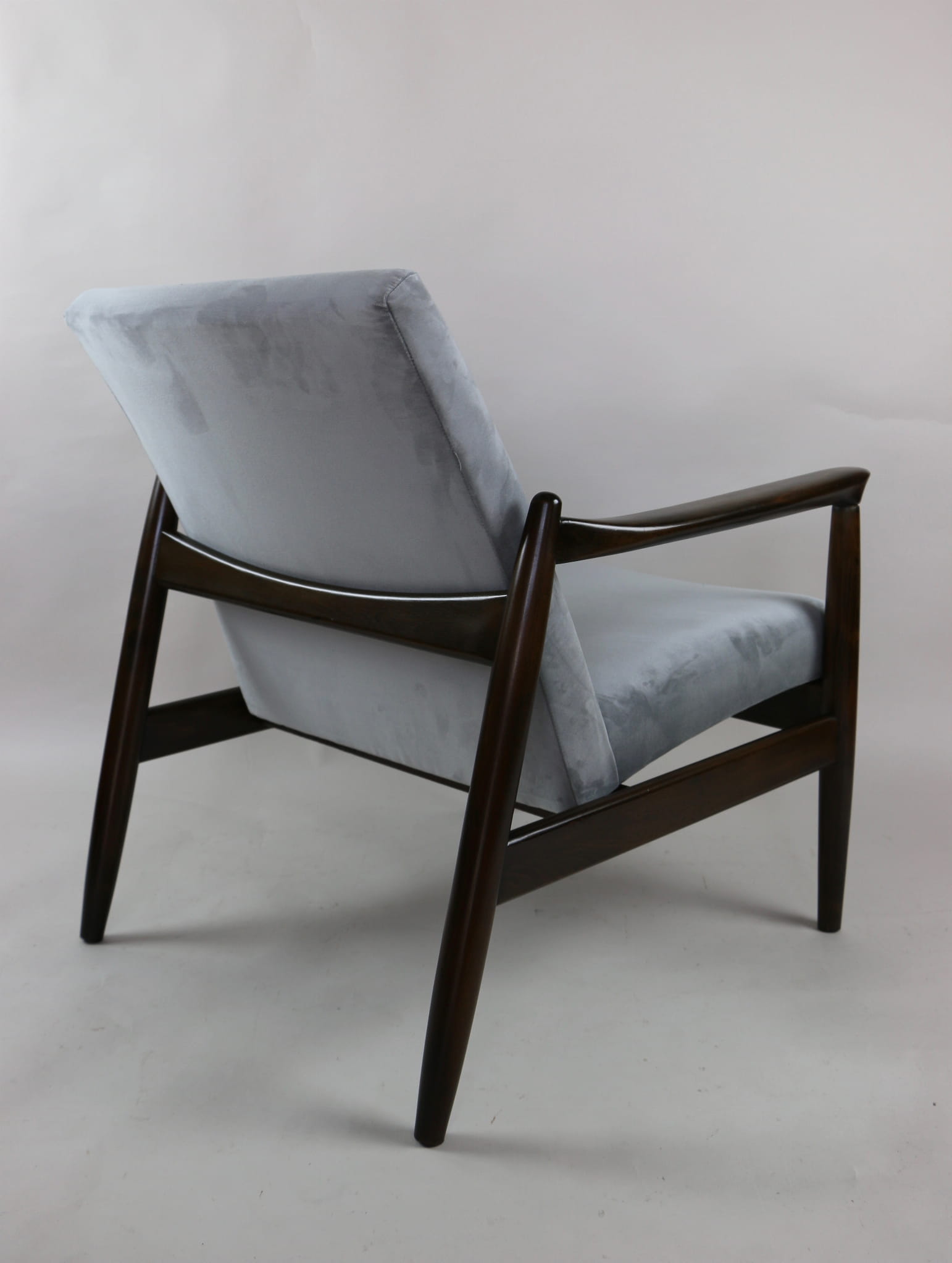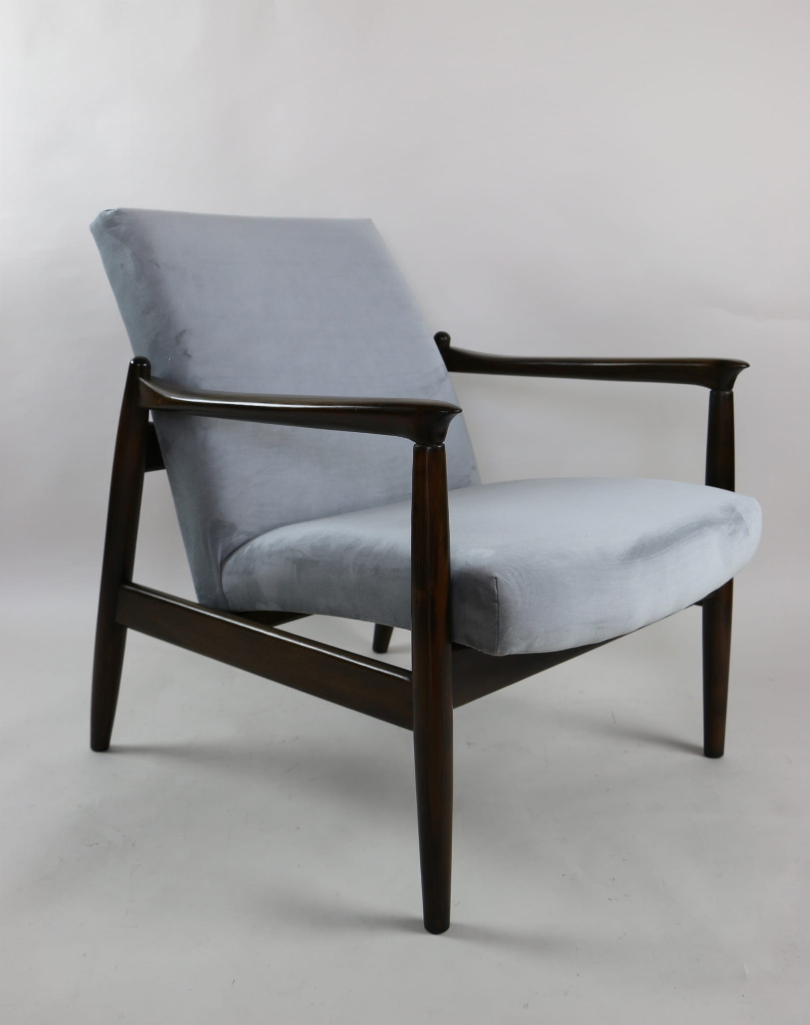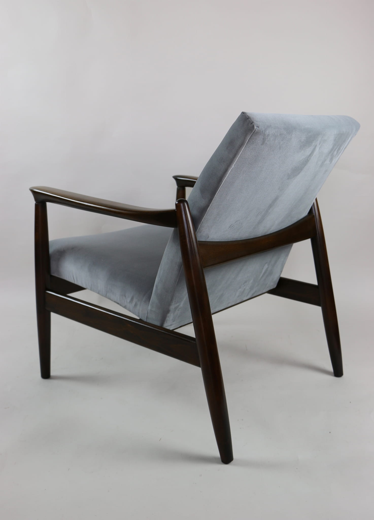 Fotel GFM - 64 zaprojektowany przez Edmunda Homę. Kompletnie odrestaurowane - nowa tapicerka wraz z wypełnieniem została pokryta aksamitnym materiałem tapicerskim VELVET w kolorze srebrnym - jasno szarym. Podparcia i nóżki drewniane, naturalne pokryte lakierem w kolorze ciemnego drewna zostały kompletnie odtworzone.