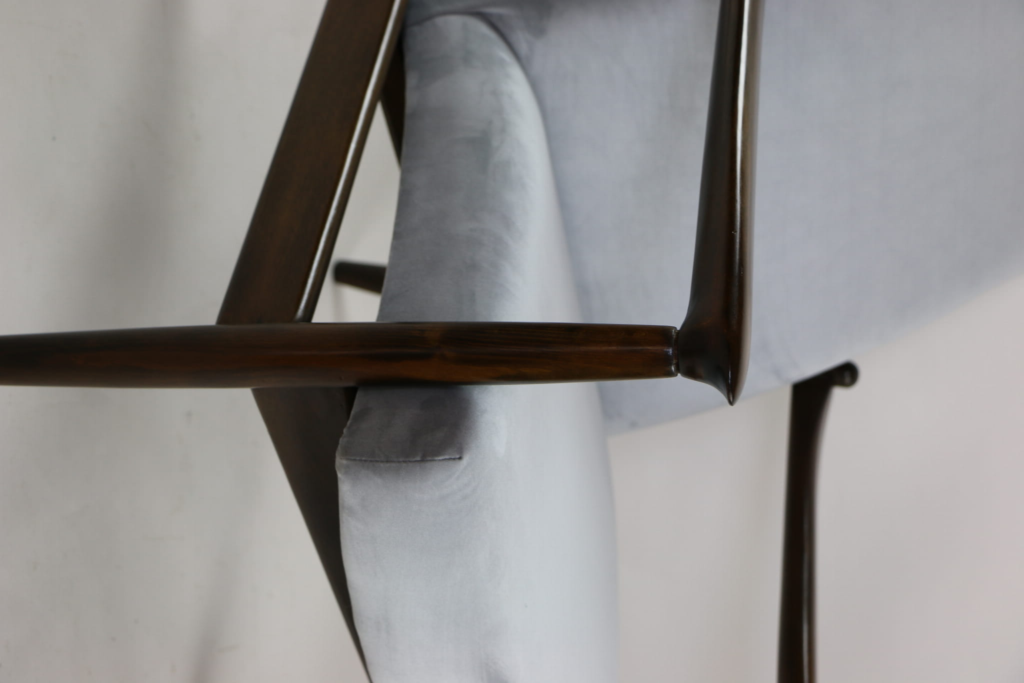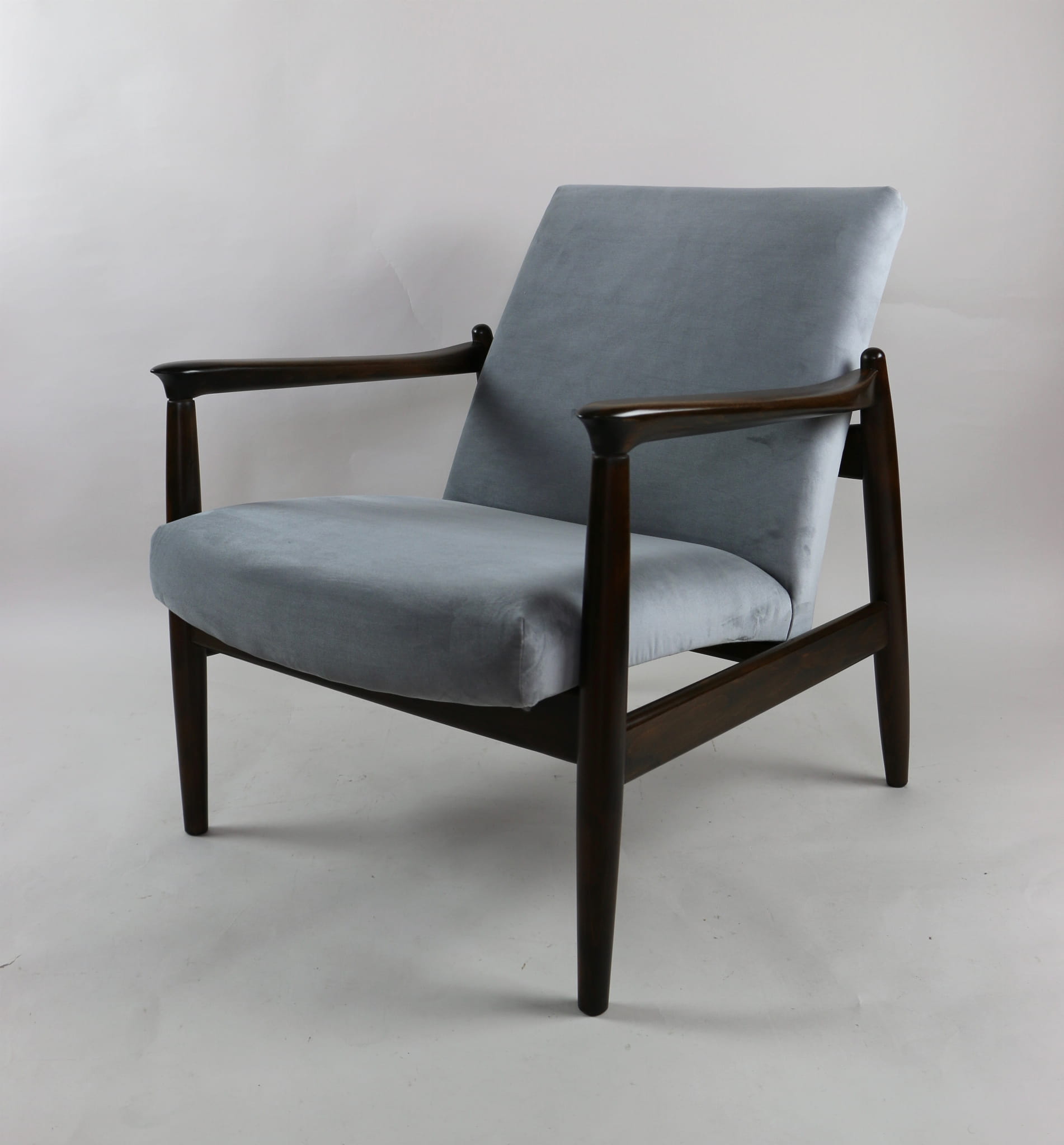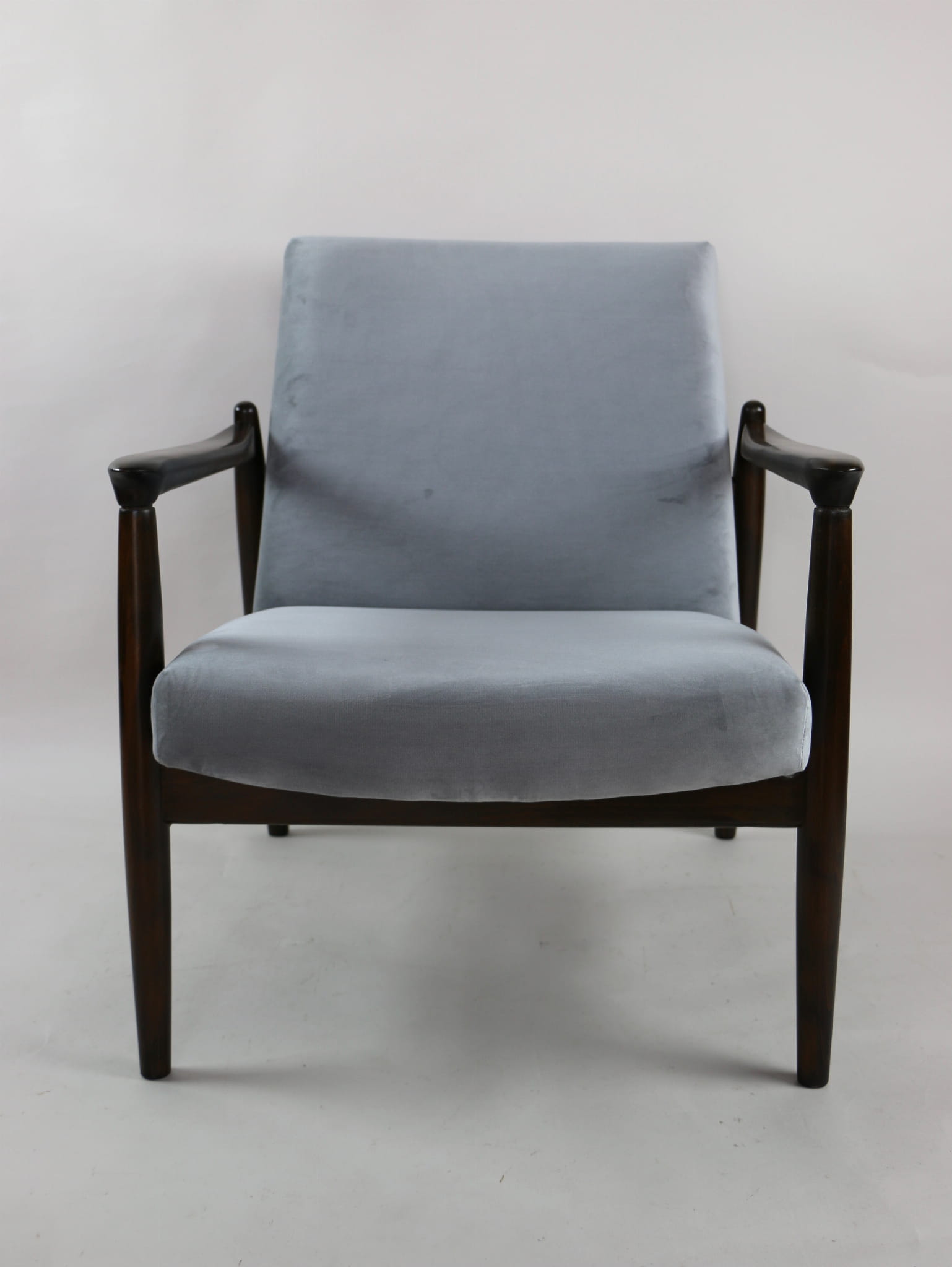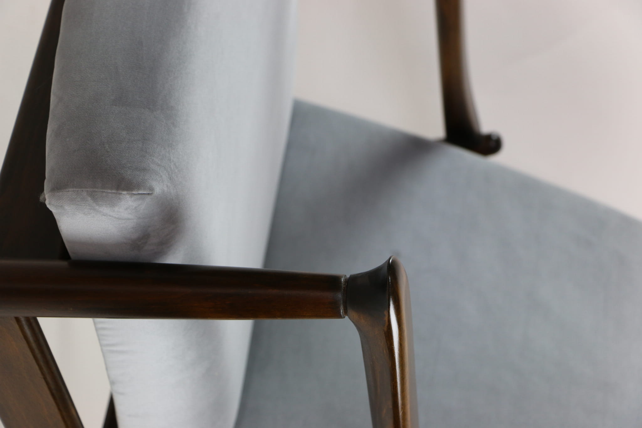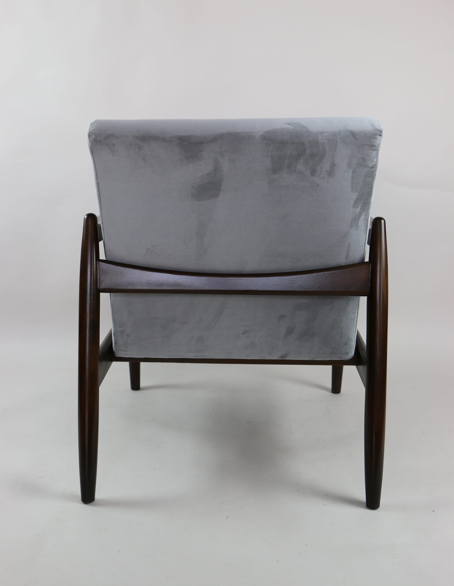 Fotel GFM - 64 zaprojektowany przez Edmunda Homę. Kompletnie odrestaurowane - nowa tapicerka wraz z wypełnieniem została pokryta aksamitnym materiałem tapicerskim VELVET w kolorze srebrnym - jasno szarym. Podparcia i nóżki drewniane, naturalne pokryte lakierem w kolorze ciemnego drewna zostały kompletnie odtworzone.