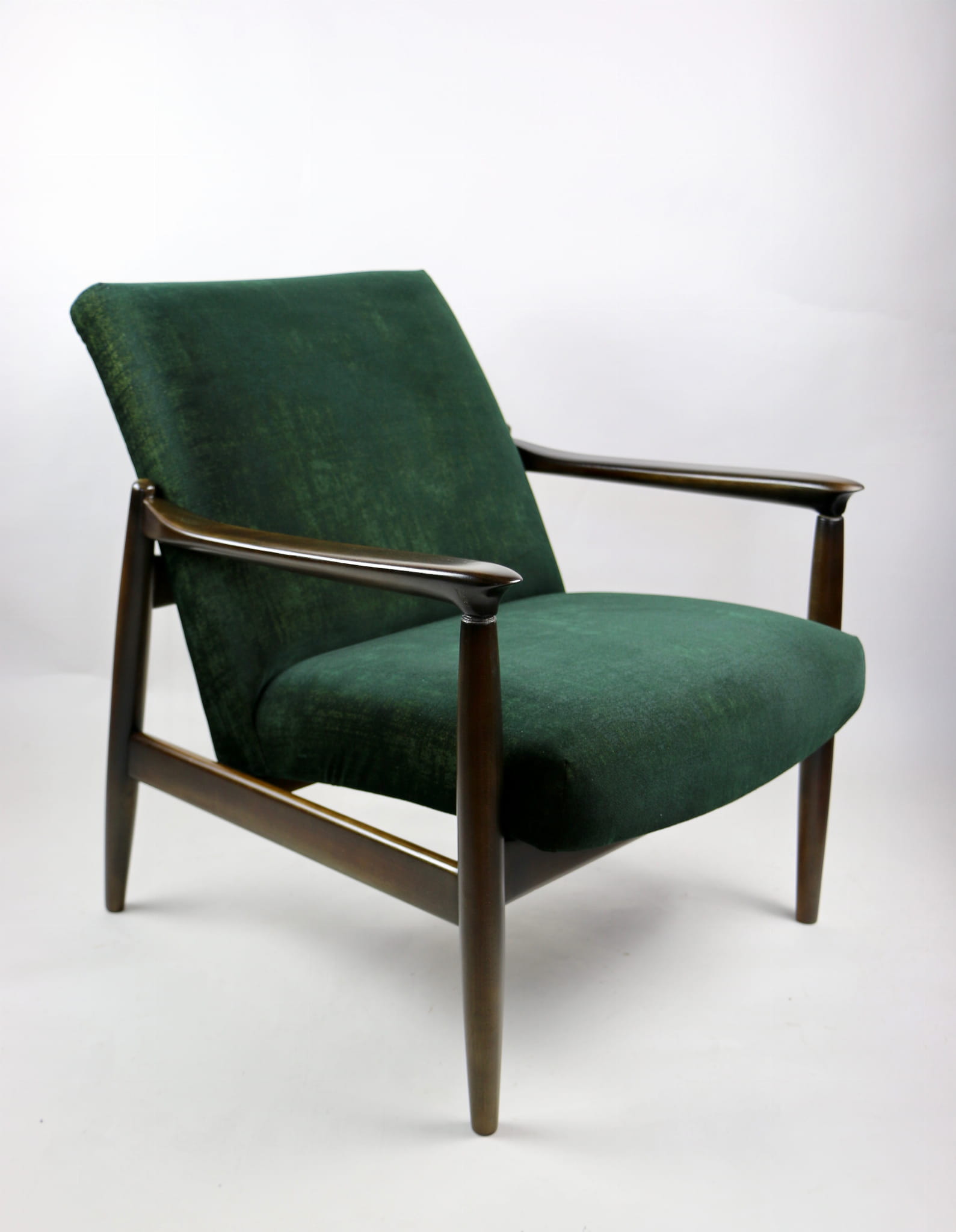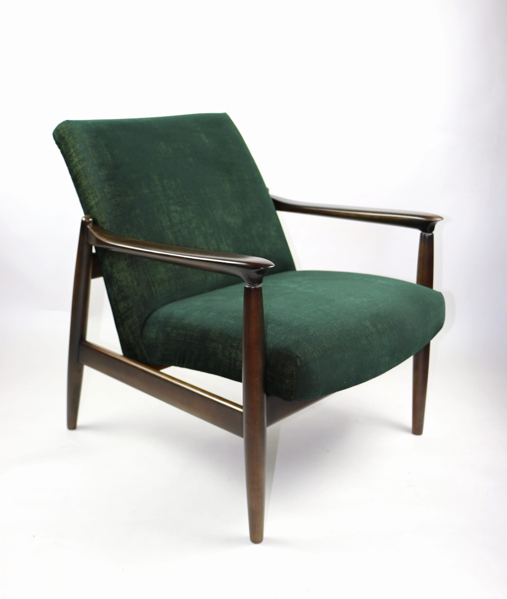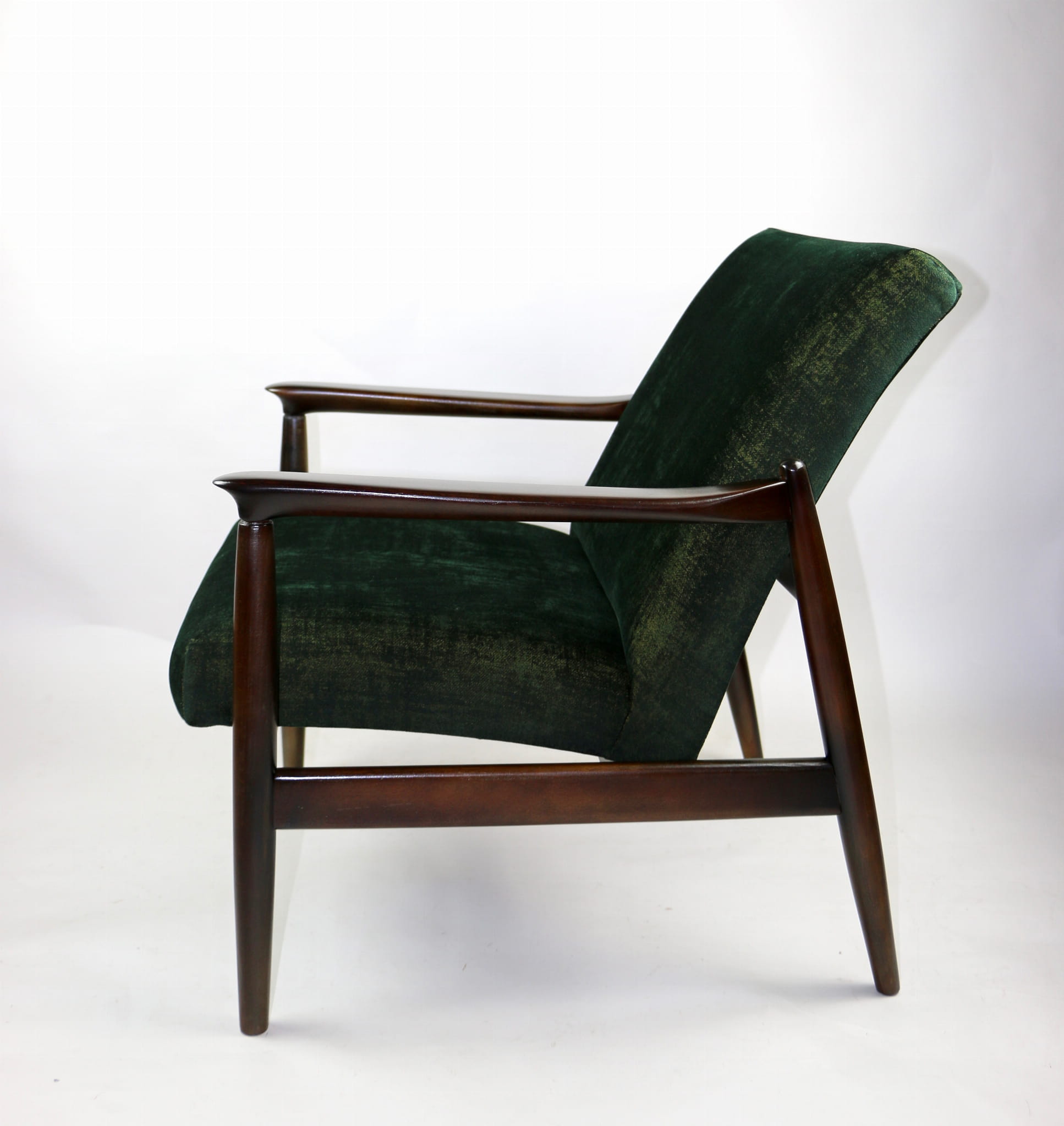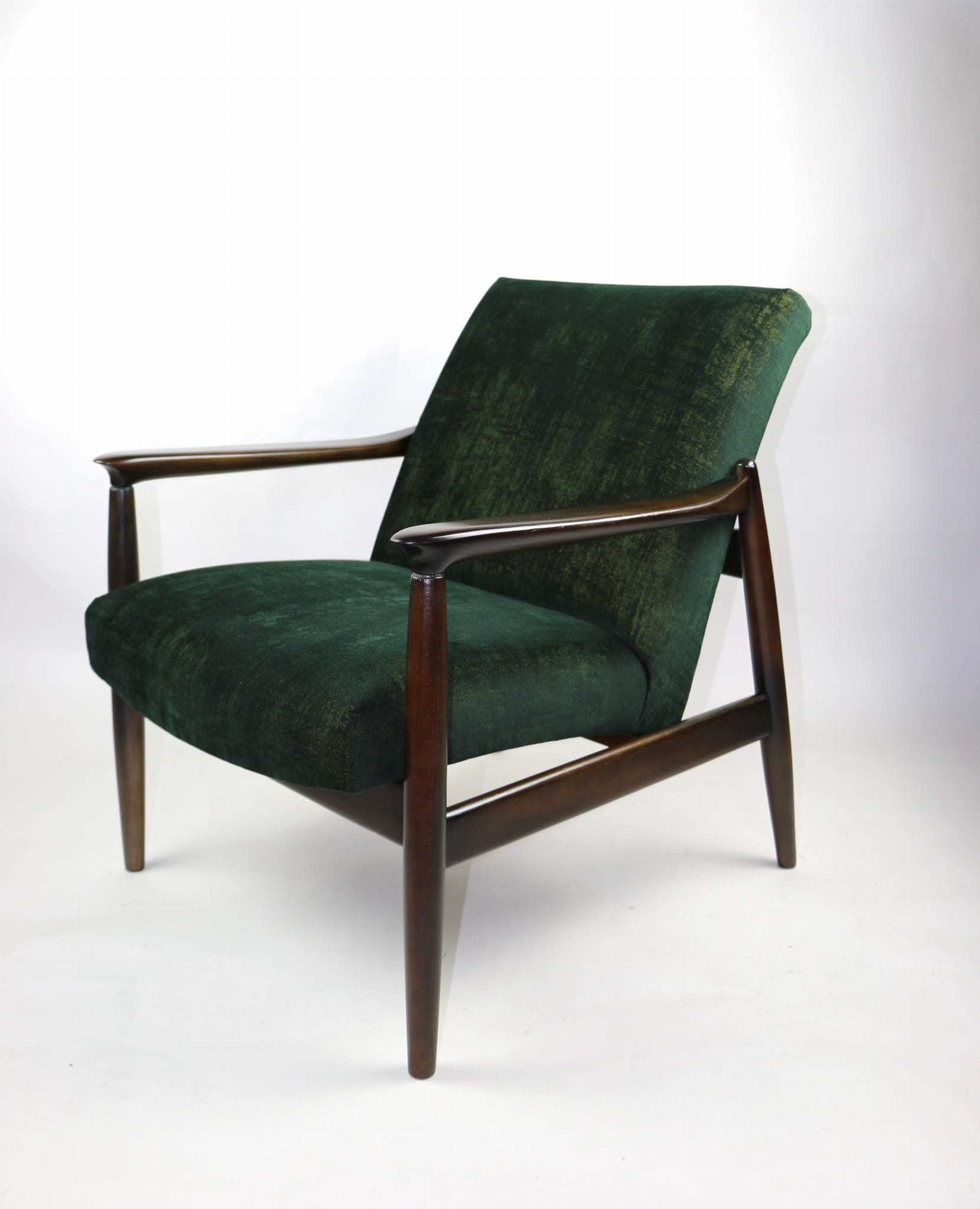 Fotel GFM - 64 zaprojektowany przez Edmunda Homa w latach 70-tych. Kompletnie odrestaurowany - nowa tapicerka wraz z wypełnieniem została pokryta aksamitnym materiałem tapicerskim zielono -złotym z serii Chameleon. Podparcia i nóżki drewniane, pokryte lakierem w połysku w kolorze ciemnego drewna.