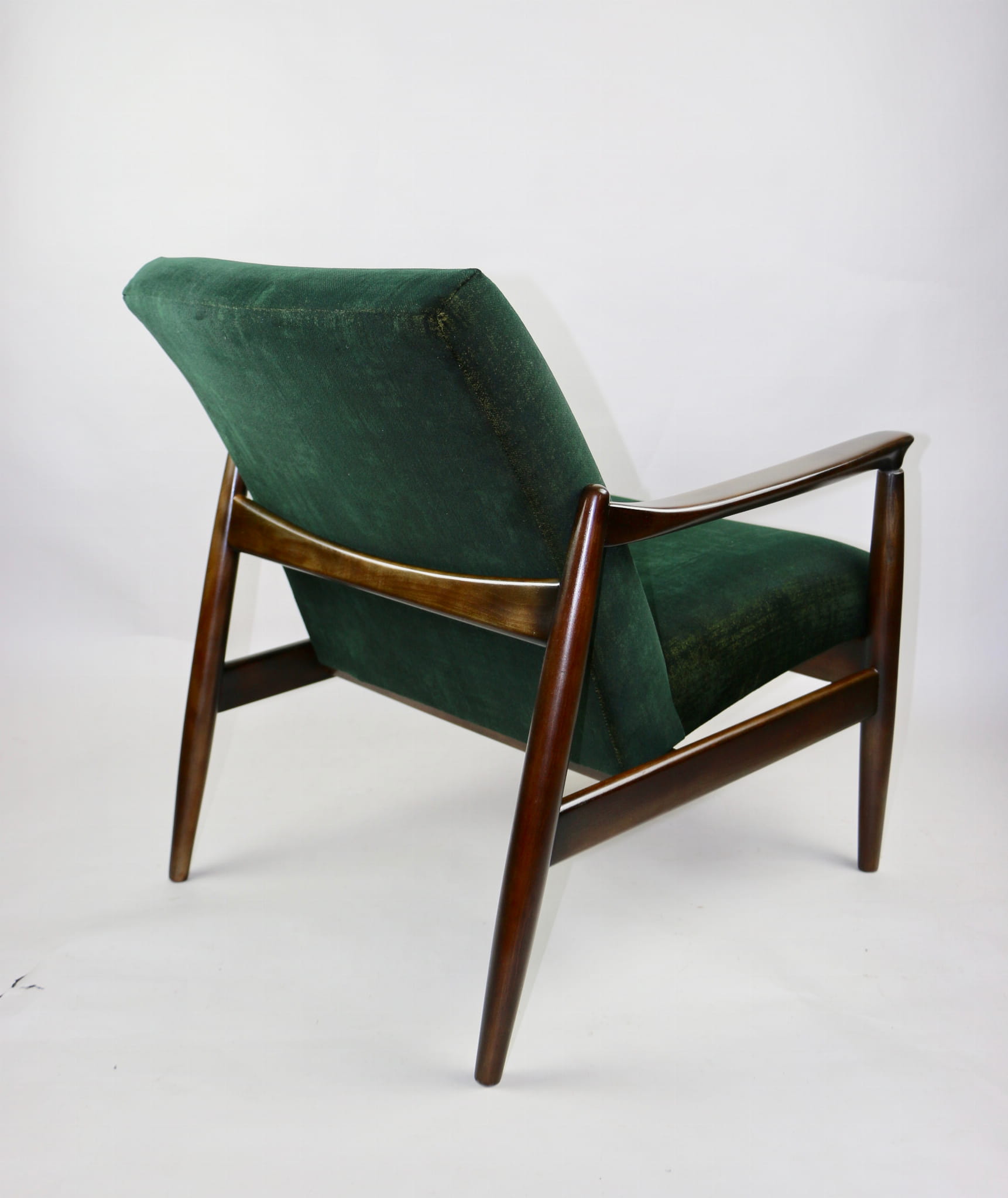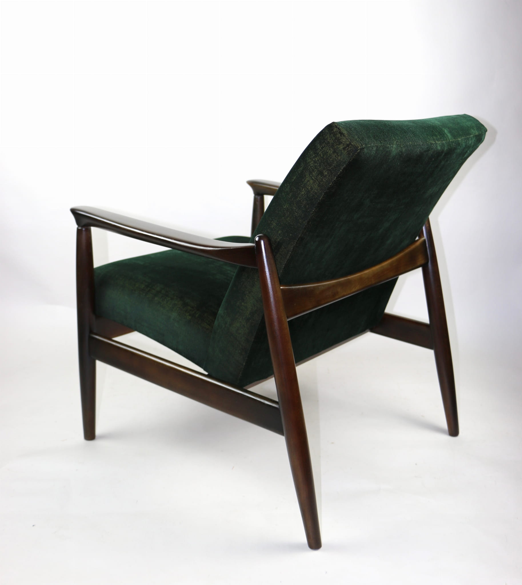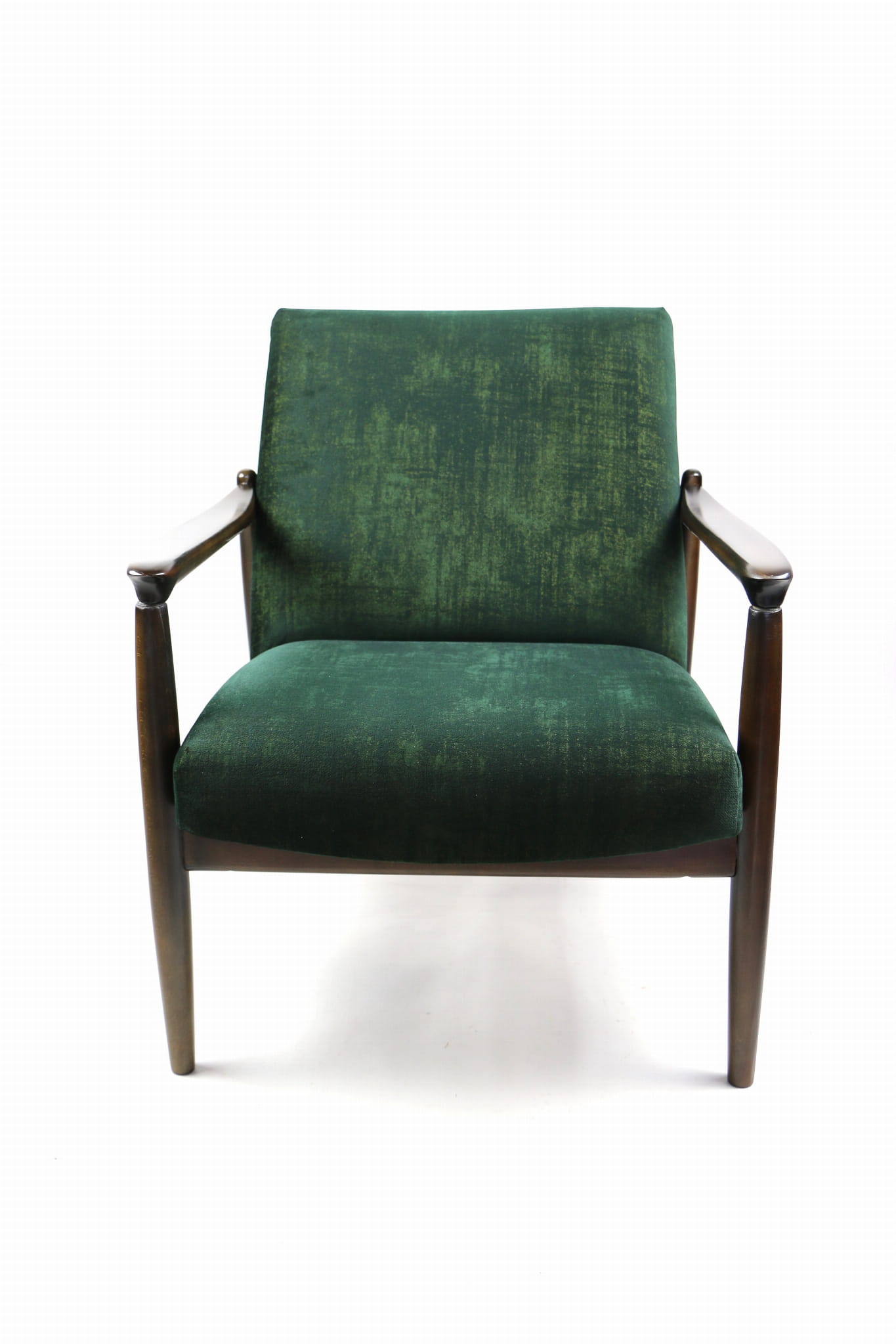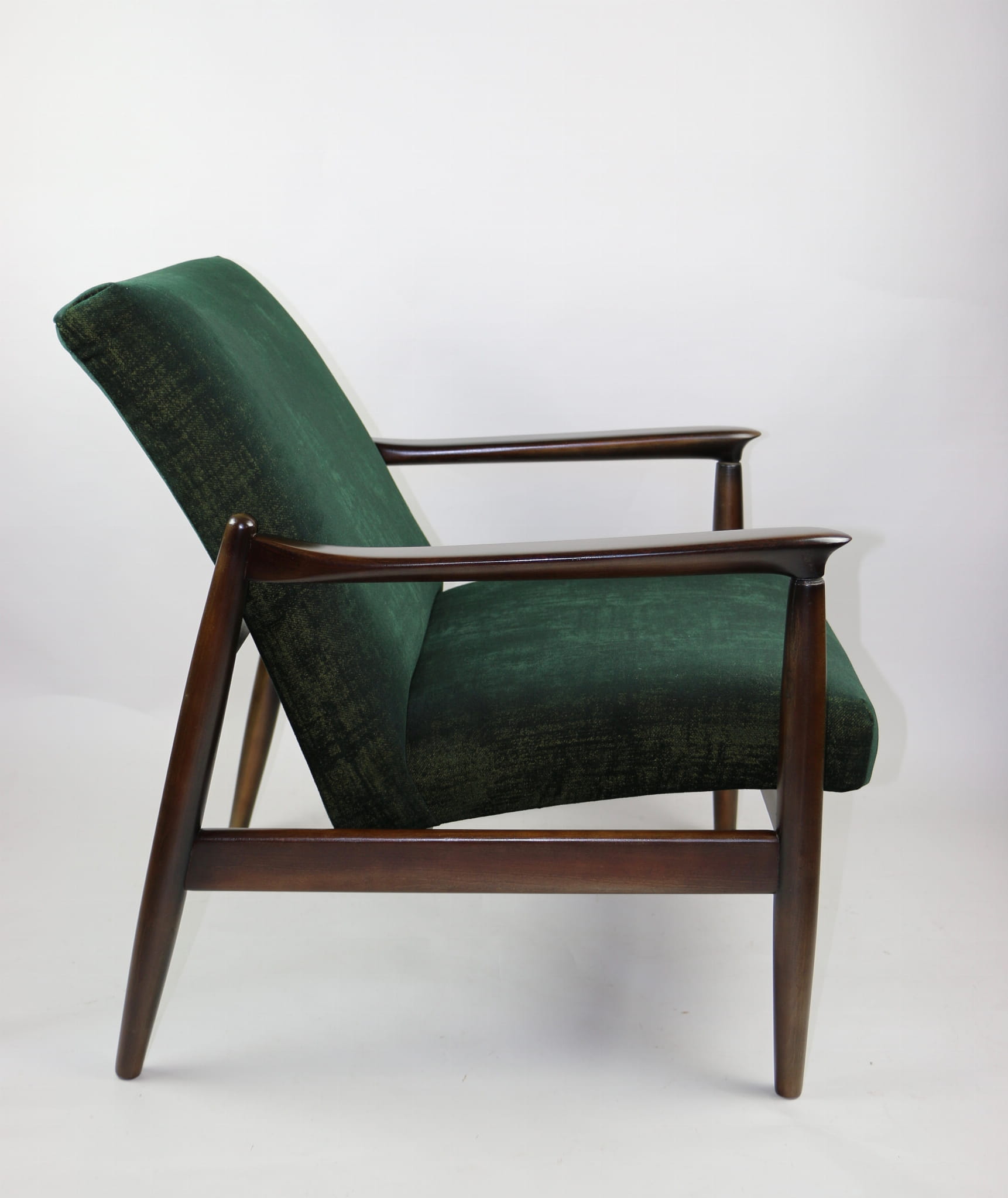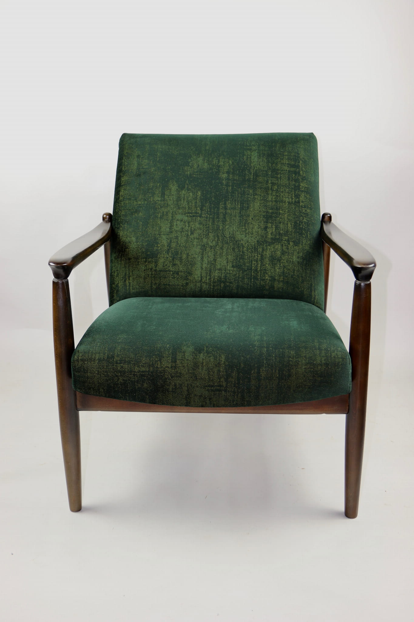 Fotel GFM - 64 zaprojektowany przez Edmunda Homa w latach 70-tych. Kompletnie odrestaurowany - nowa tapicerka wraz z wypełnieniem została pokryta aksamitnym materiałem tapicerskim zielono -złotym z serii Chameleon. Podparcia i nóżki drewniane, pokryte lakierem w połysku w kolorze ciemnego drewna.