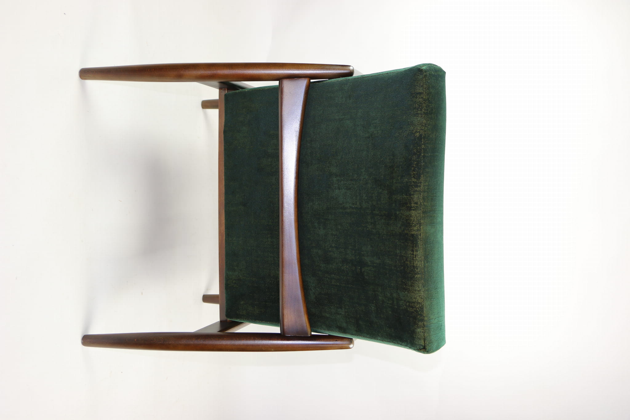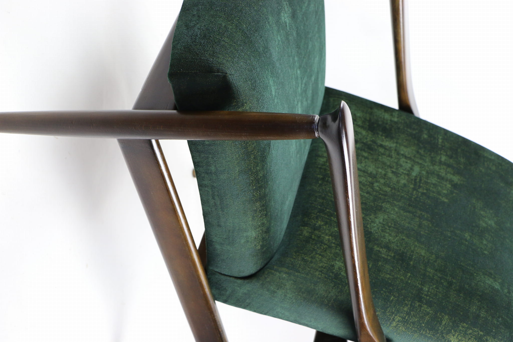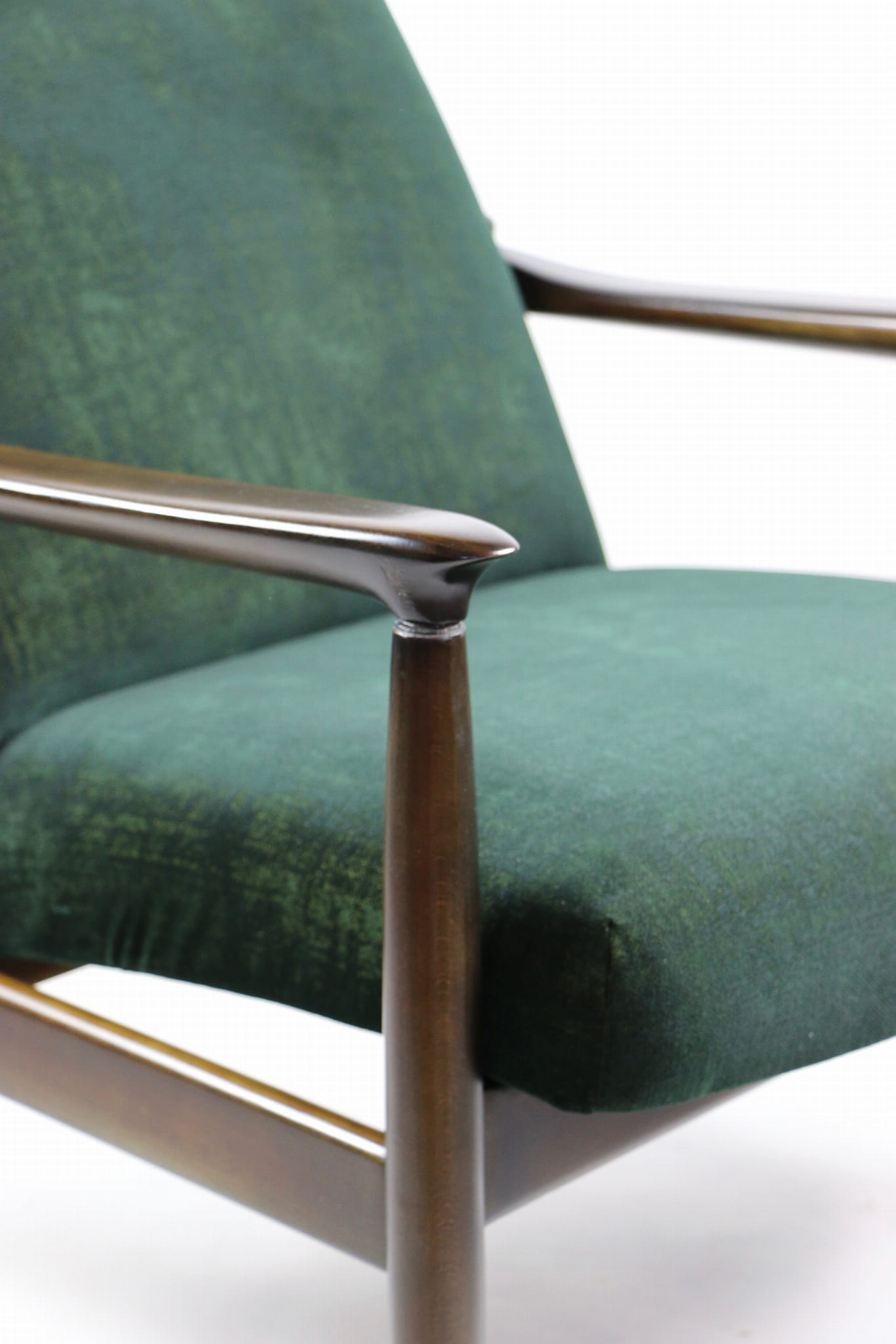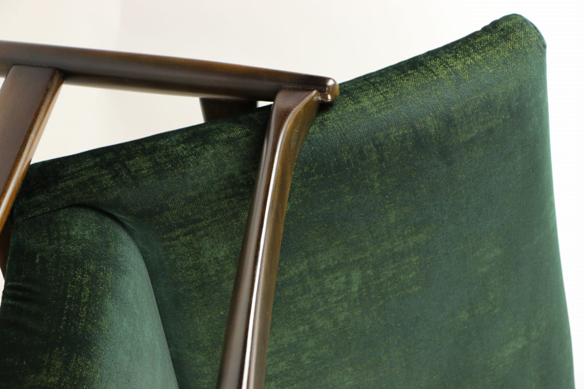 Fotel GFM - 64 zaprojektowany przez Edmunda Homa w latach 70-tych. Kompletnie odrestaurowany - nowa tapicerka wraz z wypełnieniem została pokryta aksamitnym materiałem tapicerskim zielono -złotym z serii Chameleon. Podparcia i nóżki drewniane, pokryte lakierem w połysku w kolorze ciemnego drewna.