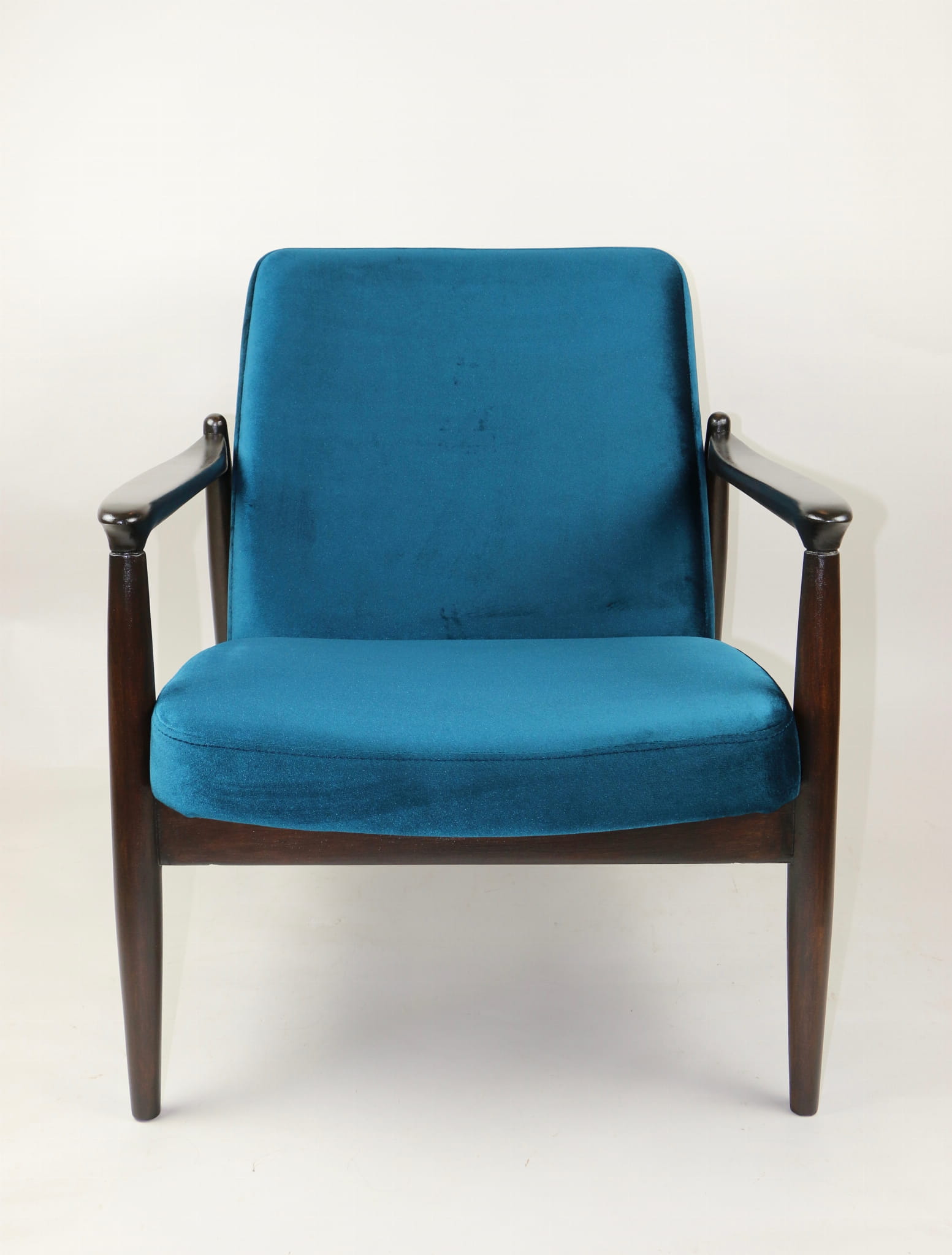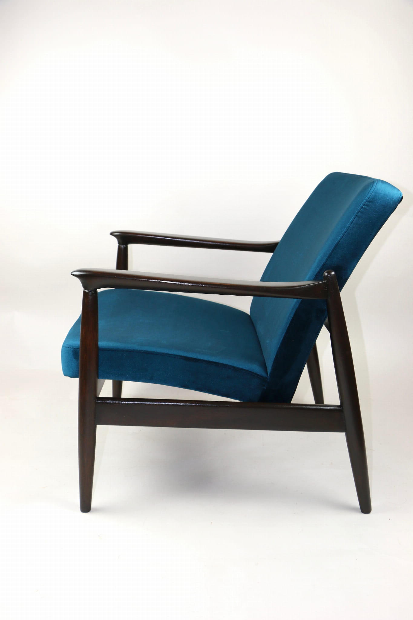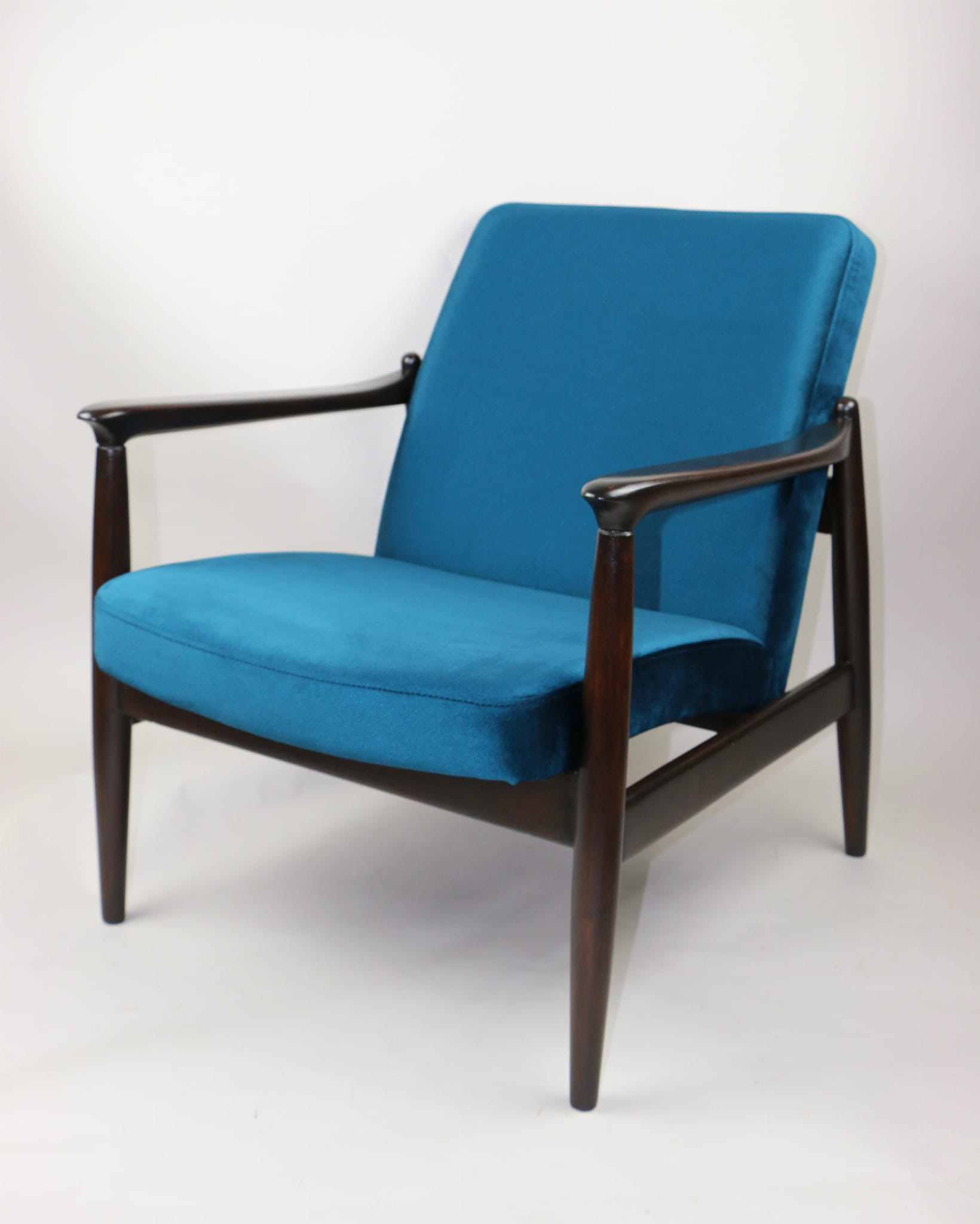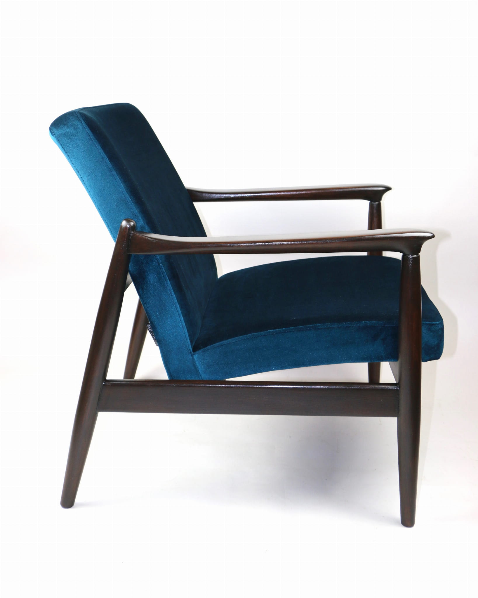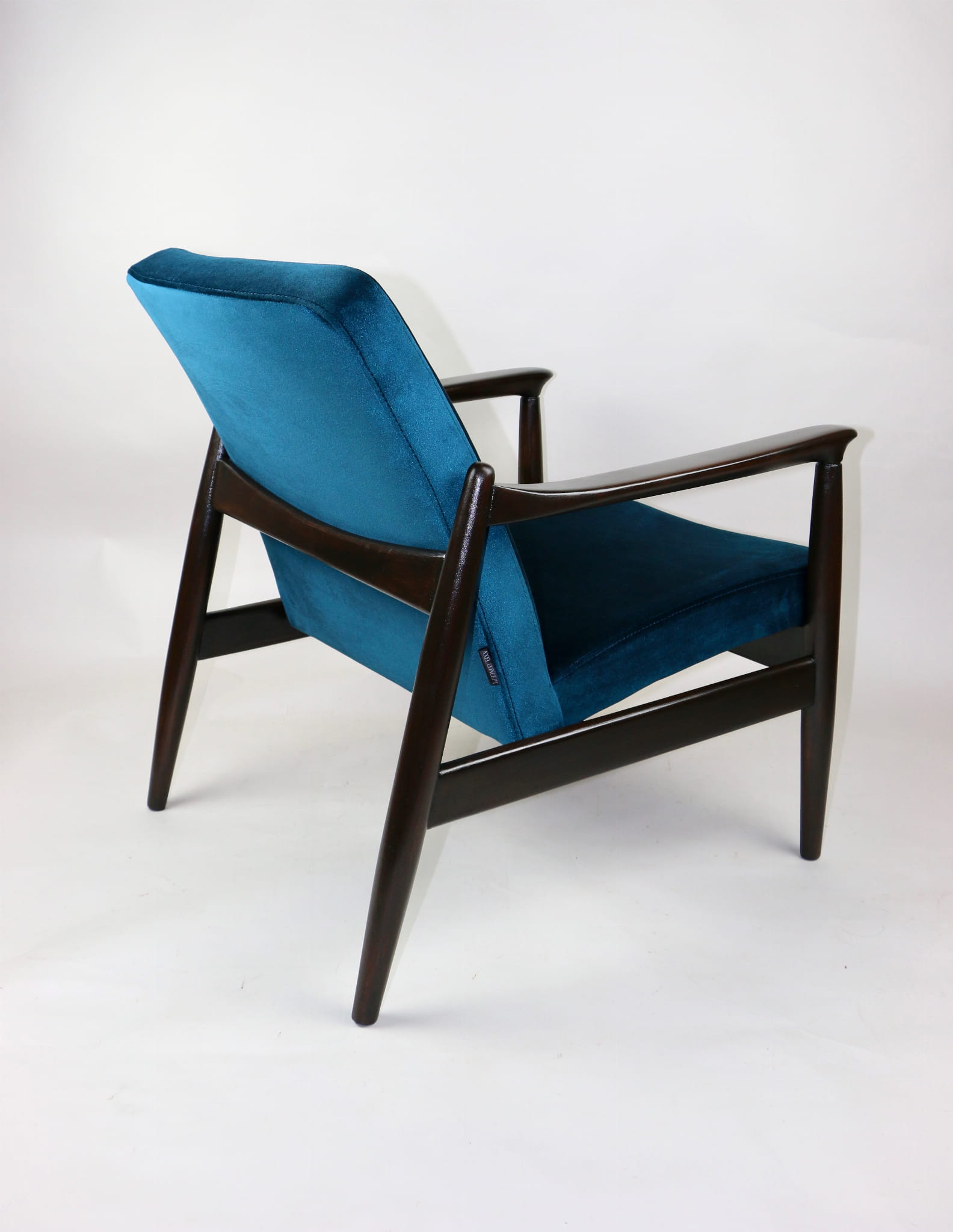 Fotel GFM - 64 zaprojektowany przez Edmunda Homę. Kompletnie odrestaurowany - nowa tapicerka wraz z wypełnieniem została pokryta aksamitnym materiałem tapicerskim VELVET w kolorze zieleni morskiej. Podparcia i nóżki drewniane, naturalne pokryte lakierem w kolorze ciemnego drewna.