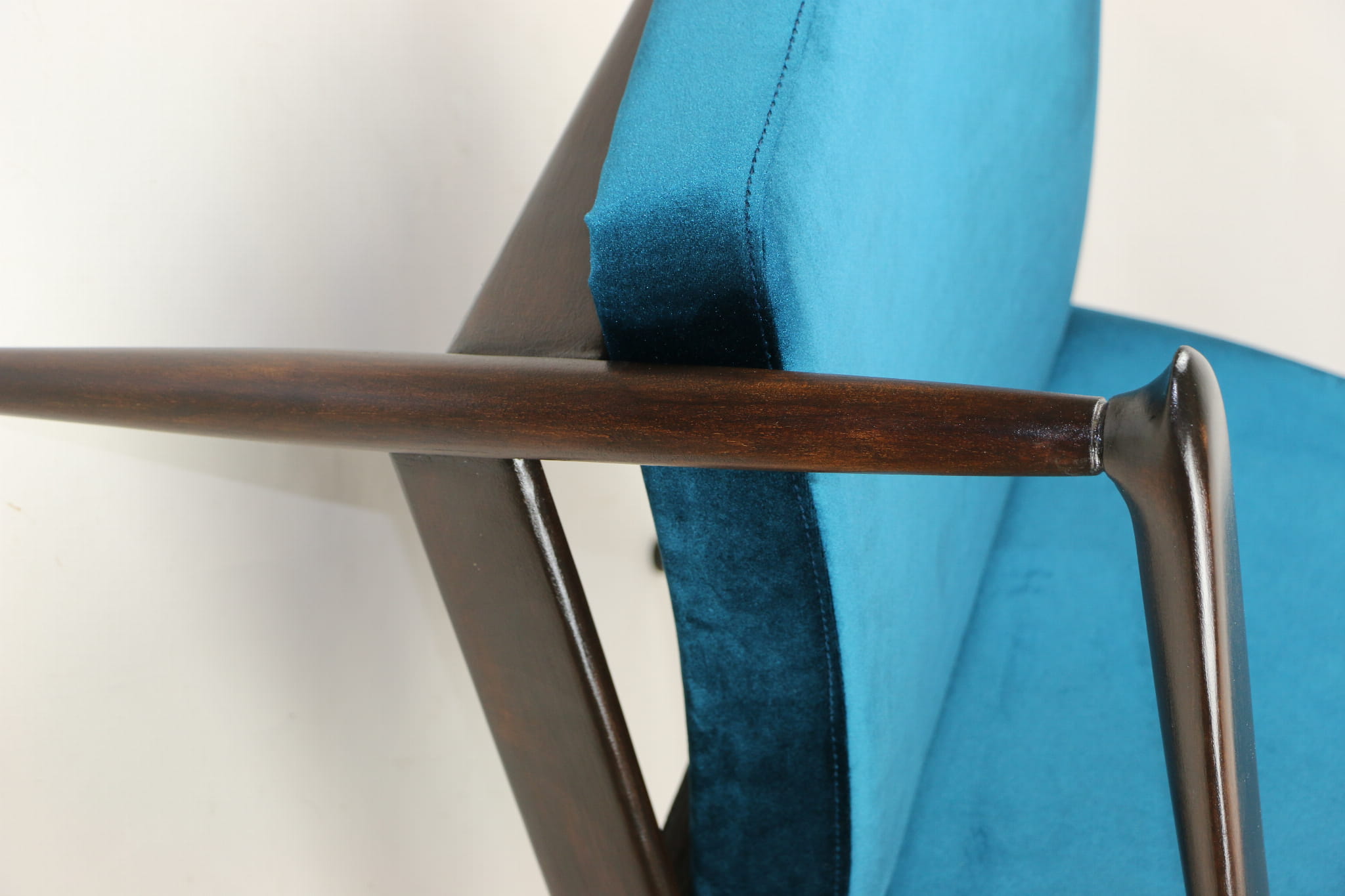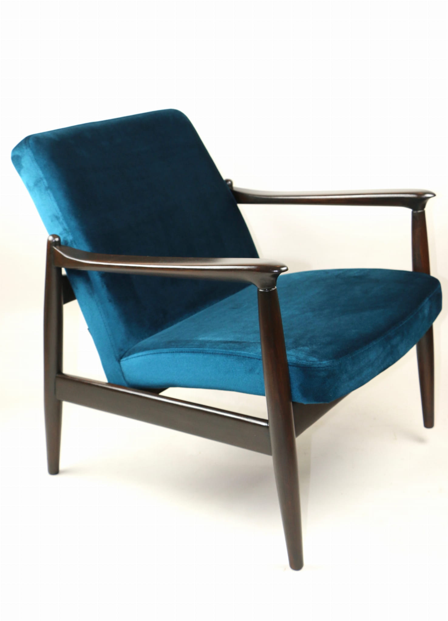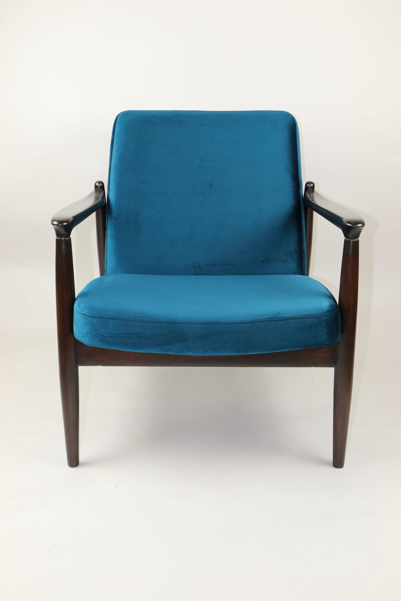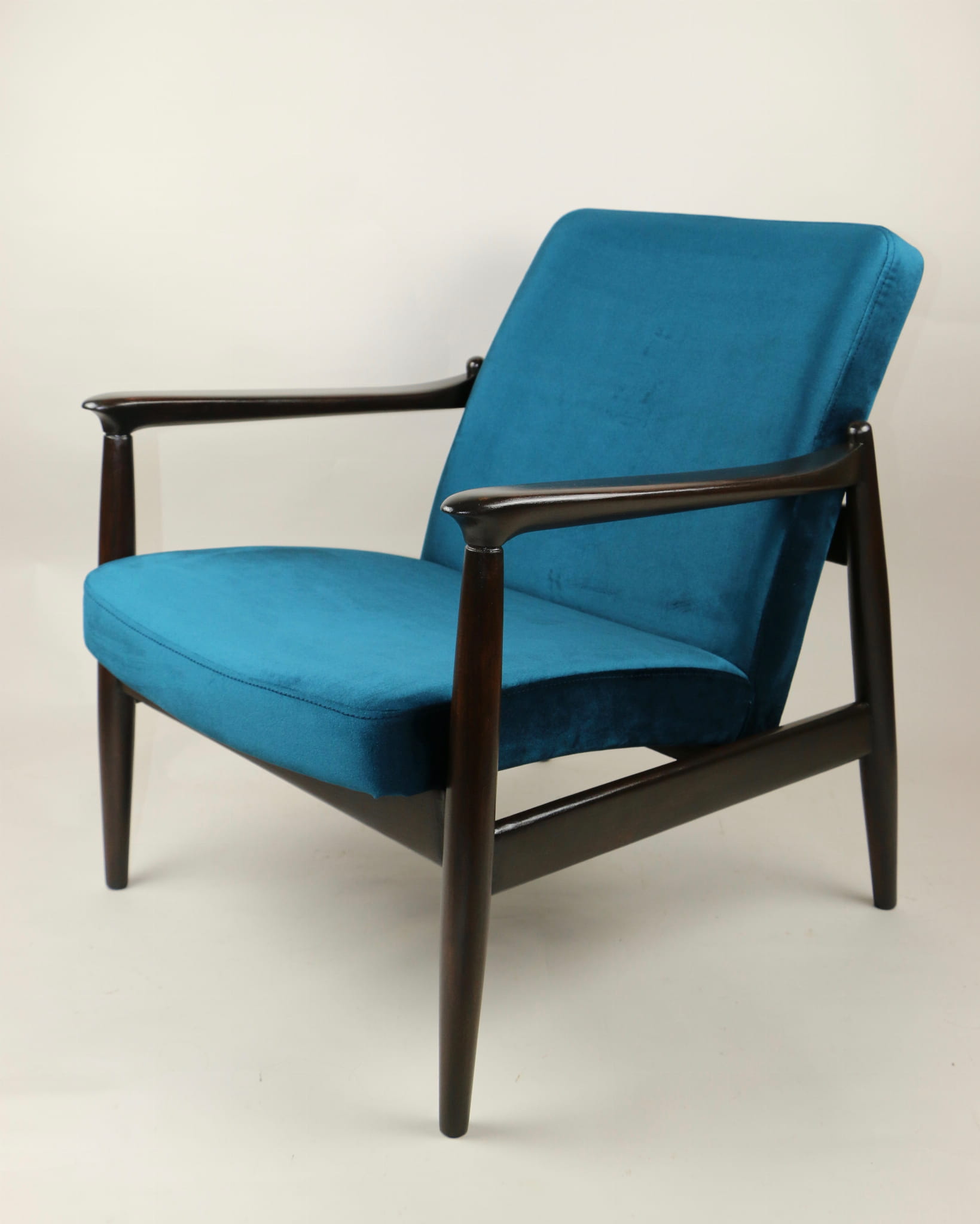 Fotel GFM - 64 zaprojektowany przez Edmunda Homę. Kompletnie odrestaurowany - nowa tapicerka wraz z wypełnieniem została pokryta aksamitnym materiałem tapicerskim VELVET w kolorze zieleni morskiej. Podparcia i nóżki drewniane, naturalne pokryte lakierem w kolorze ciemnego drewna.
