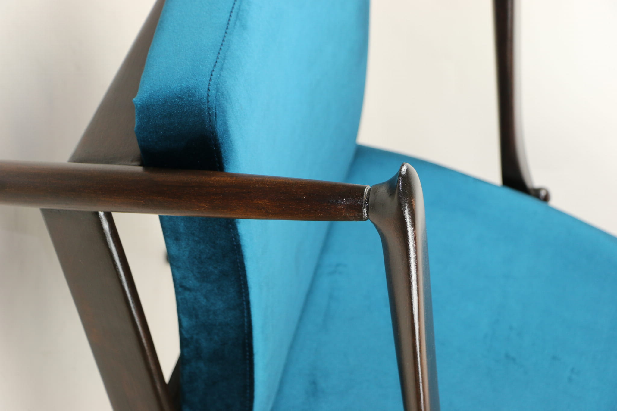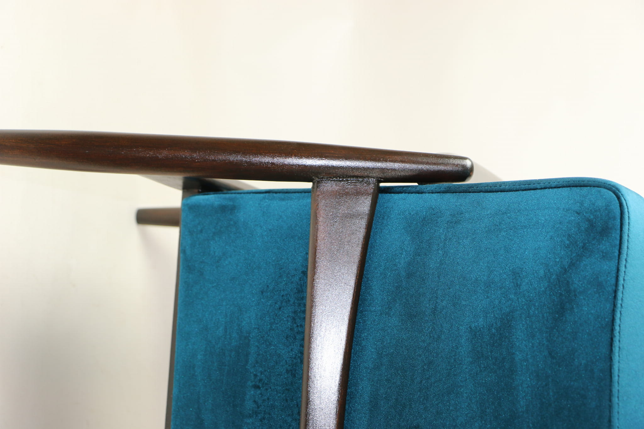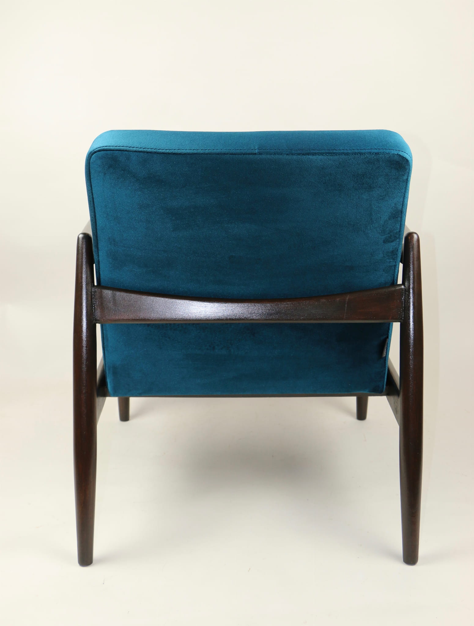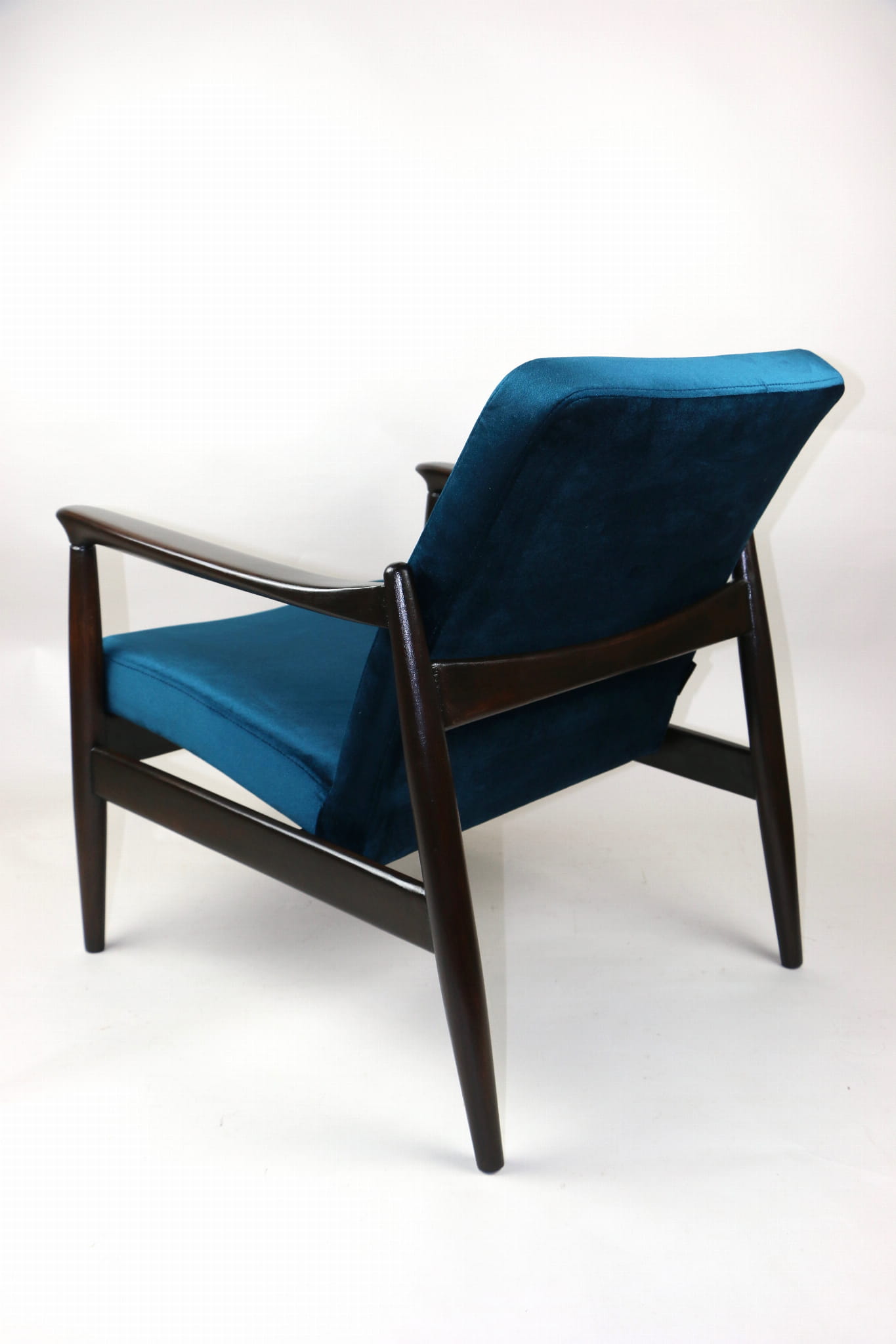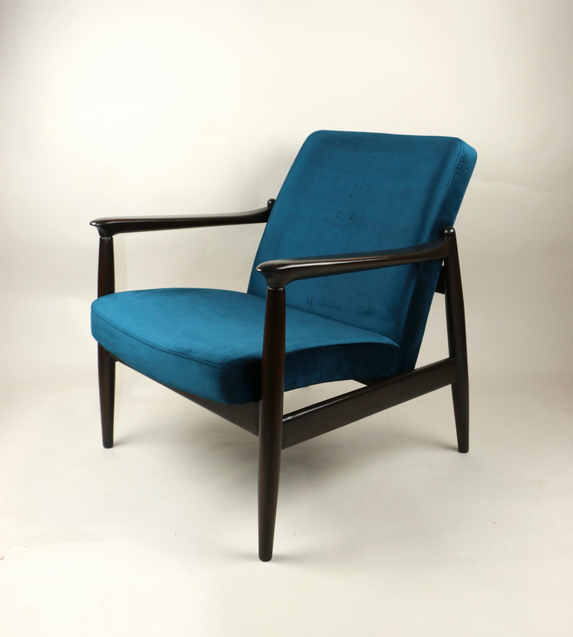 Fotel GFM - 64 zaprojektowany przez Edmunda Homę. Kompletnie odrestaurowany - nowa tapicerka wraz z wypełnieniem została pokryta aksamitnym materiałem tapicerskim VELVET w kolorze zieleni morskiej. Podparcia i nóżki drewniane, naturalne pokryte lakierem w kolorze ciemnego drewna.