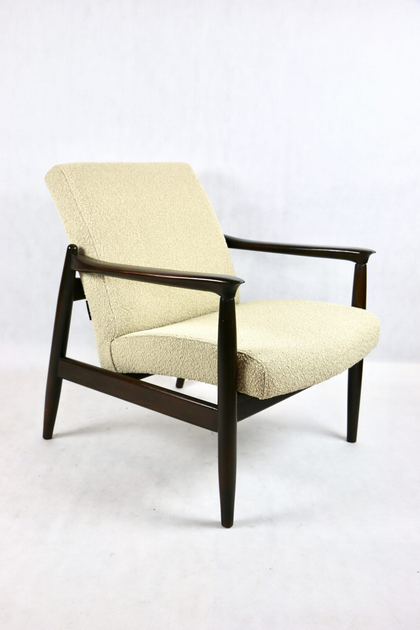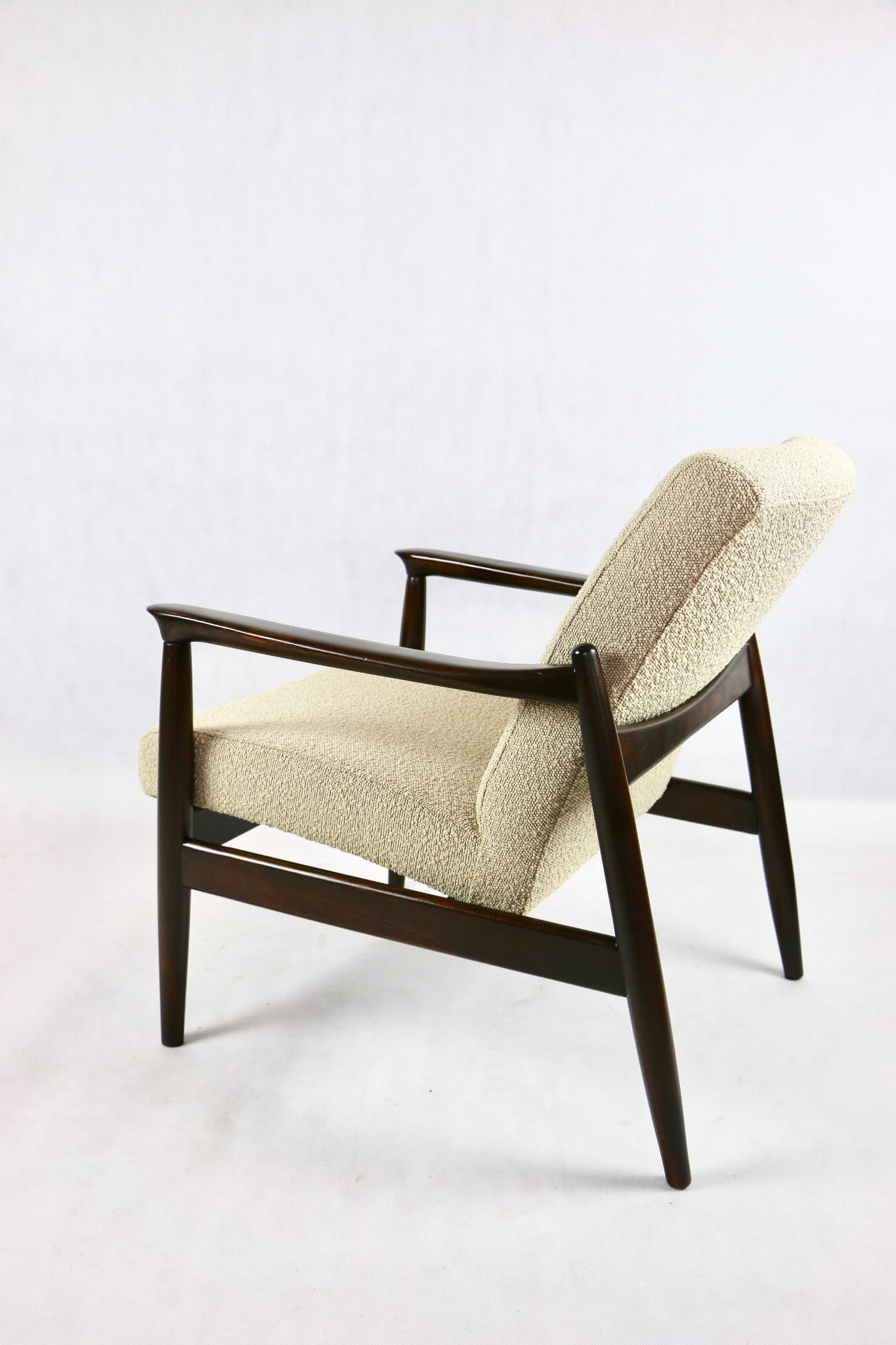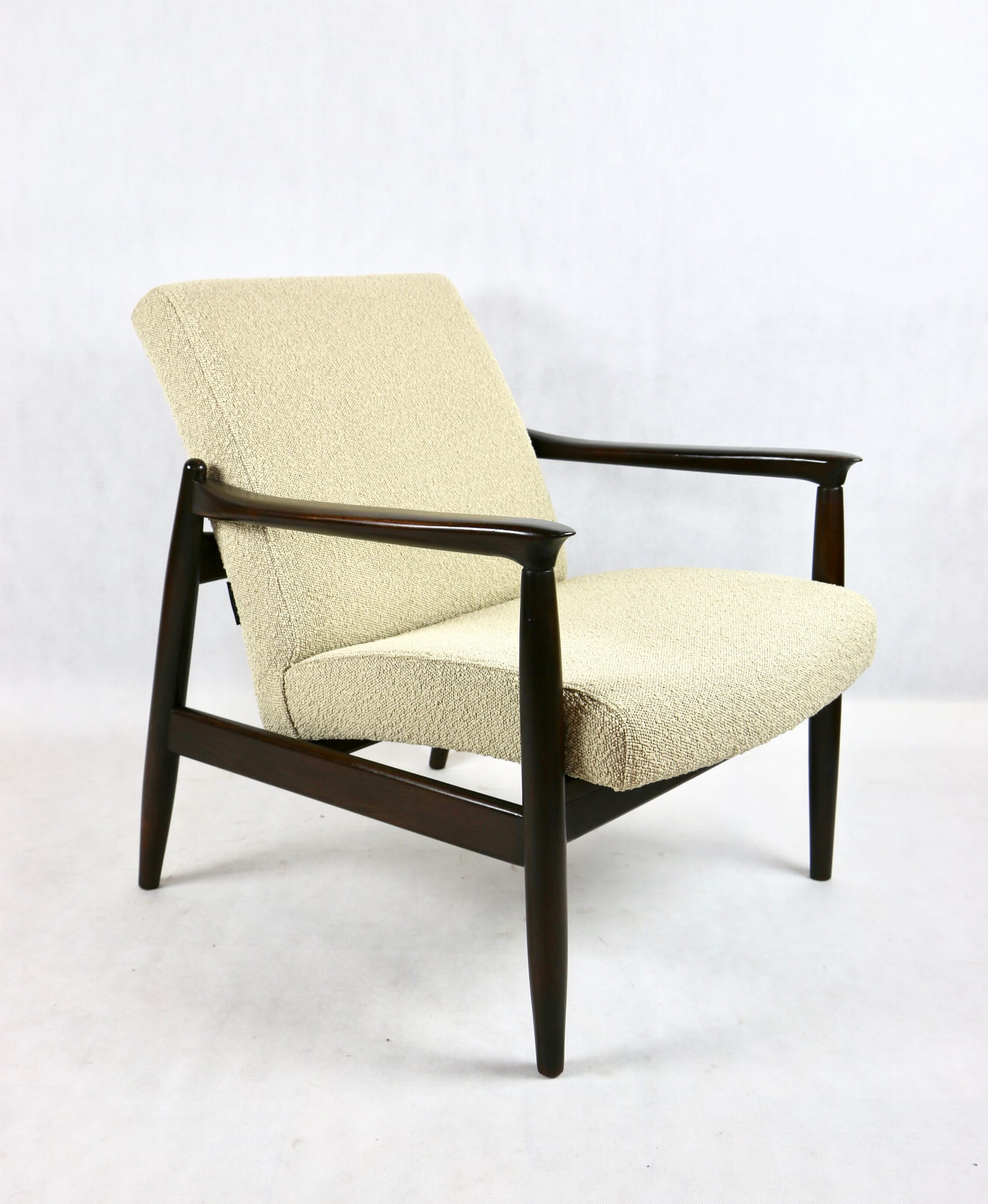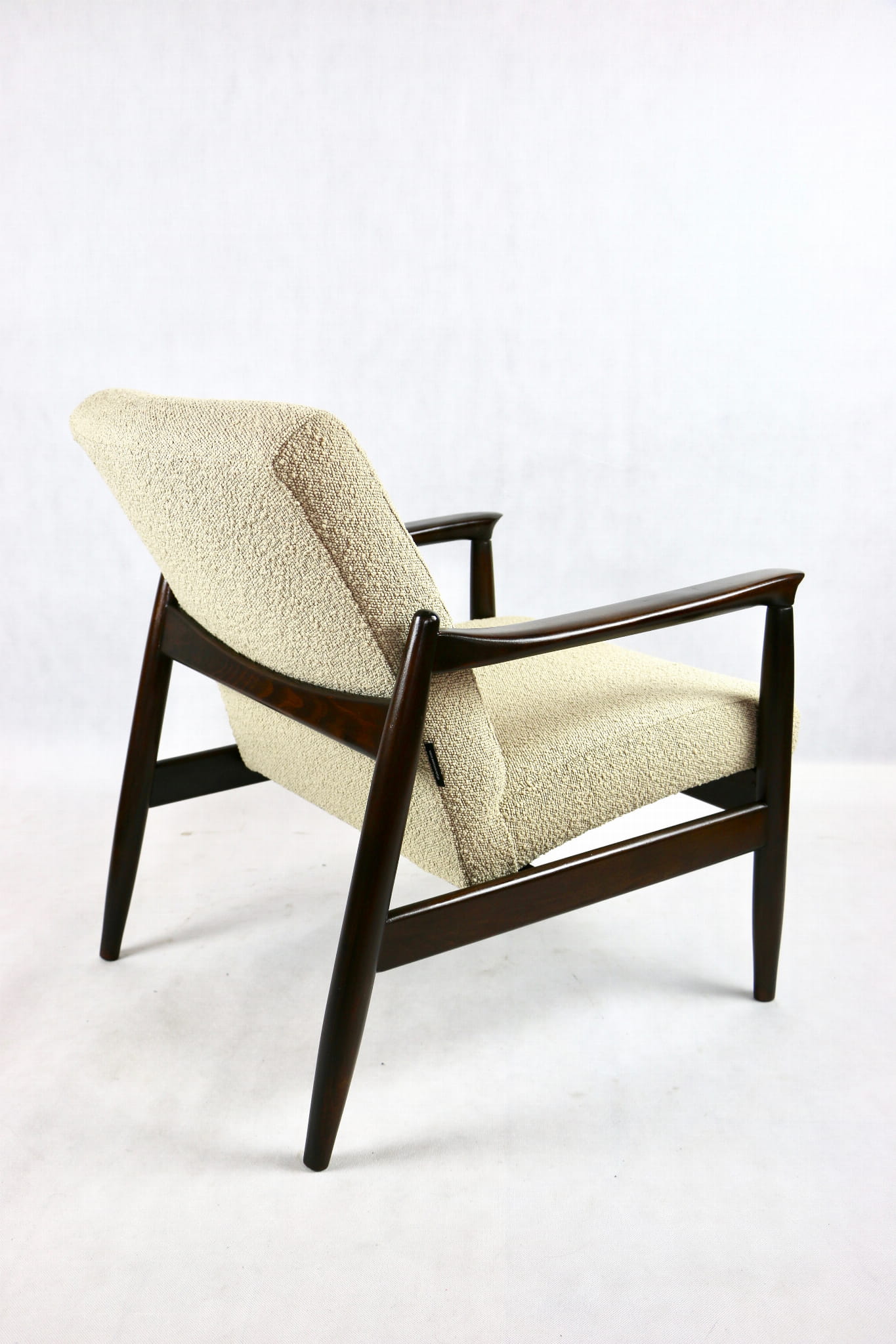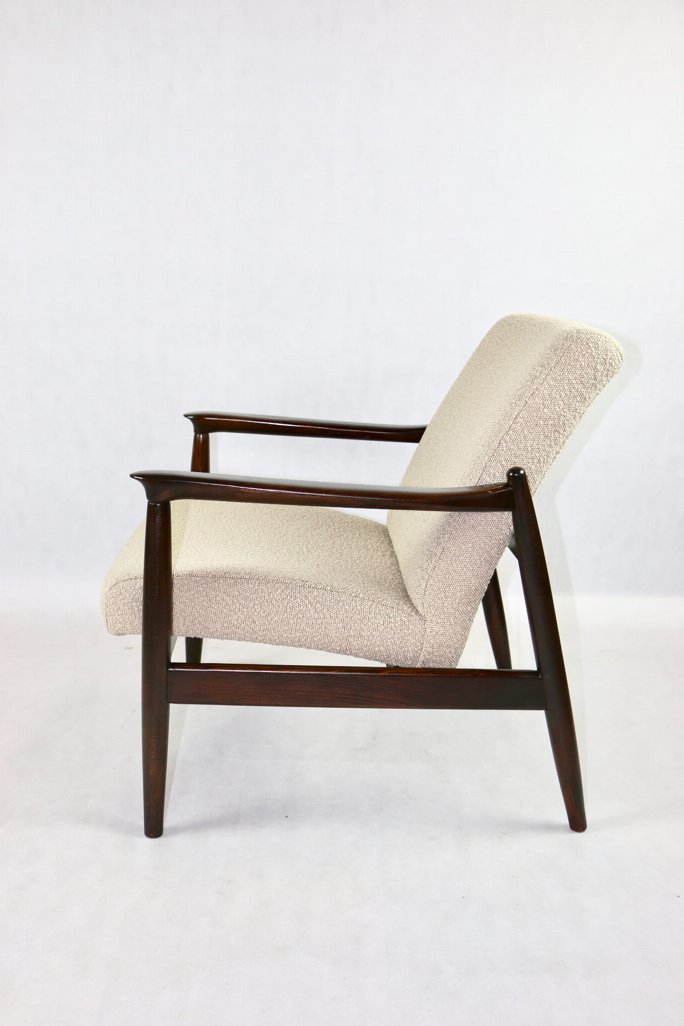 Fotel GFM - 142 zaprojektowany przez Edmunda Homa. Kompletnie odrestaurowany - nowa tapicerka wraz z wypełnieniem została pokryta materiałem tapicerskim strukturalnym w kolorze beżowym z serii boucle. Podparcia i nóżki drewniane, pokryte lakierem w kolorze ciemnego drewna.