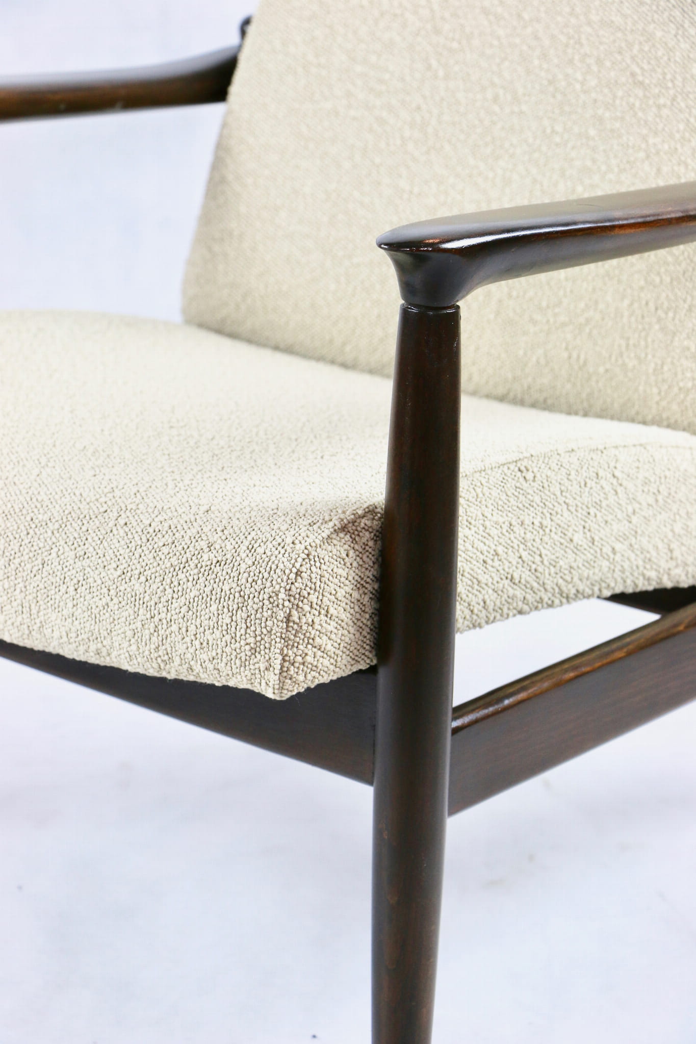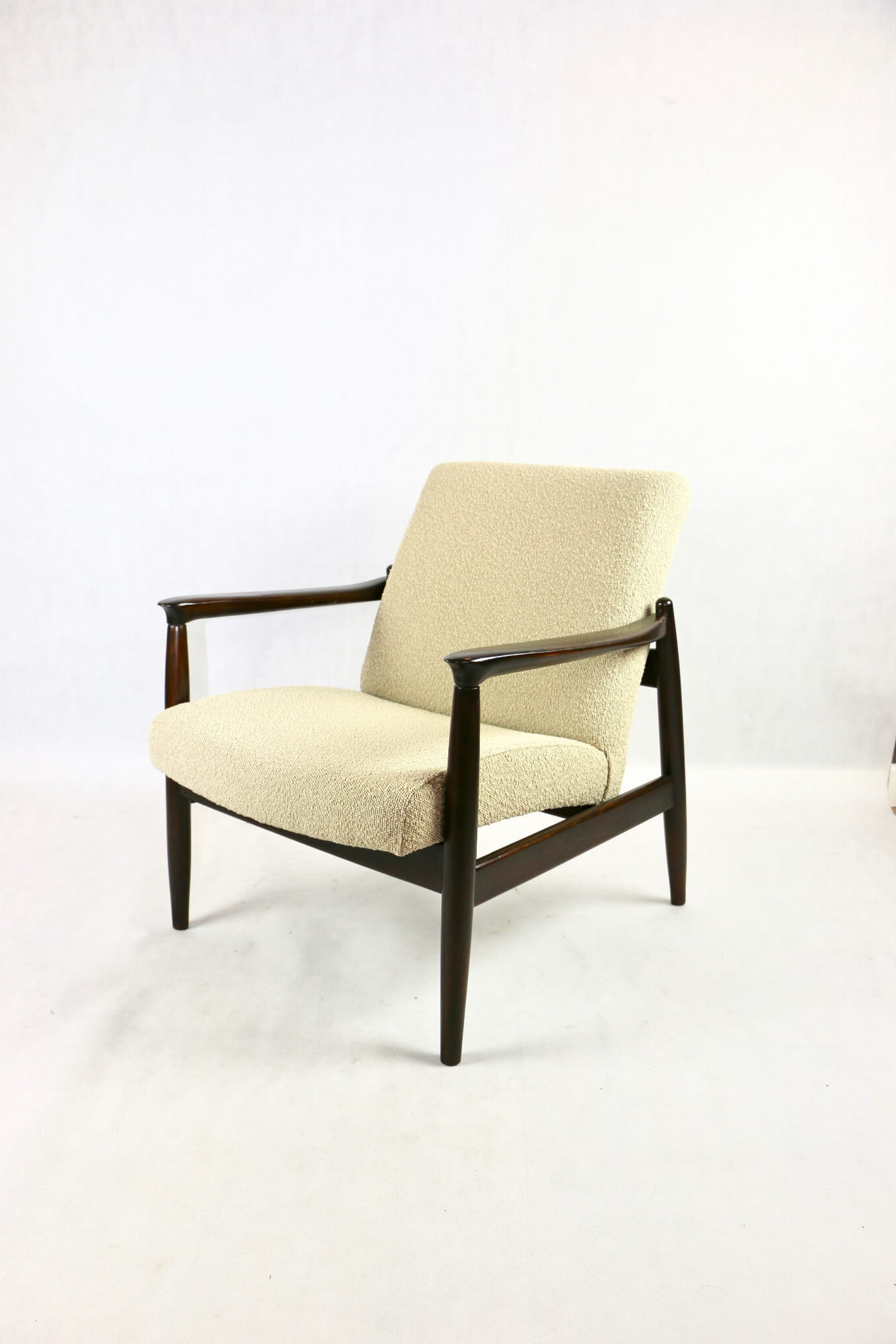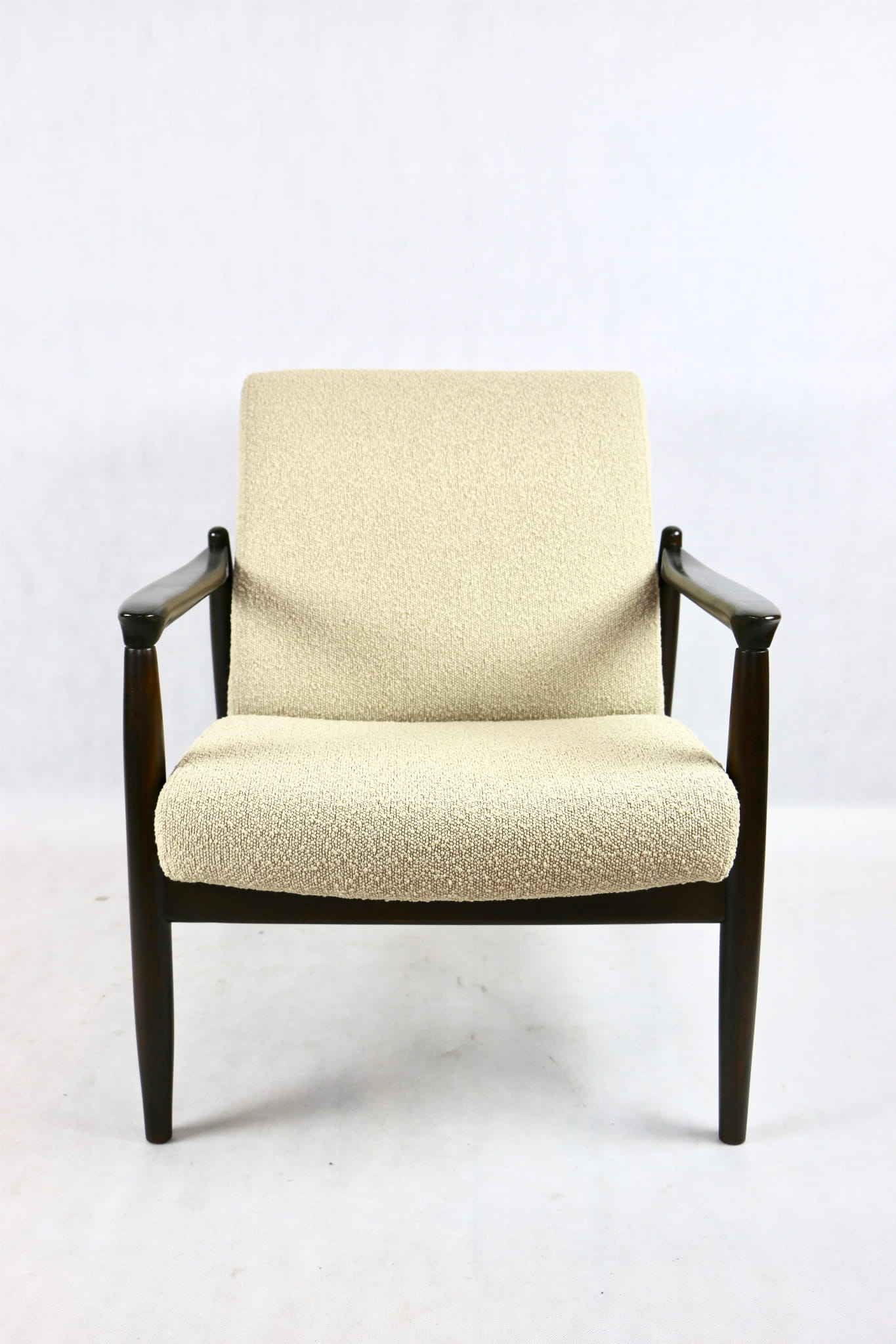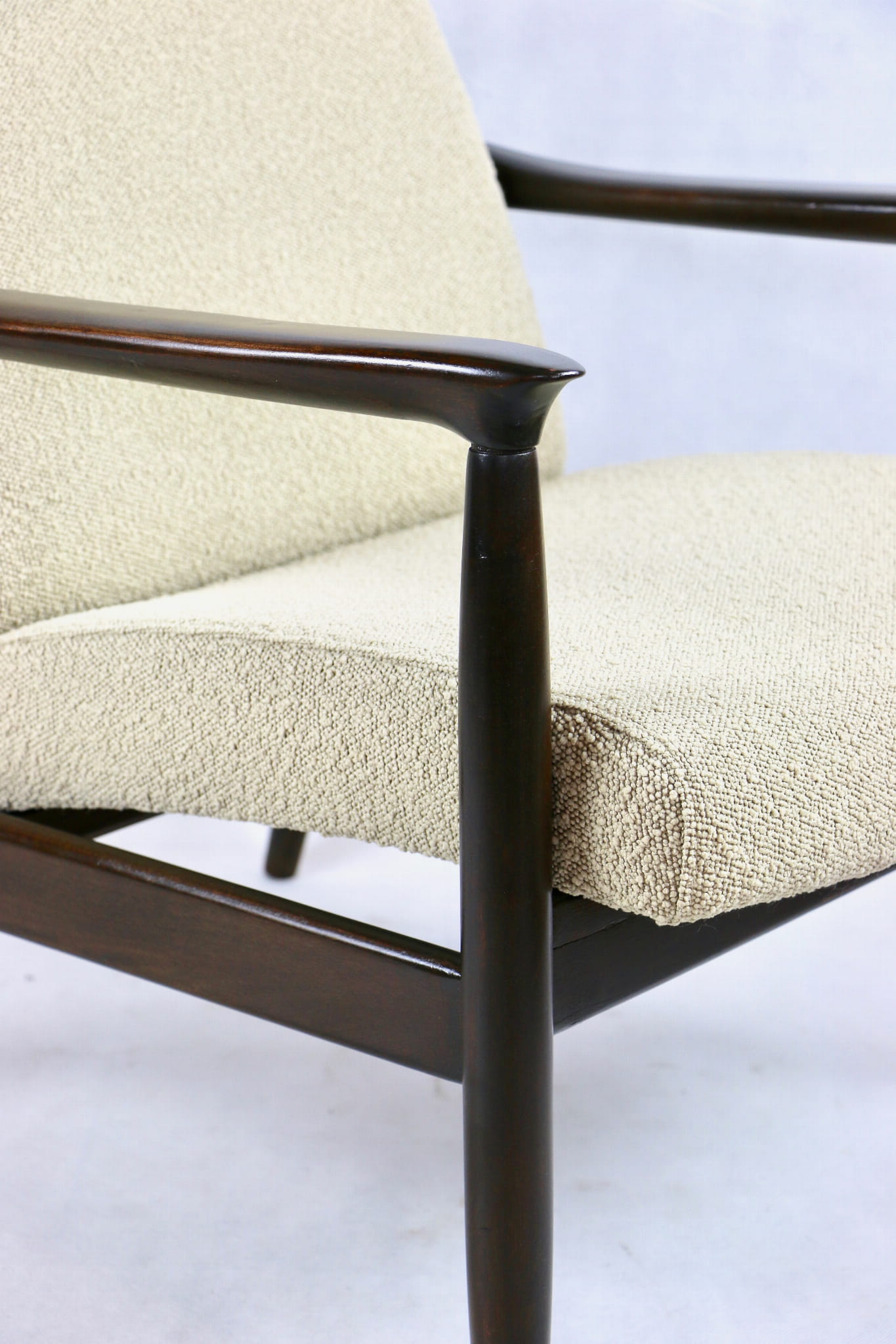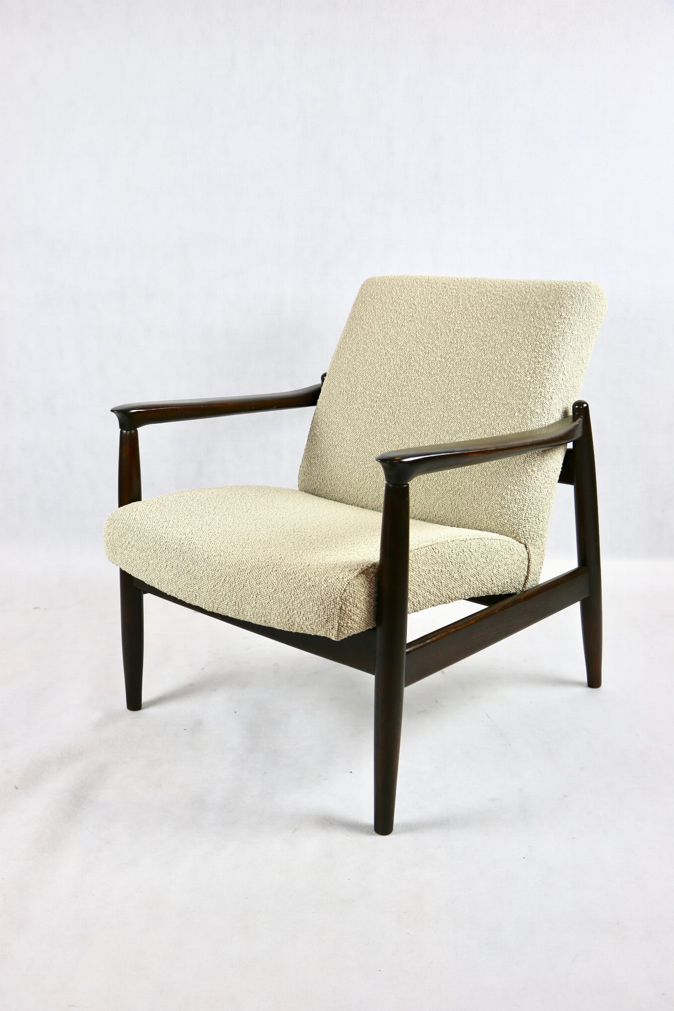 Fotel GFM - 142 zaprojektowany przez Edmunda Homa. Kompletnie odrestaurowany - nowa tapicerka wraz z wypełnieniem została pokryta materiałem tapicerskim strukturalnym w kolorze beżowym z serii boucle. Podparcia i nóżki drewniane, pokryte lakierem w kolorze ciemnego drewna.